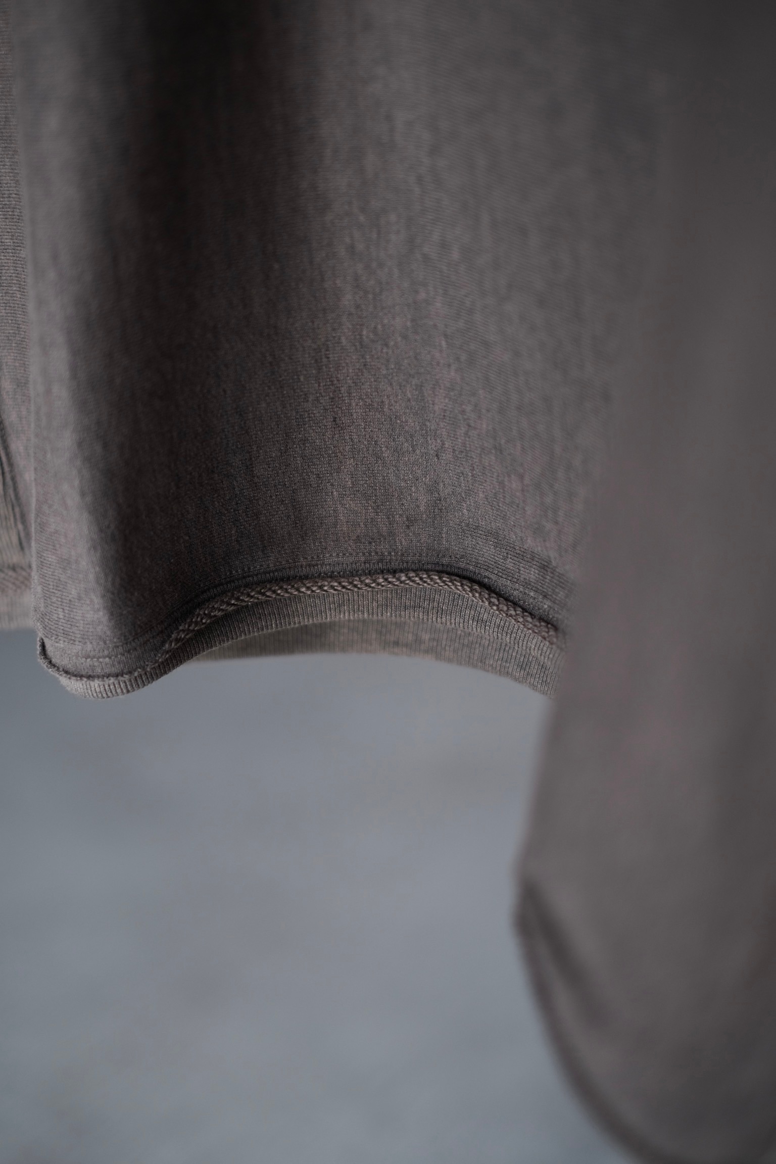 表糸には強撚糸、裏糸には無撚糸を使用し編み立てた裏毛、フワッと包まれるような着心地とノンストレスな肌触りは極上そのもの。