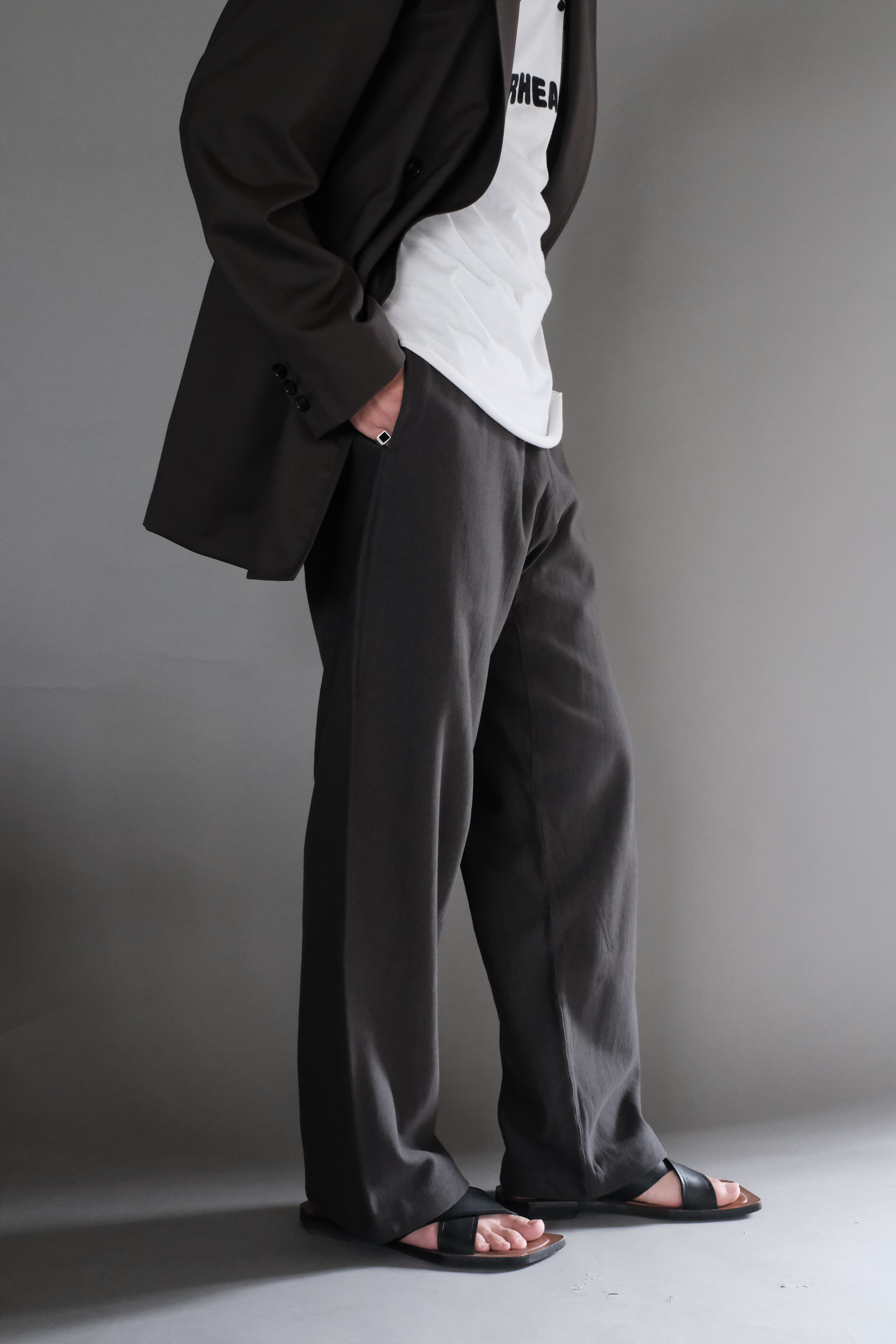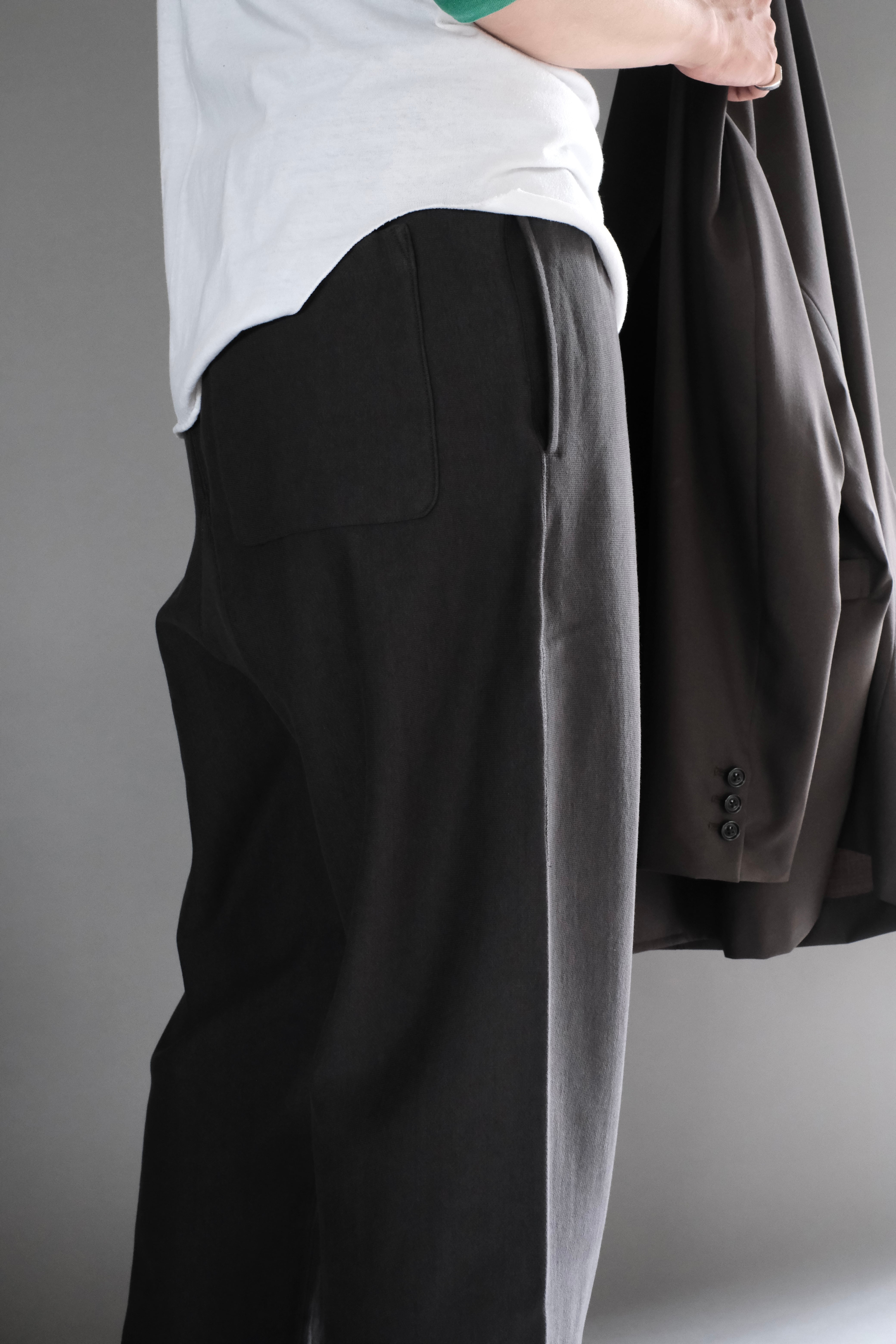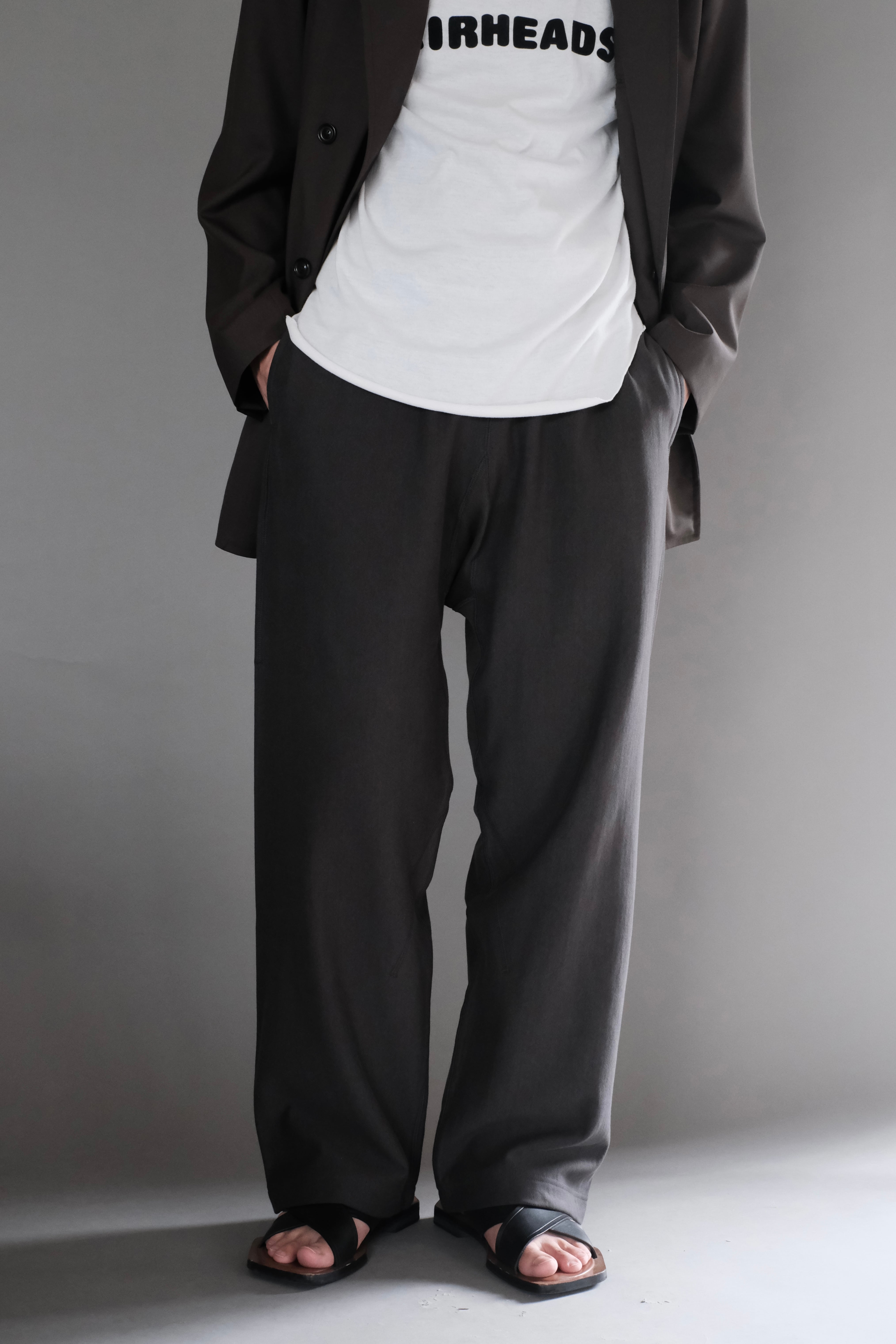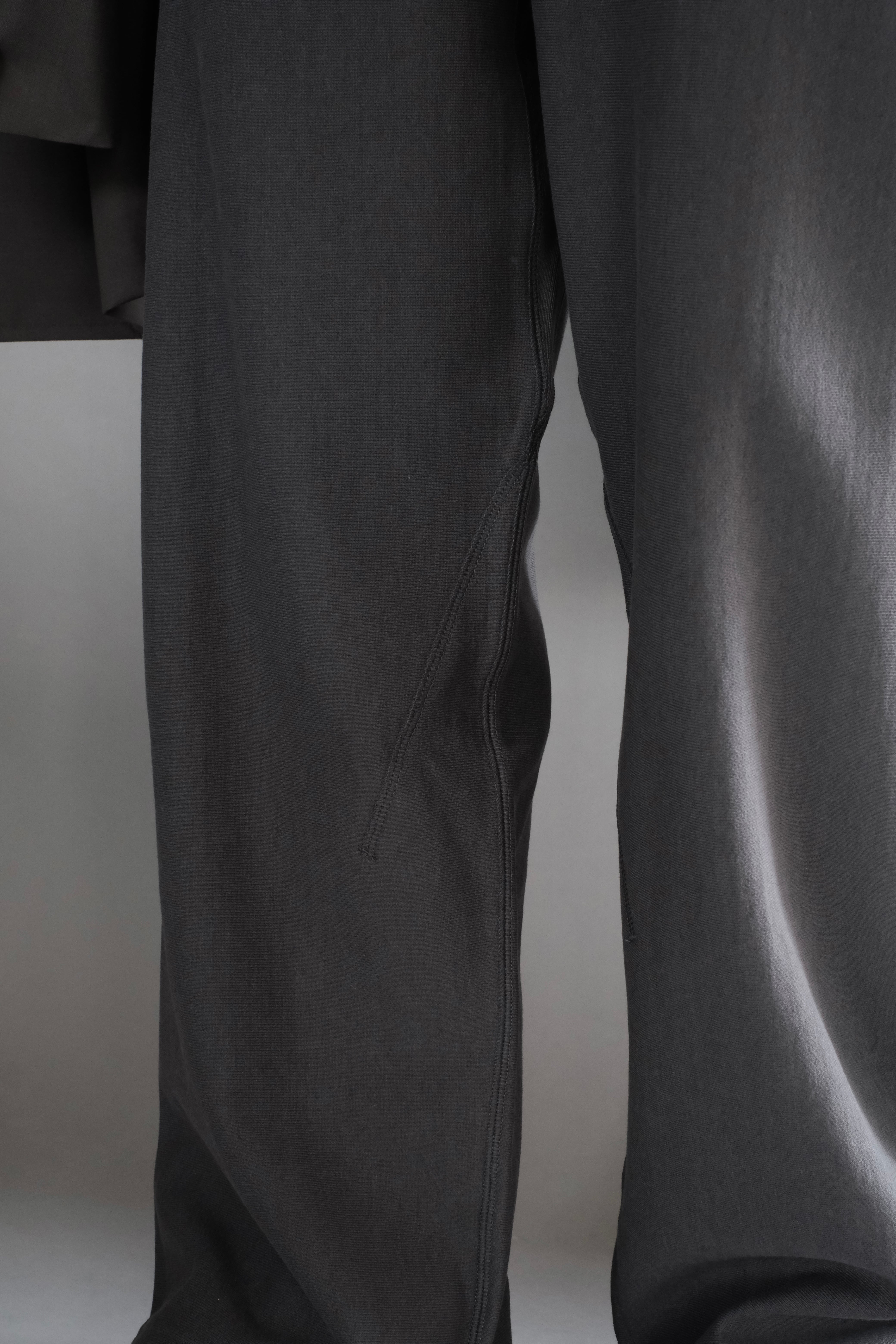 リブの切り替えやステッチワークでアクセントをつけたスウェットパンツは、アウトシームを排除した直線的なパターンで、スラックスかのようなシルエットが特徴。