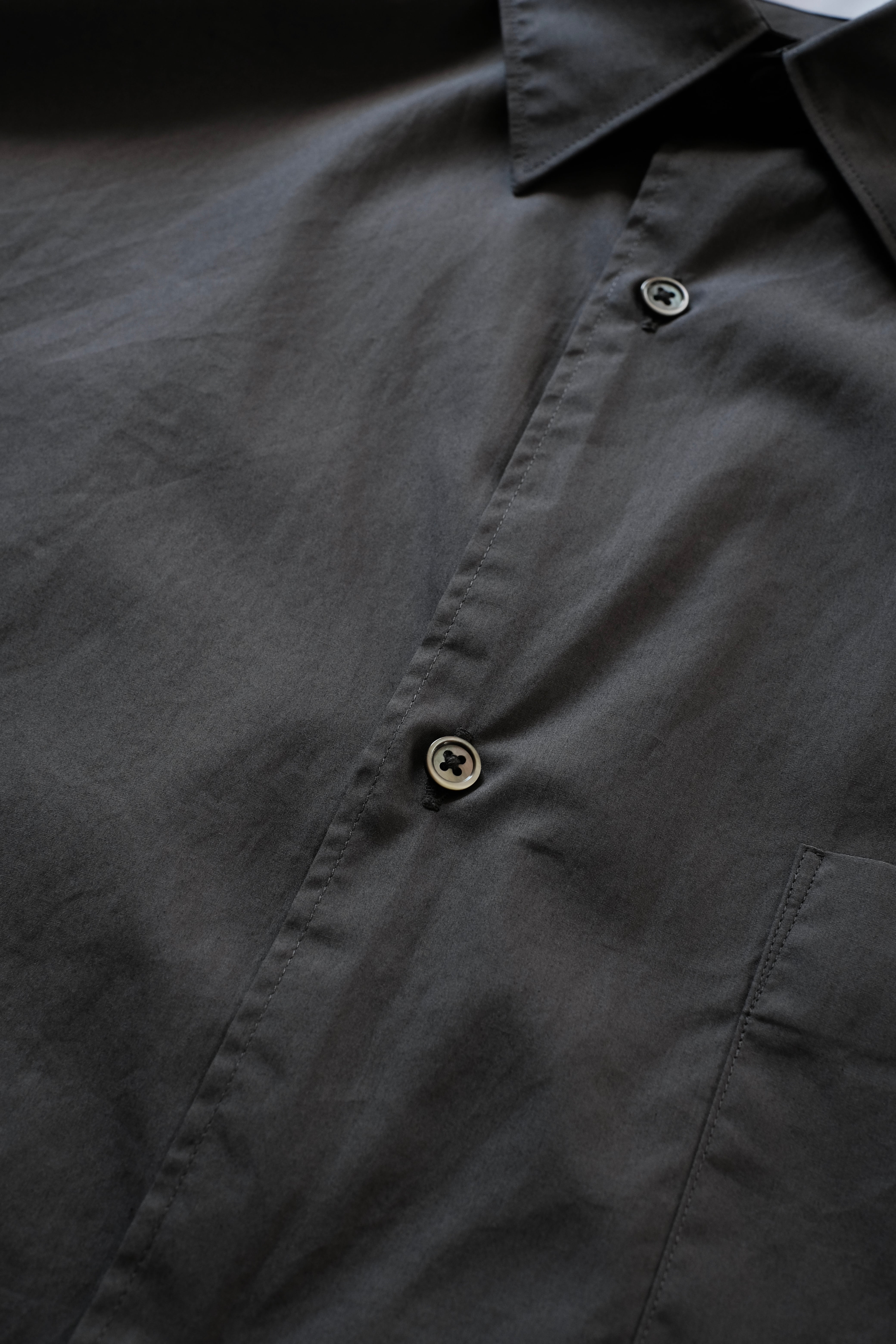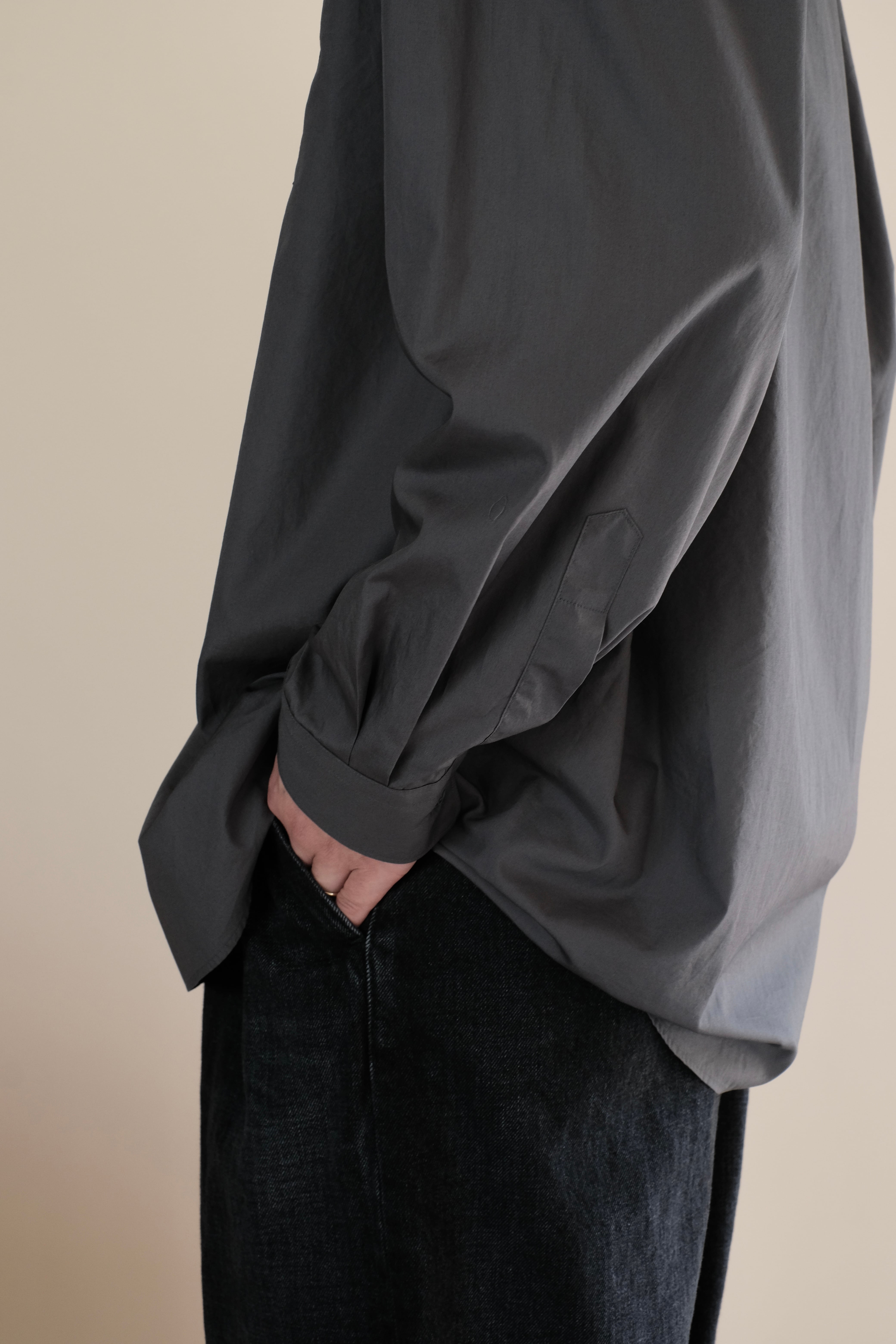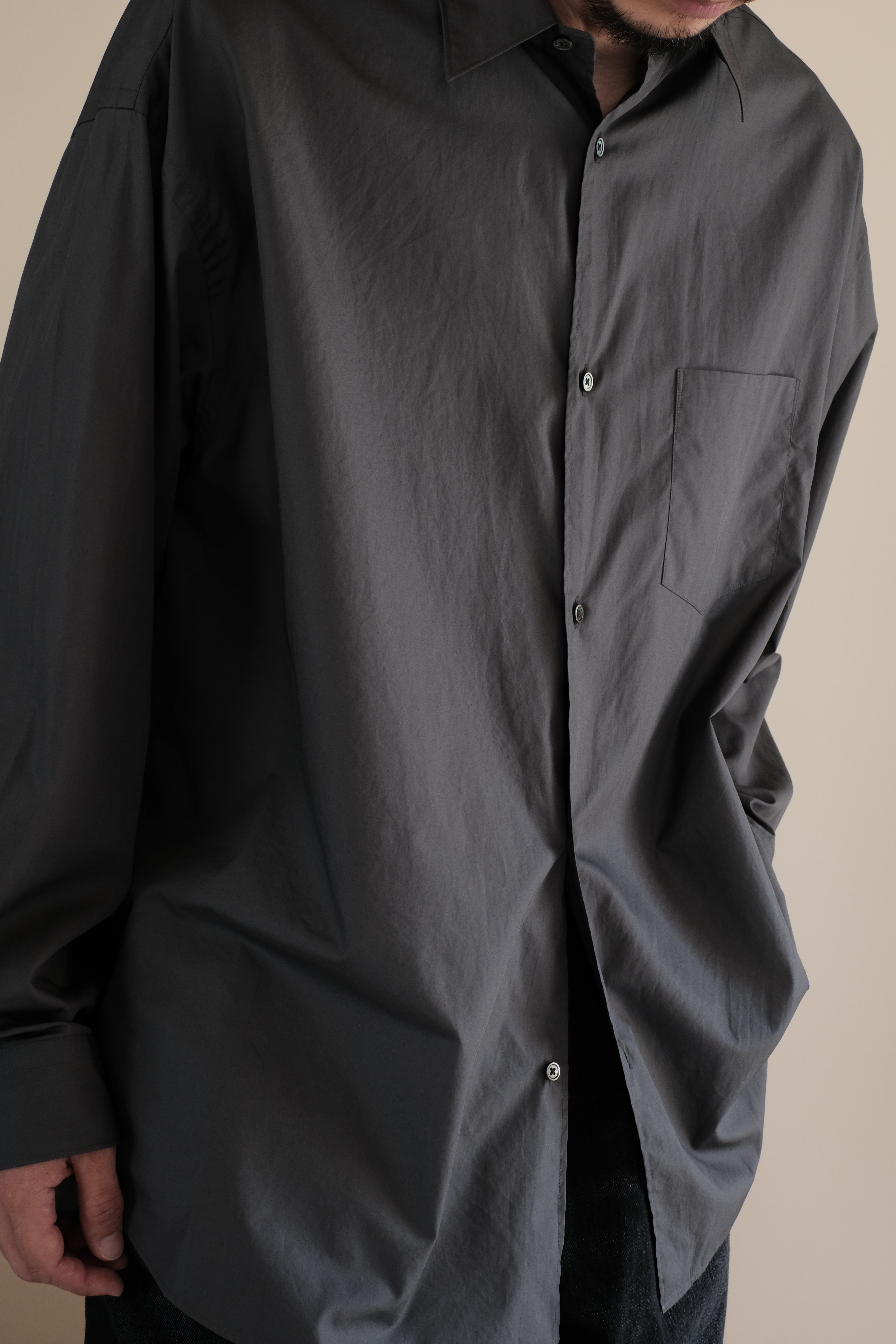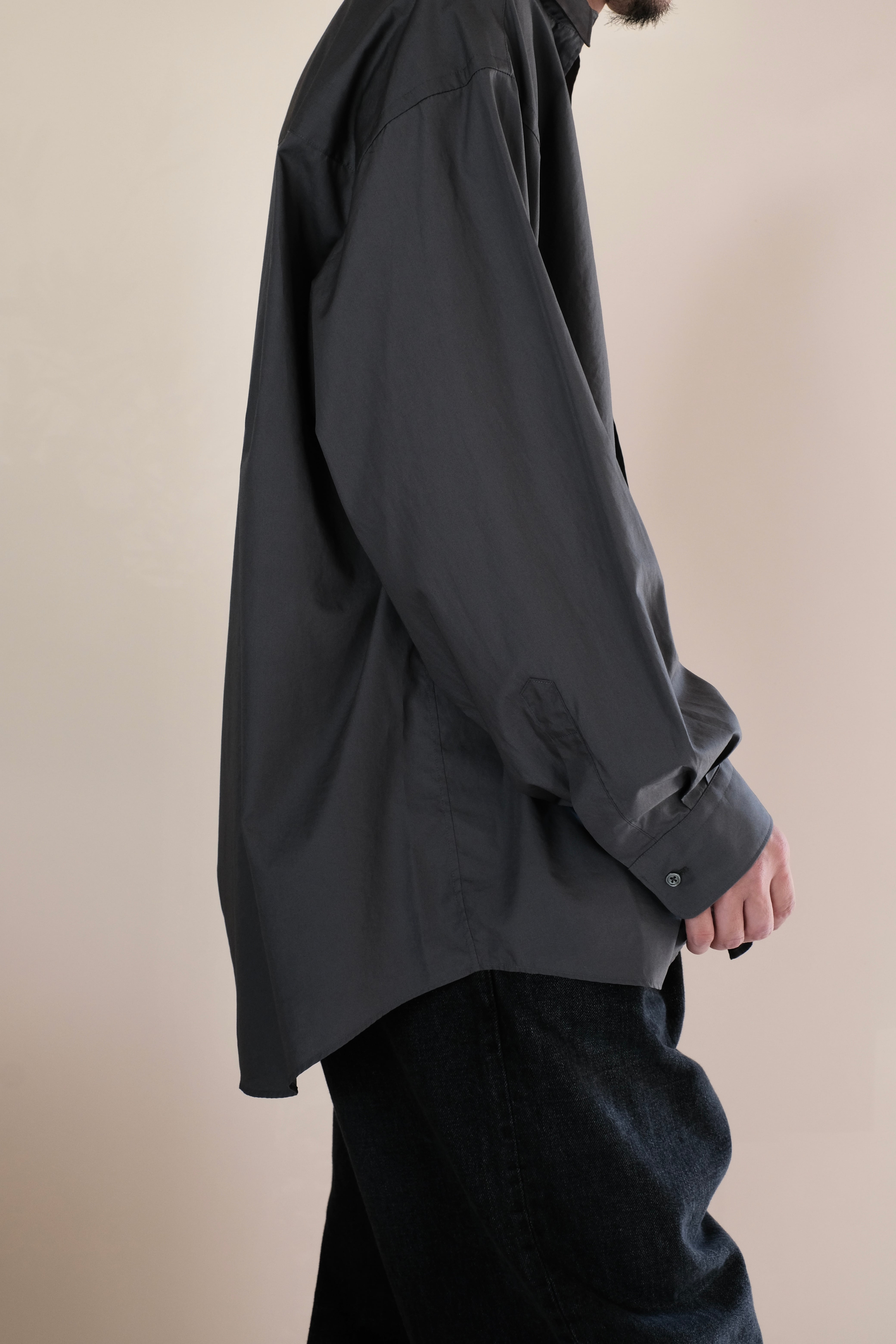 オーセンティックなバンドカラーのロングスリーブシャツ。肩の傾斜や低く下げられたヨークの位置、アームホールの広さなど、細かなディテールを特異なバランスで仕上げたドロップショルダーでボリュームのあるボックスシルエットが特徴。なめらかに整った繊維そのものの光沢感と、均一な撚りにより毛羽立ちにくい超長綿であるスーピマコットン、非常に繊細な糸番手で製織したブロード生地を使用。高級シーツにも使用されている生地で適度なハリと柔らかさがあり着心地が非常に良い。