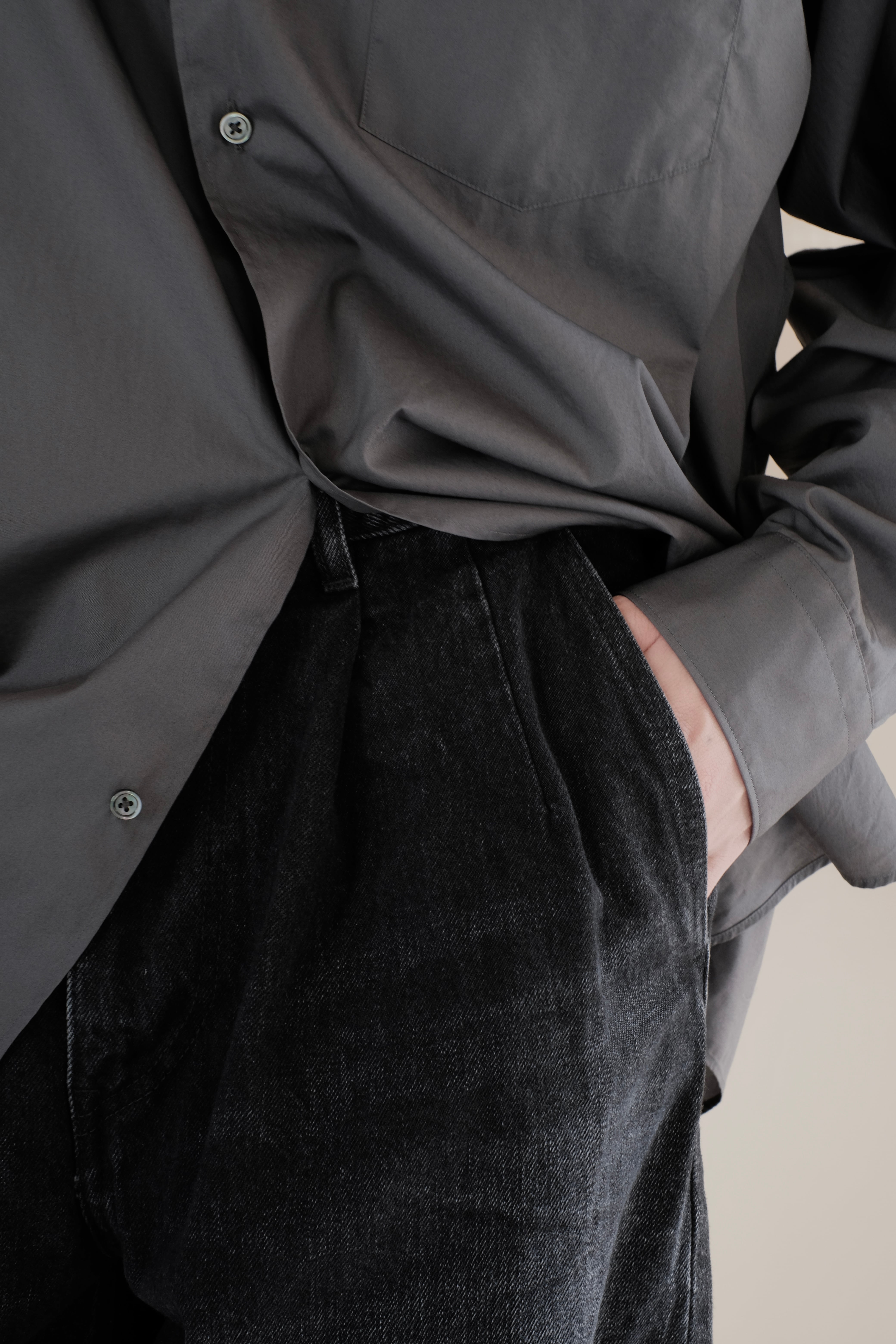 旧式力織機でゆっくりと織り上げることで生まれる、生地表面のざらっとした凹凸やムラがデニム本来の風合いを感じさせる魅力的な素材。ウエストにはタックが入り、ヒップからワタリにかけて適度な余裕があり、裾にかけて若干テーパードしている履きやすいワイドテーパードパンツ。