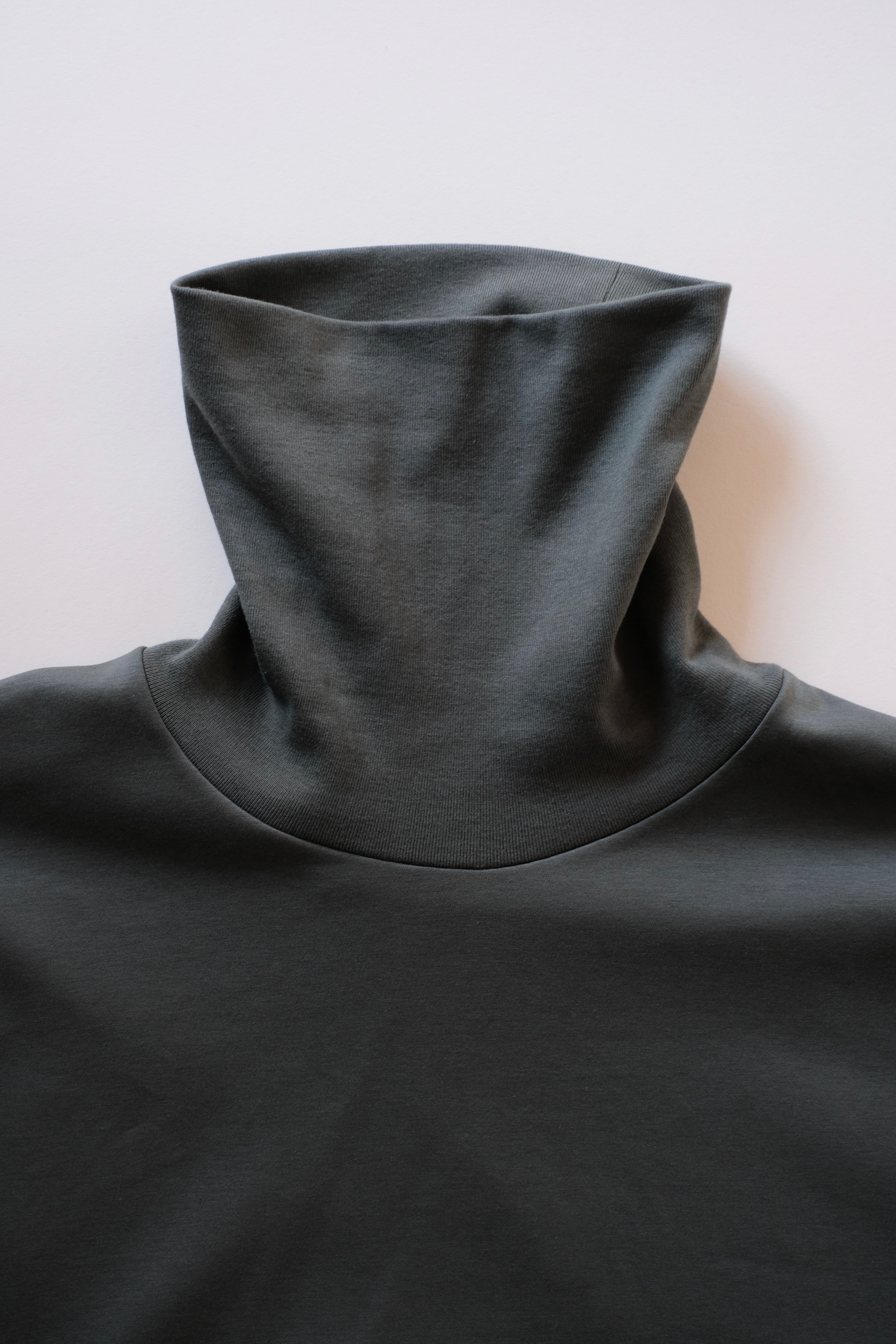 生地での微起毛仕上げも行い、ハリと柔らかさが絶妙に調和した、心地よい肌触りが魅力のハイネックTシャツ。