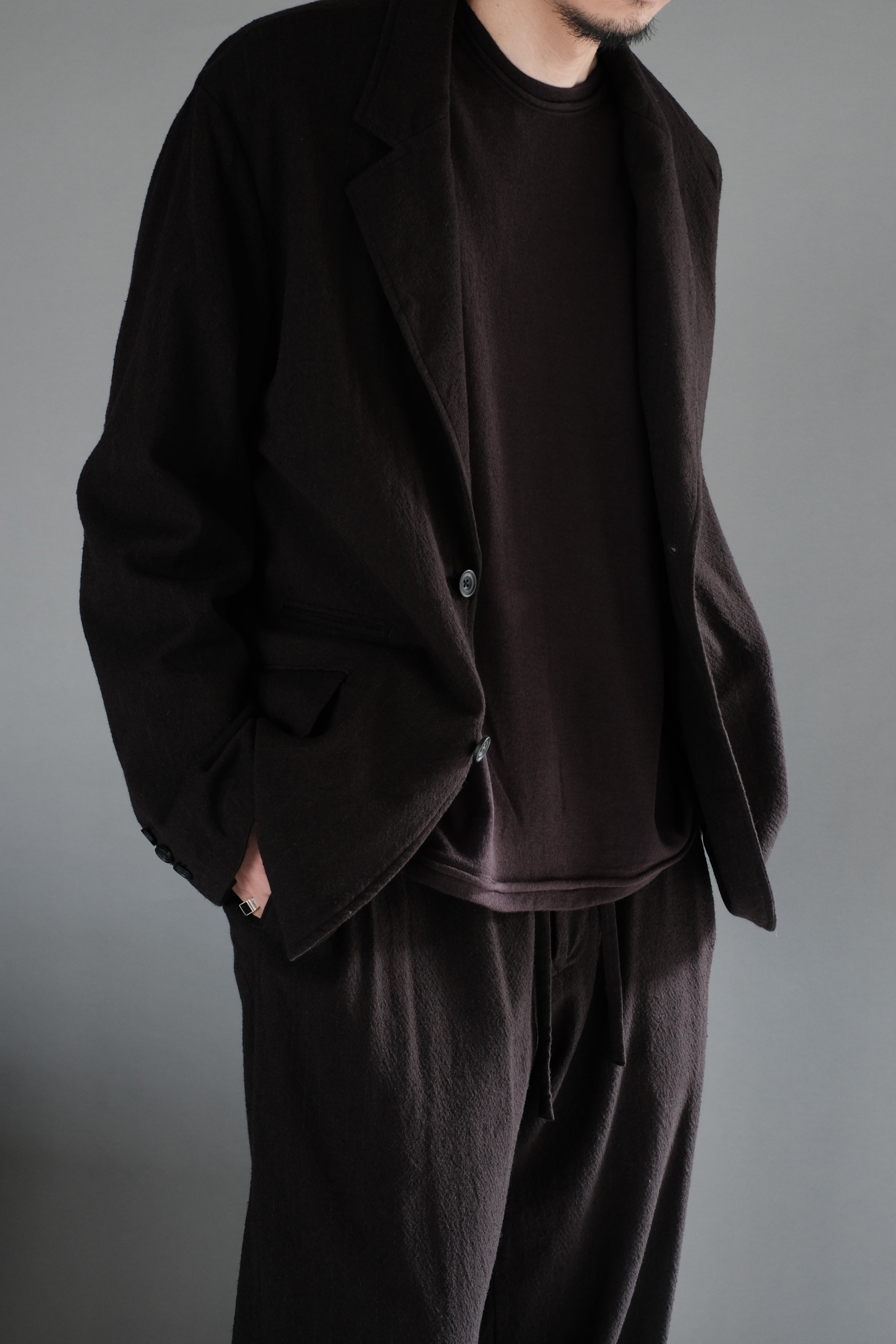表面にウォッシャブル加工したスーパー120'sメリノウール、裏面にコットンを使用し、特殊な編機で編み立てた”裏毛の裏糸なし”という変形編みの天竺。