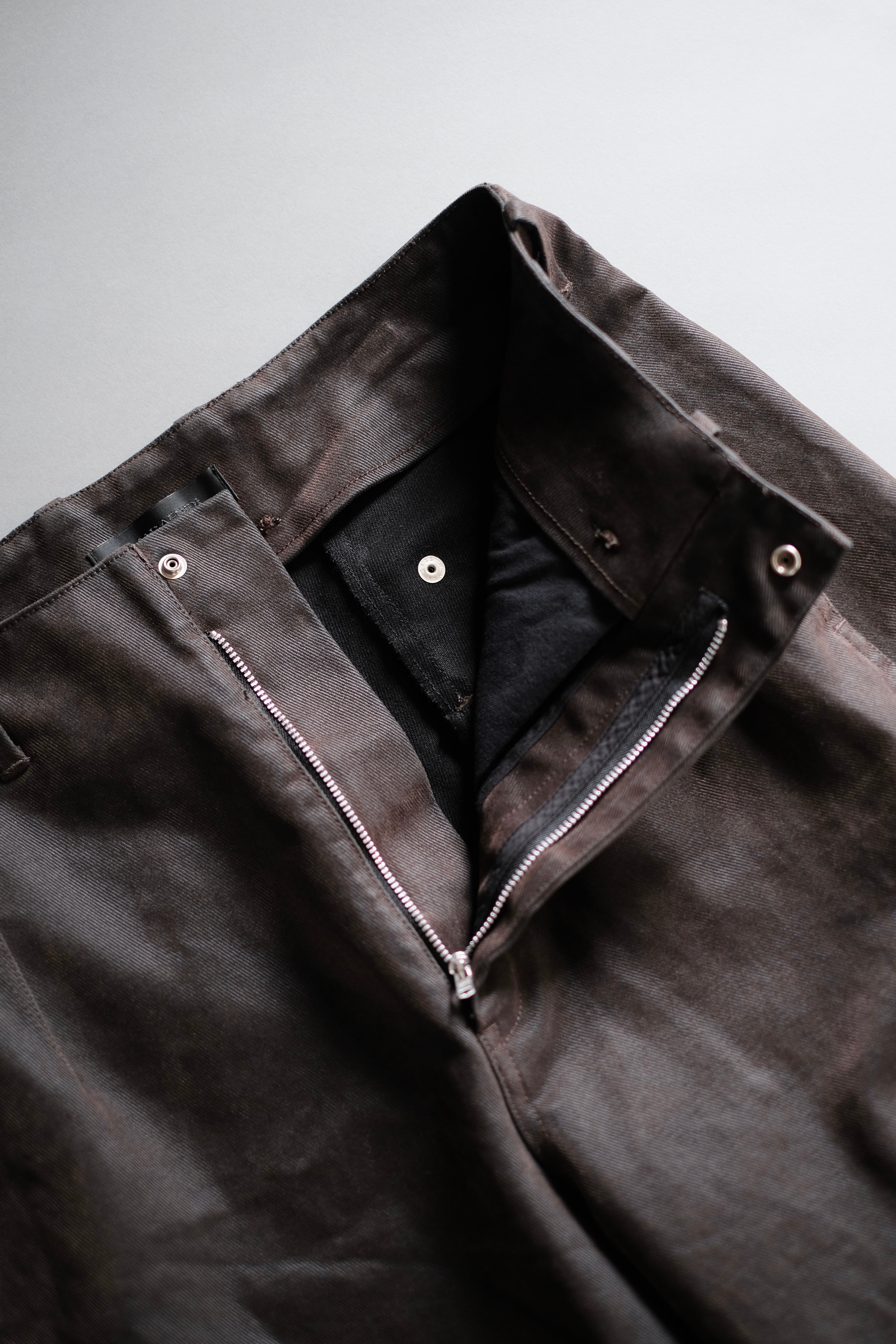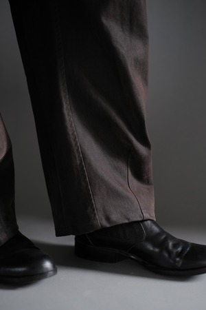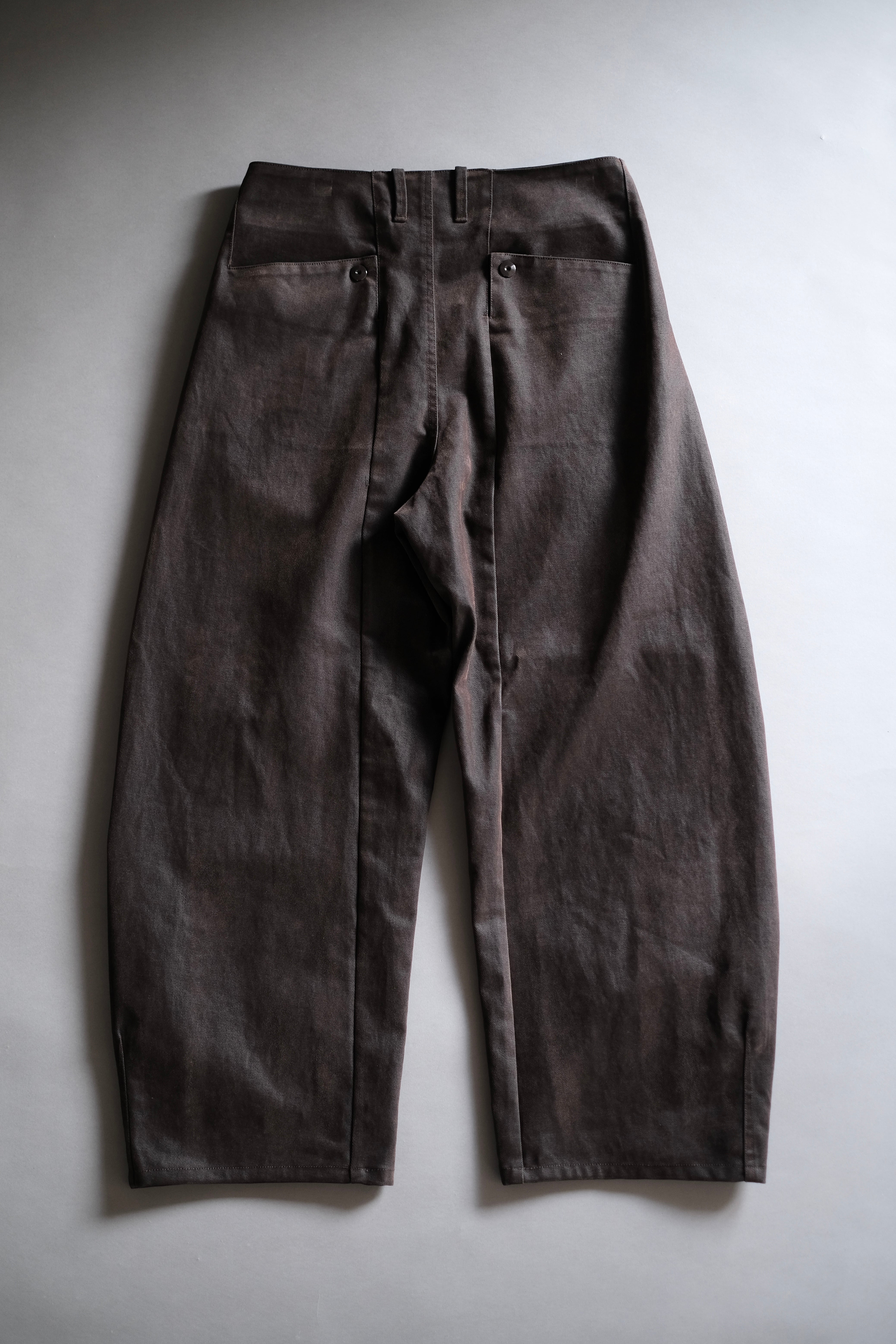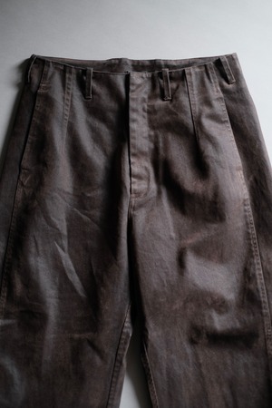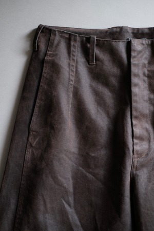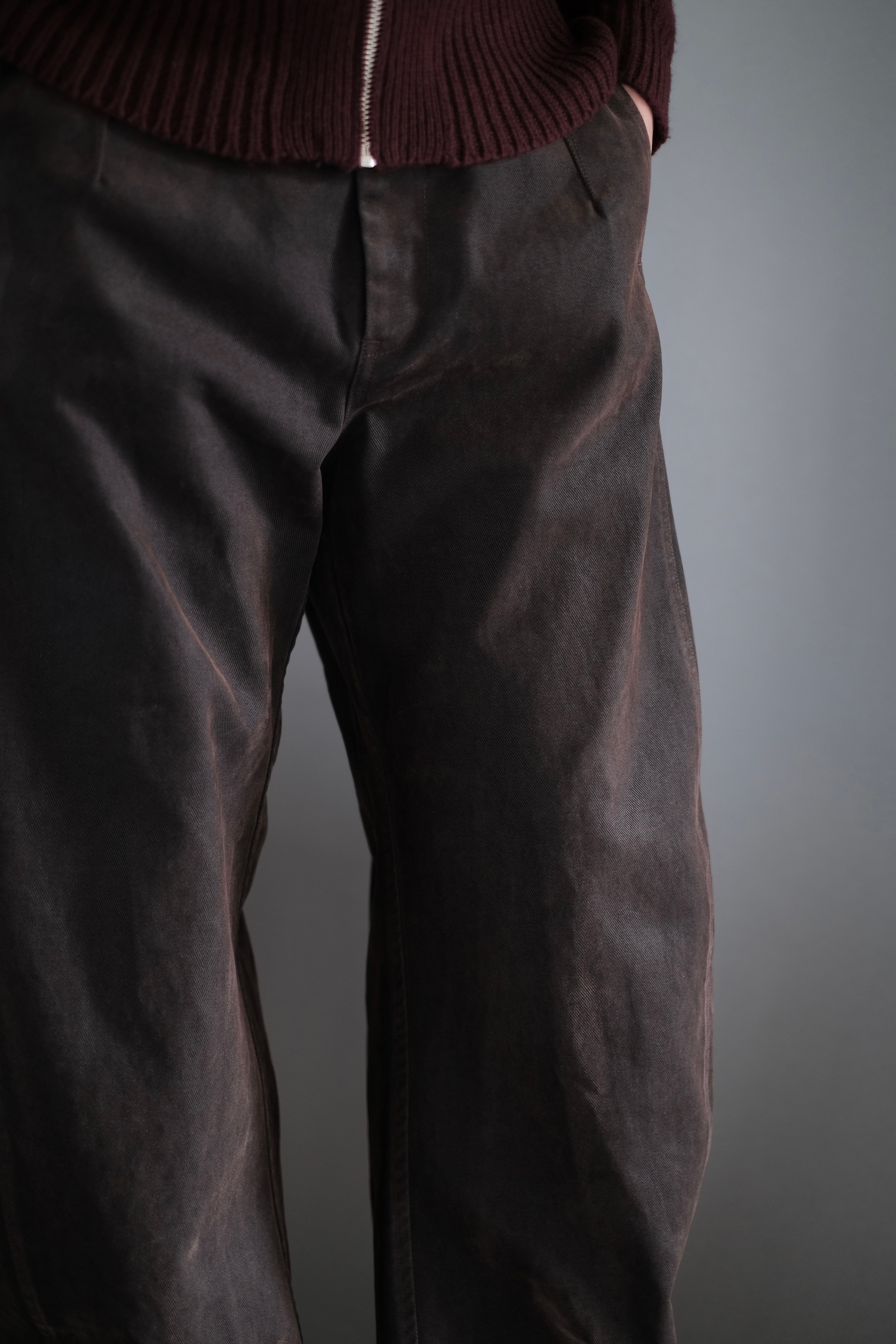 厚手のデニム生地にフロック加工を施し、さらに製品染めによって独特なフェード感と風合いが生まれています。