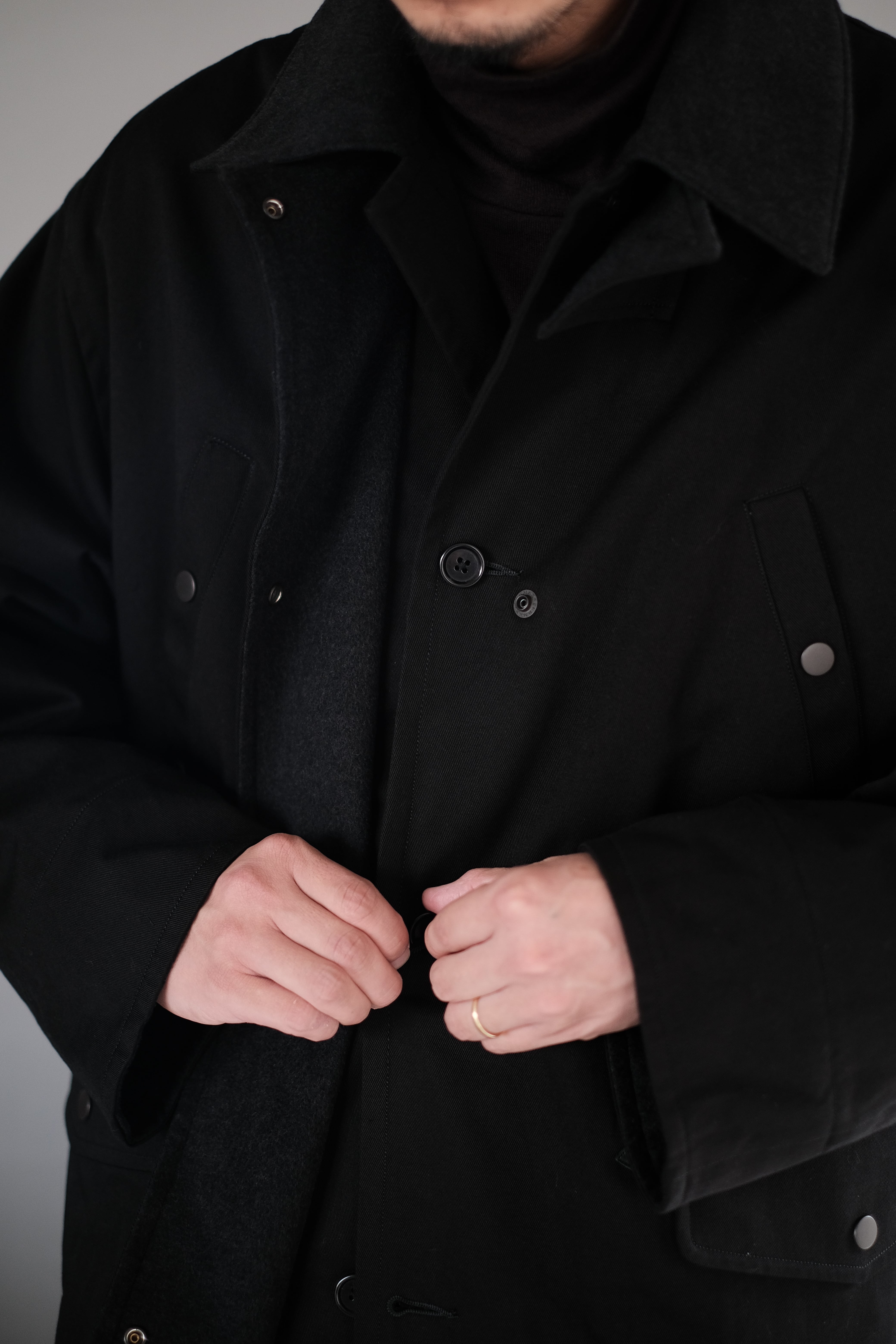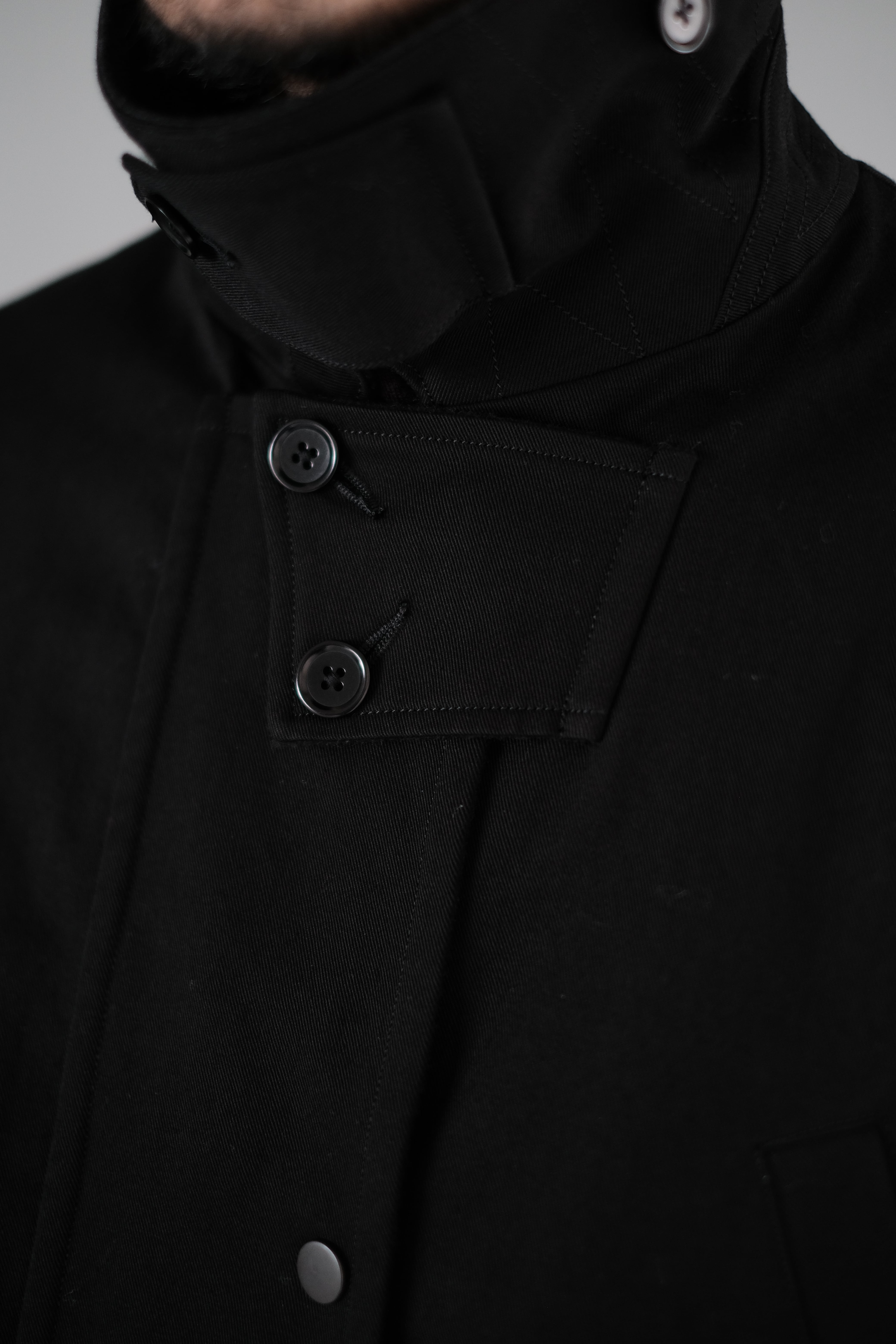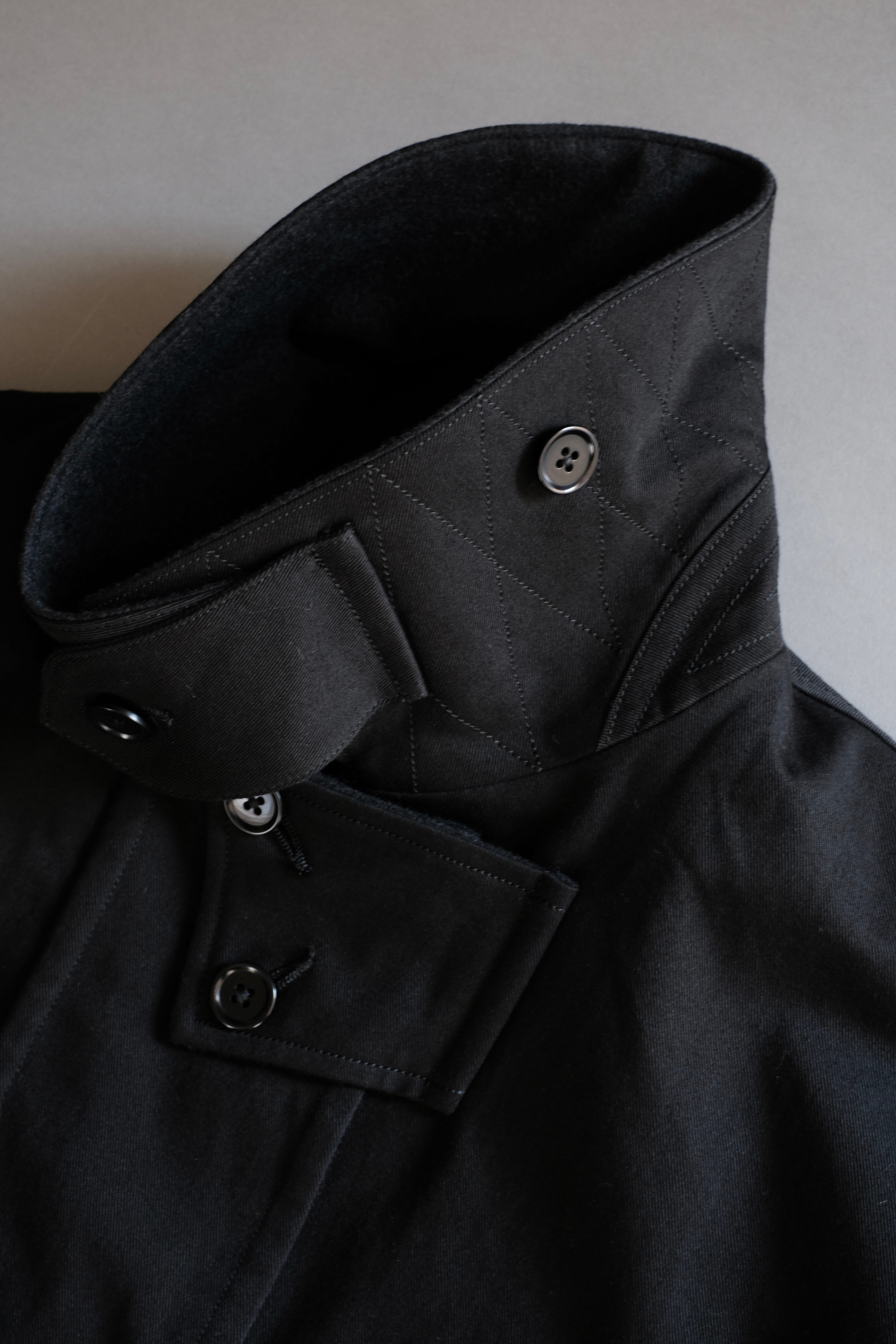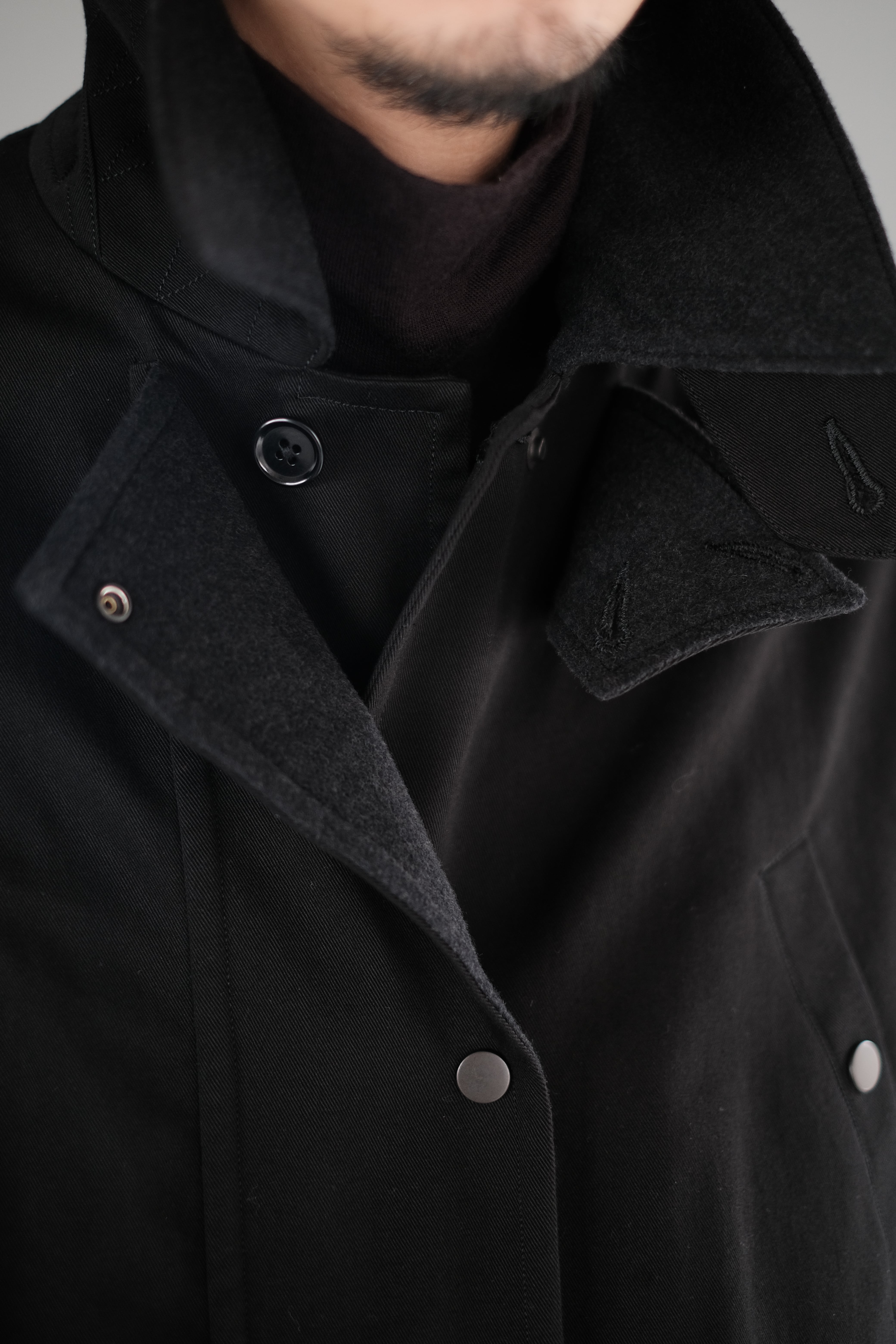 フライトジャケットやフィールドコートなどと、ハンティングジャケットの要素をミックスしたミドルレングスのミリタリーコート。