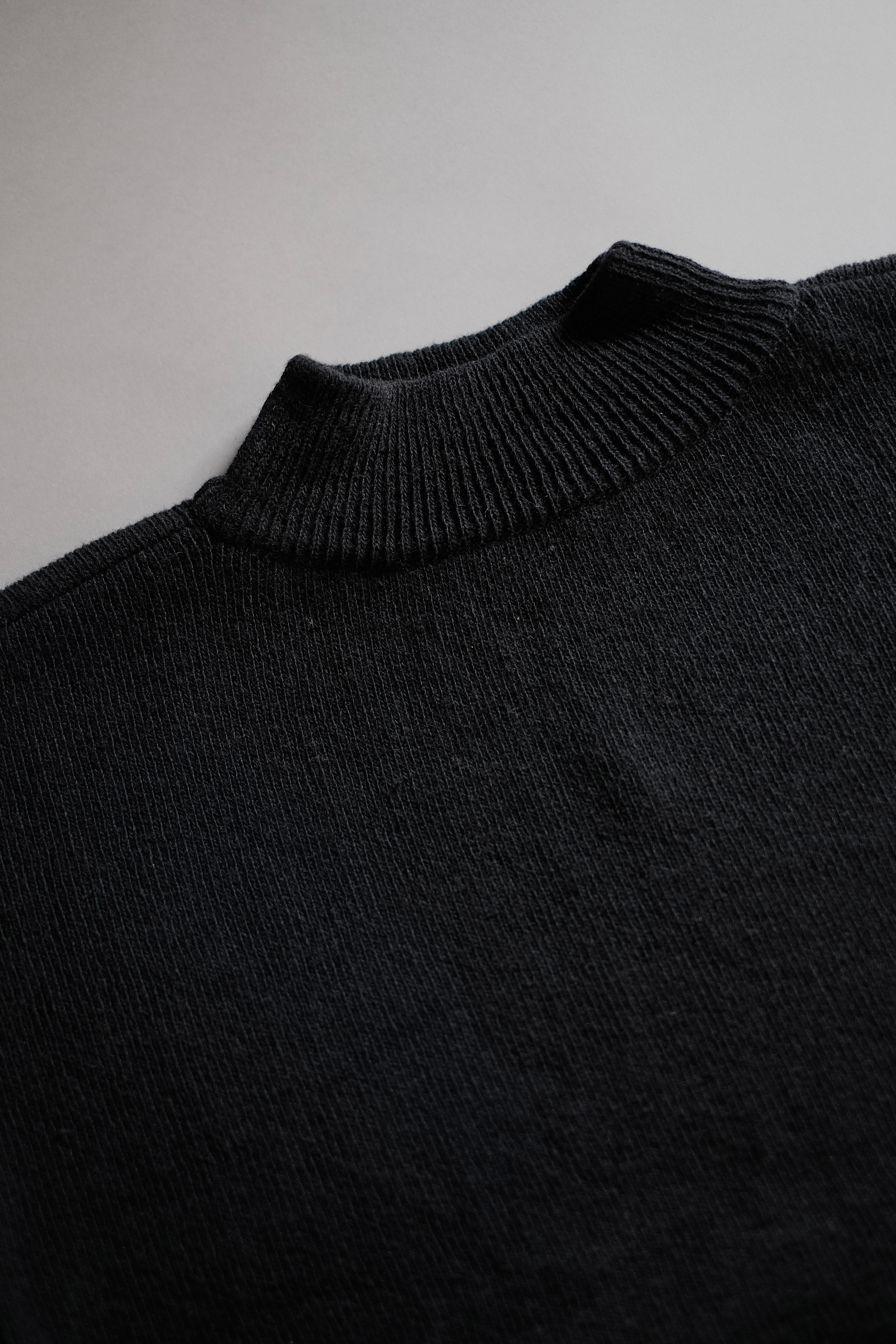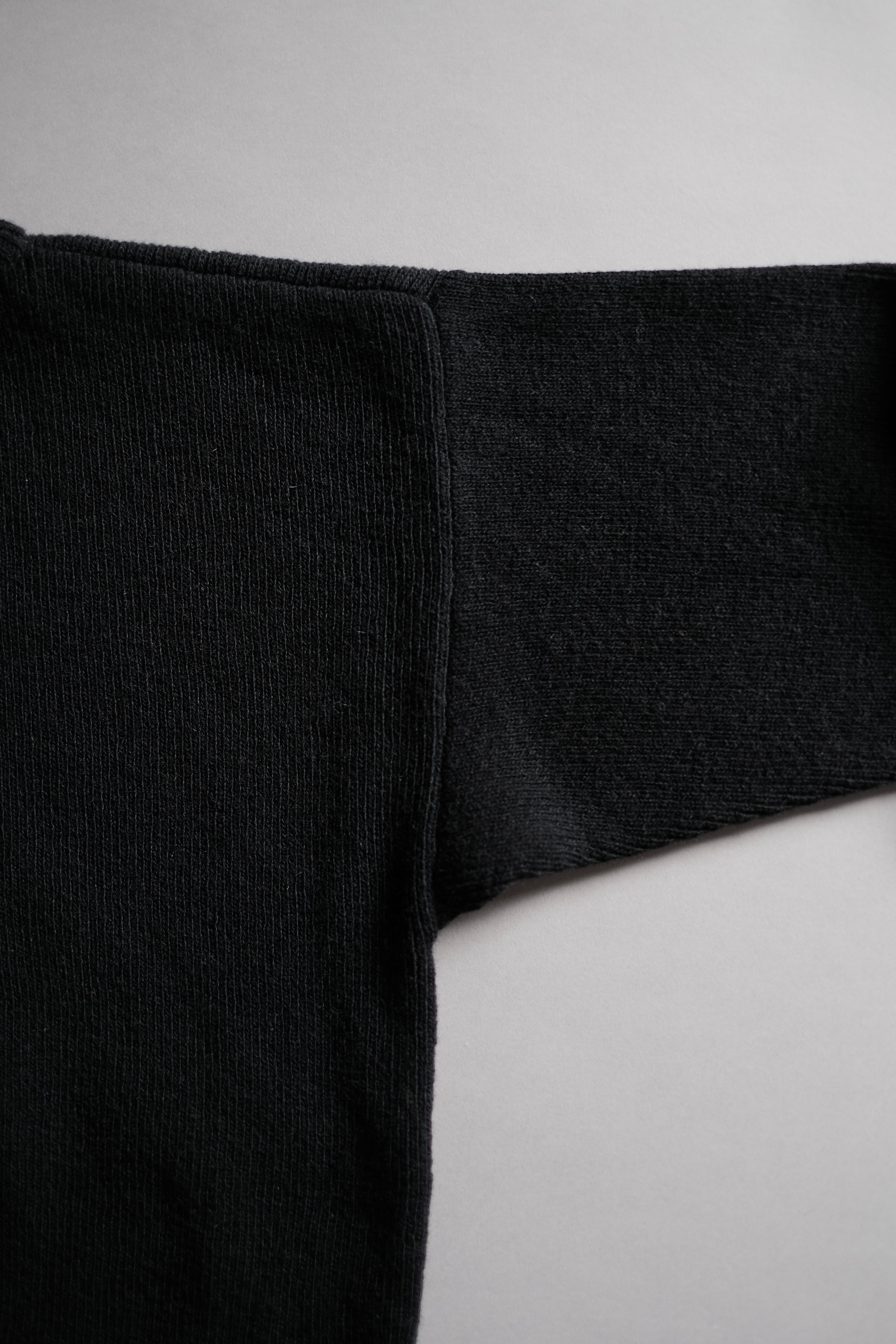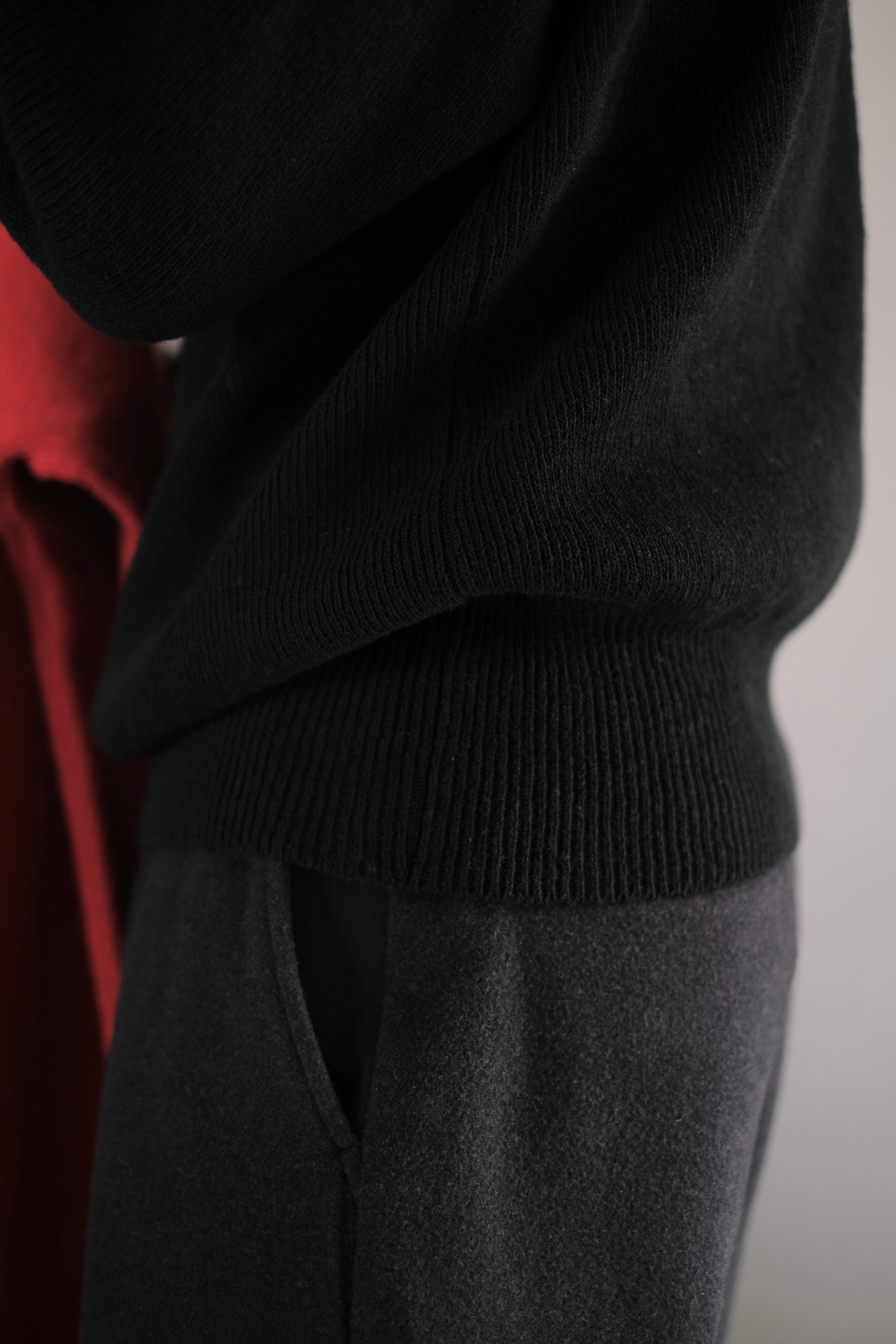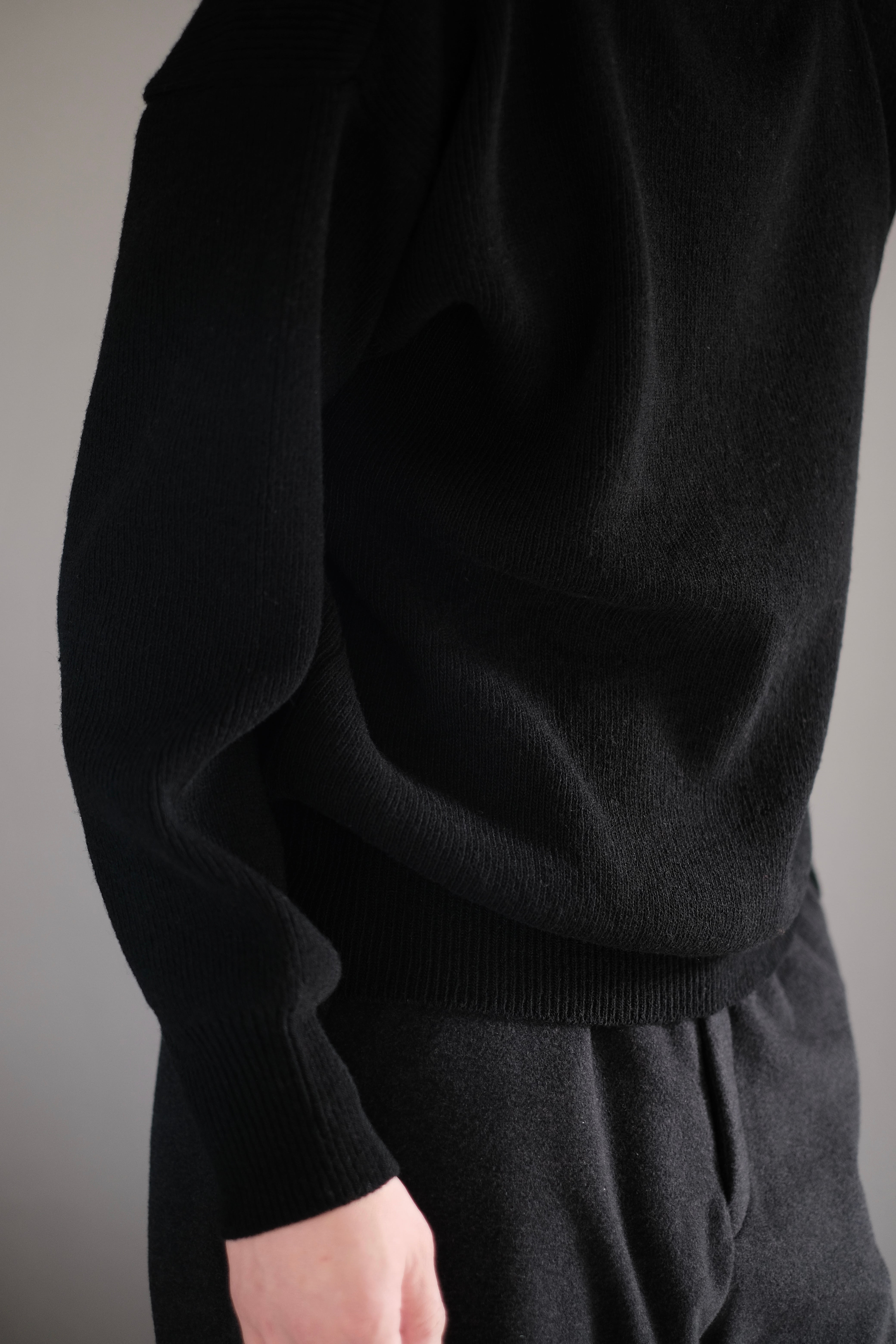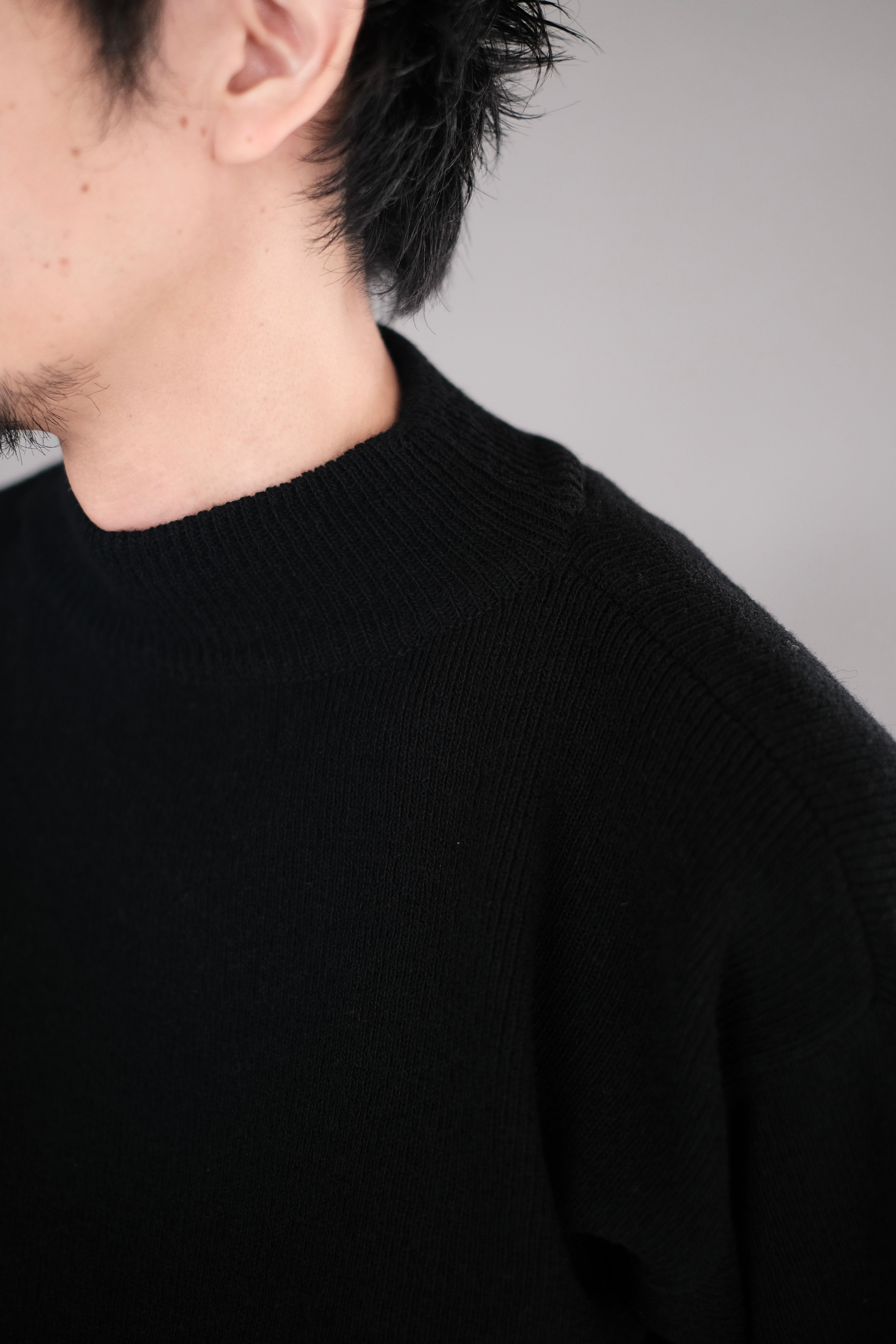 ゴリっとしたタッチ、ミリタリーセーターのような素材感をイメージして制作しているが、硬さや張り感は生かしながらも、動きやすく、身体に馴染むようにゴム編み組織にしている。