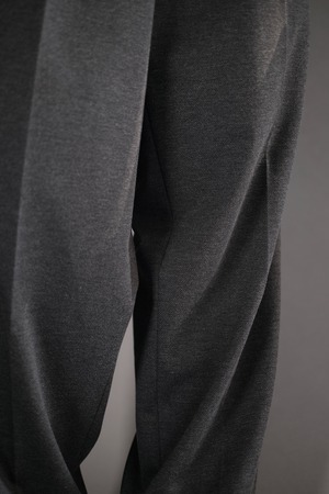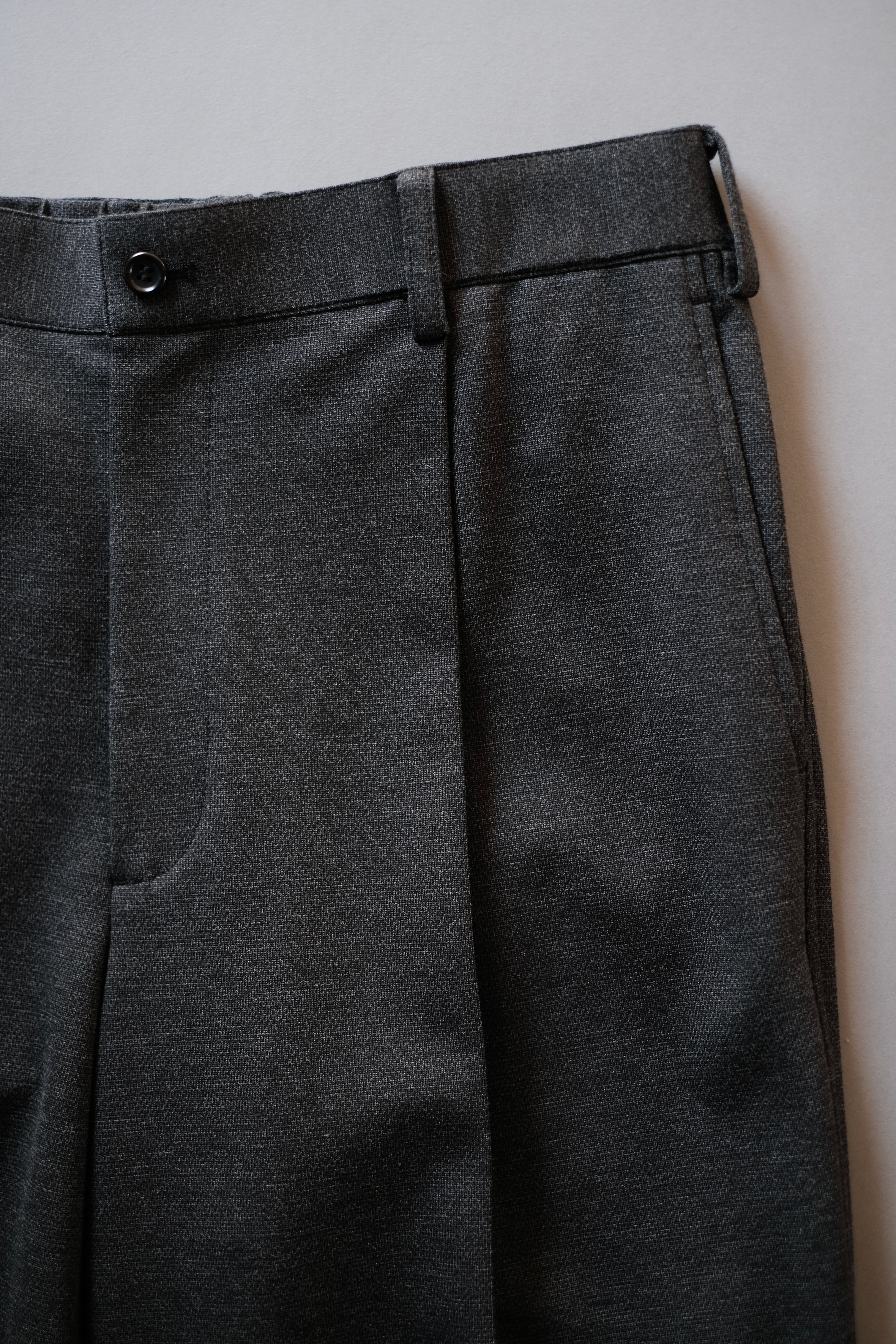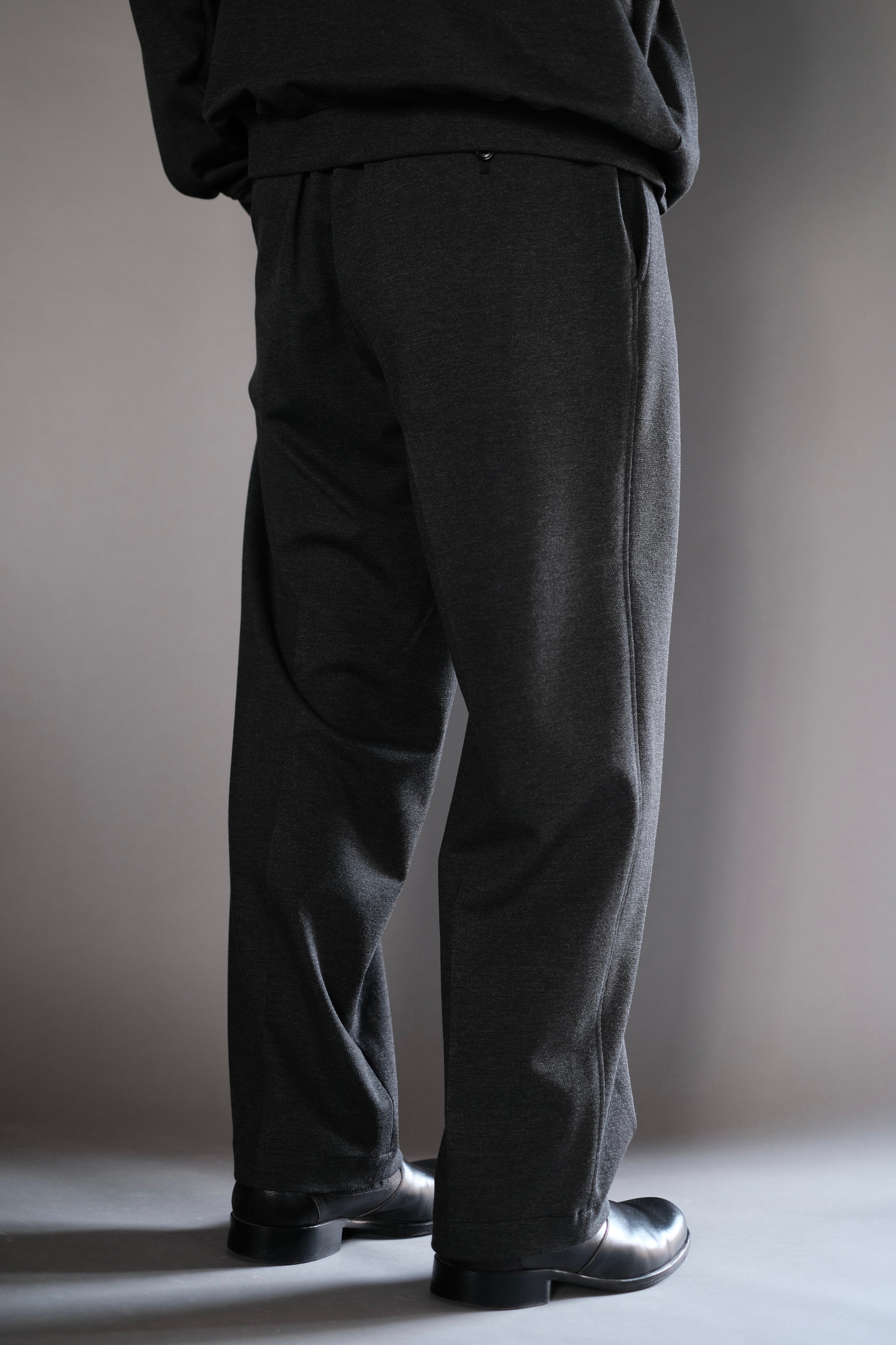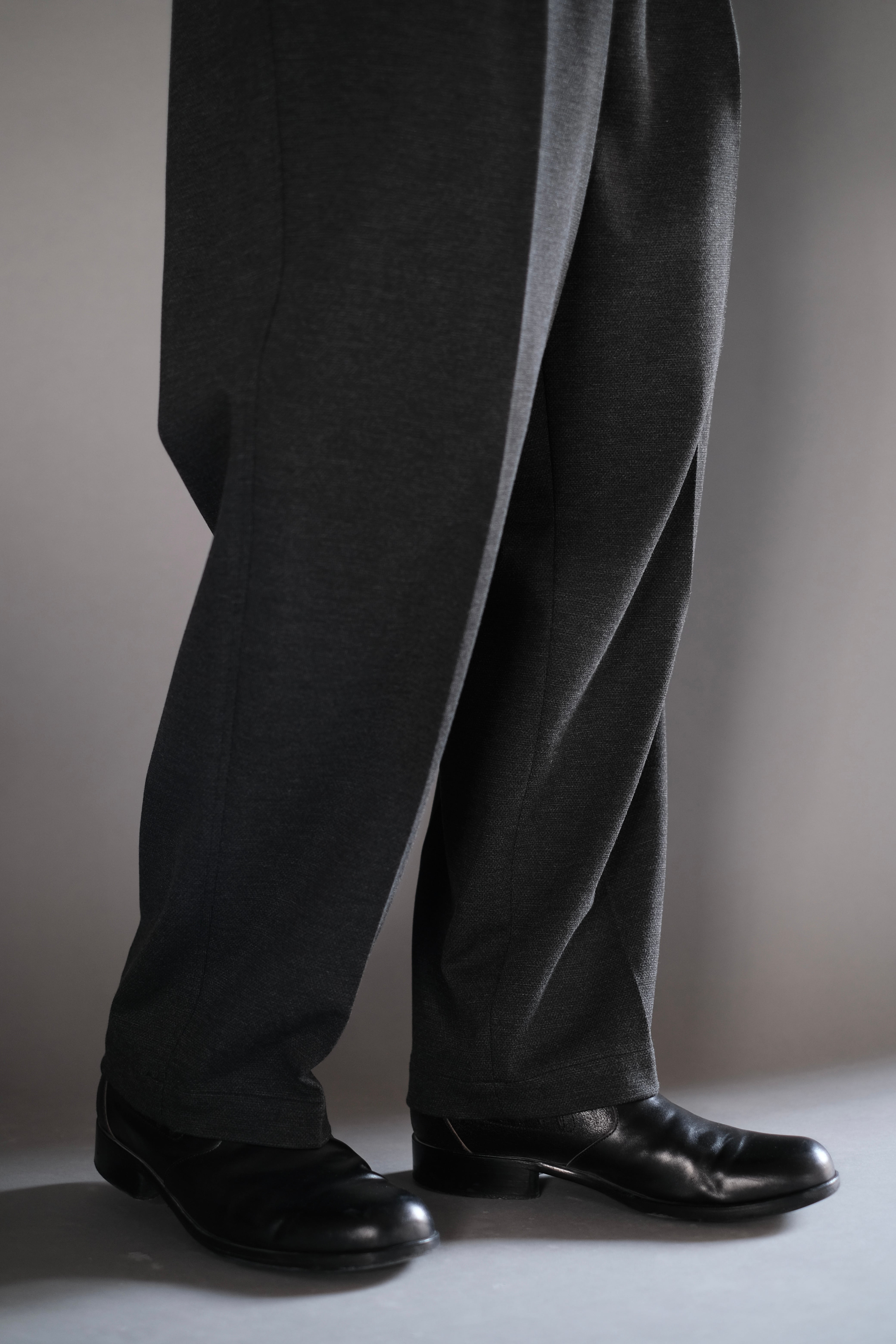 布帛を思わせる滑らかなタッチと、ハリを備えながらも身体に馴染むしなやかさが魅力です。ウエスト後ろ側にゴムを入れてイージーなフィット感を持たせつつ、フロントにはタックを施しクラシックな雰囲気をプラス。