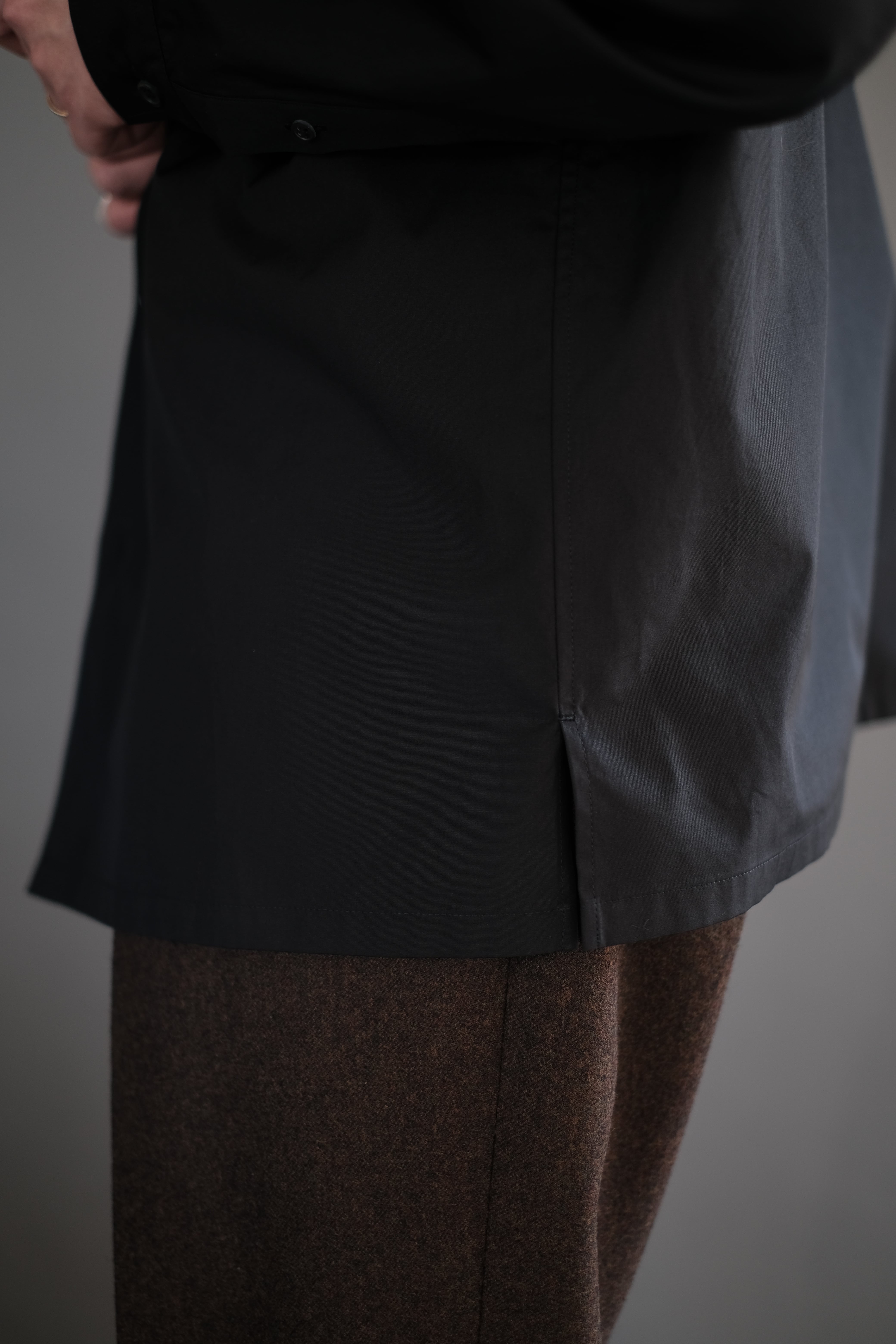 シンプルな中に緊張感を残した、モードな雰囲気の一着。