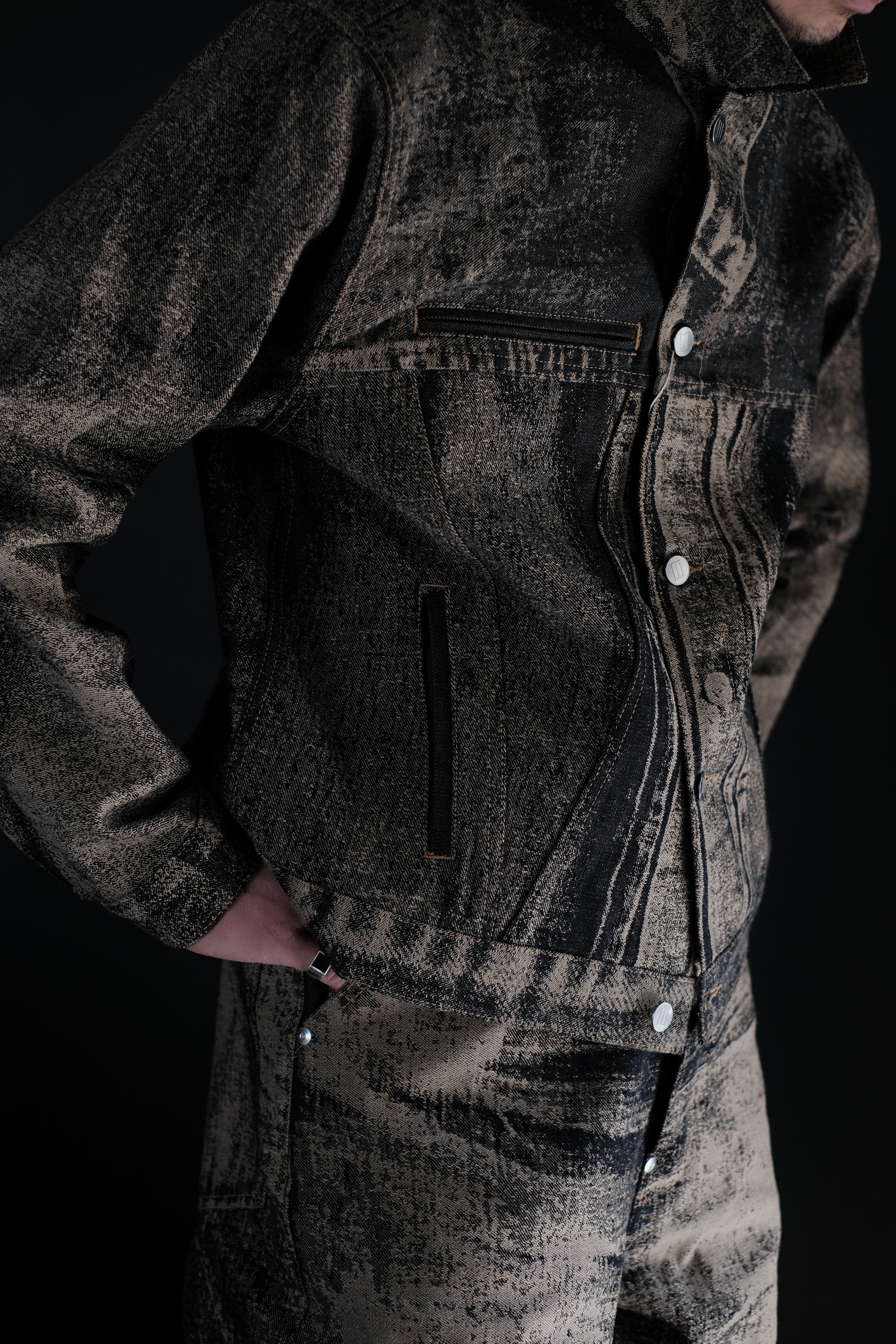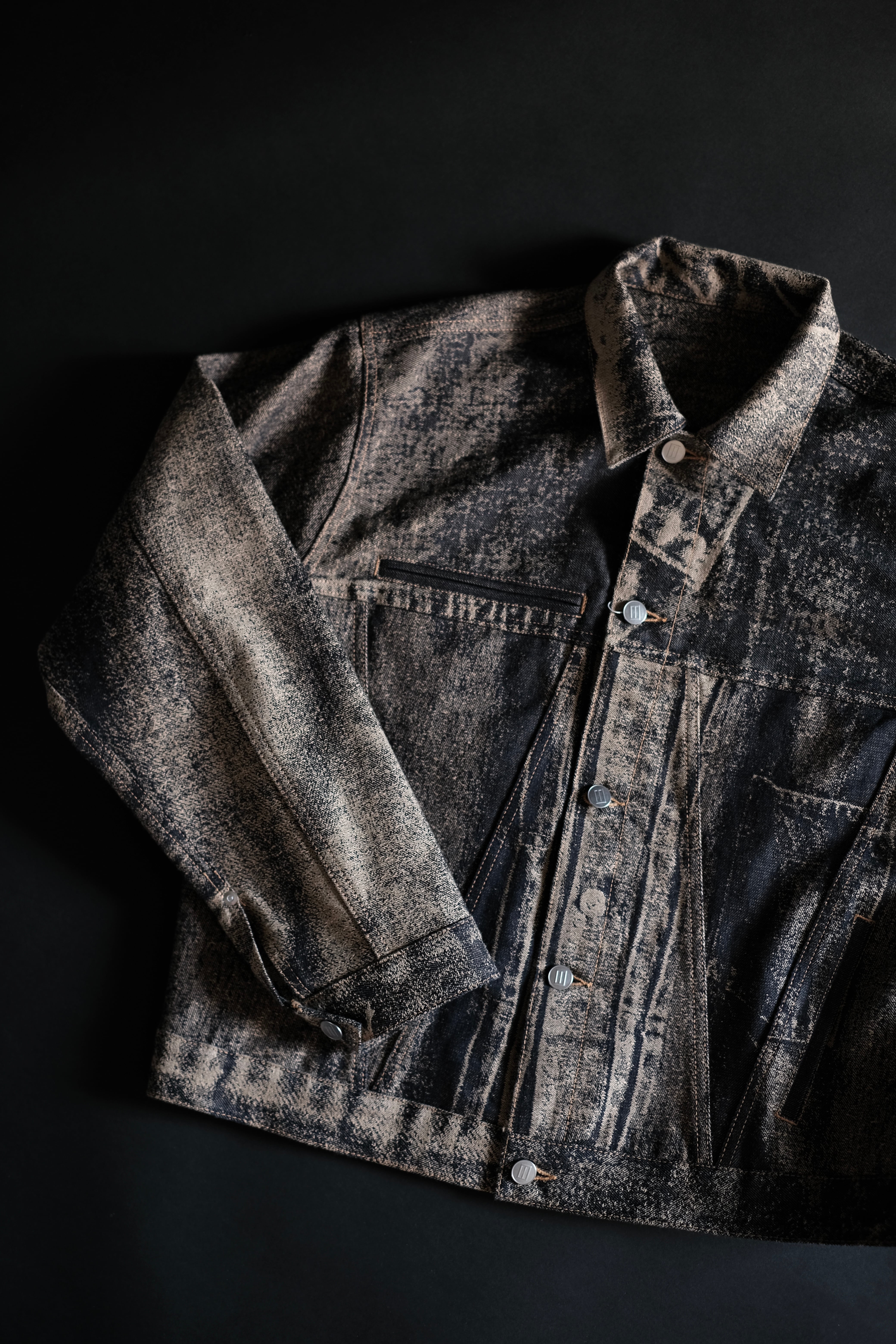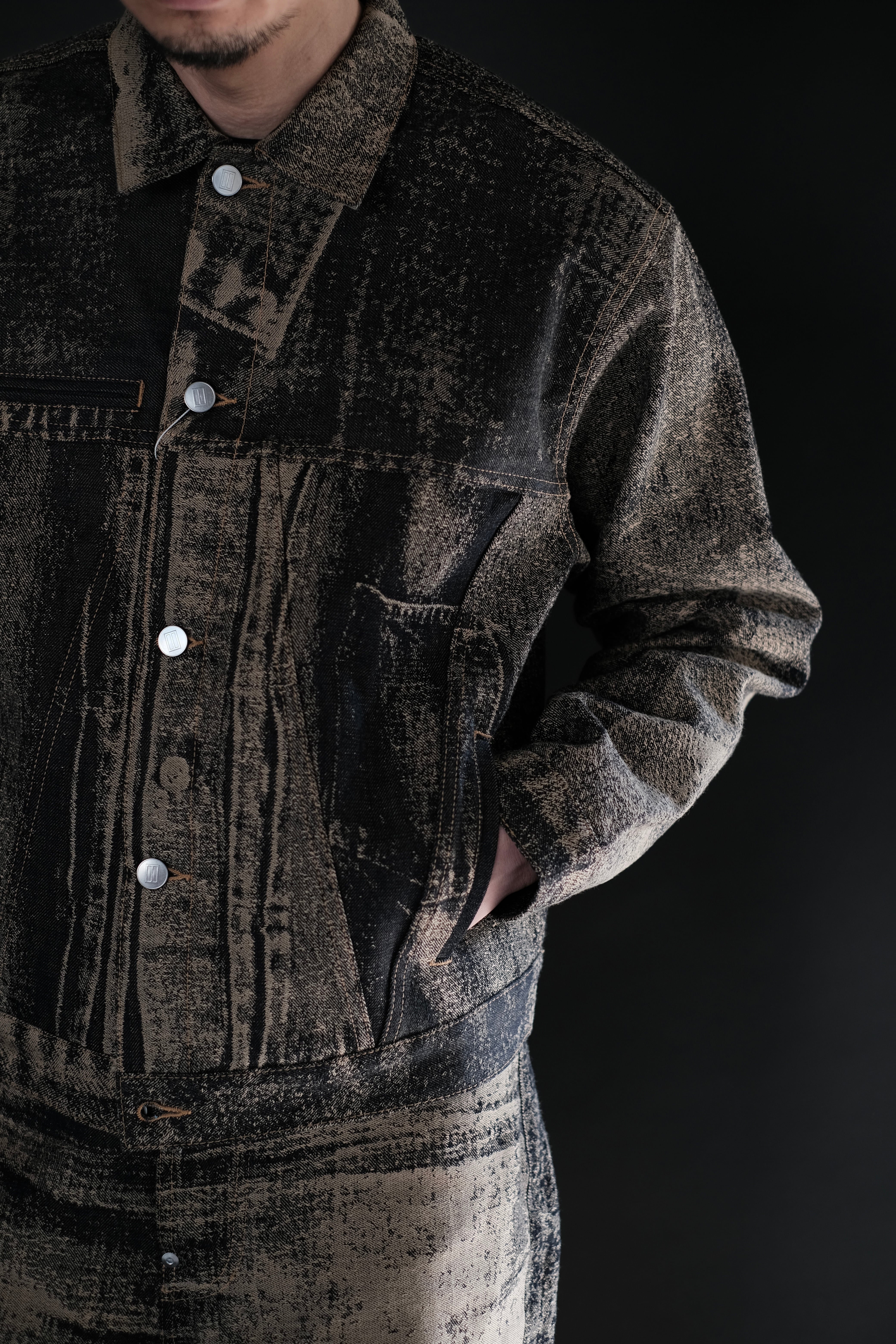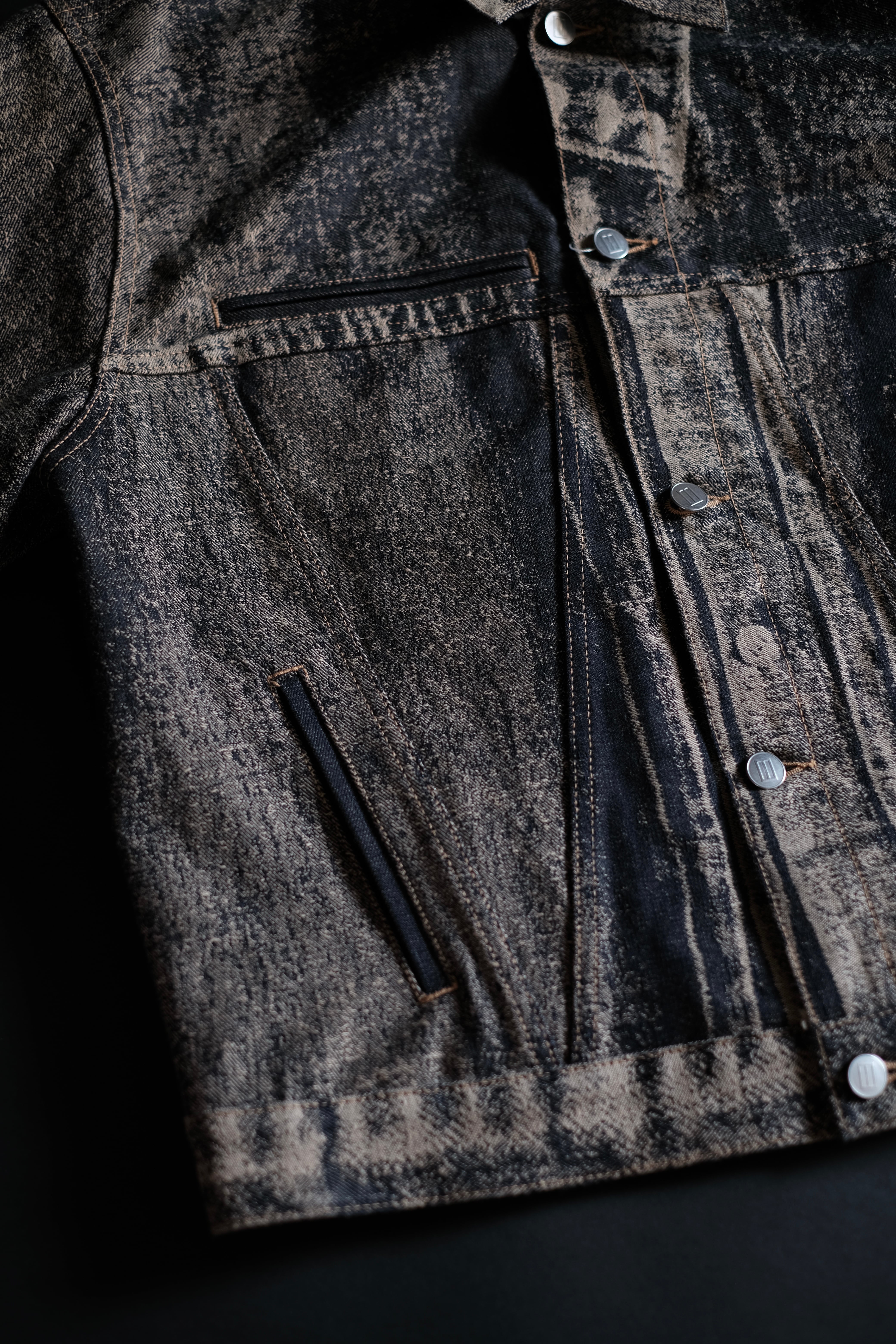 一般的に多く見られる転写(プリント)表現とは異なり、本作は"織り”そのものによって柄と質感を形成したジャガード織のデニム。
