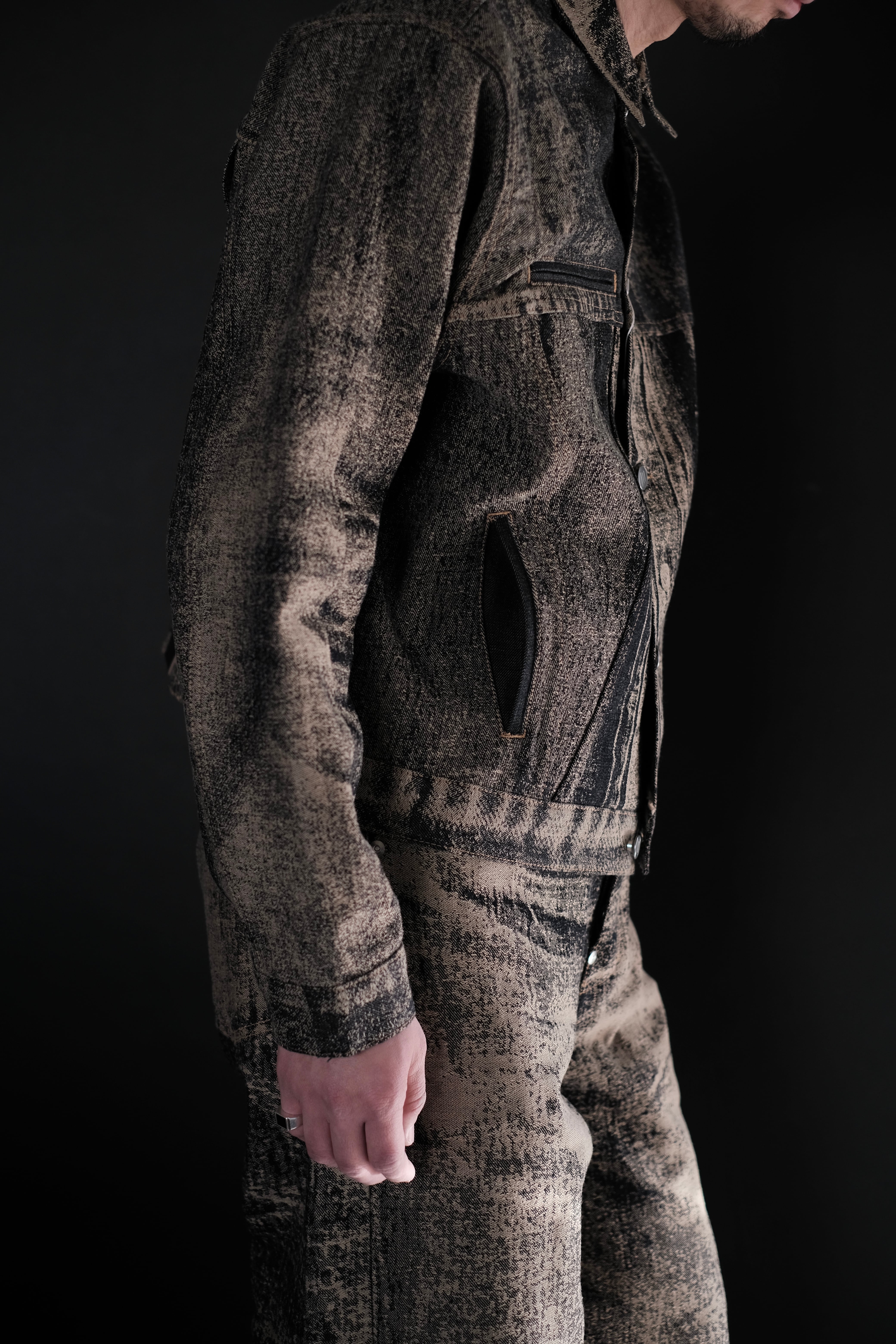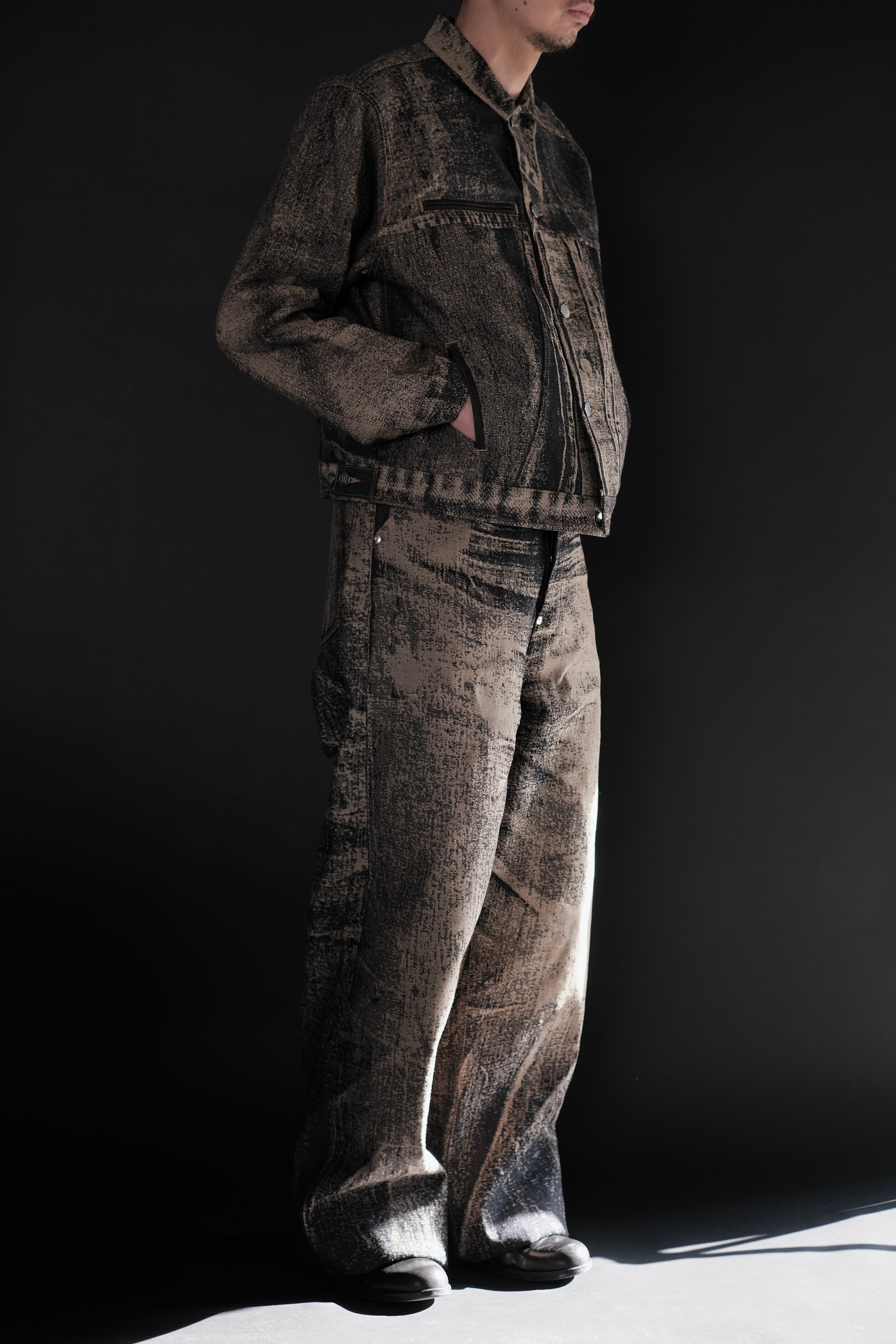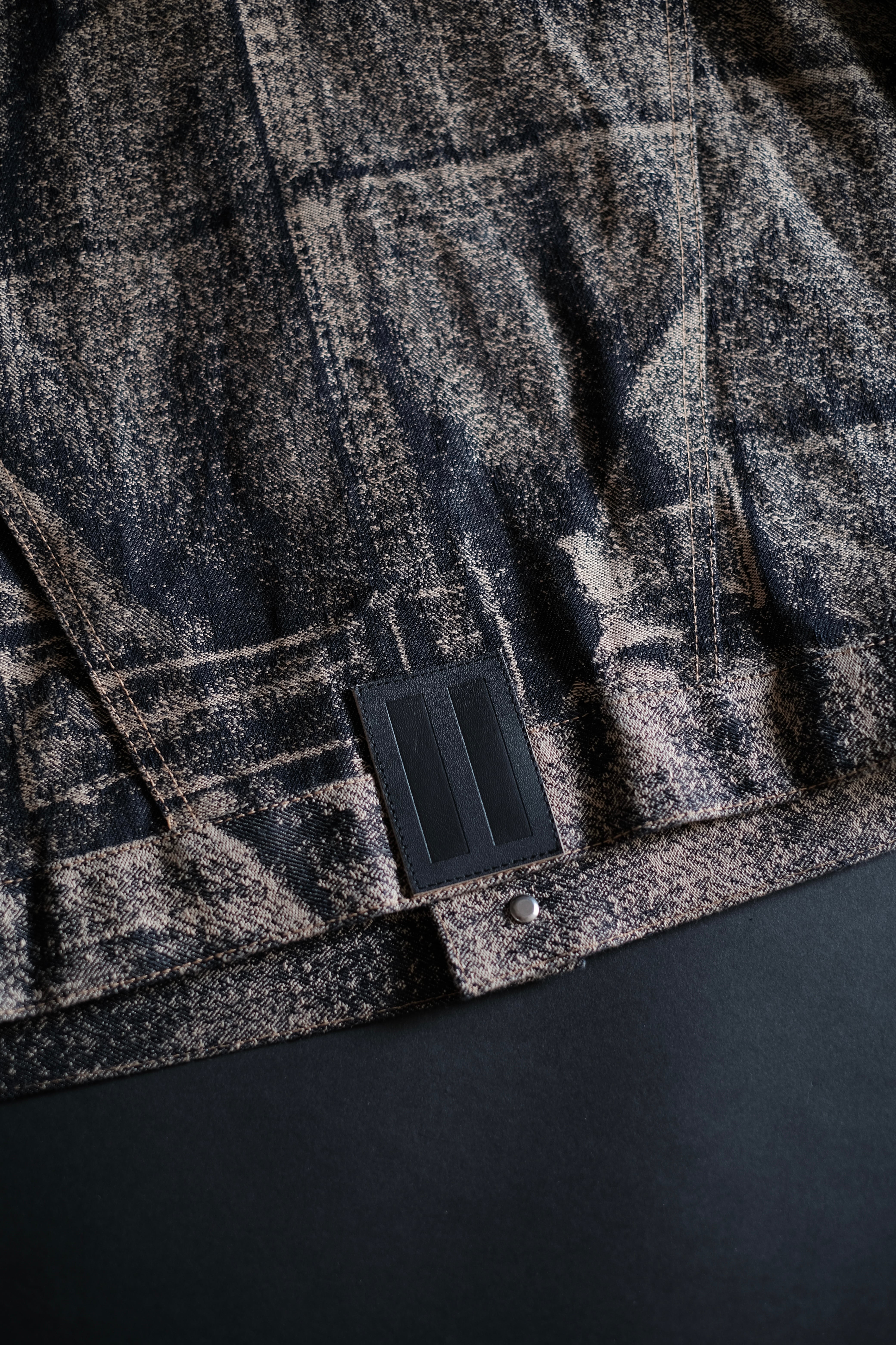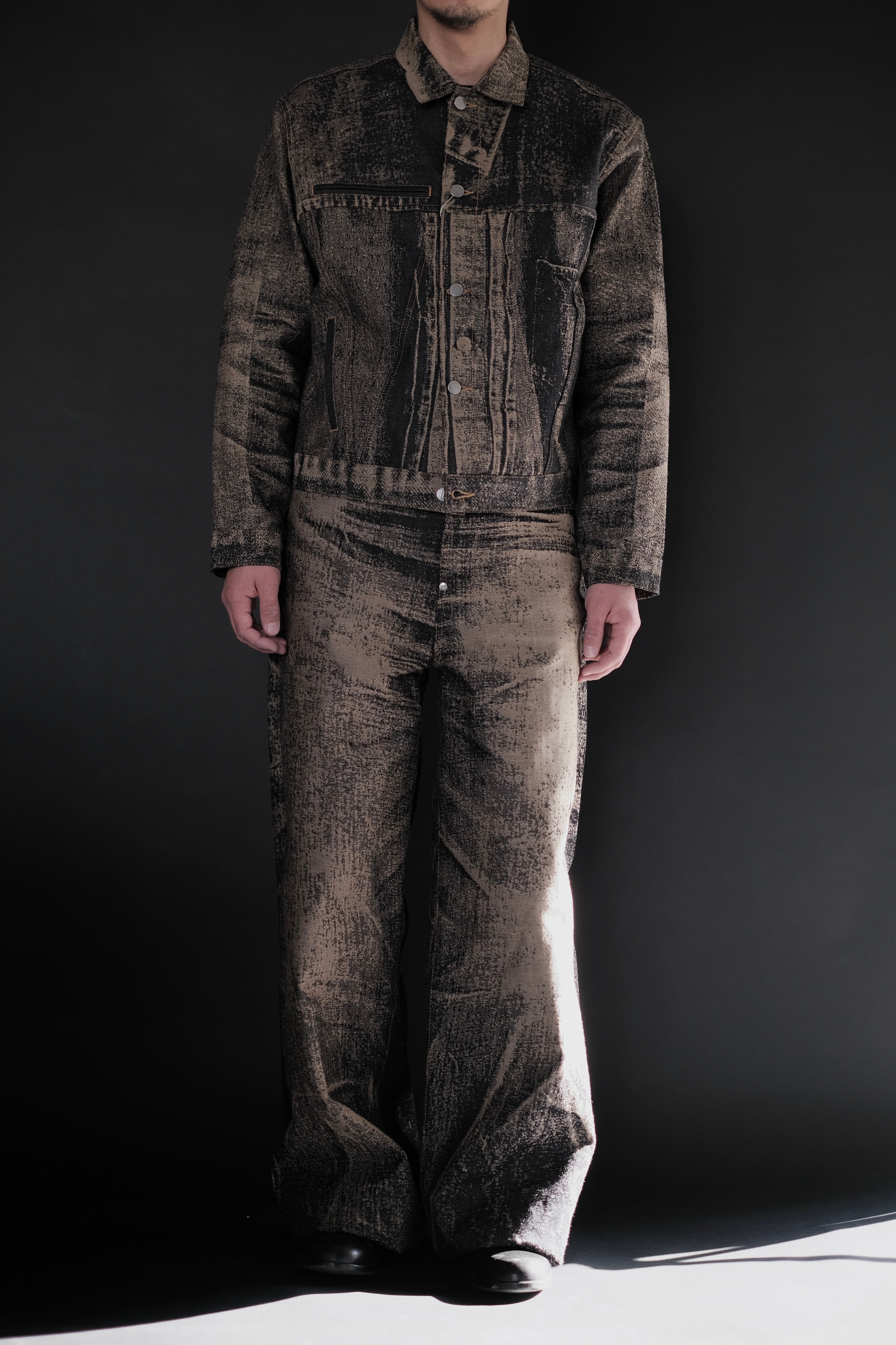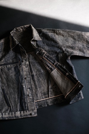 一般的に多く見られる転写(プリント)表現とは異なり、本作は"織り”そのものによって柄と質感を形成したジャガード織のデニム。