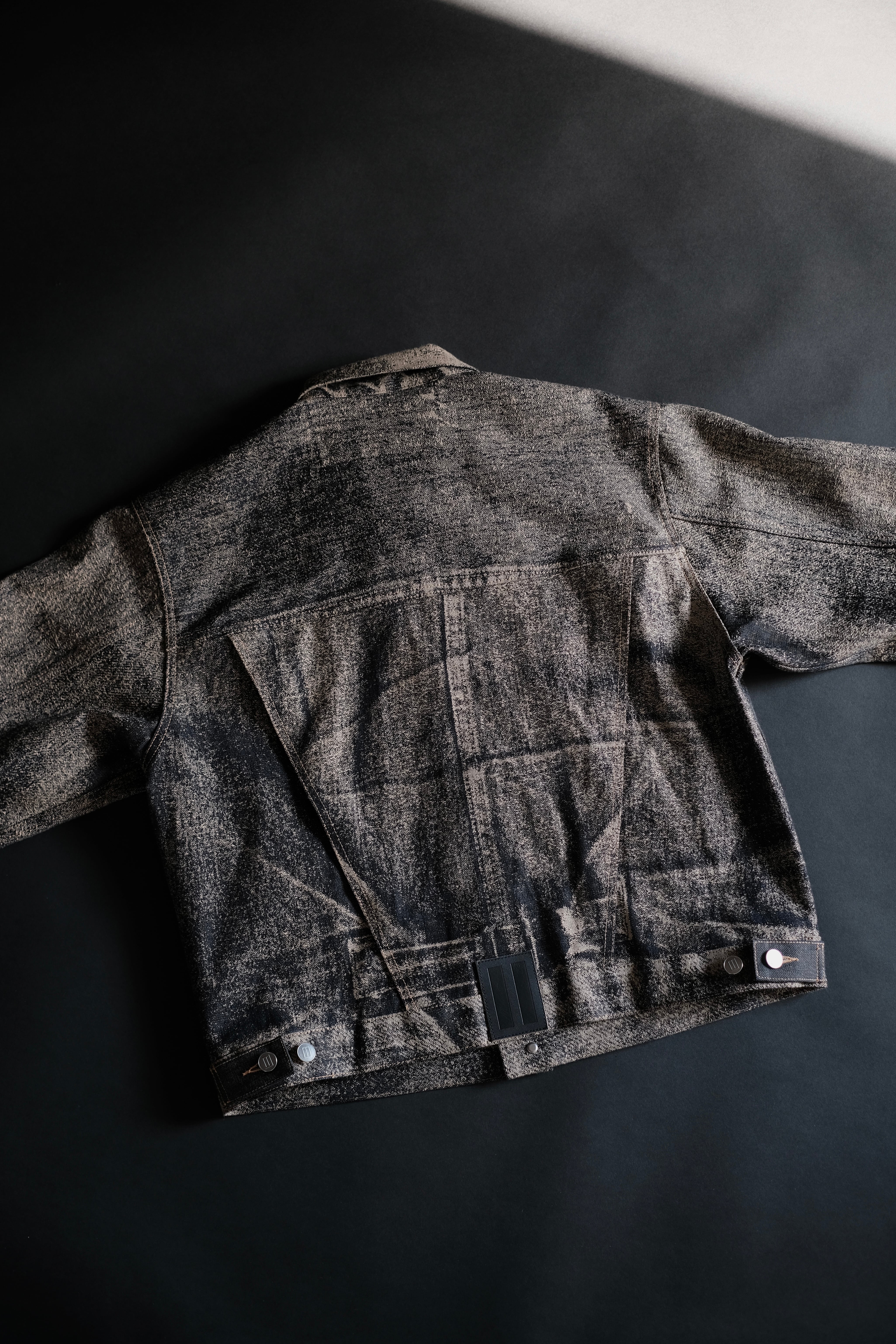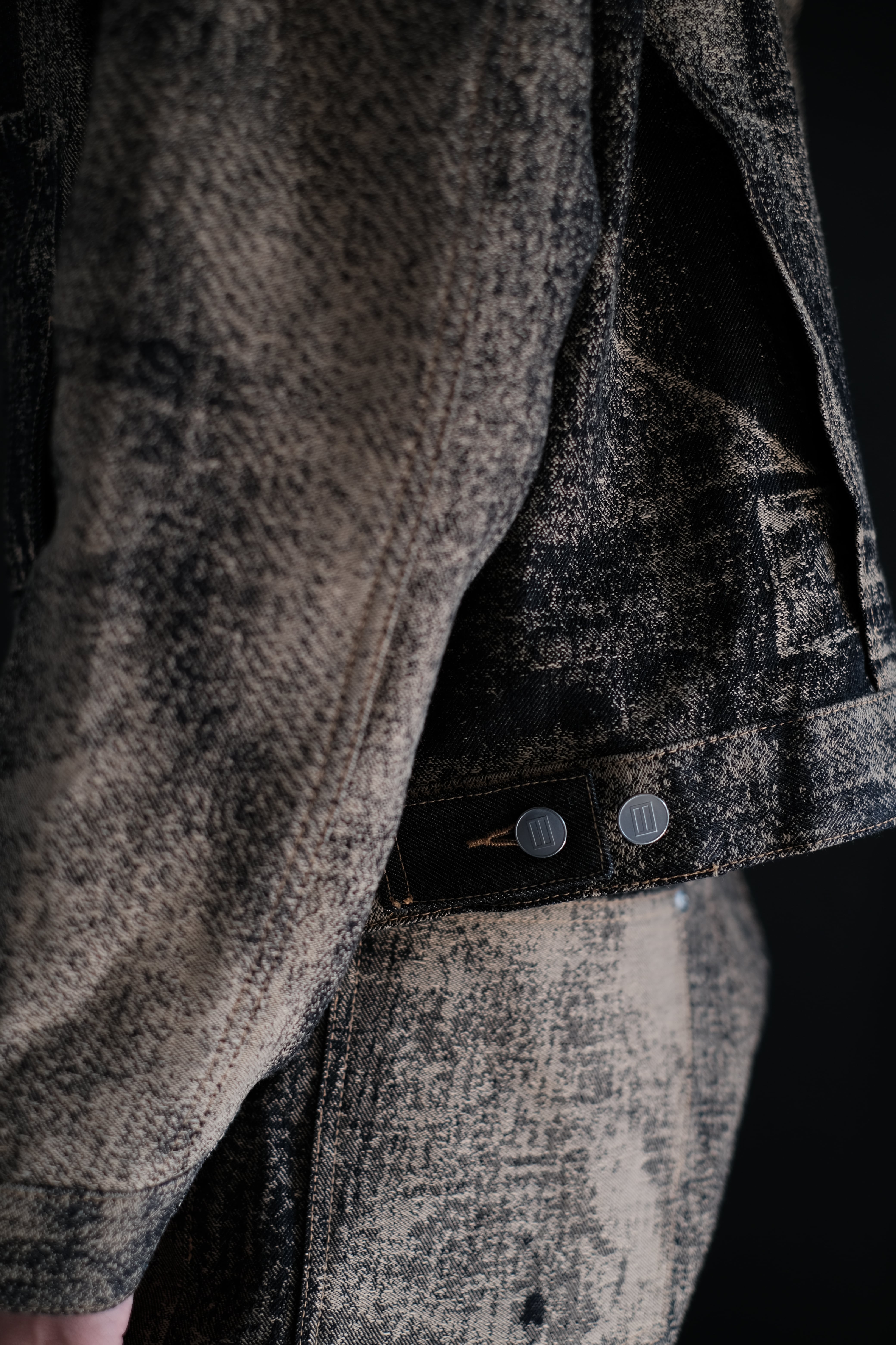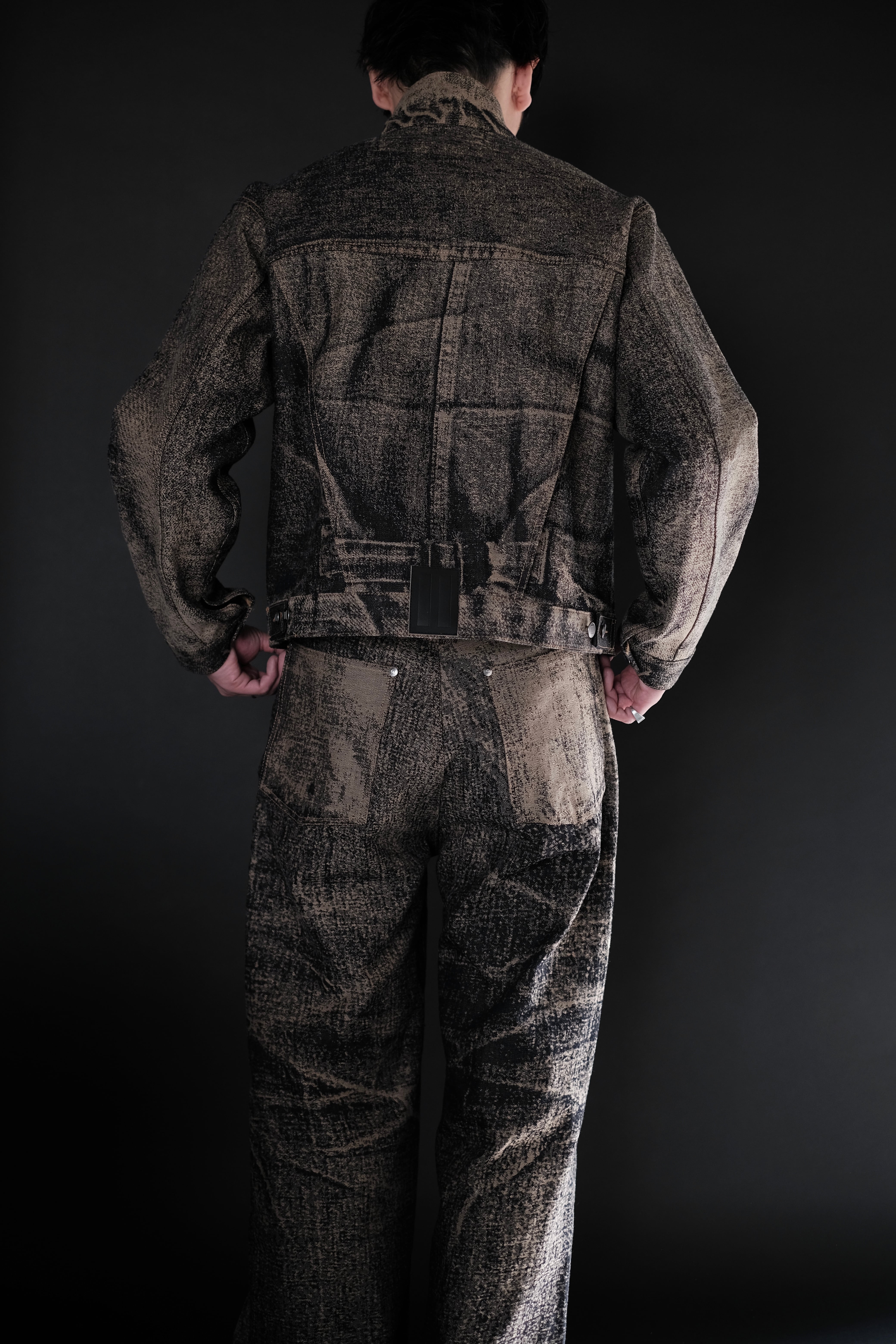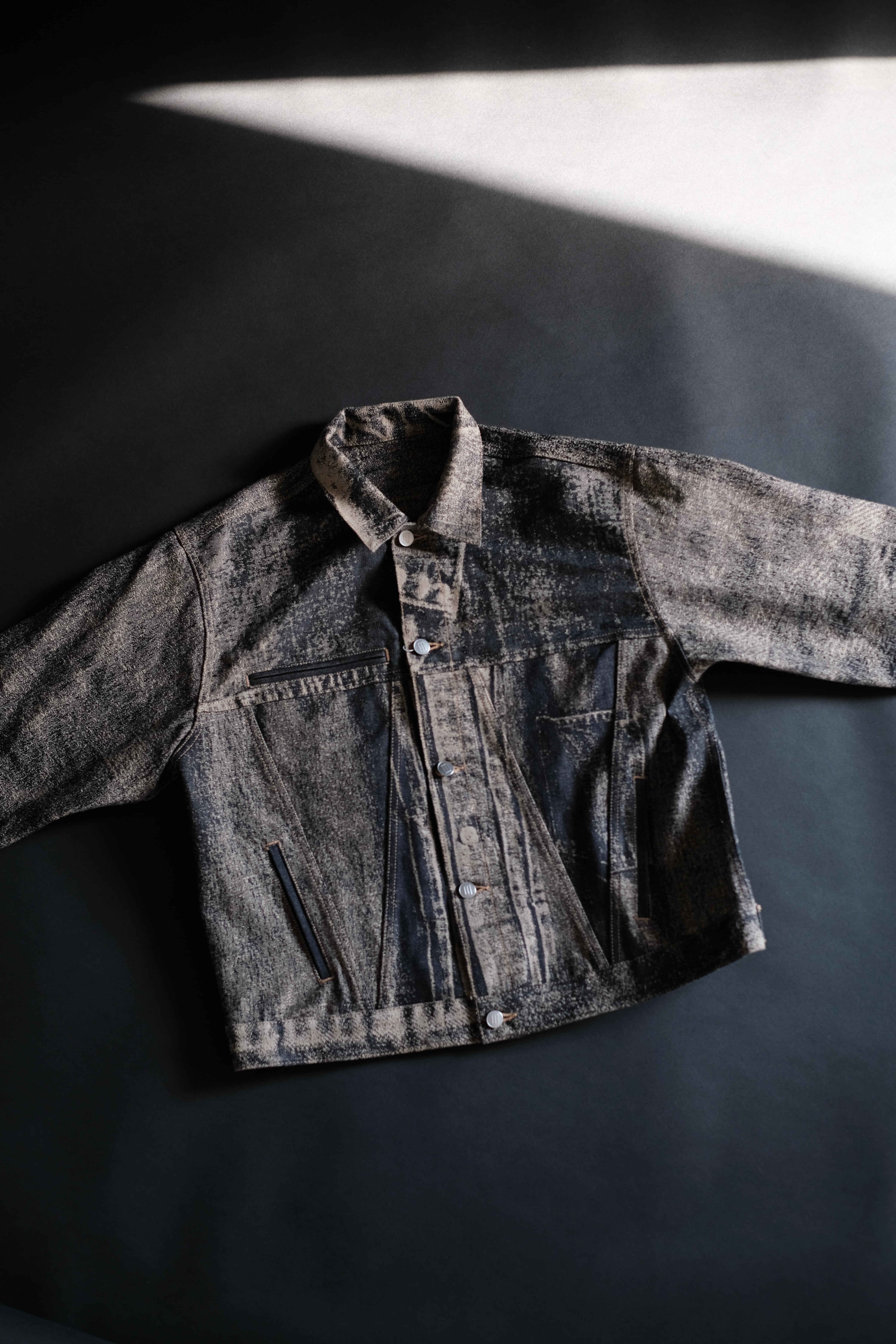 一般的に多く見られる転写(プリント)表現とは異なり、本作は"織り”そのものによって柄と質感を形成したジャガード織のデニム。