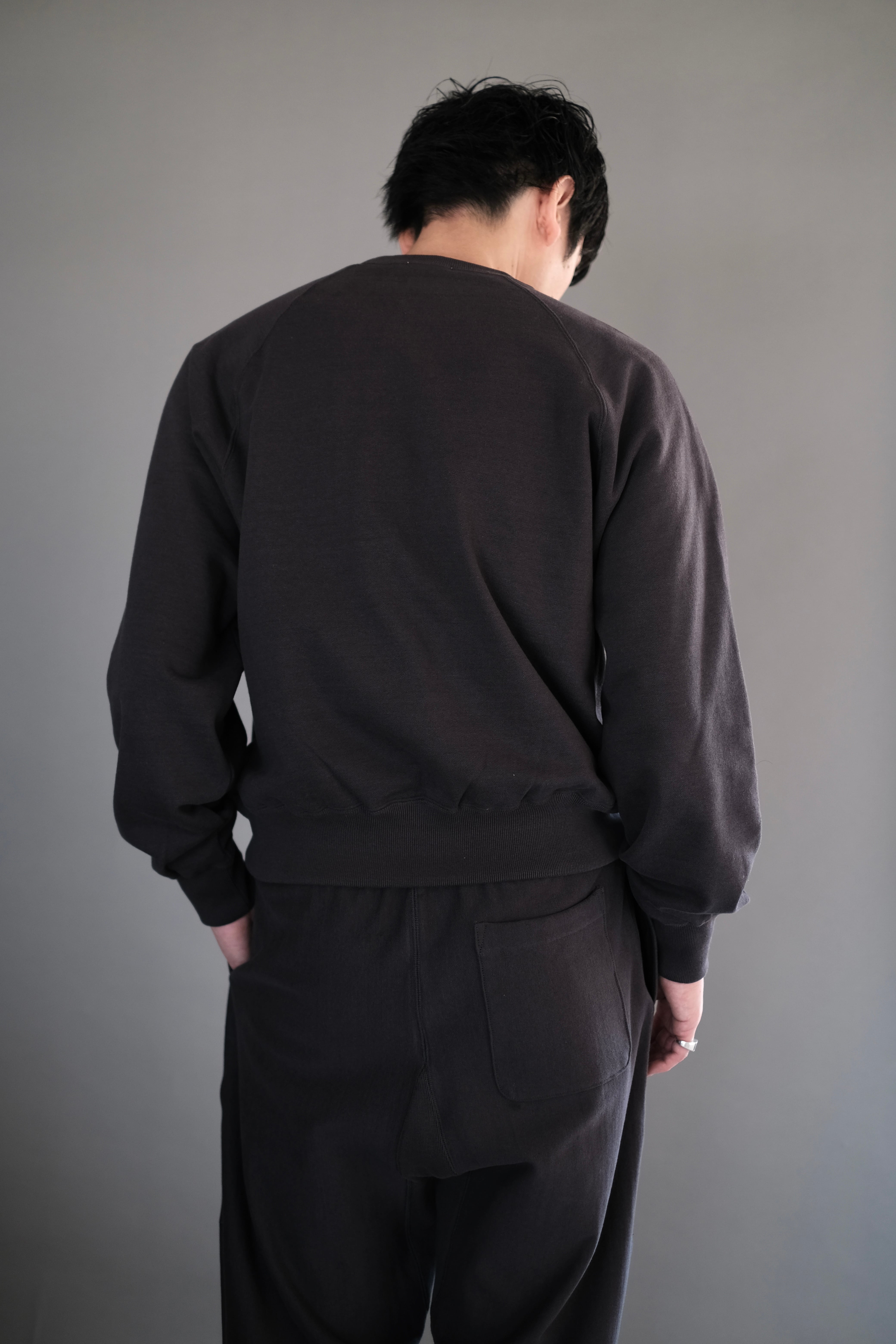 表糸に粗挽き杢グレーの強撚糸、裏糸に無撚糸を使用した裏毛。