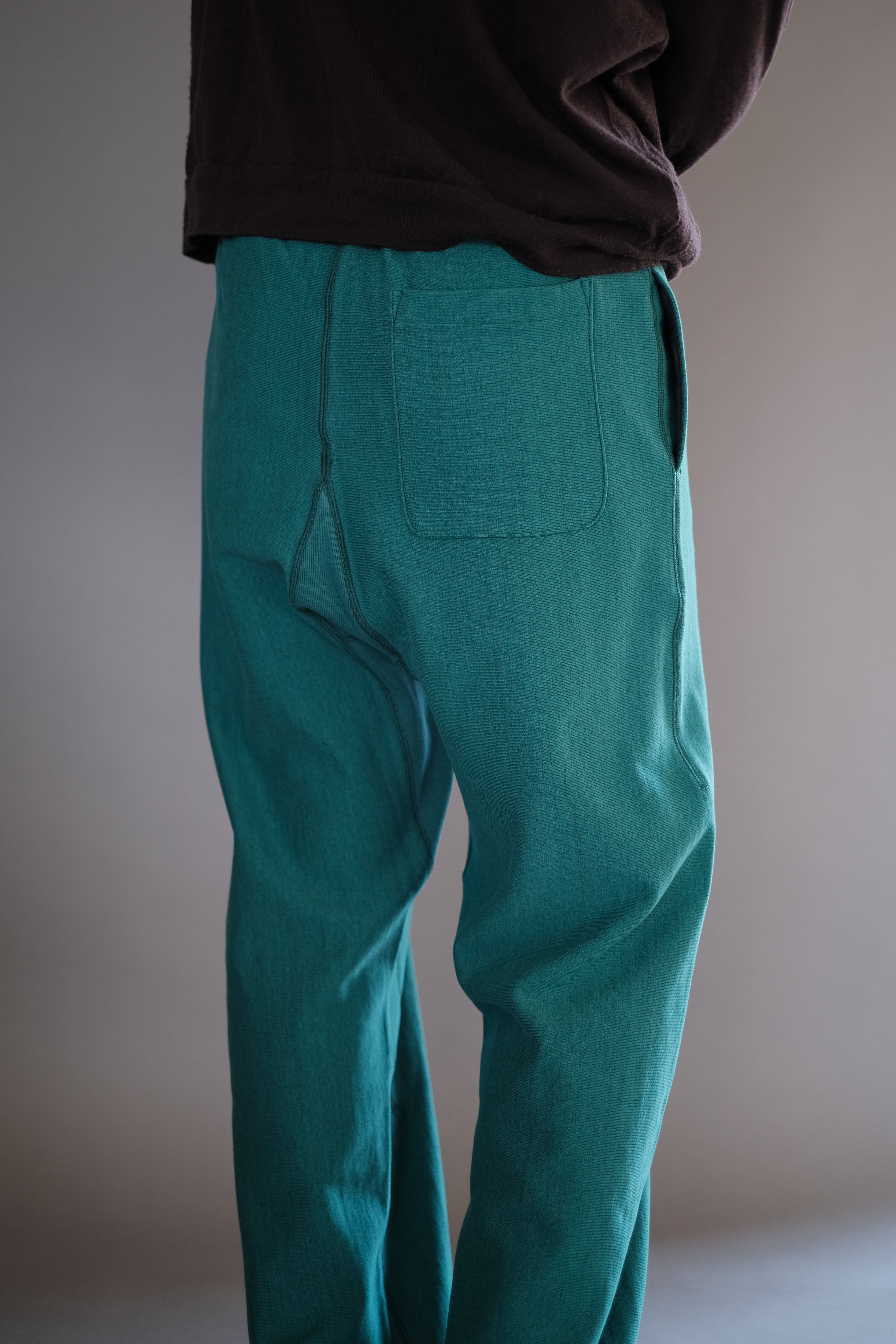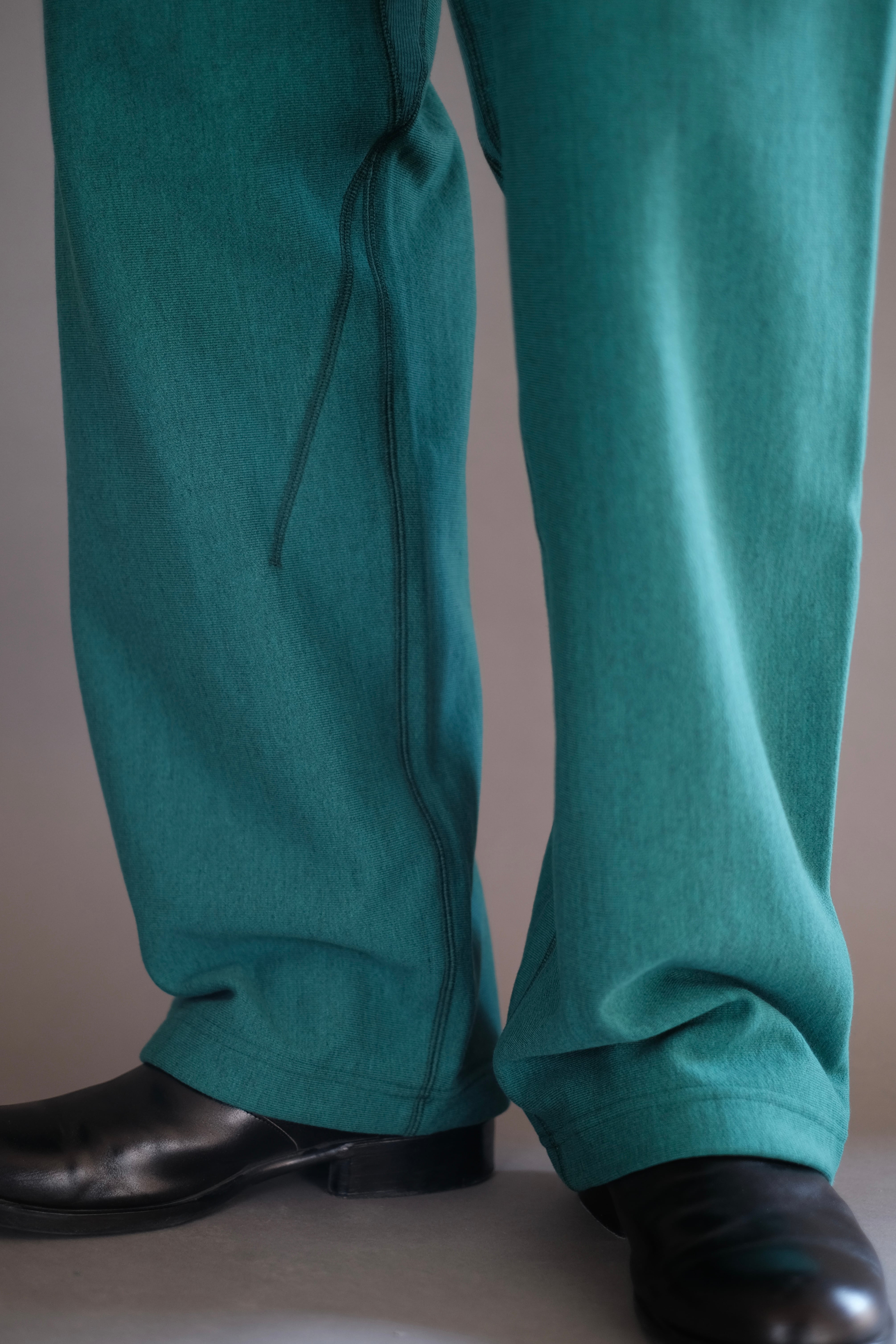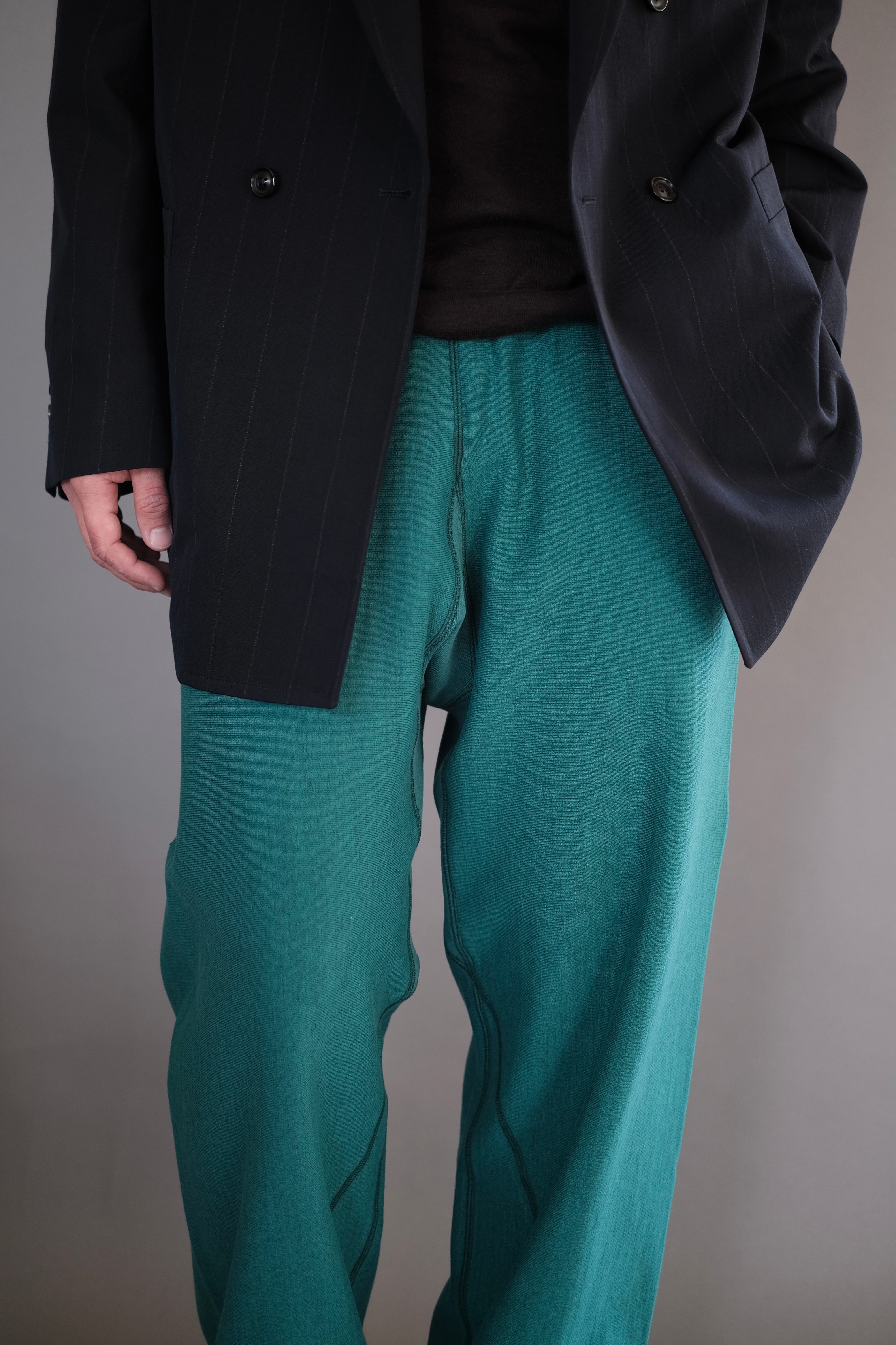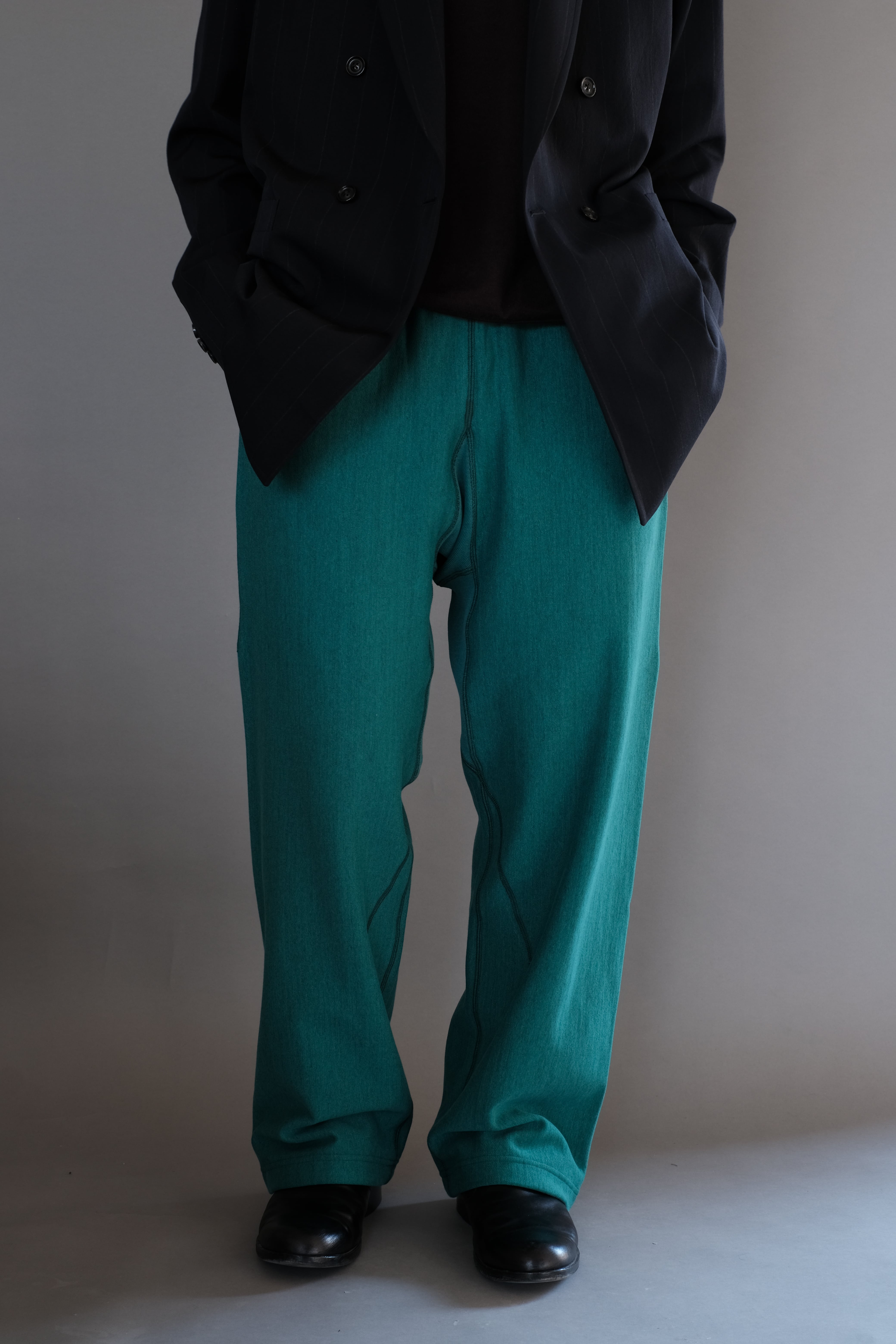 リブの切り替えやステッチワークでアクセントをつけたスウェットパンツは、アウトシームを排除した直線的なパターンで、スラックスかのようなシルエットが特徴。