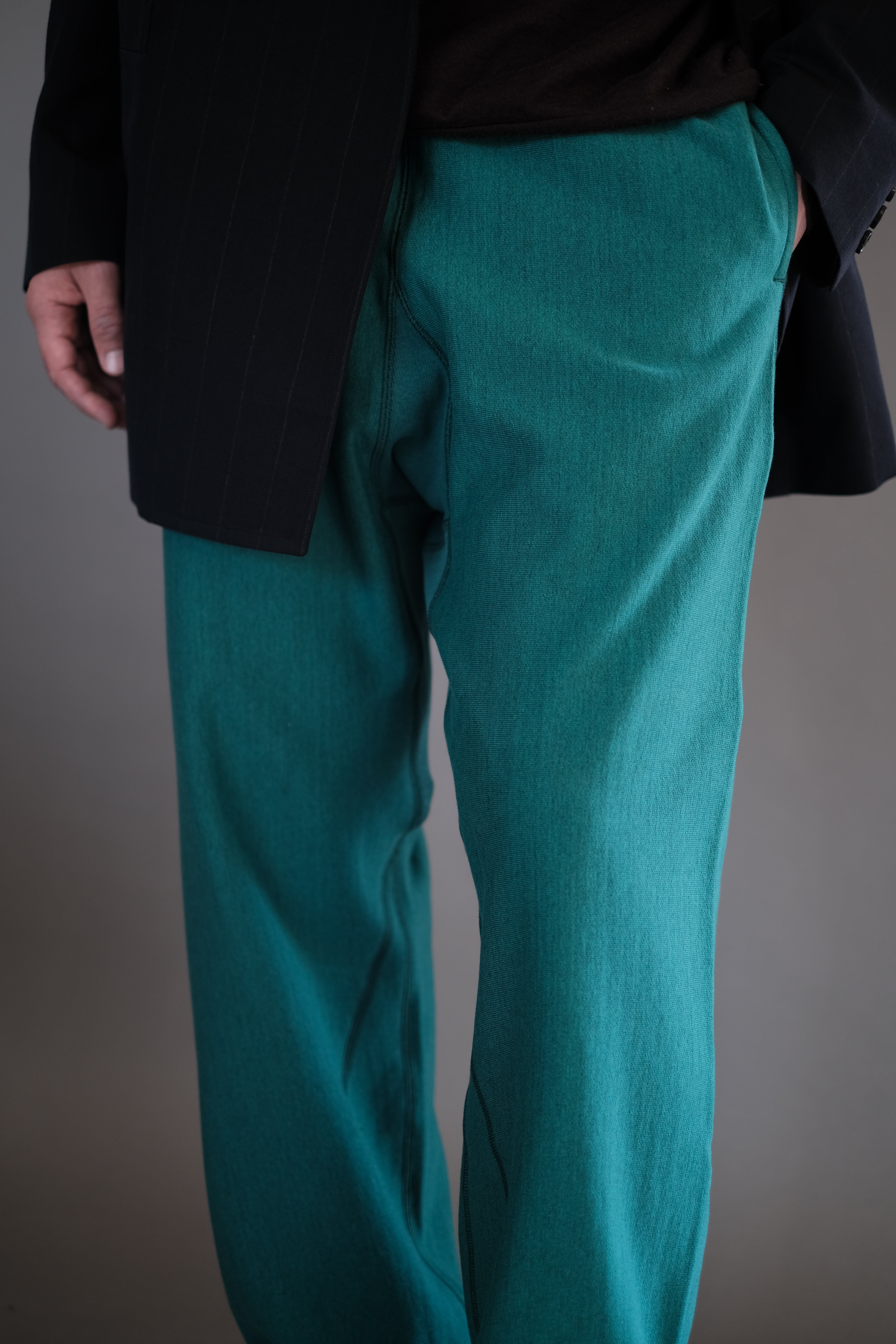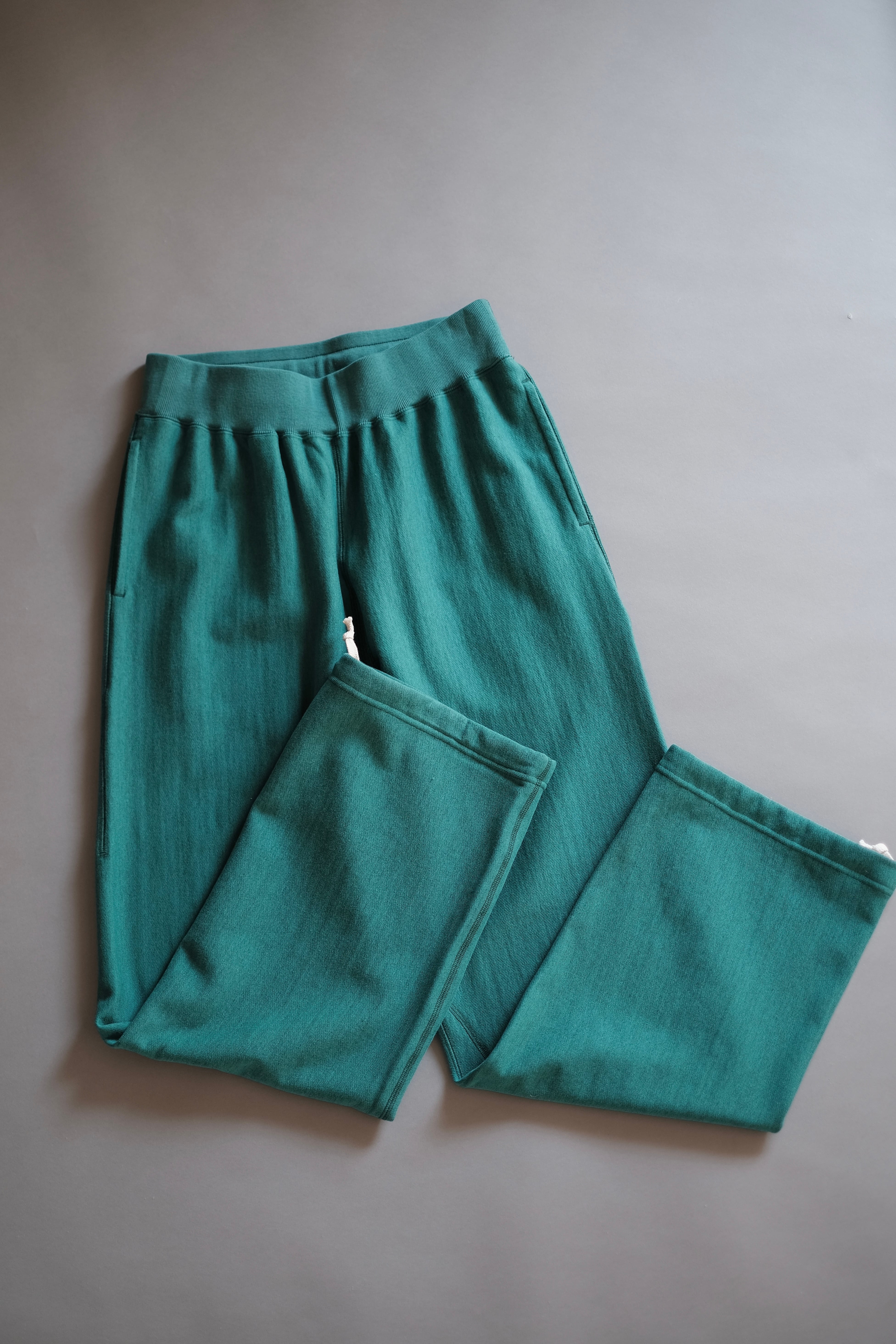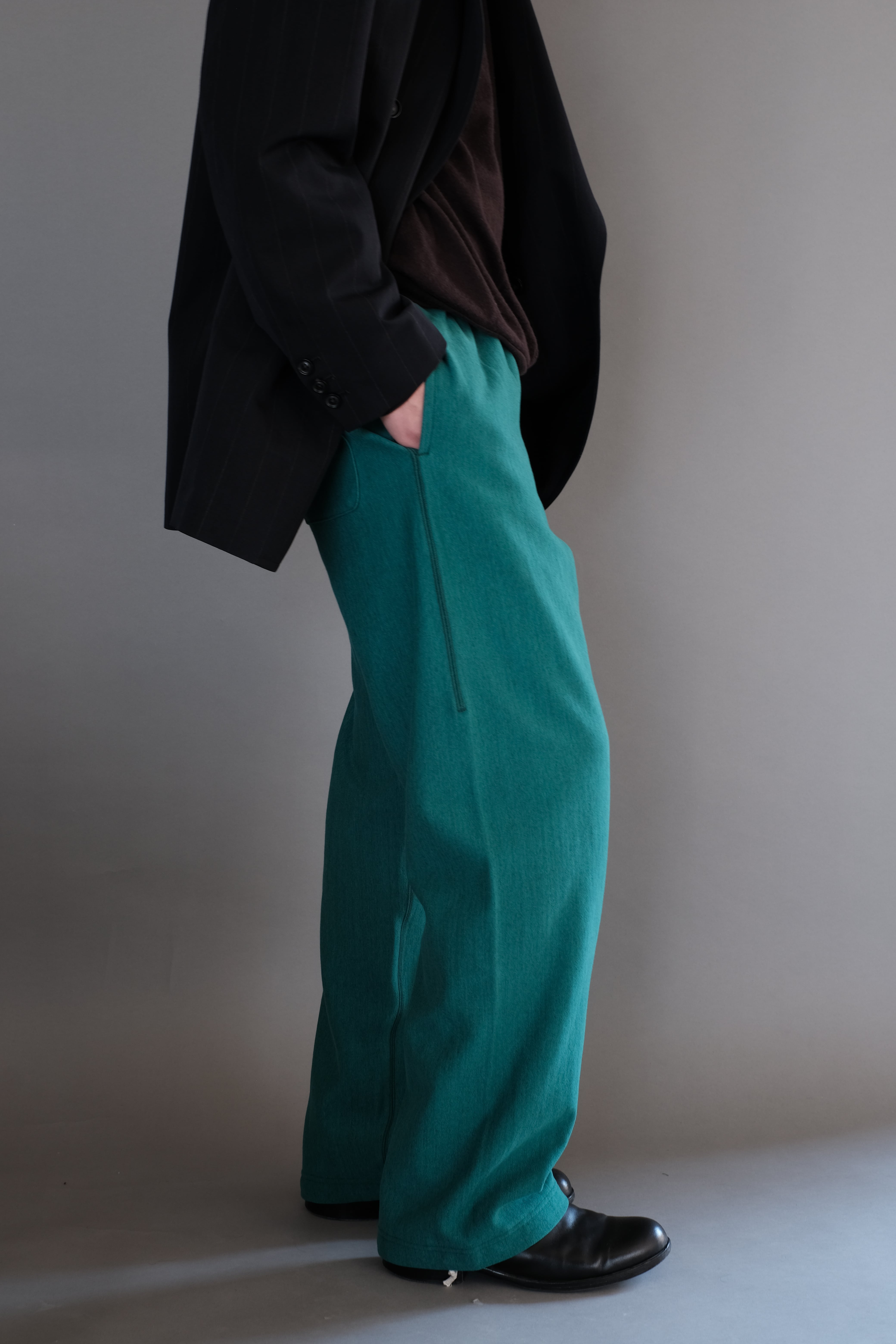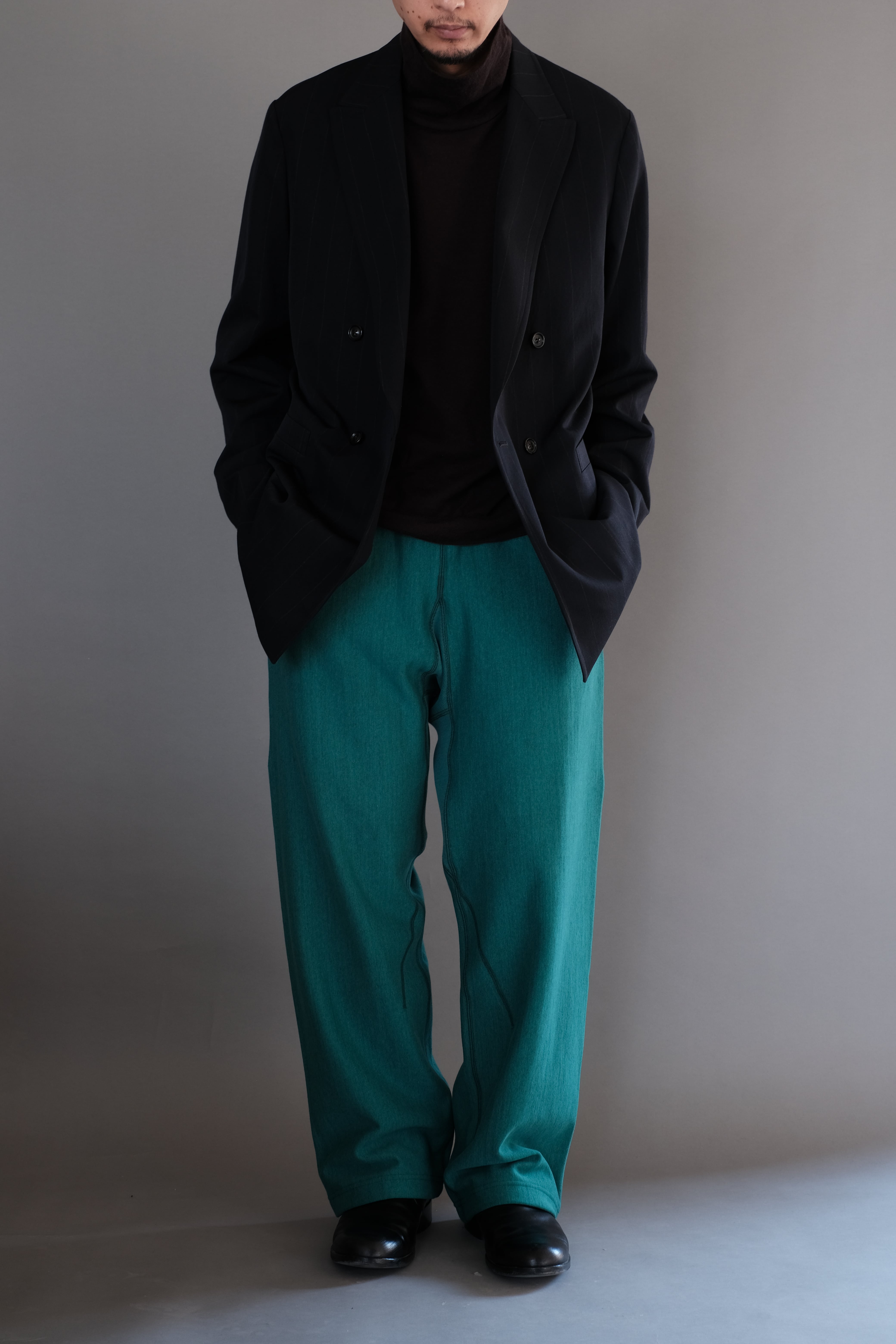 リブの切り替えやステッチワークでアクセントをつけたスウェットパンツは、アウトシームを排除した直線的なパターンで、スラックスかのようなシルエットが特徴。