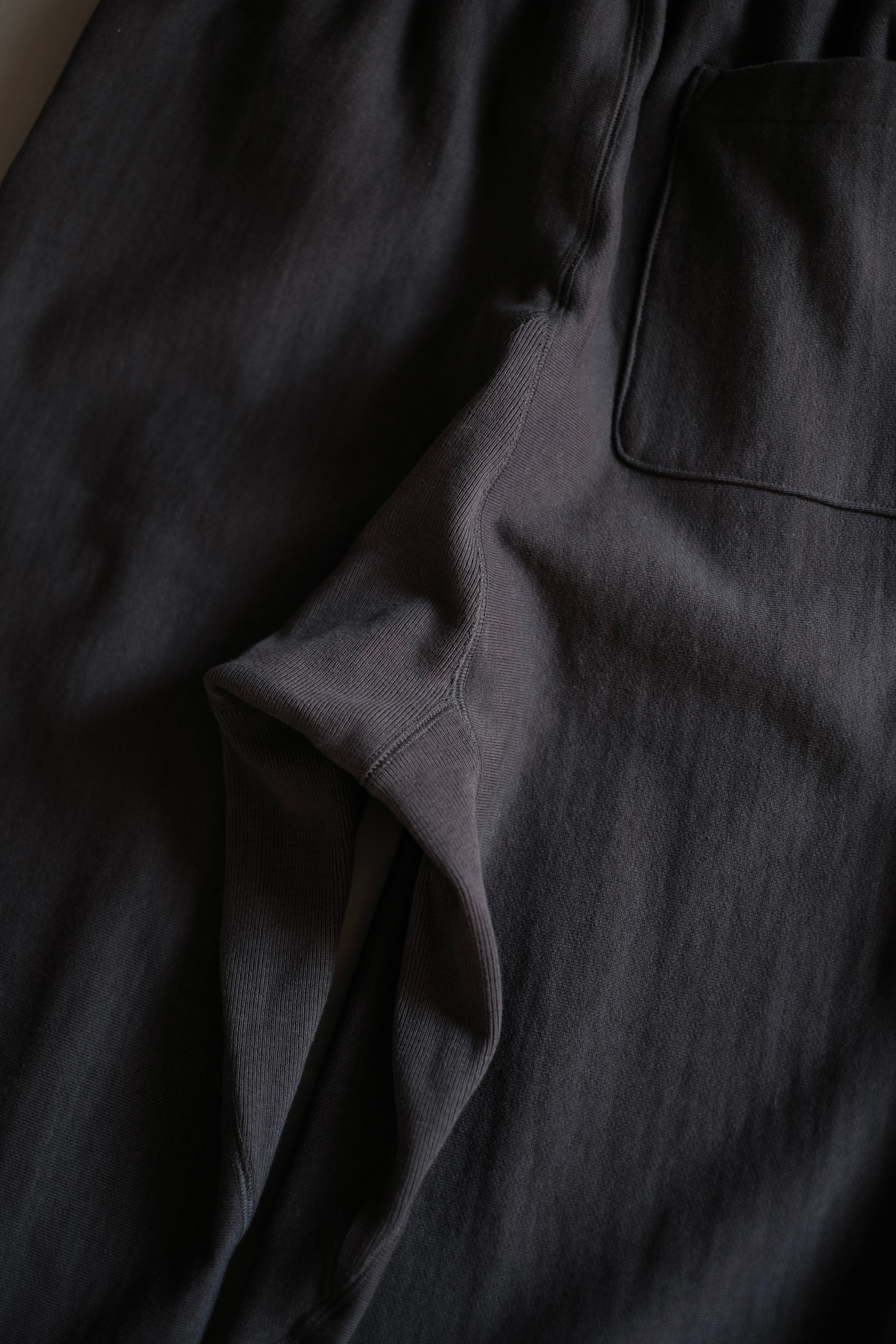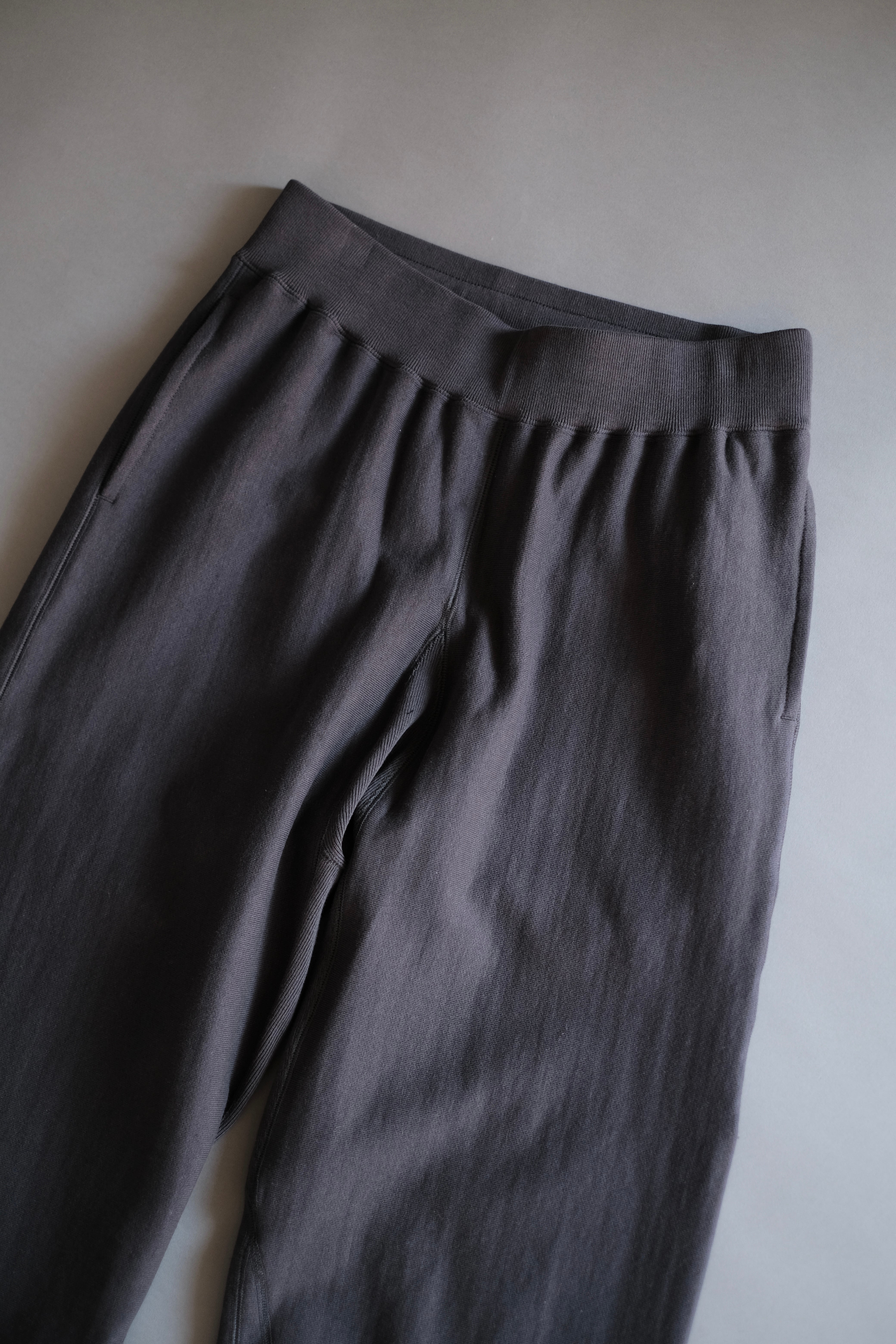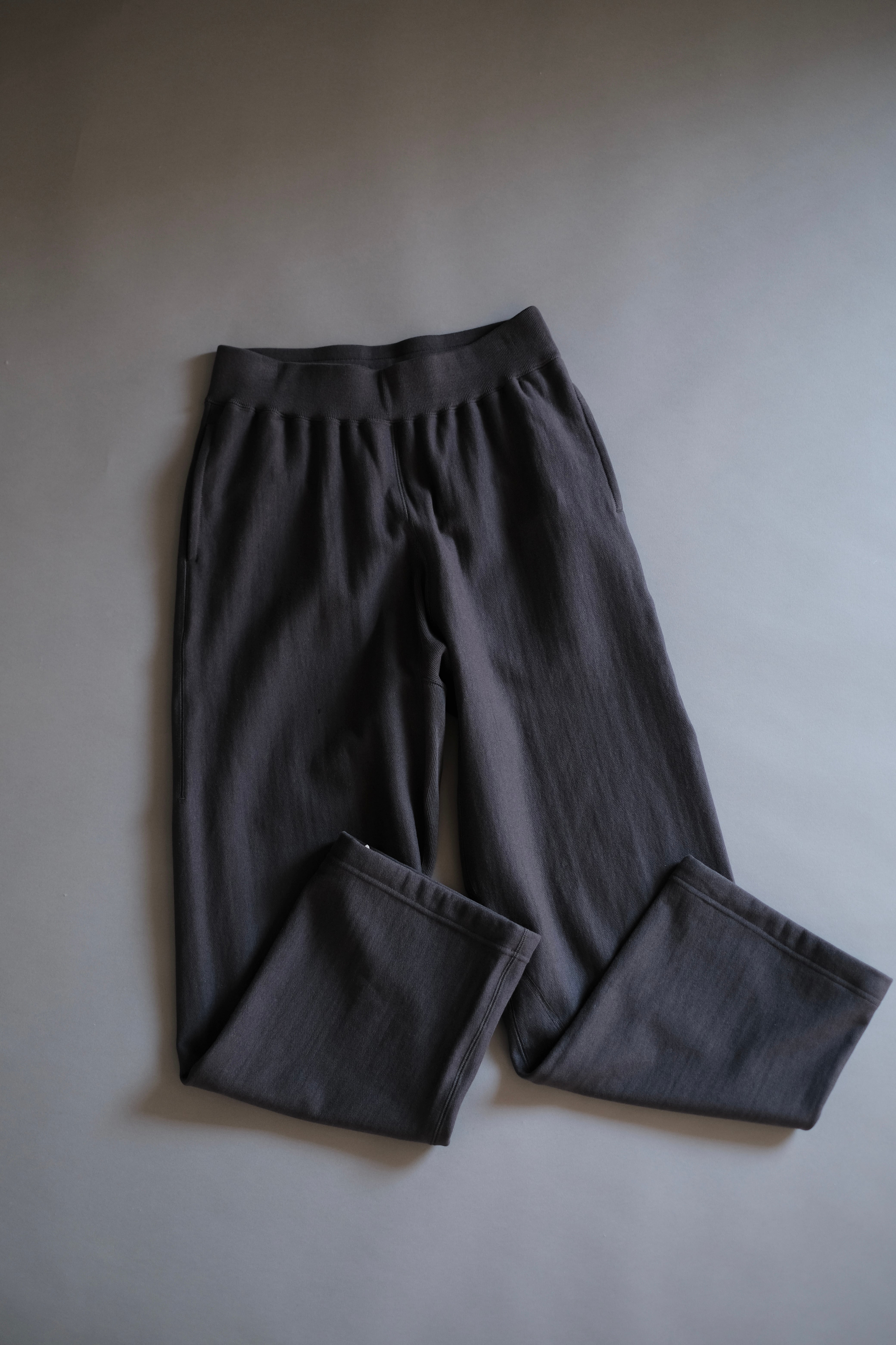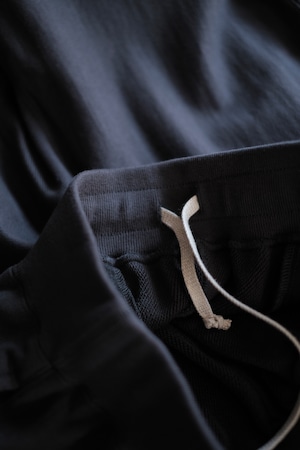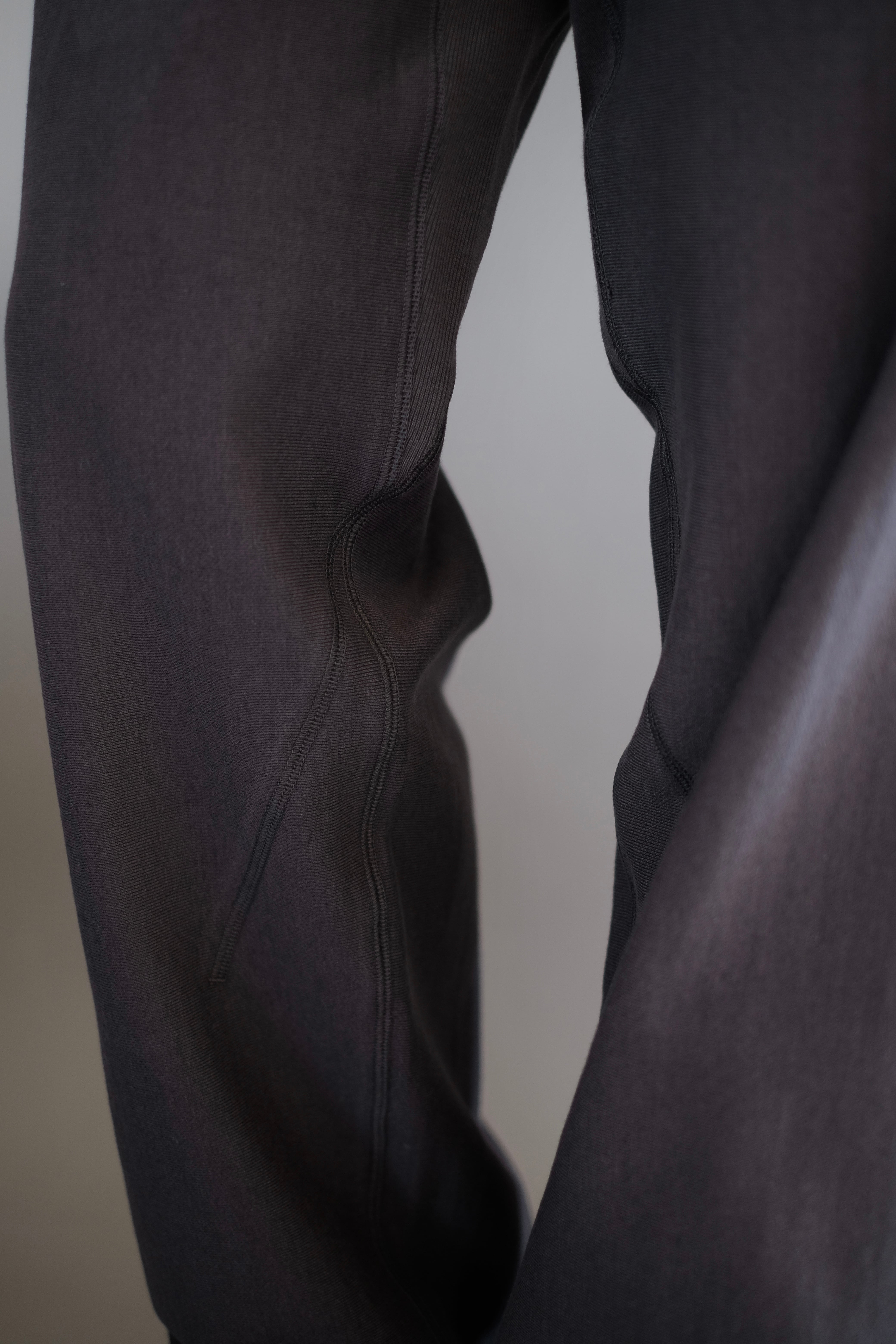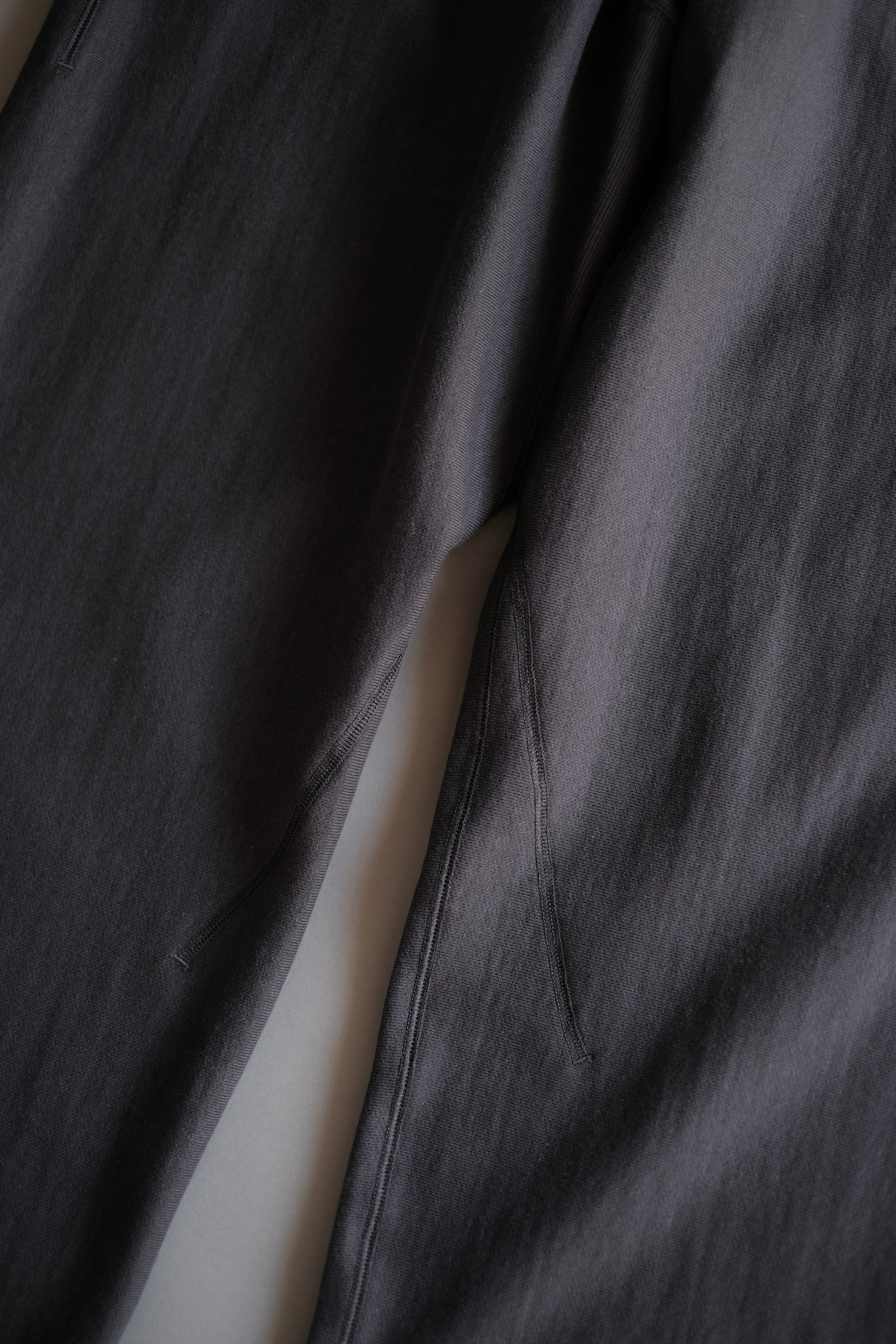 リブの切り替えやステッチワークでアクセントをつけたスウェットパンツは、アウトシームを排除した直線的なパターンで、スラックスかのようなシルエットが特徴。