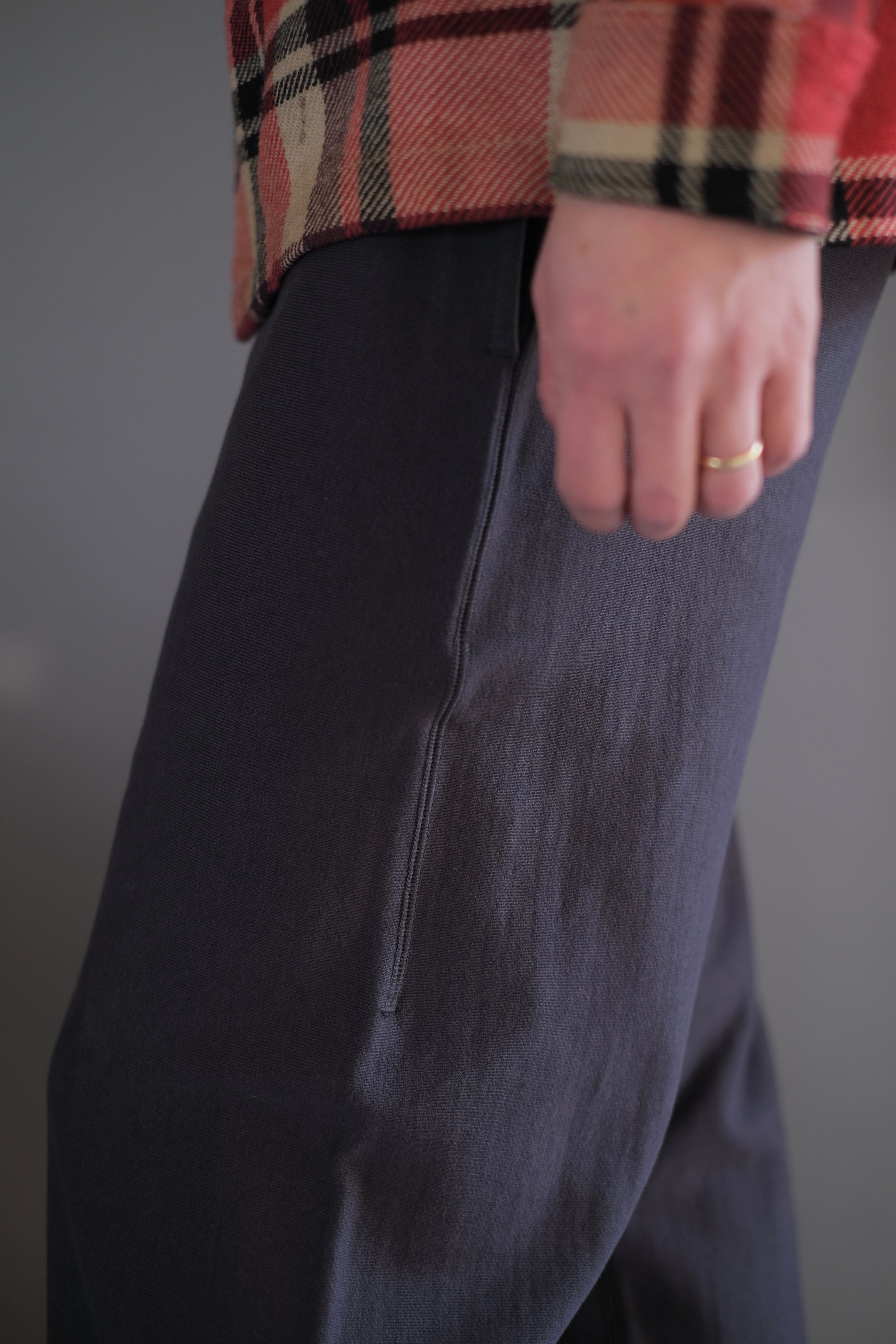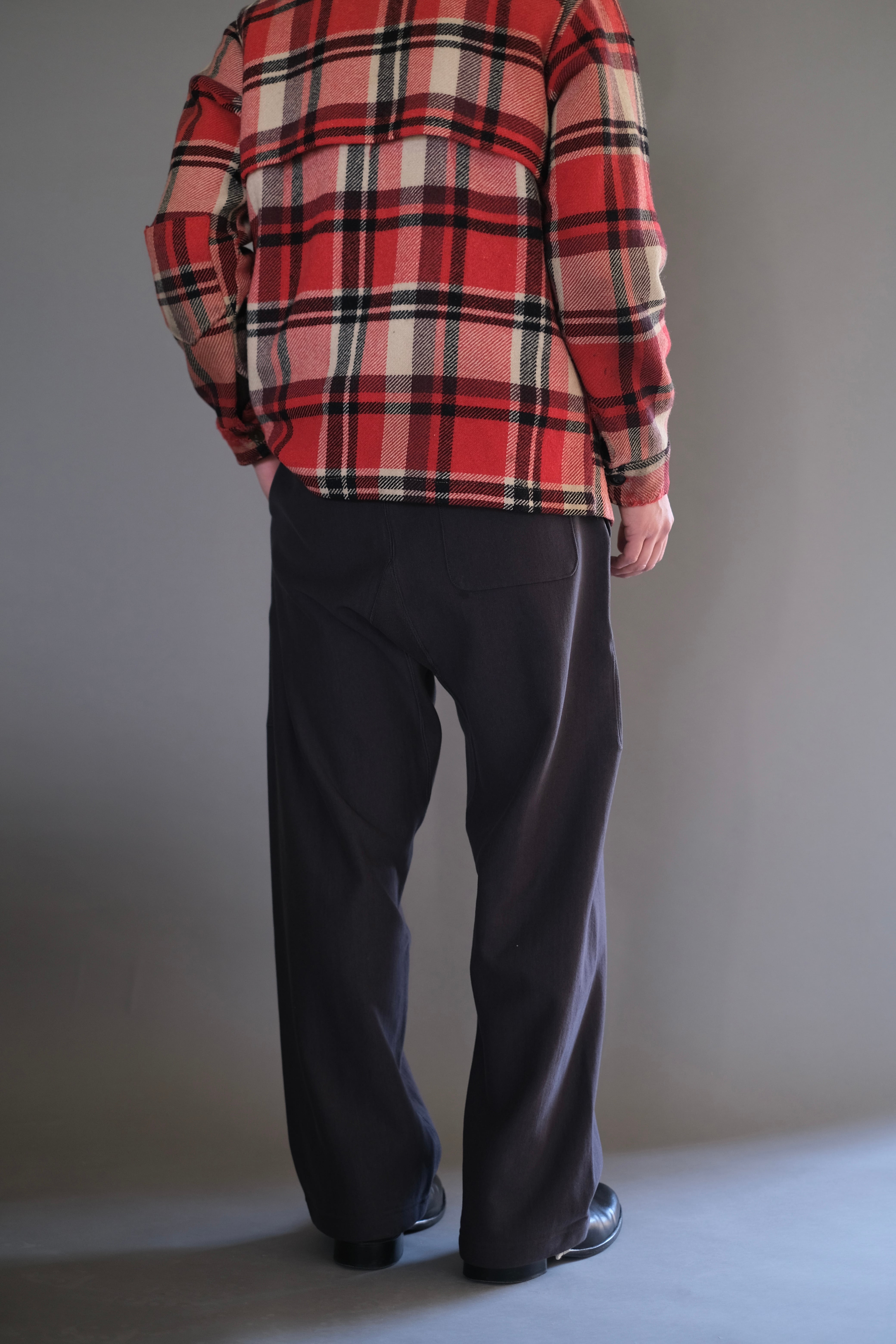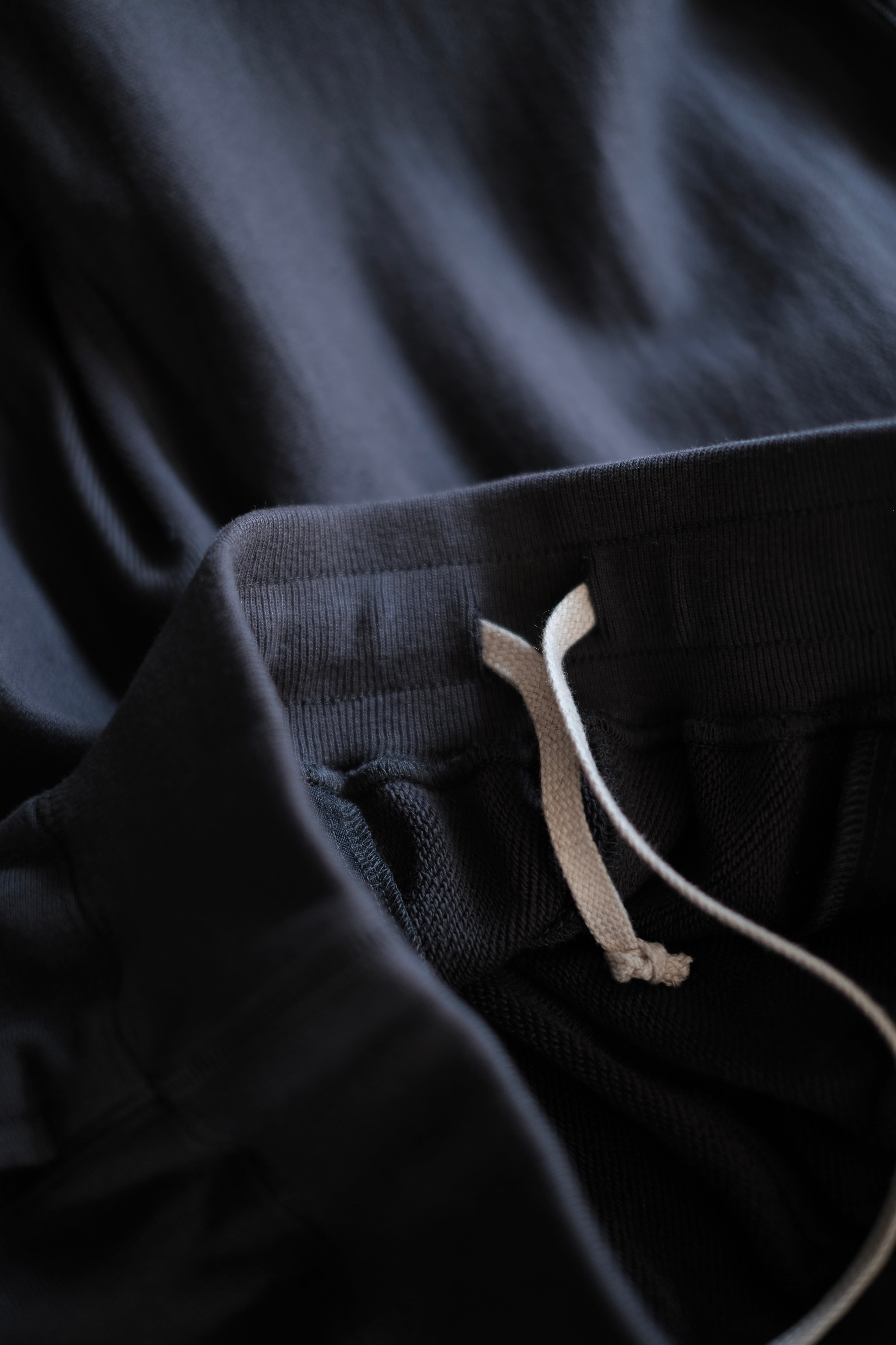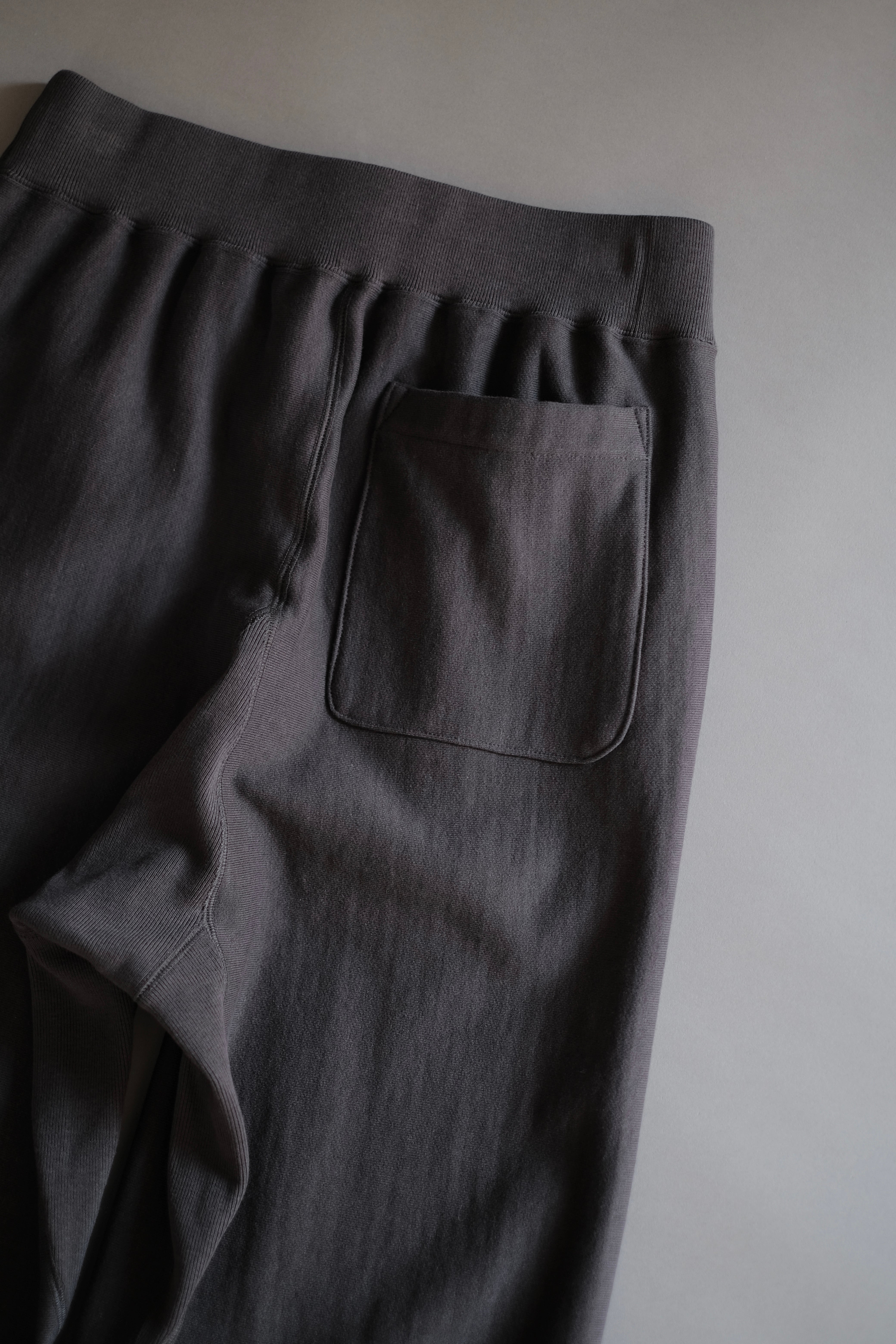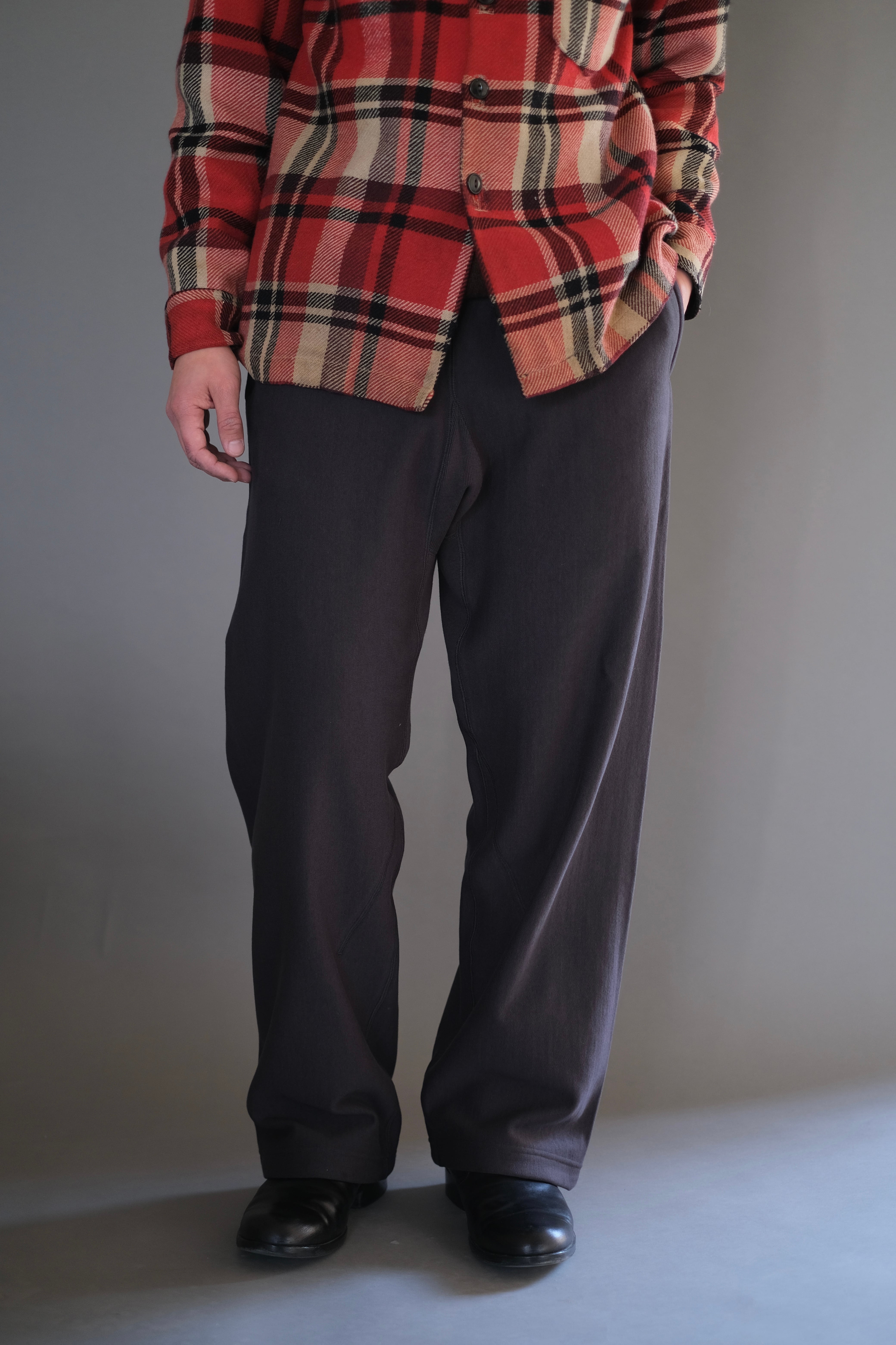 リブの切り替えやステッチワークでアクセントをつけたスウェットパンツは、アウトシームを排除した直線的なパターンで、スラックスかのようなシルエットが特徴。
