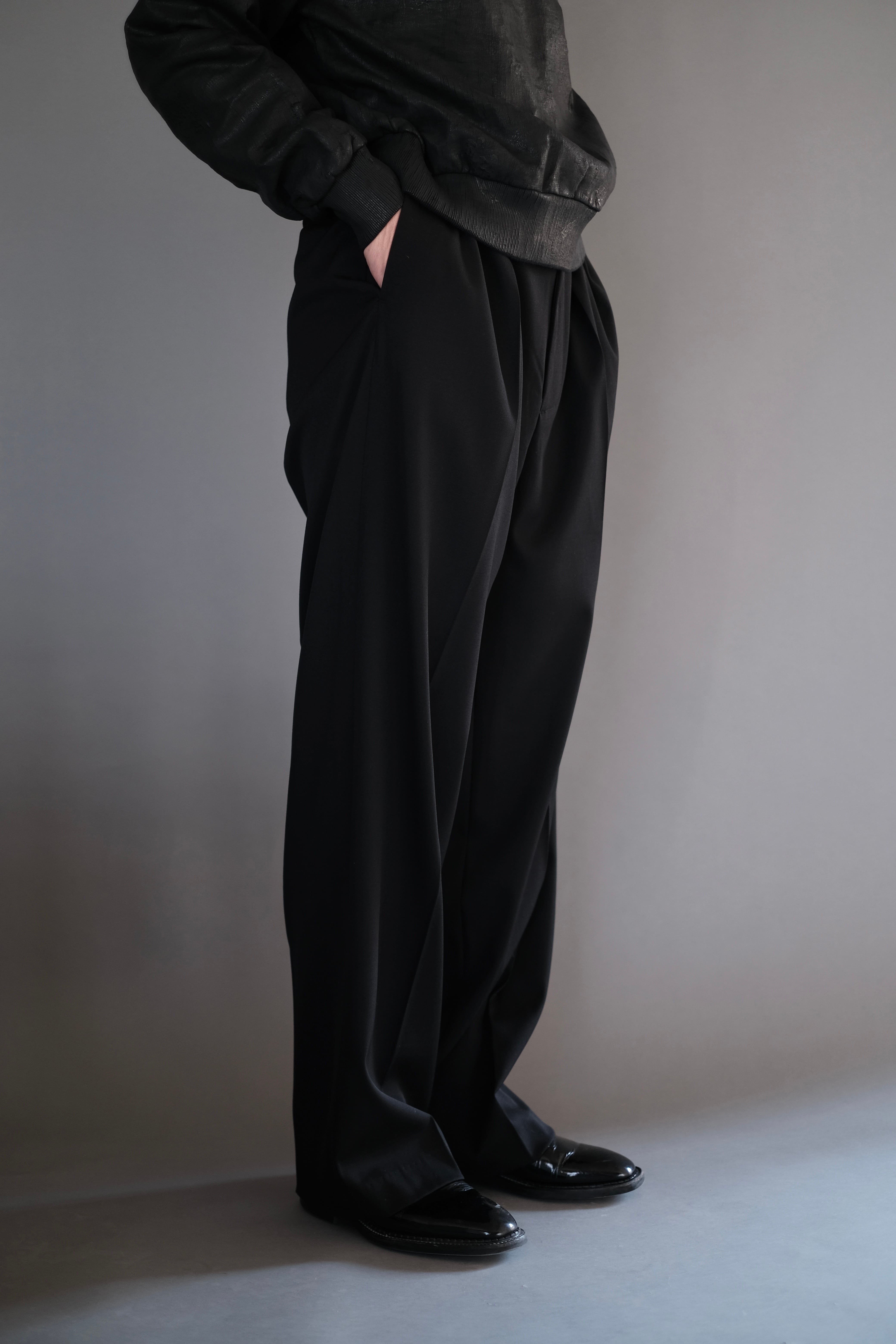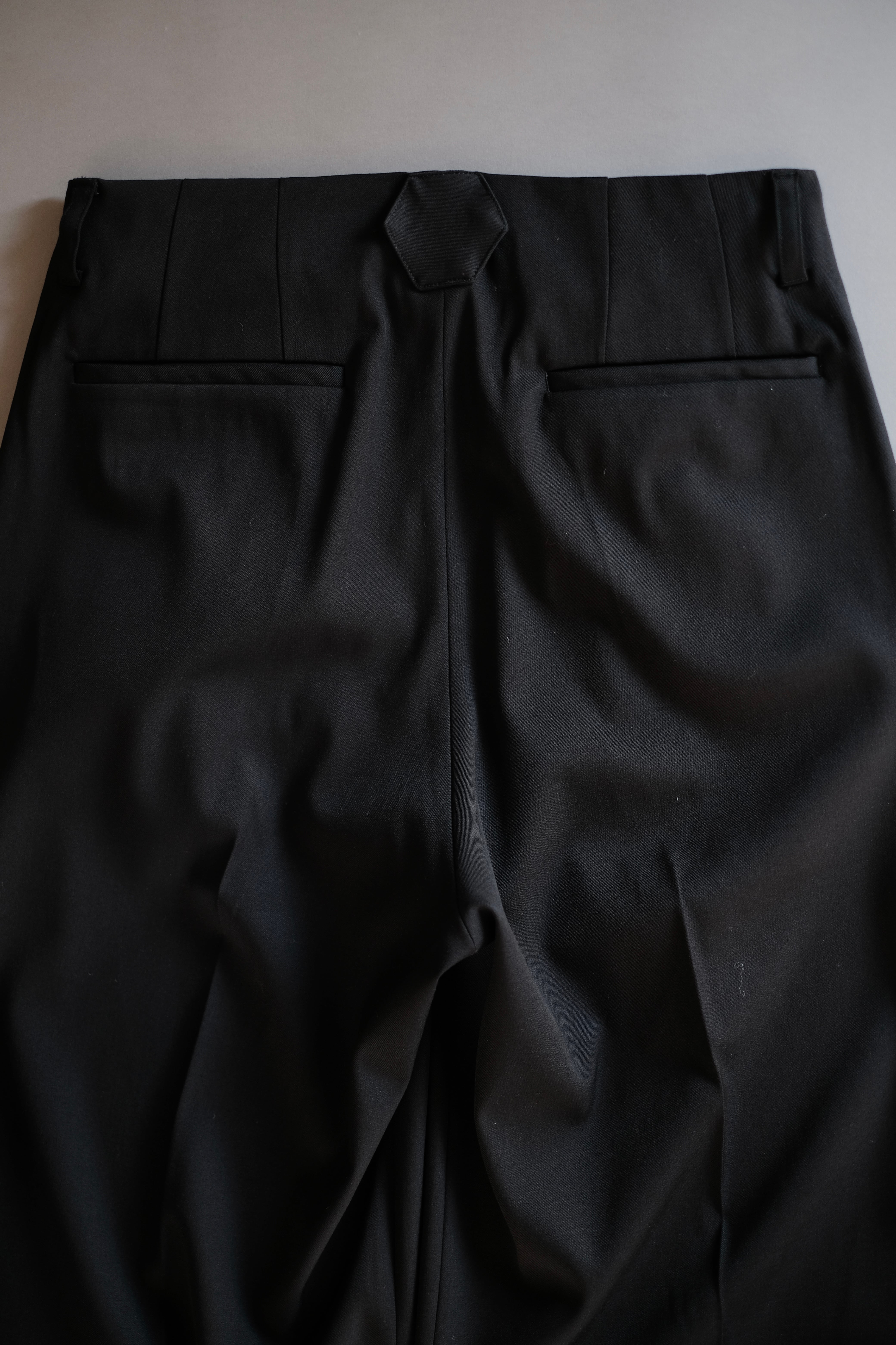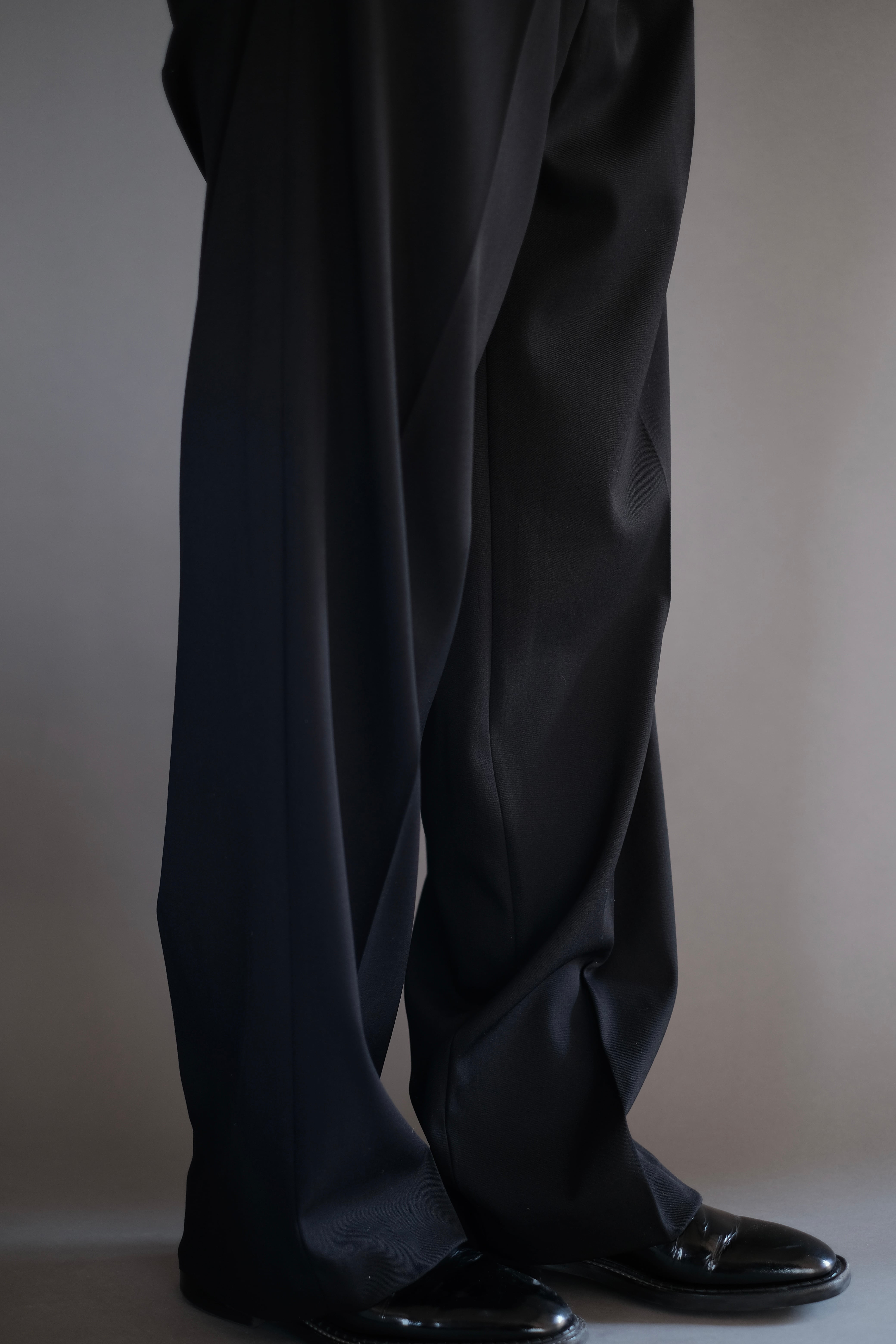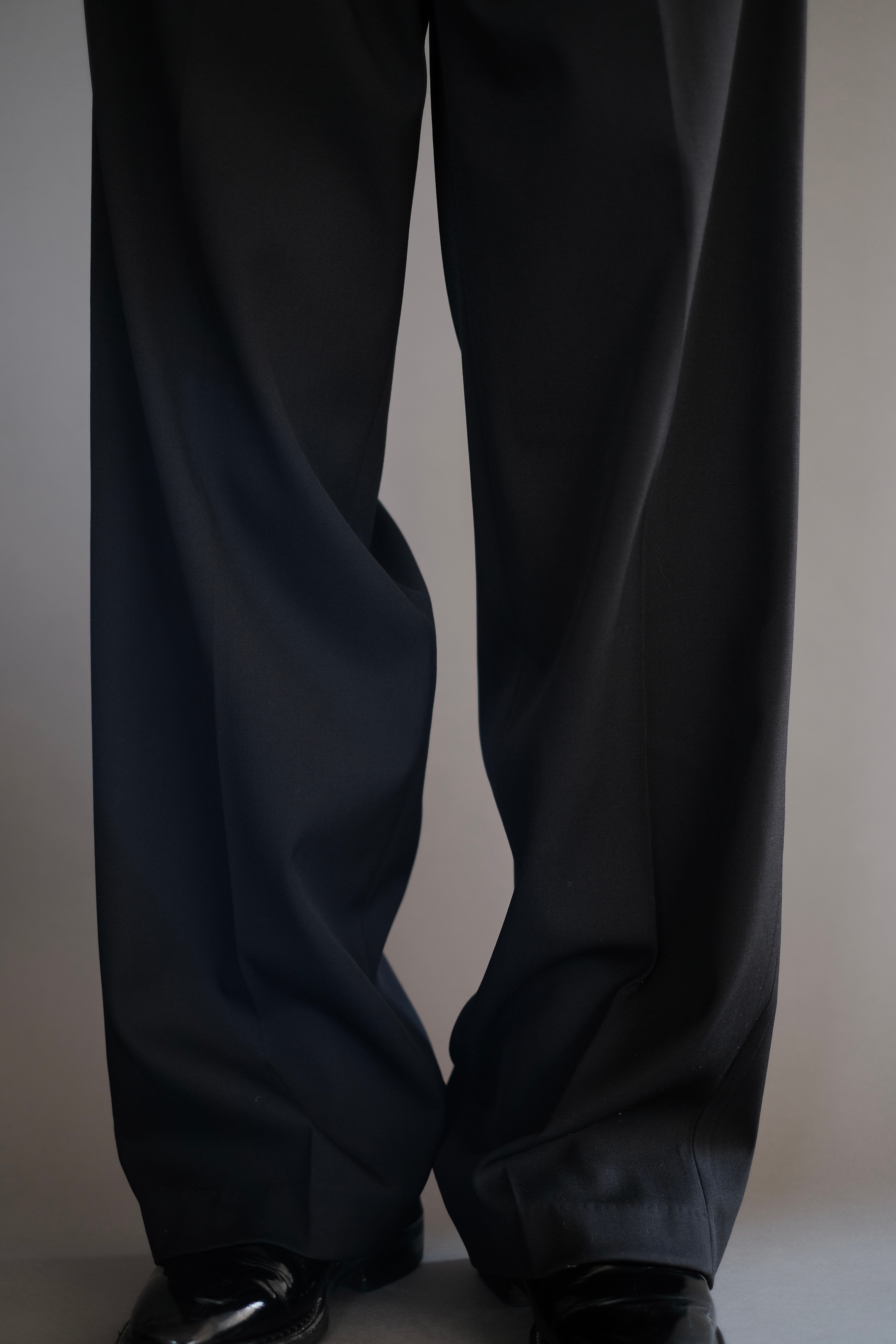 伸縮性を兼ね備えた肉厚なウールギャバジンを使い、マーベルト付きのクラシックなワイドトラウザーを仕立てました。