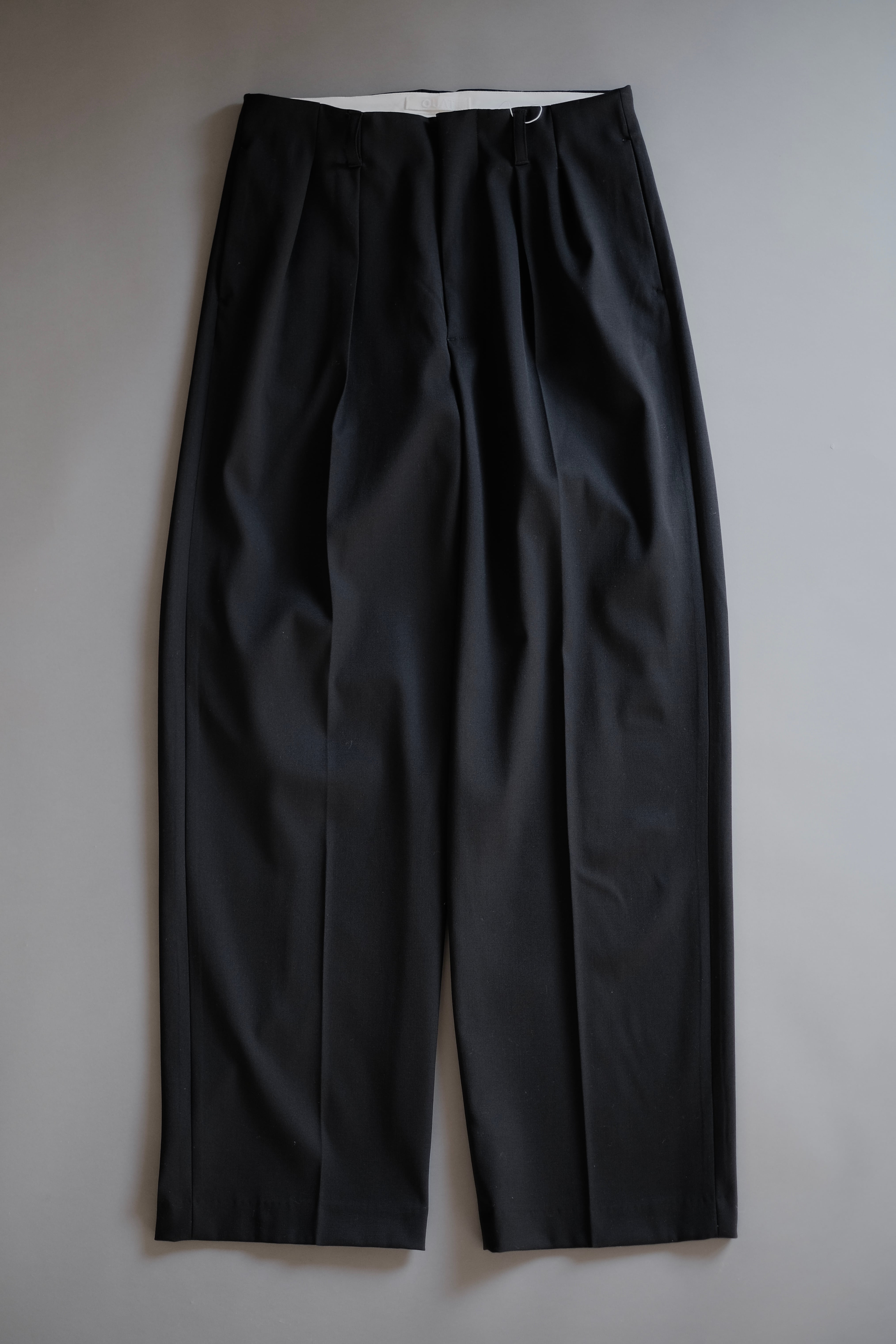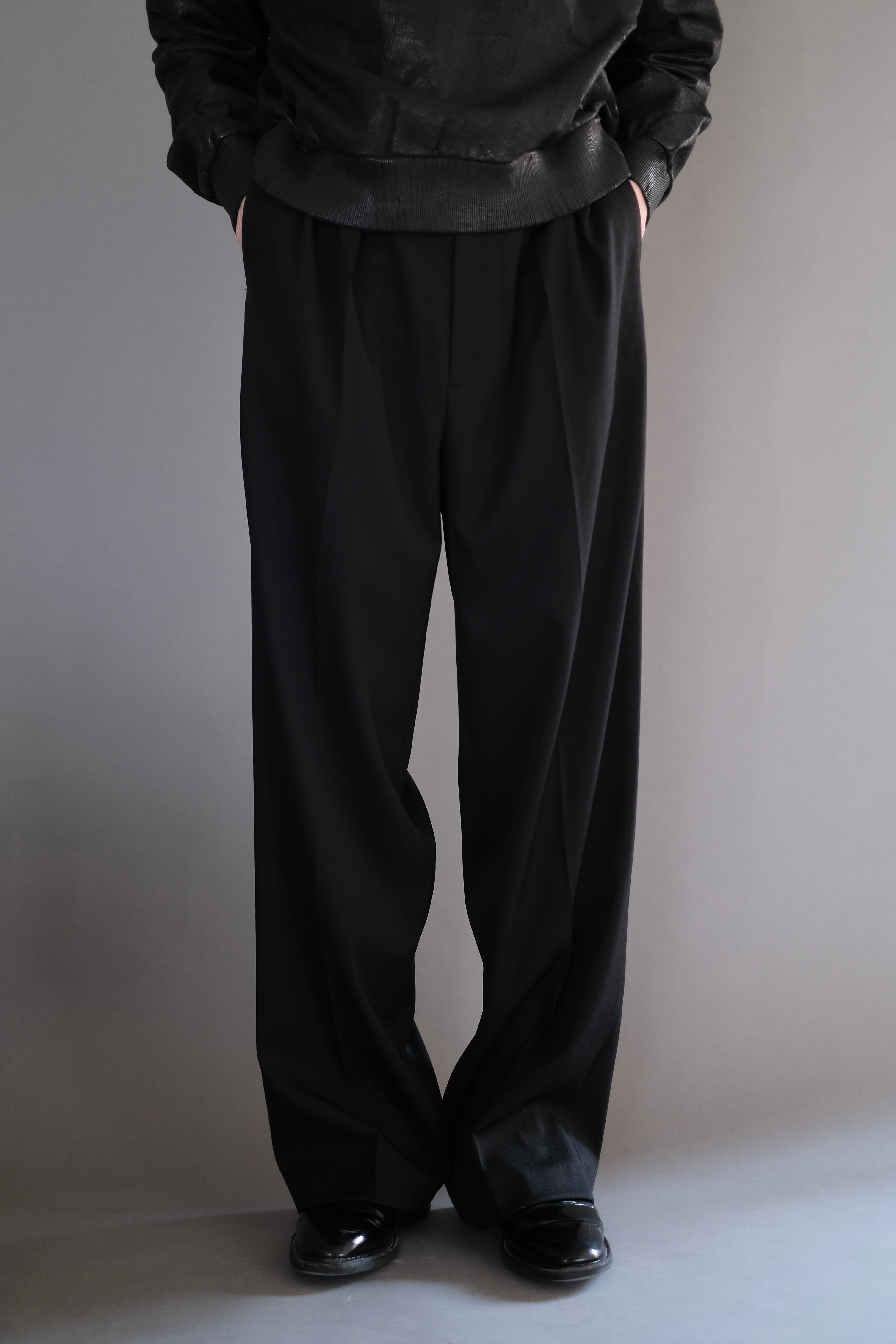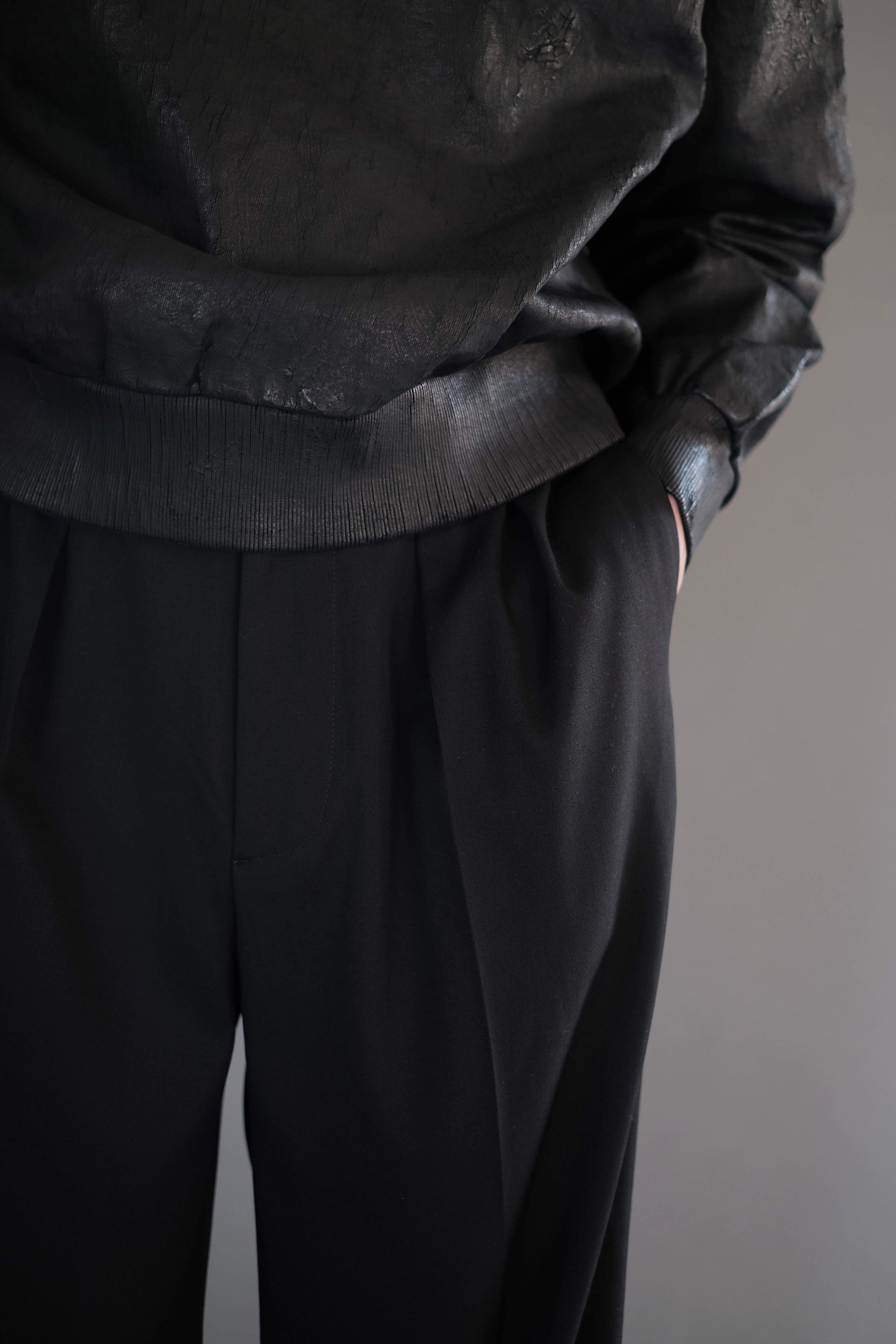 伸縮性を兼ね備えた肉厚なウールギャバジンを使い、マーベルト付きのクラシックなワイドトラウザーを仕立てました。