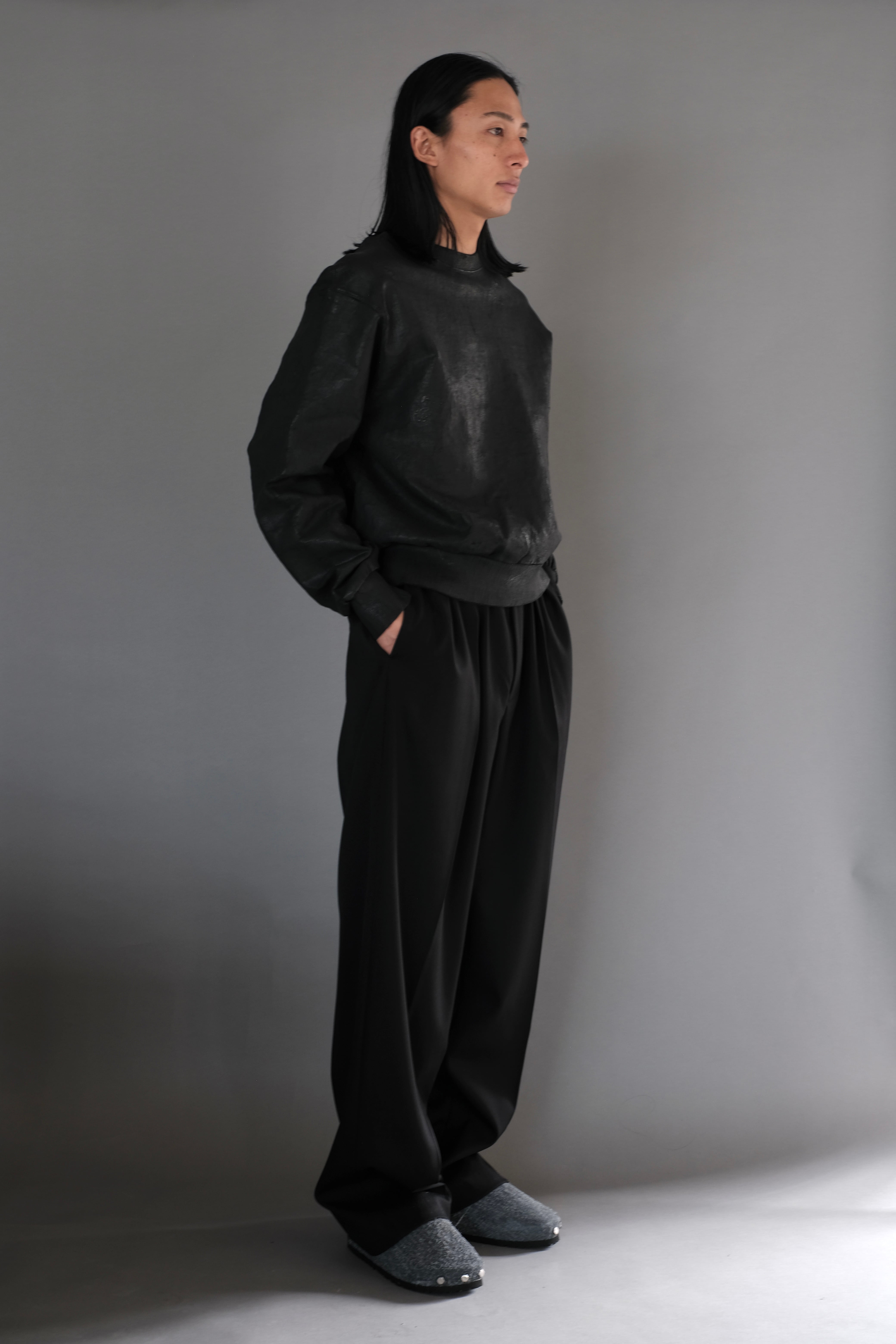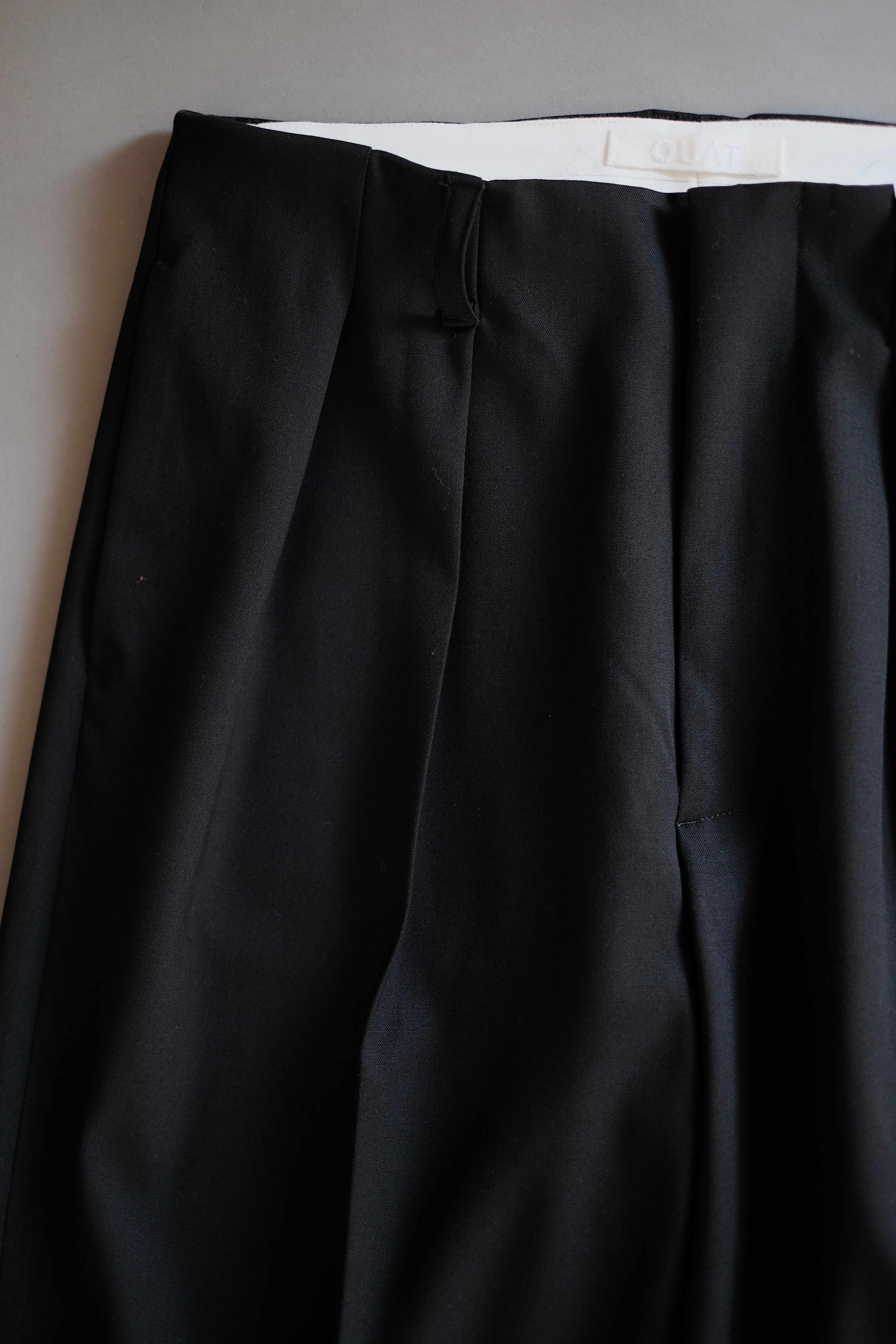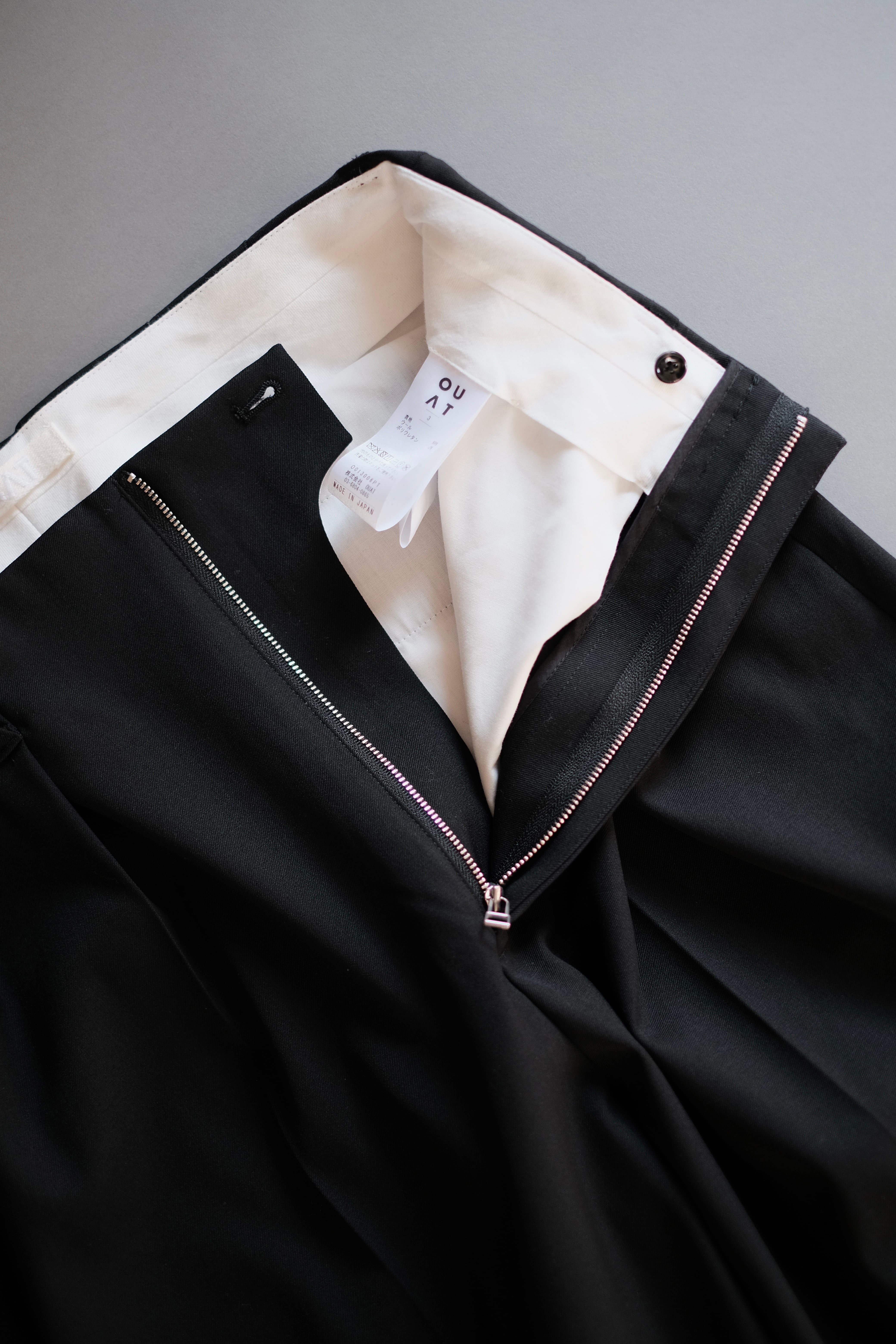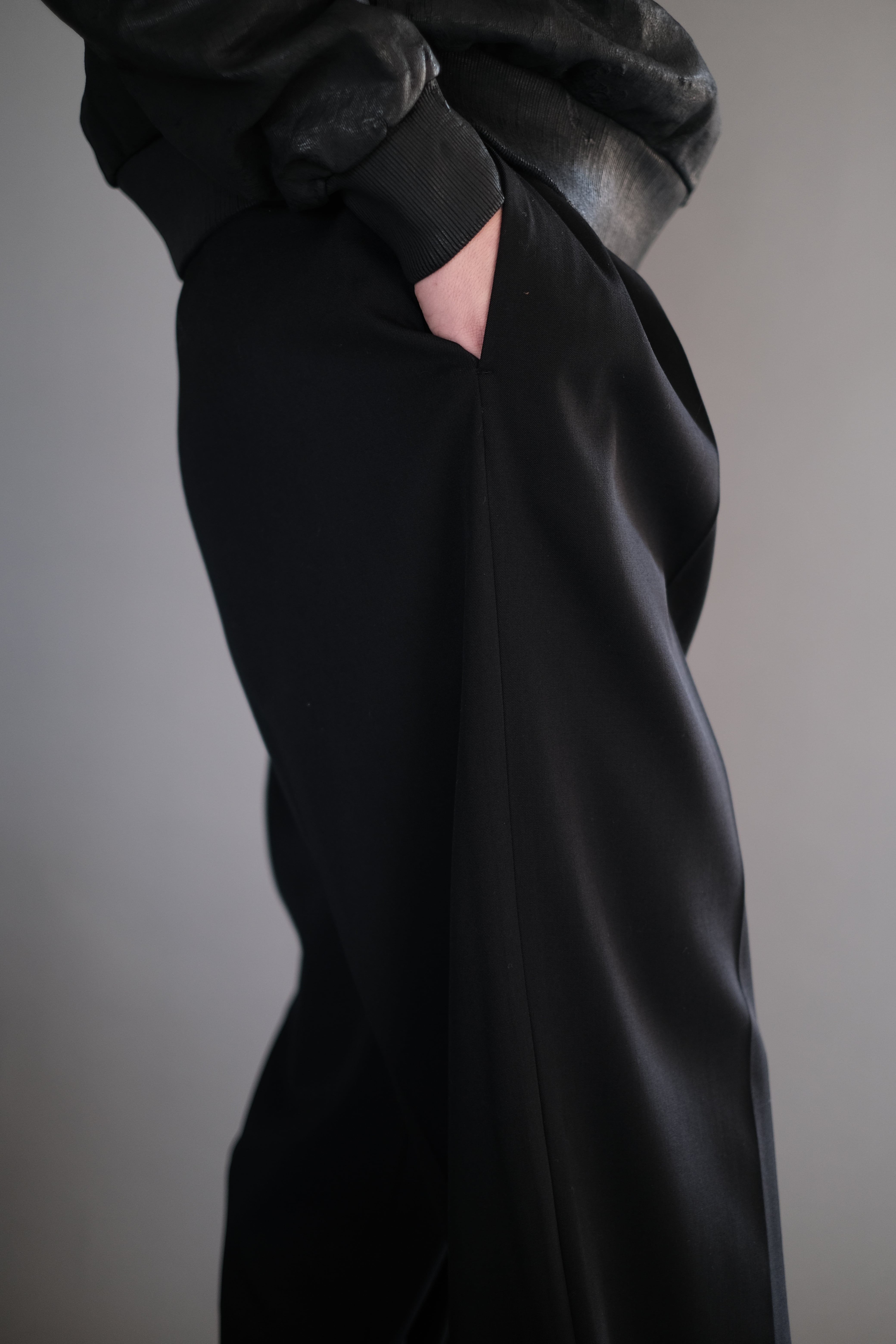 伸縮性を兼ね備えた肉厚なウールギャバジンを使い、マーベルト付きのクラシックなワイドトラウザーを仕立てました。