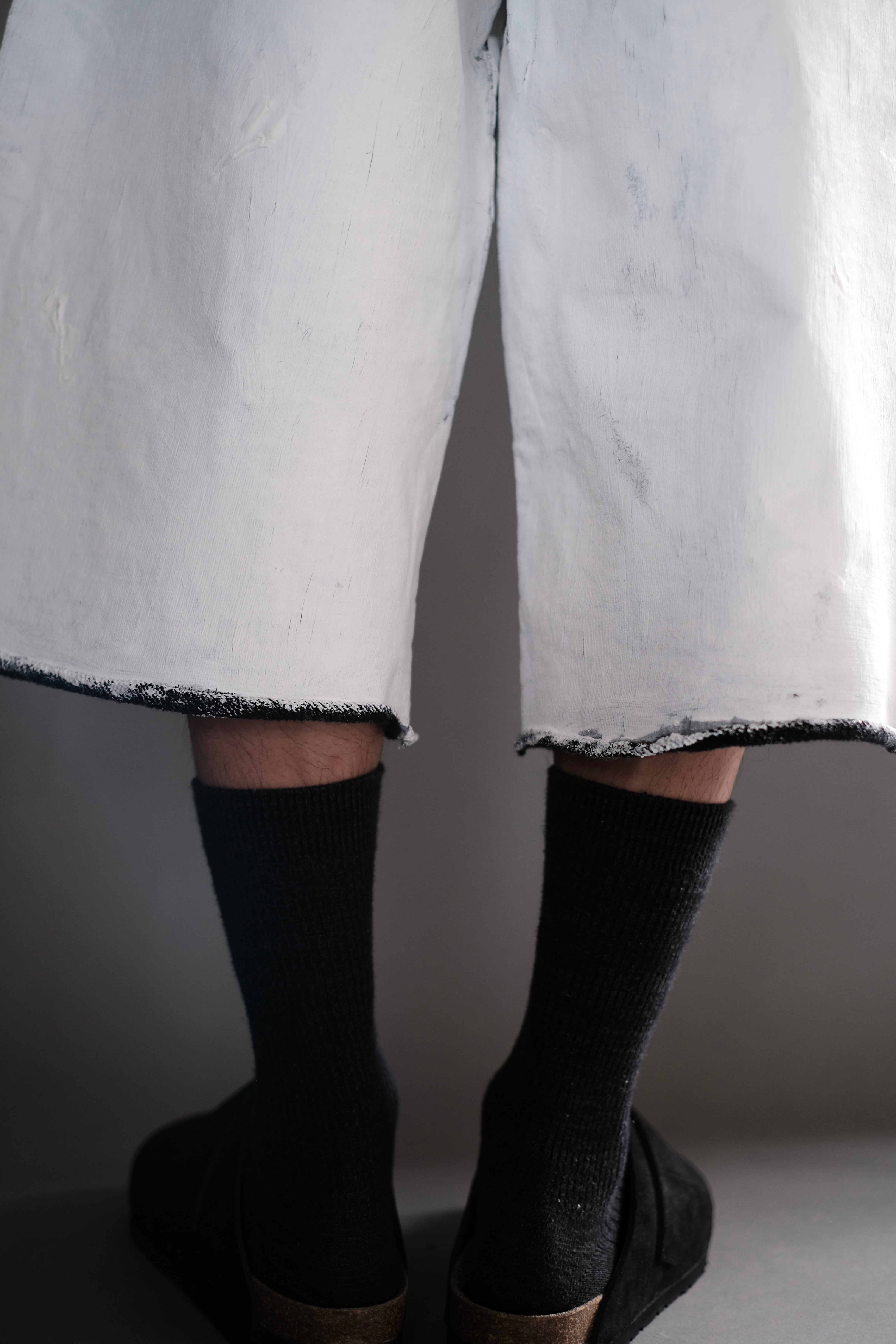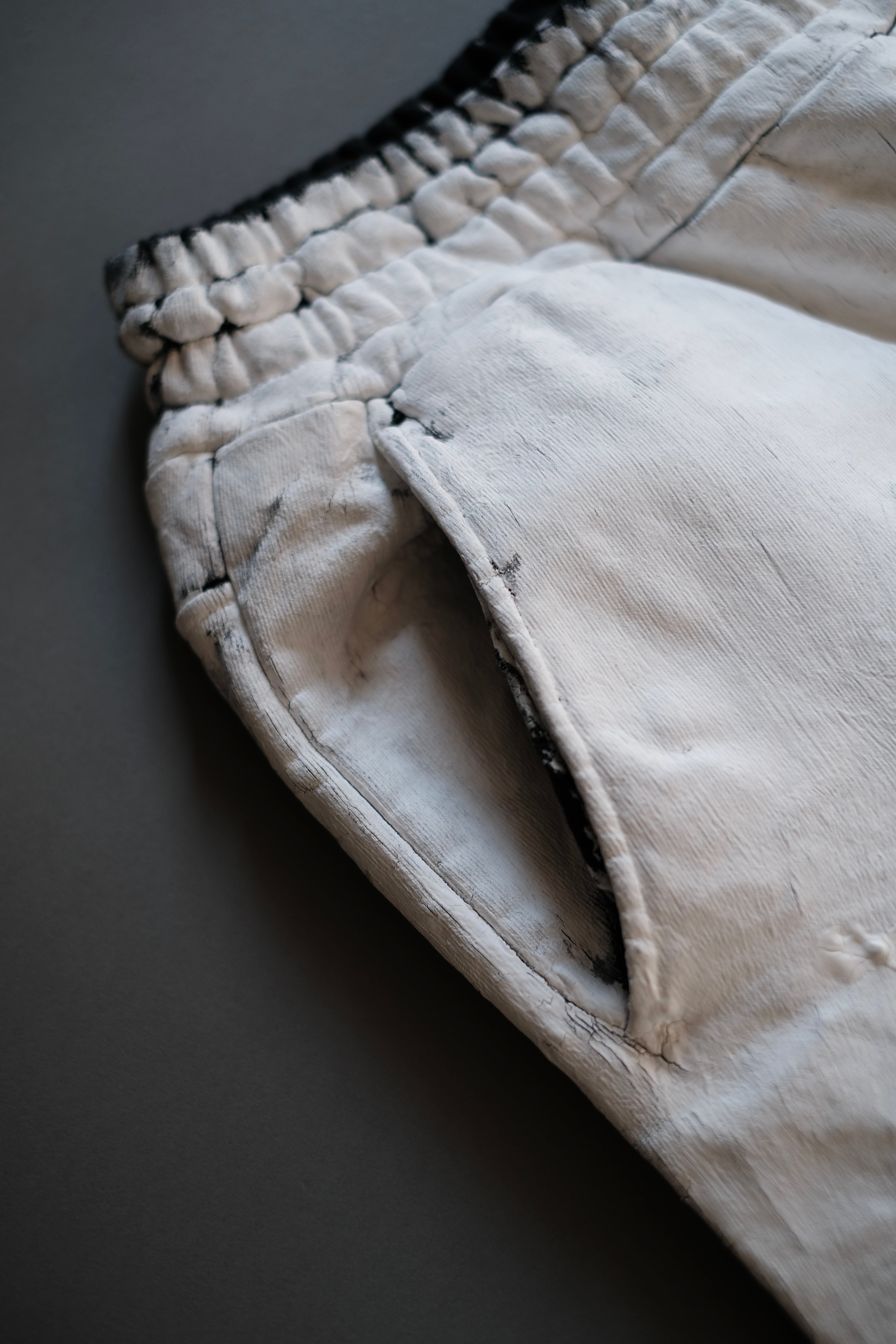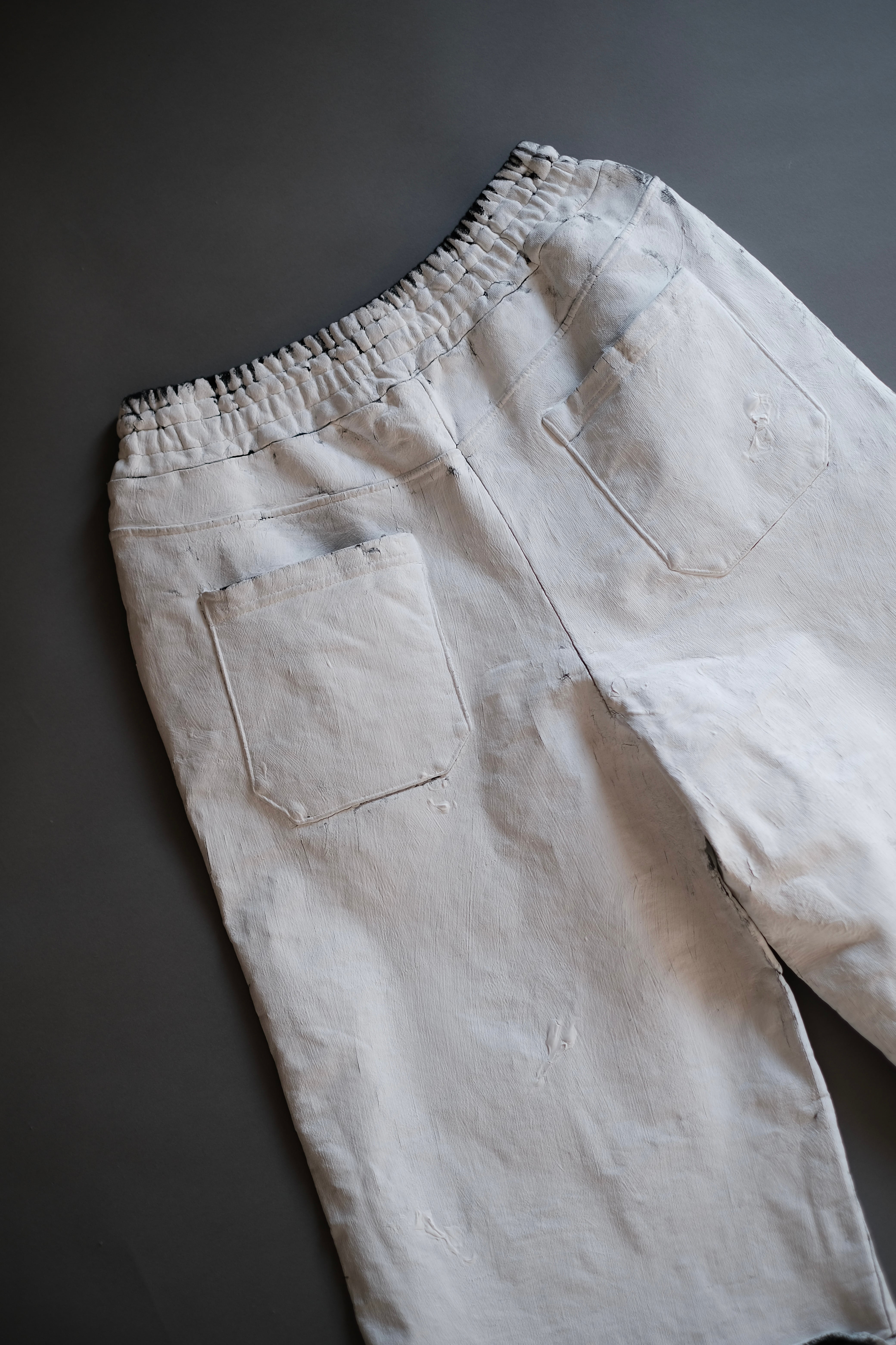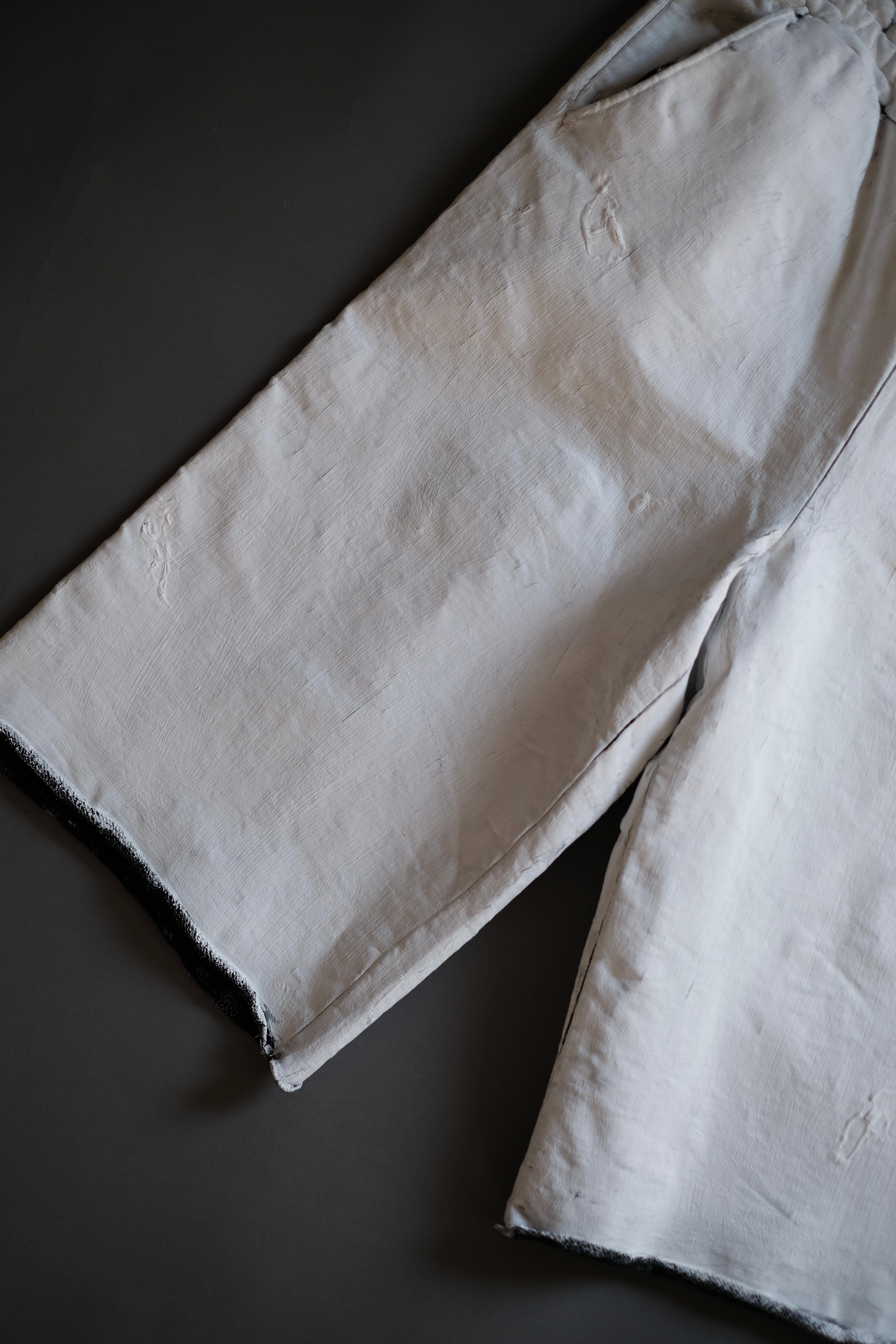 特殊なマッドバインダーと顔料をブレンドしたものを刷毛で何層にも製品に厚塗りしていき、ベーキングと柔軟洗いを施します、全て職人の手作業による丹念な工程は、着用するにつれて厚く盛り上がった箇所が美しいクラック(ひび割れ)を生み出し、テクスチャや艶も変化していくことによって、経年変化を楽しめる加工になっております。