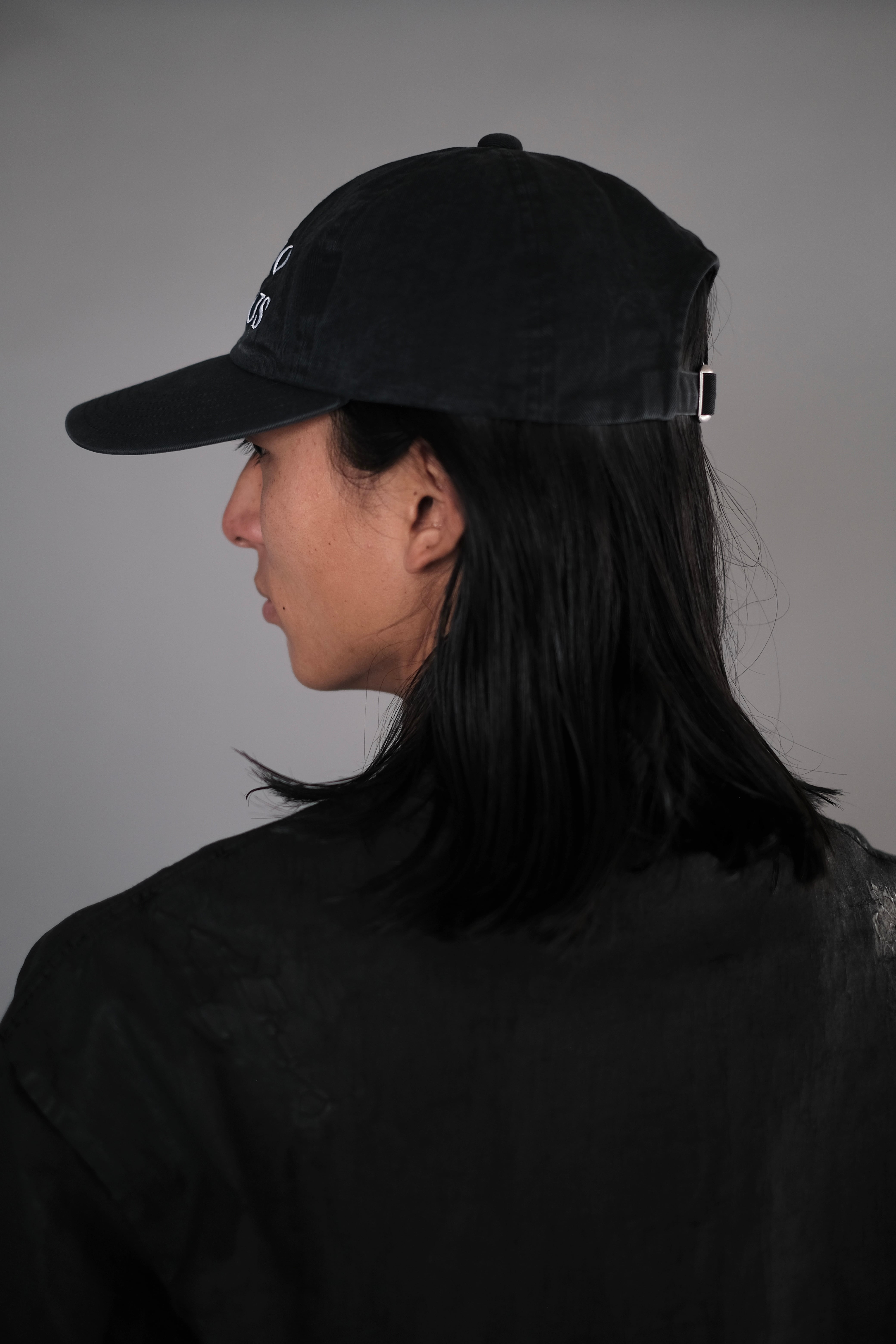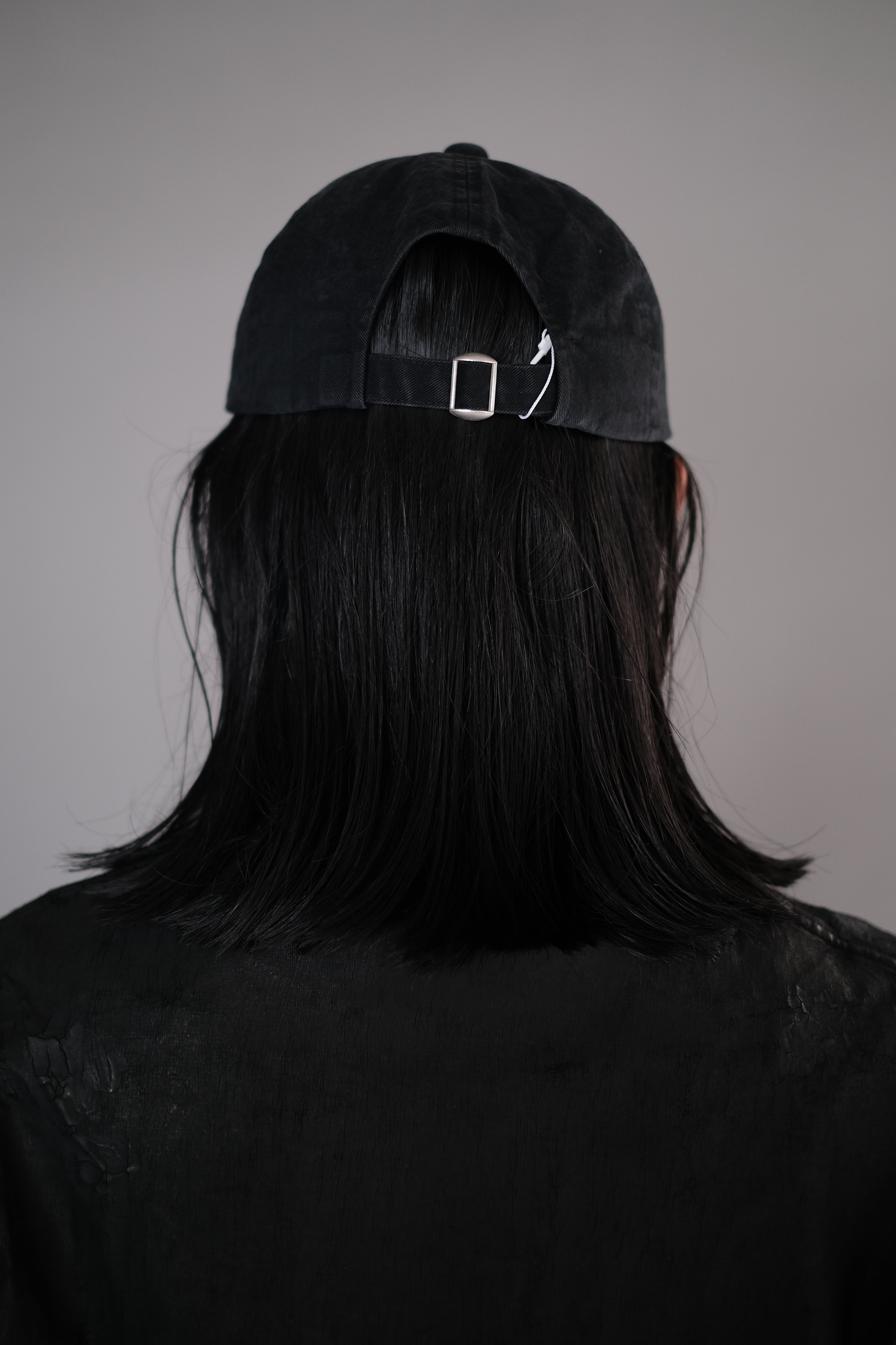 製品洗いを施した硫化染めコットンの鍔長パネルキャップに、OUATらしいアノニマスな刺繍を入れました。