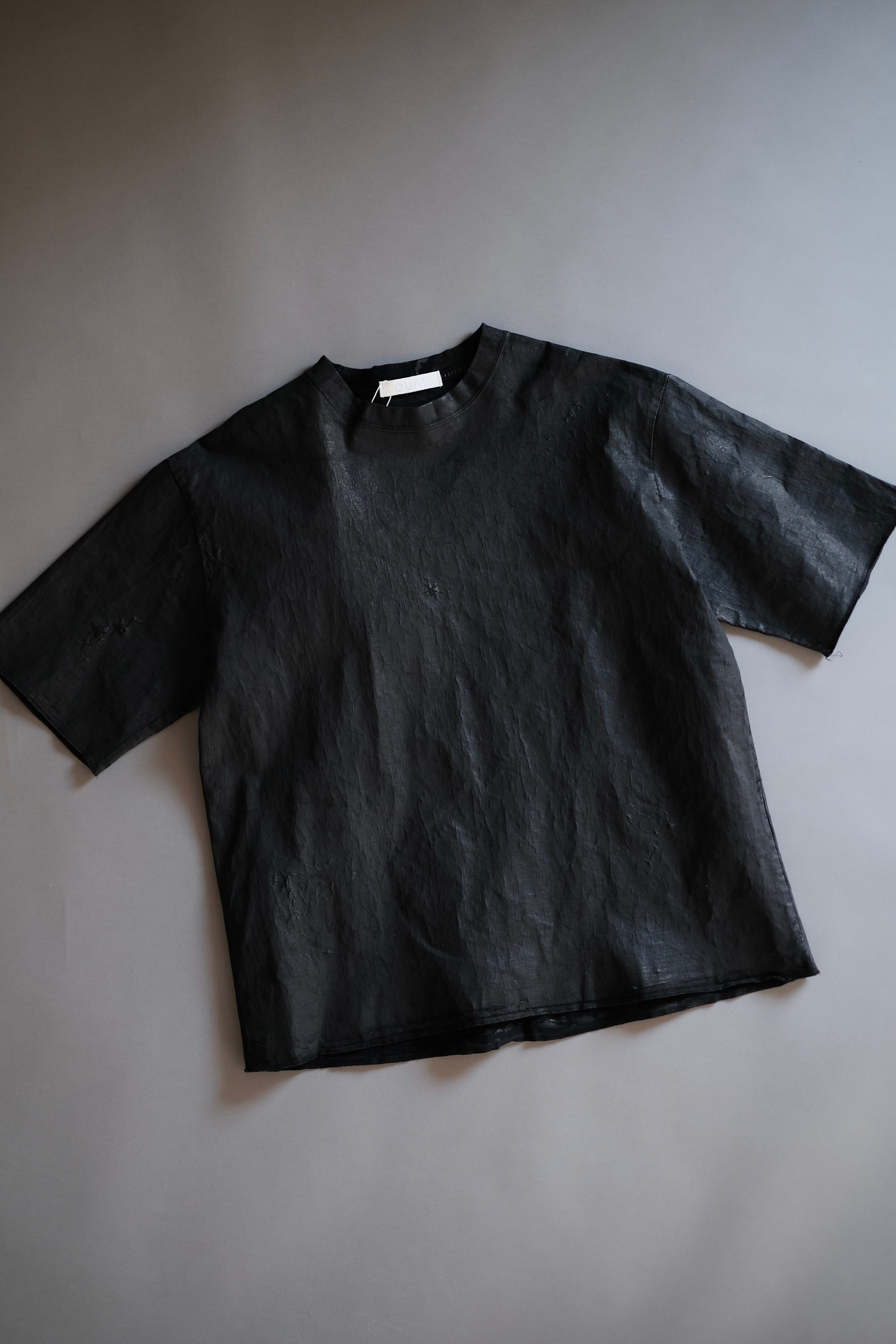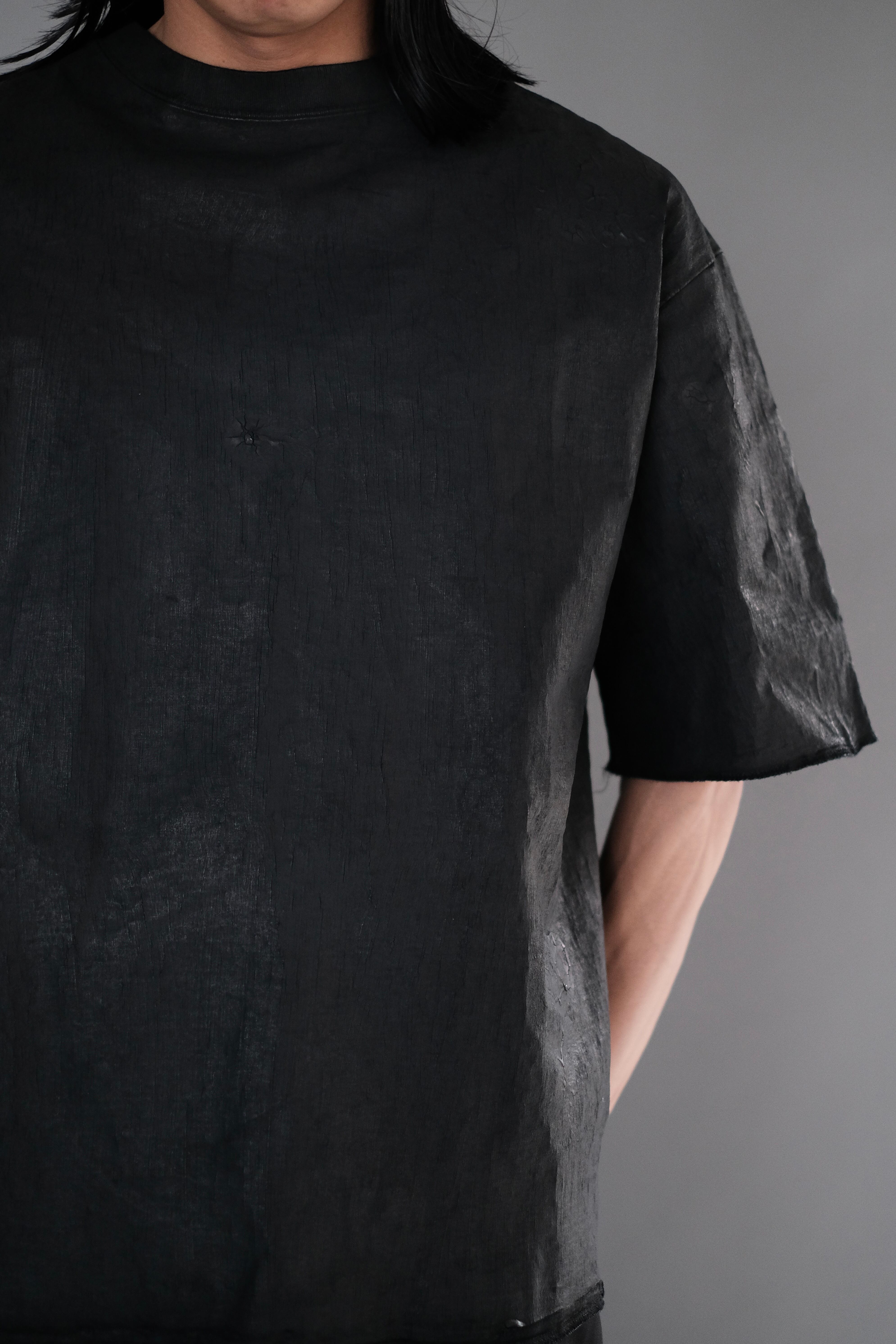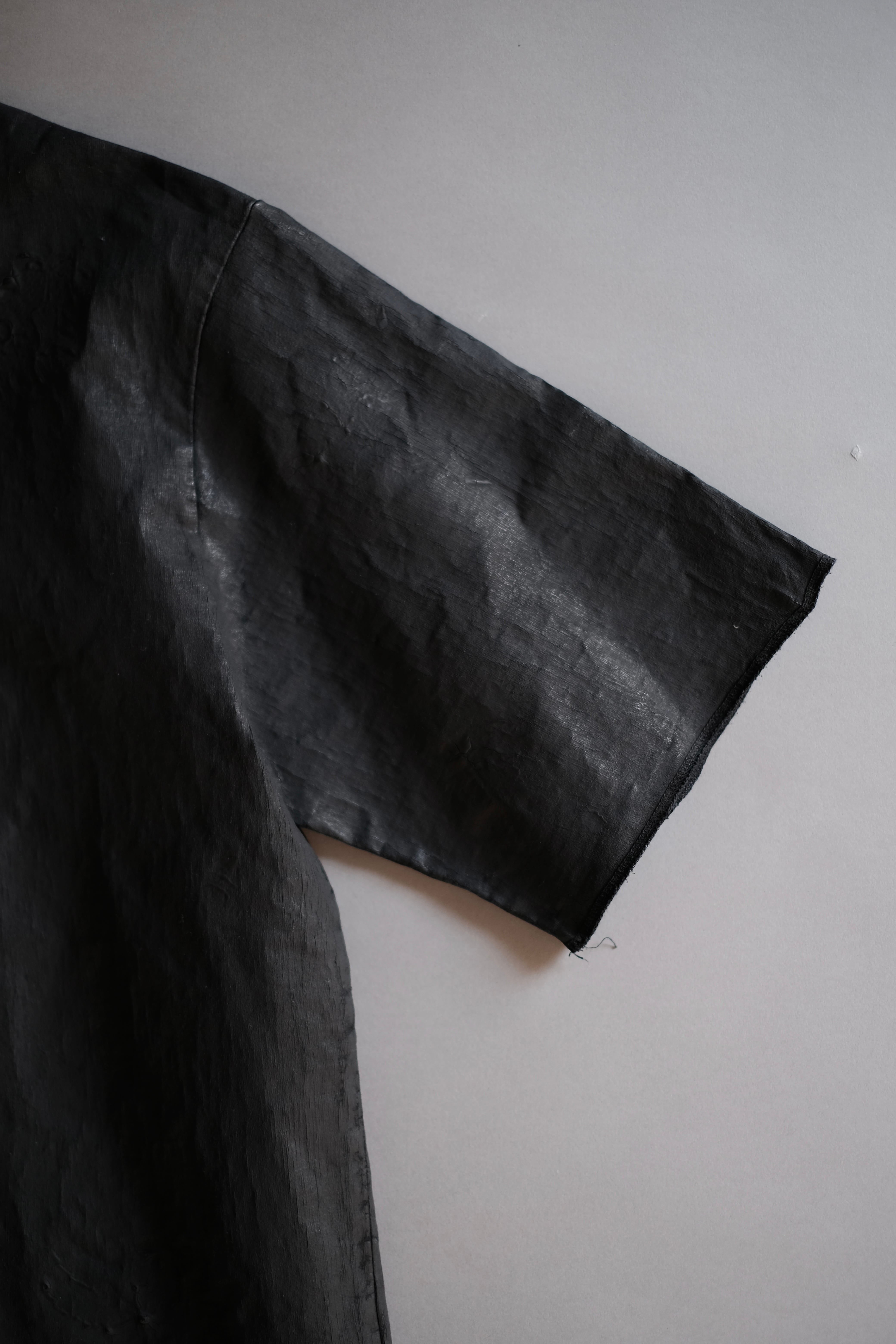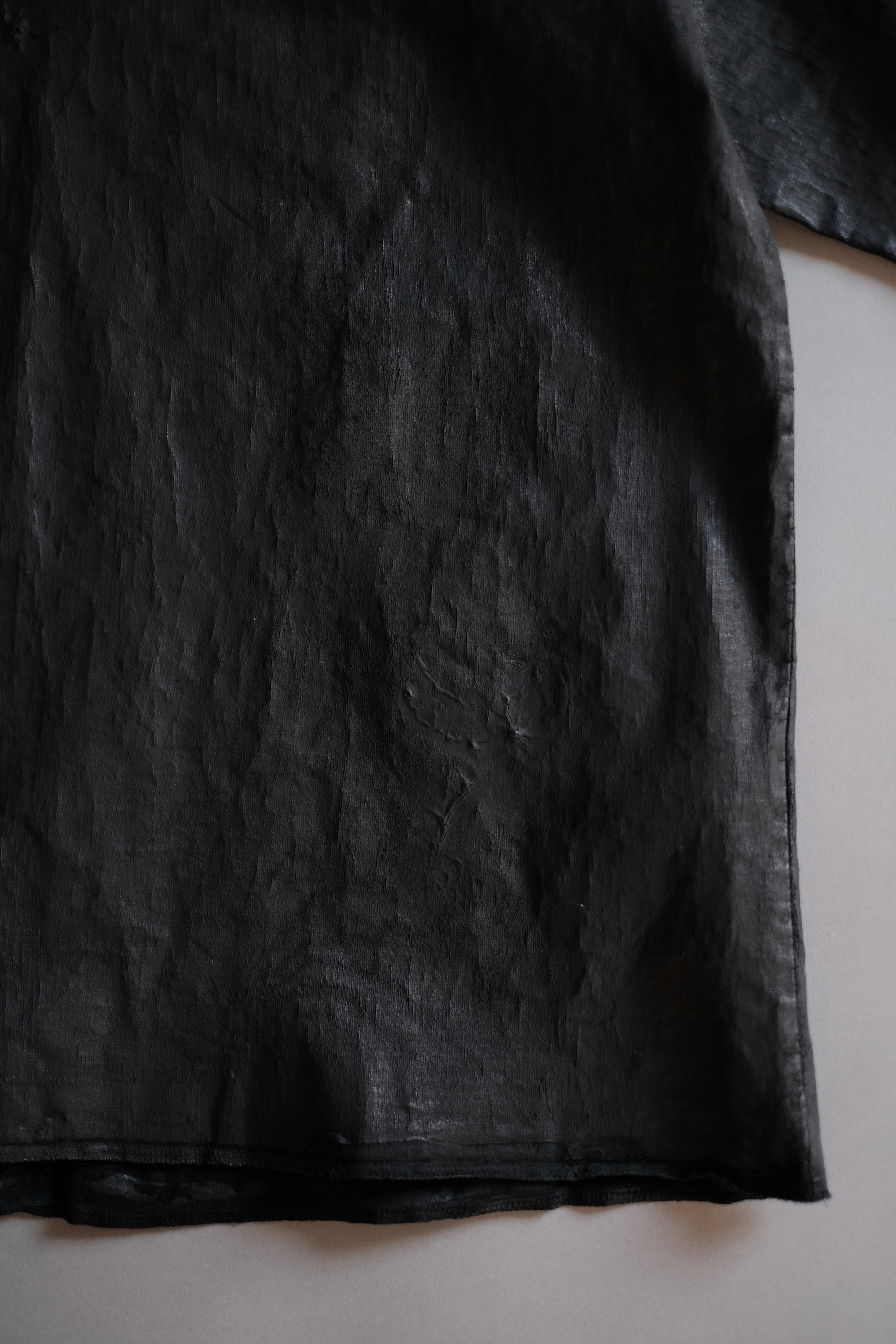 特殊なマッドバインダーと顔料をブレンドしたものを刷毛で何層にも製品に厚塗りしていき、ベーキングと柔軟洗いを施します、全て職人の手作業による丹念な工程は、着用するにつれて厚く盛り上がった箇所が美しいクラック(ひび割れ)を生み出し、テクスチャや艶も変化していくことによって、経年変化を楽しめる加工になっております。