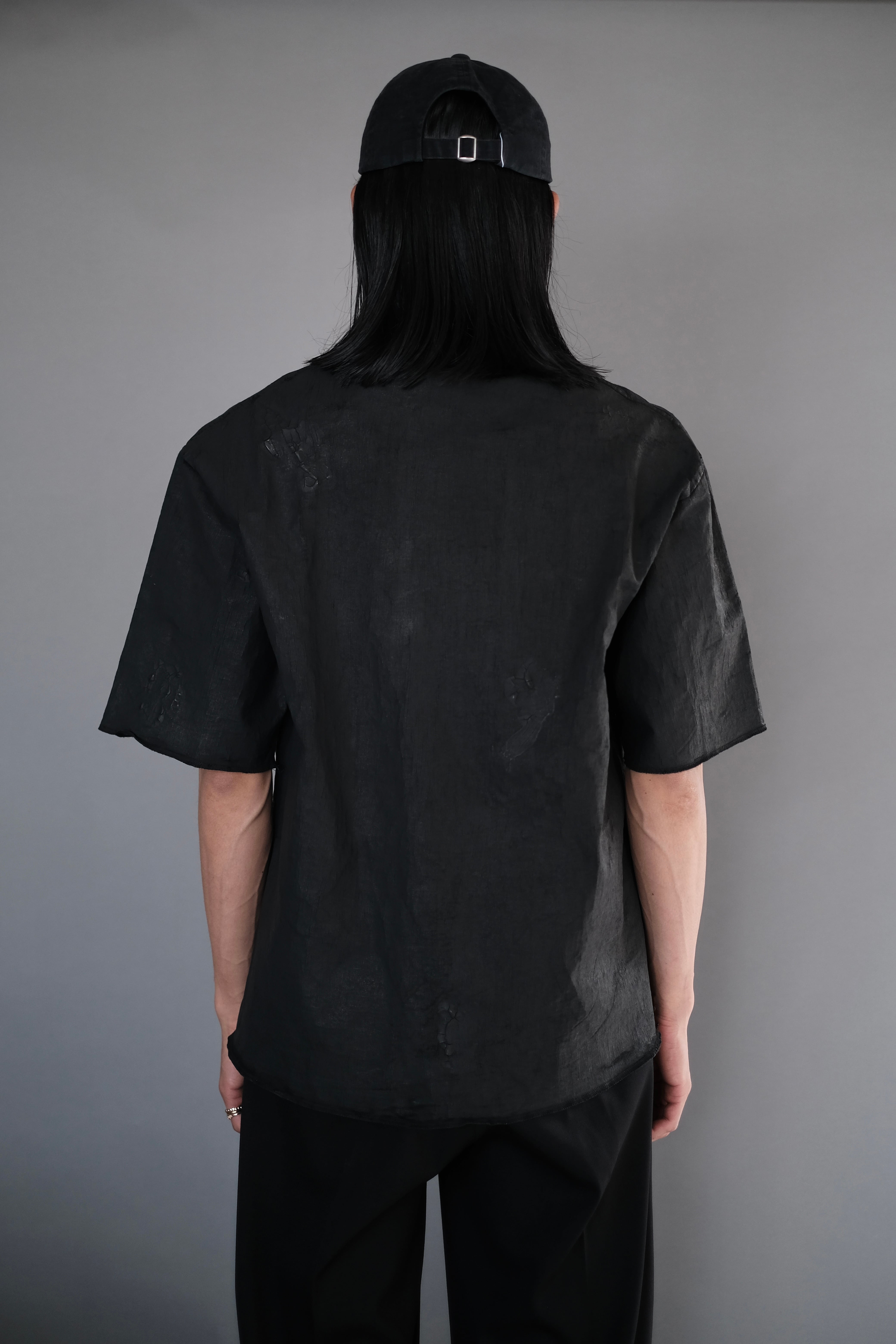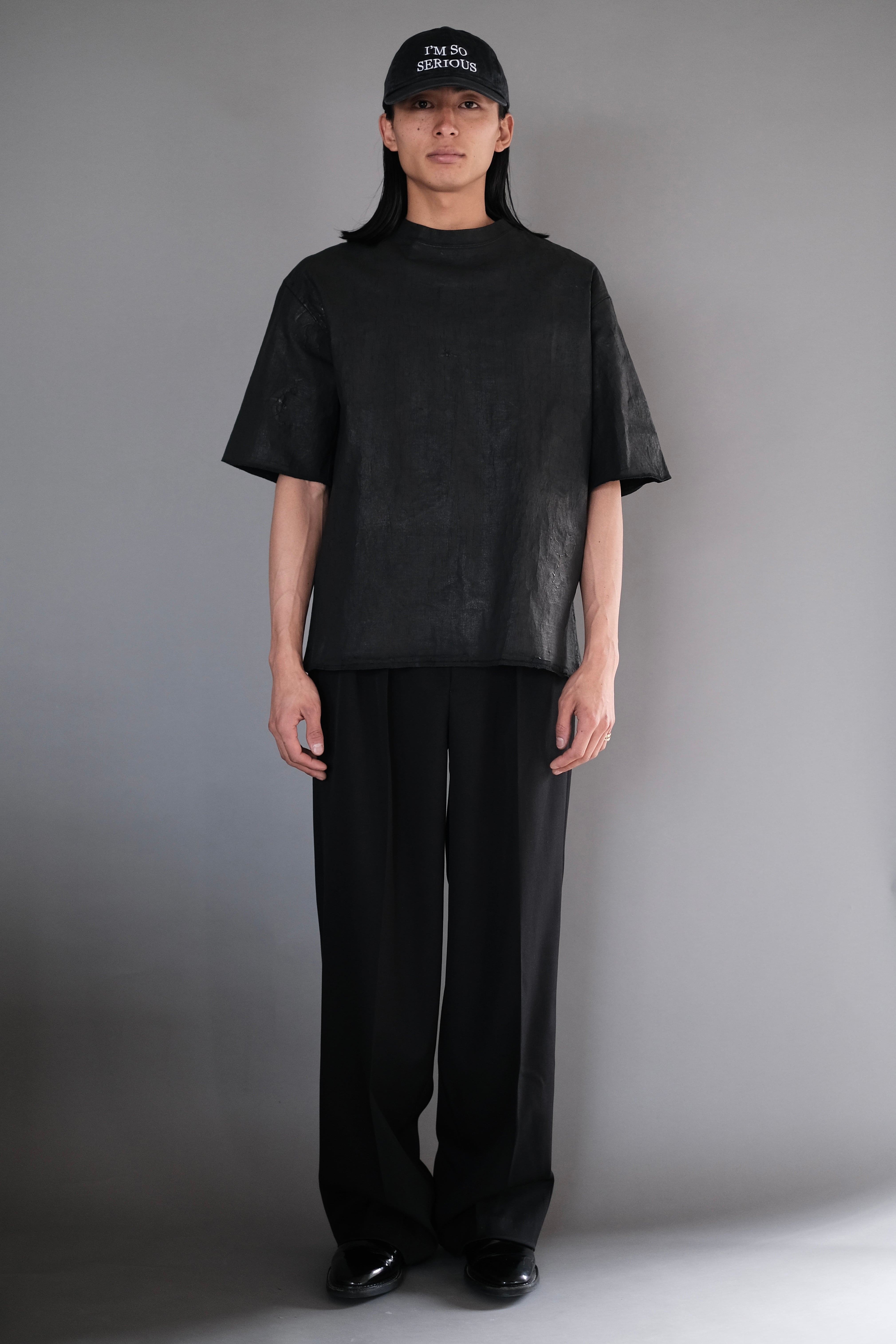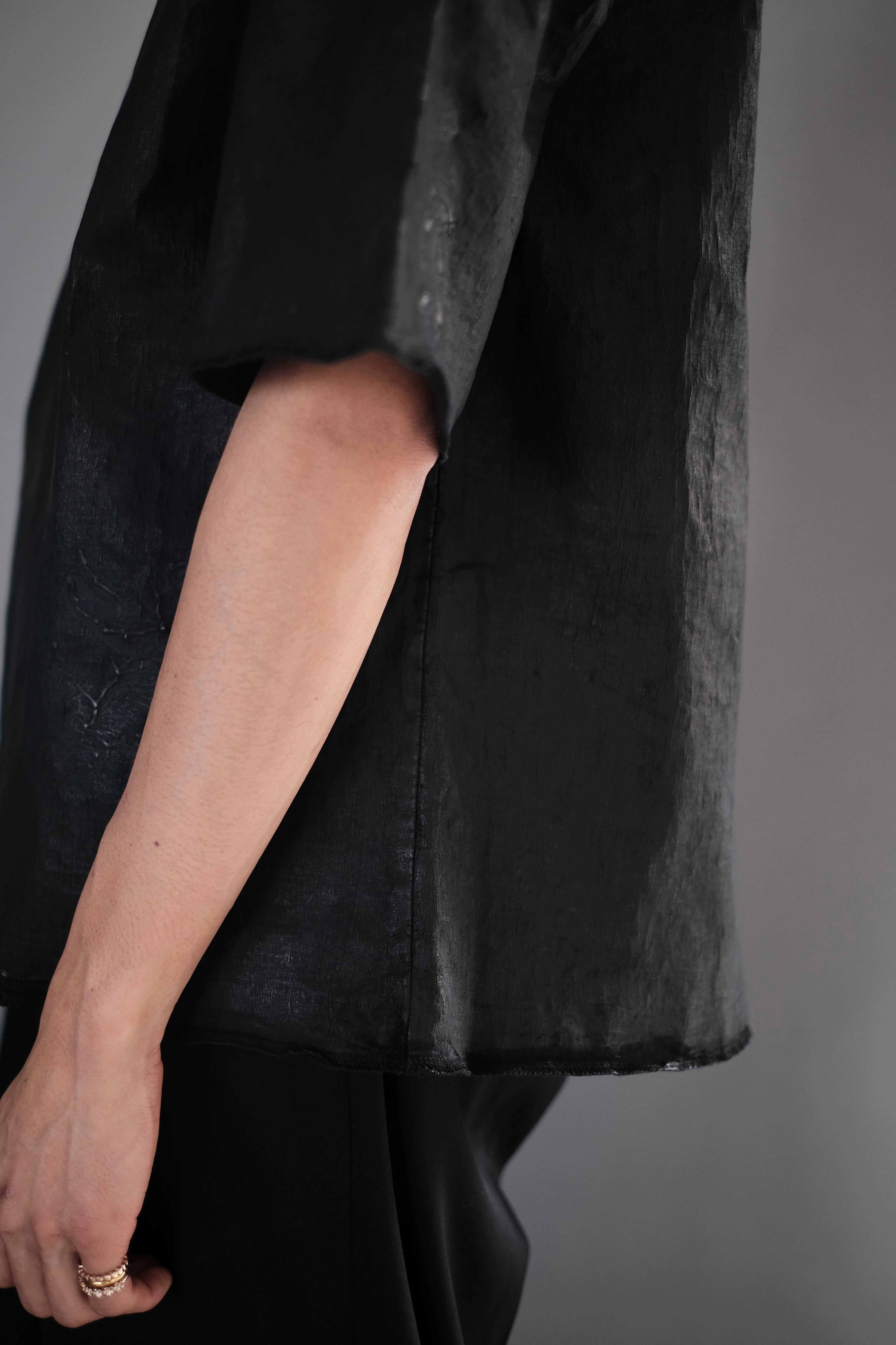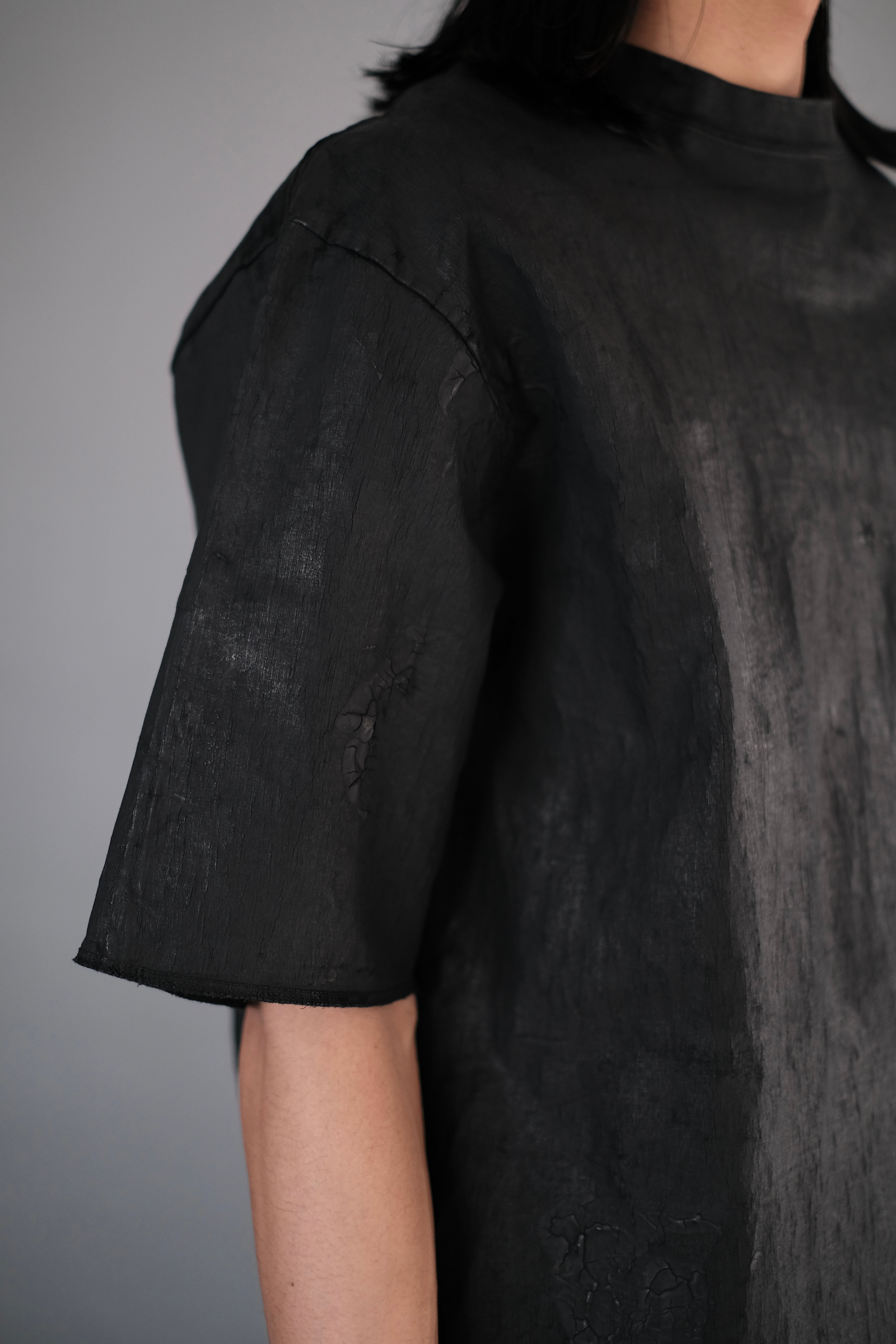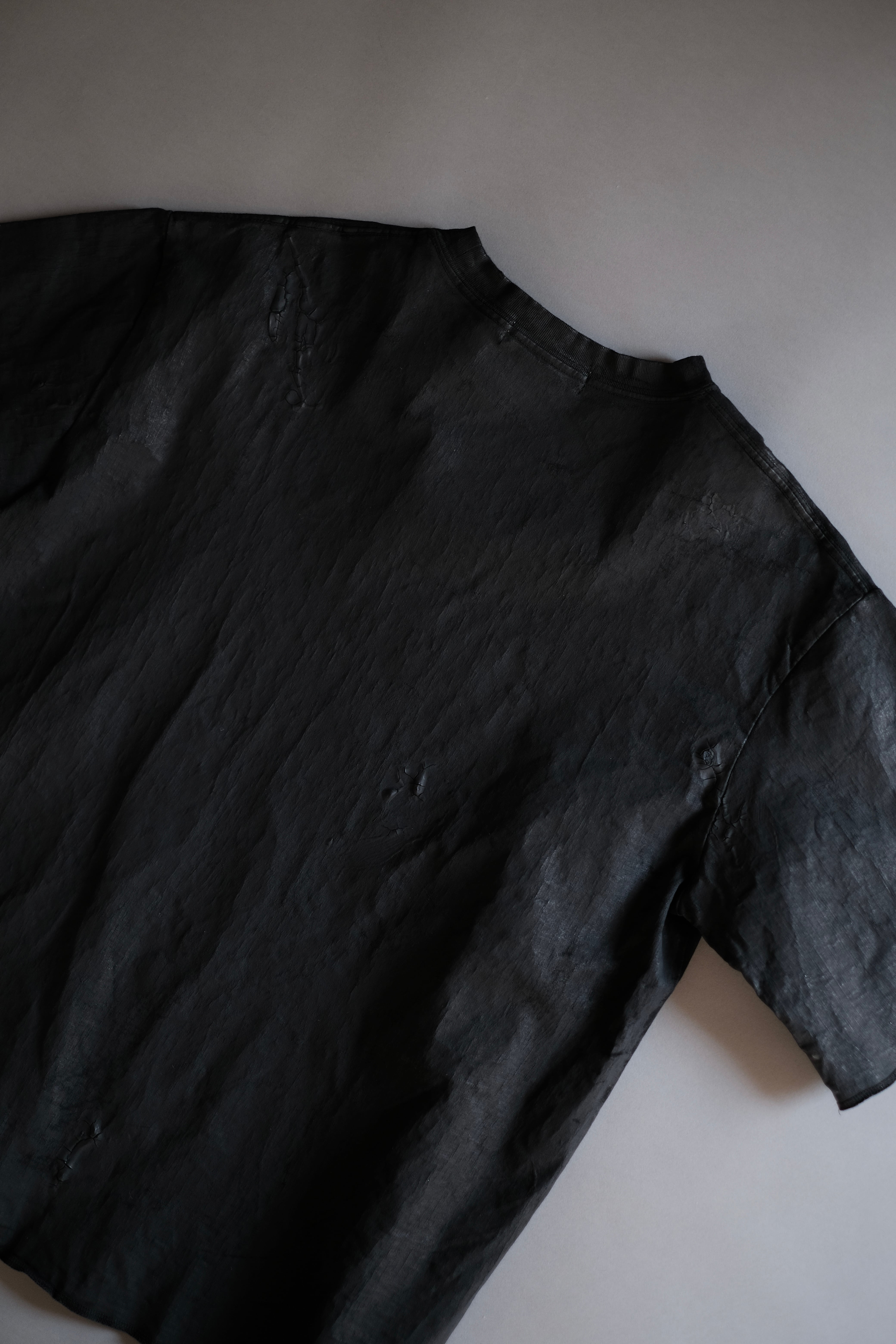 特殊なマッドバインダーと顔料をブレンドしたものを刷毛で何層にも製品に厚塗りしていき、ベーキングと柔軟洗いを施します、全て職人の手作業による丹念な工程は、着用するにつれて厚く盛り上がった箇所が美しいクラック(ひび割れ)を生み出し、テクスチャや艶も変化していくことによって、経年変化を楽しめる加工になっております。