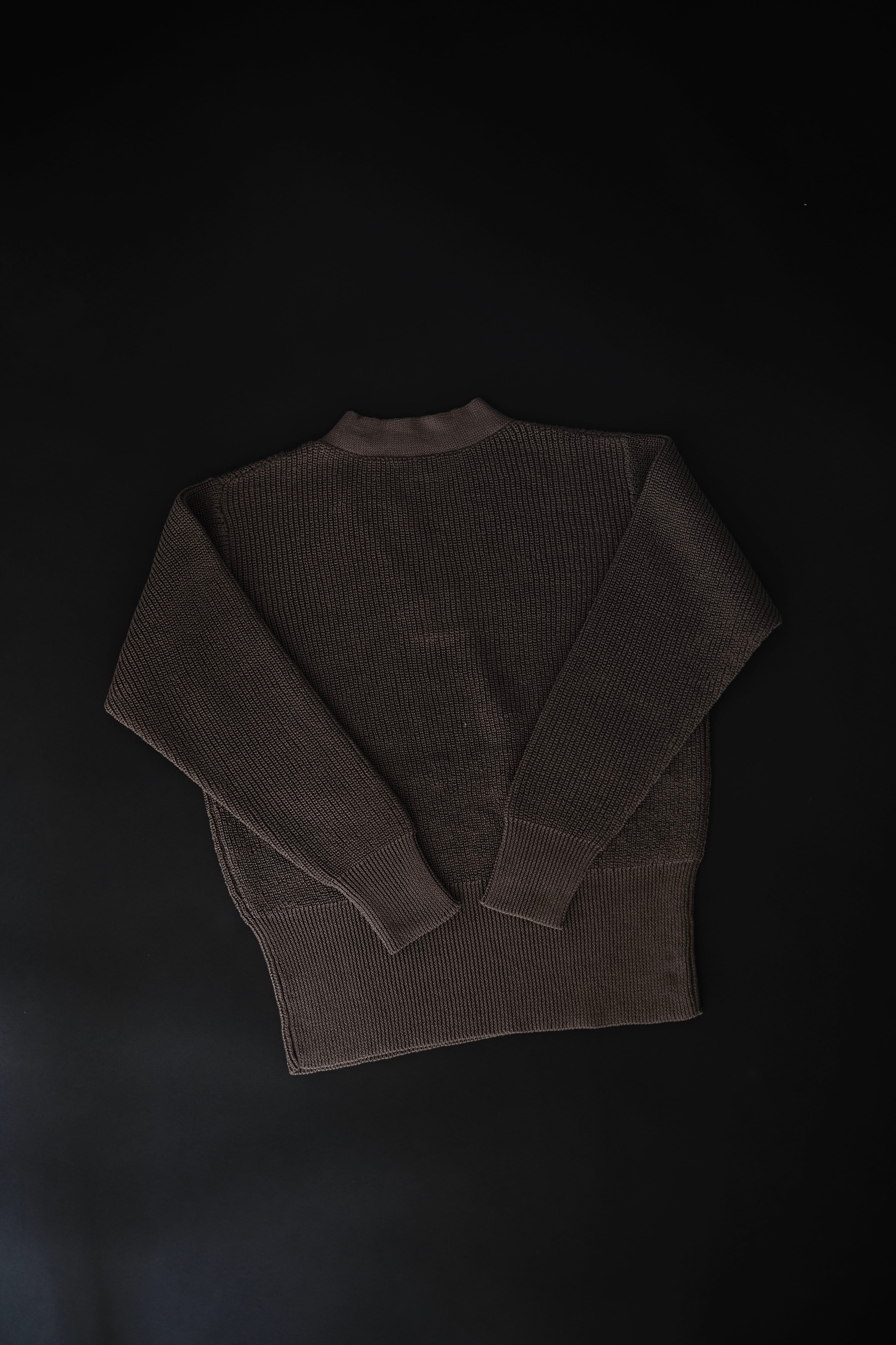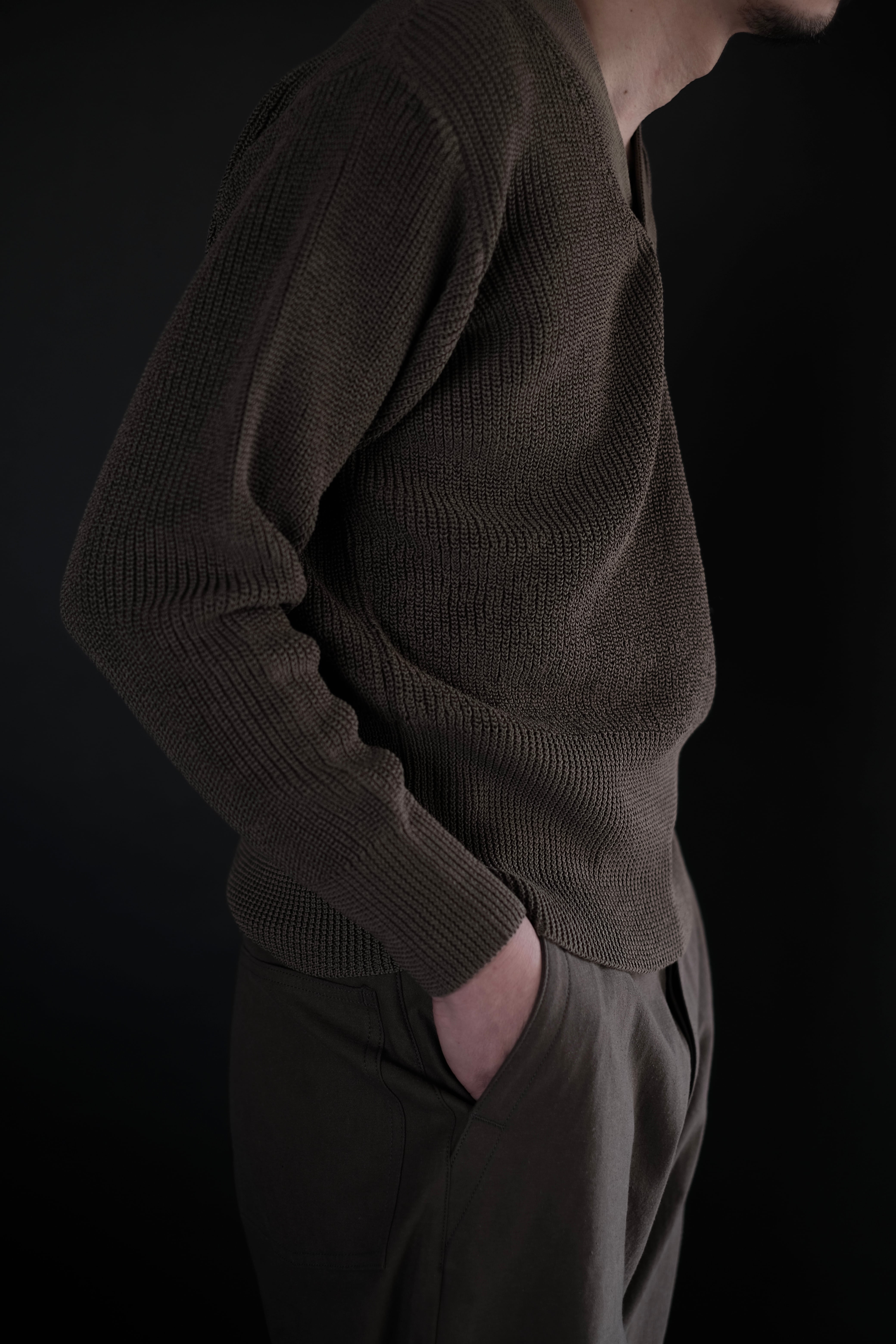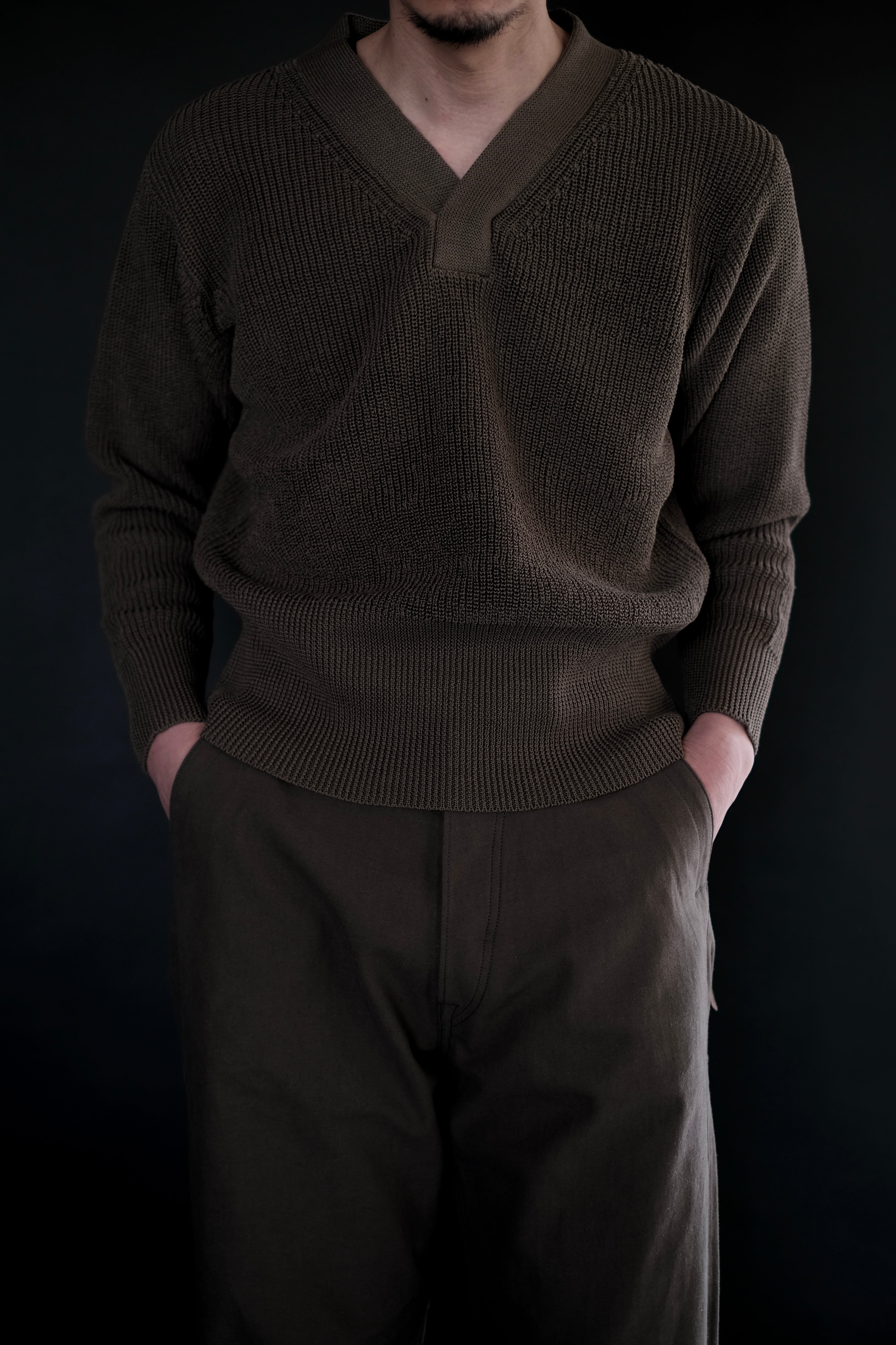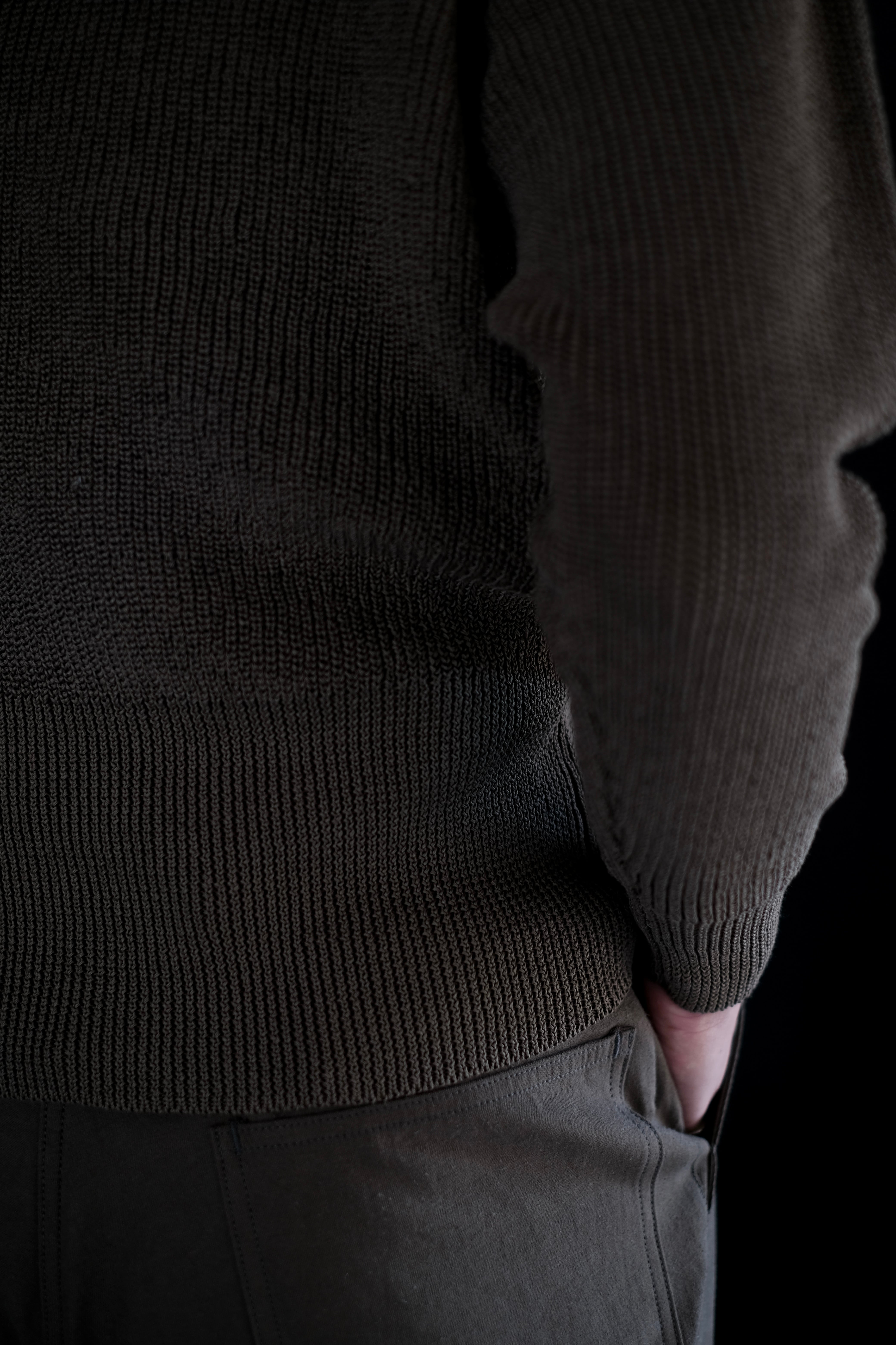 リファレンスはウールであるが、ローゲージながら綿糸に疑麻加工を施すことで、ドライタッチかつ軽量化を実現し、春夏でも着用可能な仕様とした。当時の写真を参考にしながら、丈は短めに設定し、リブの長さなどのシルエット調整もしている。
