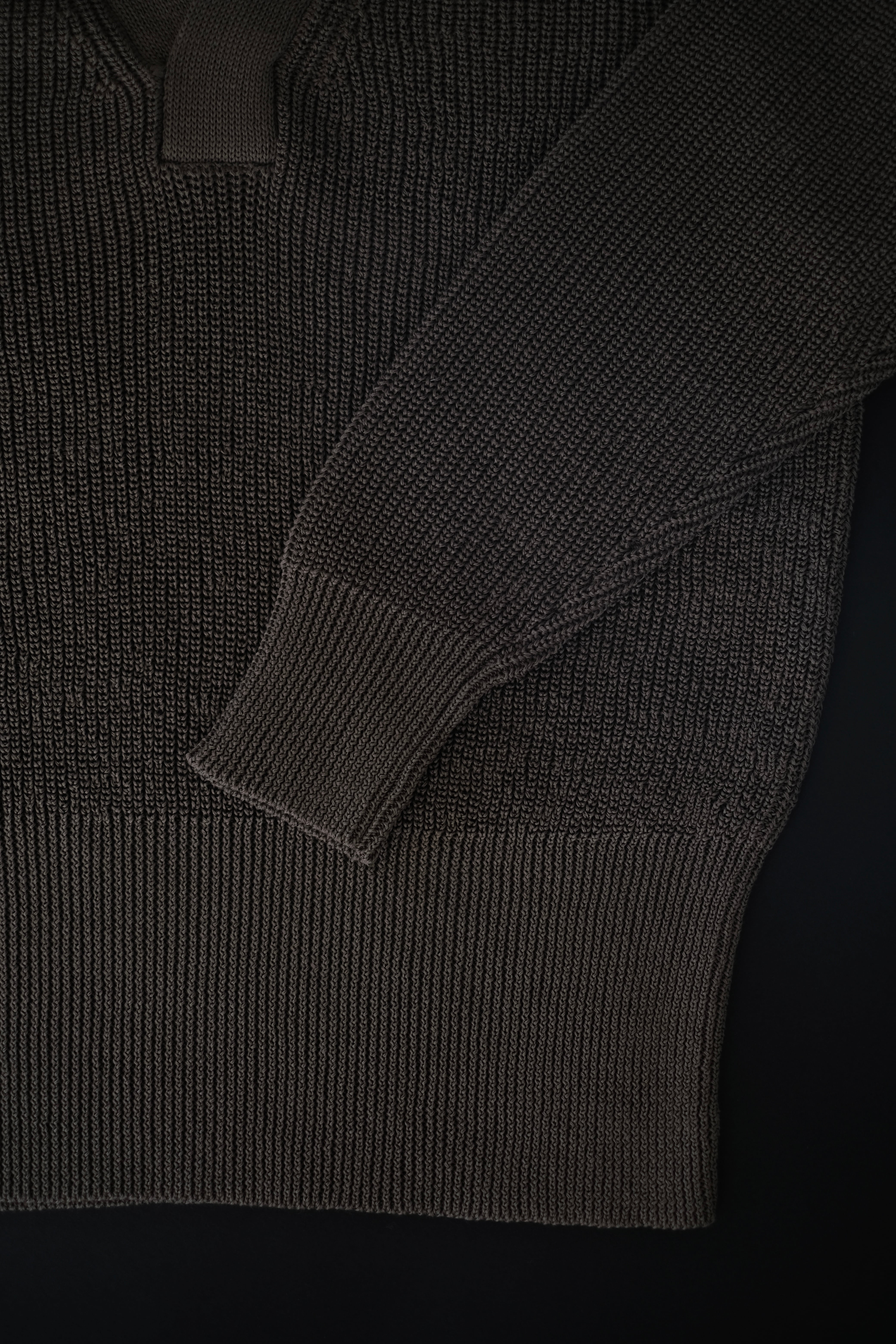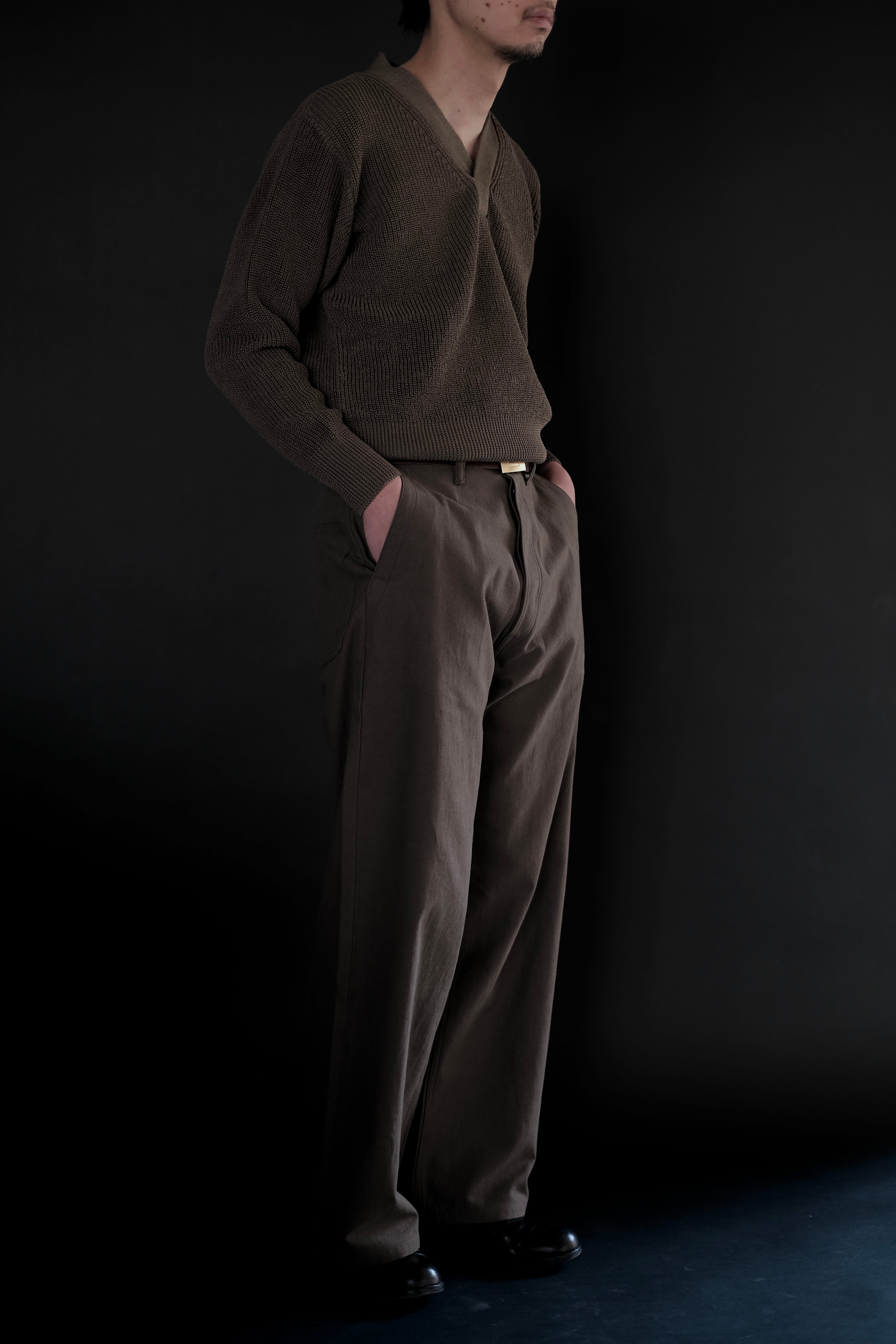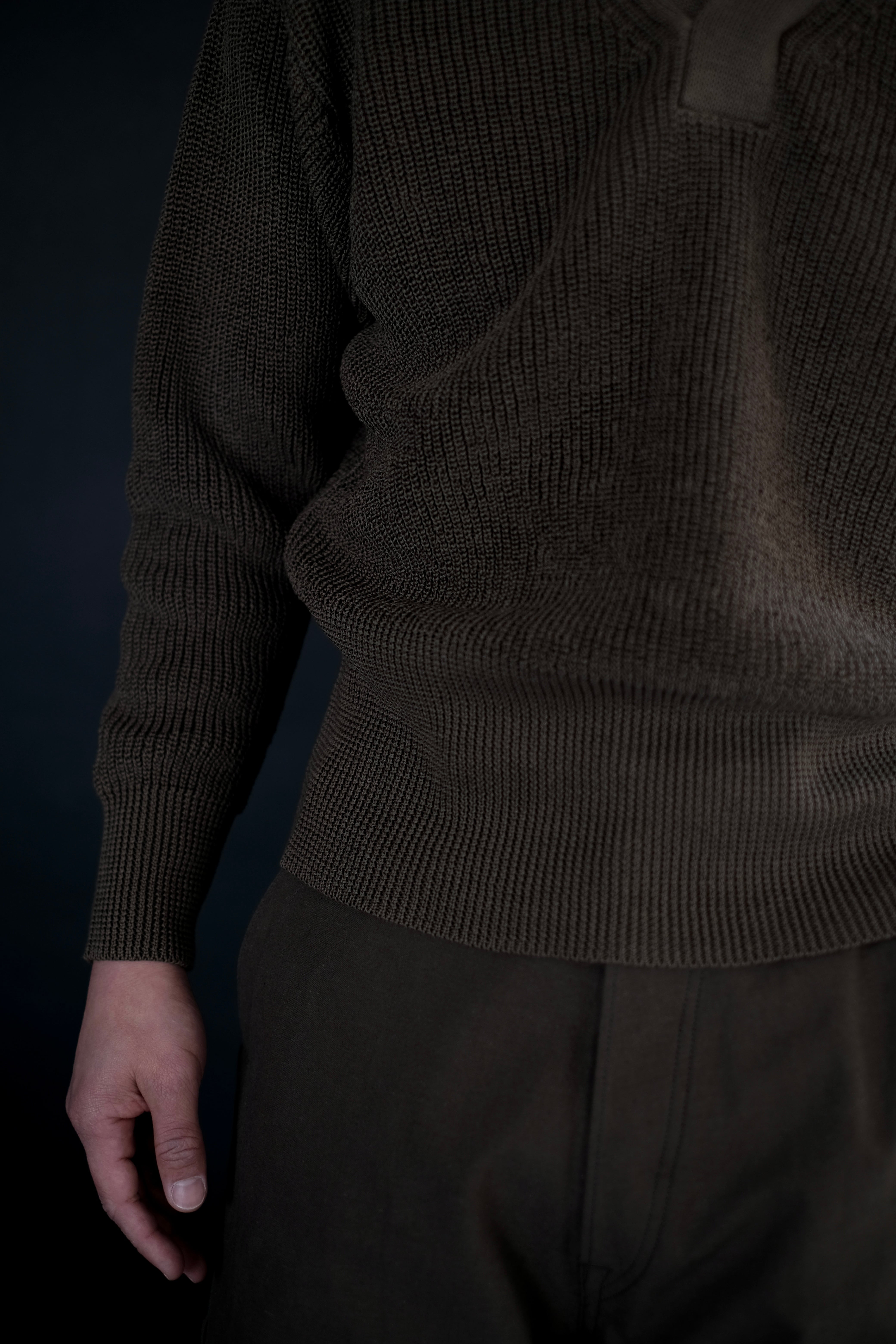 リファレンスはウールであるが、ローゲージながら綿糸に疑麻加工を施すことで、ドライタッチかつ軽量化を実現し、春夏でも着用可能な仕様とした。当時の写真を参考にしながら、丈は短めに設定し、リブの長さなどのシルエット調整もしている。