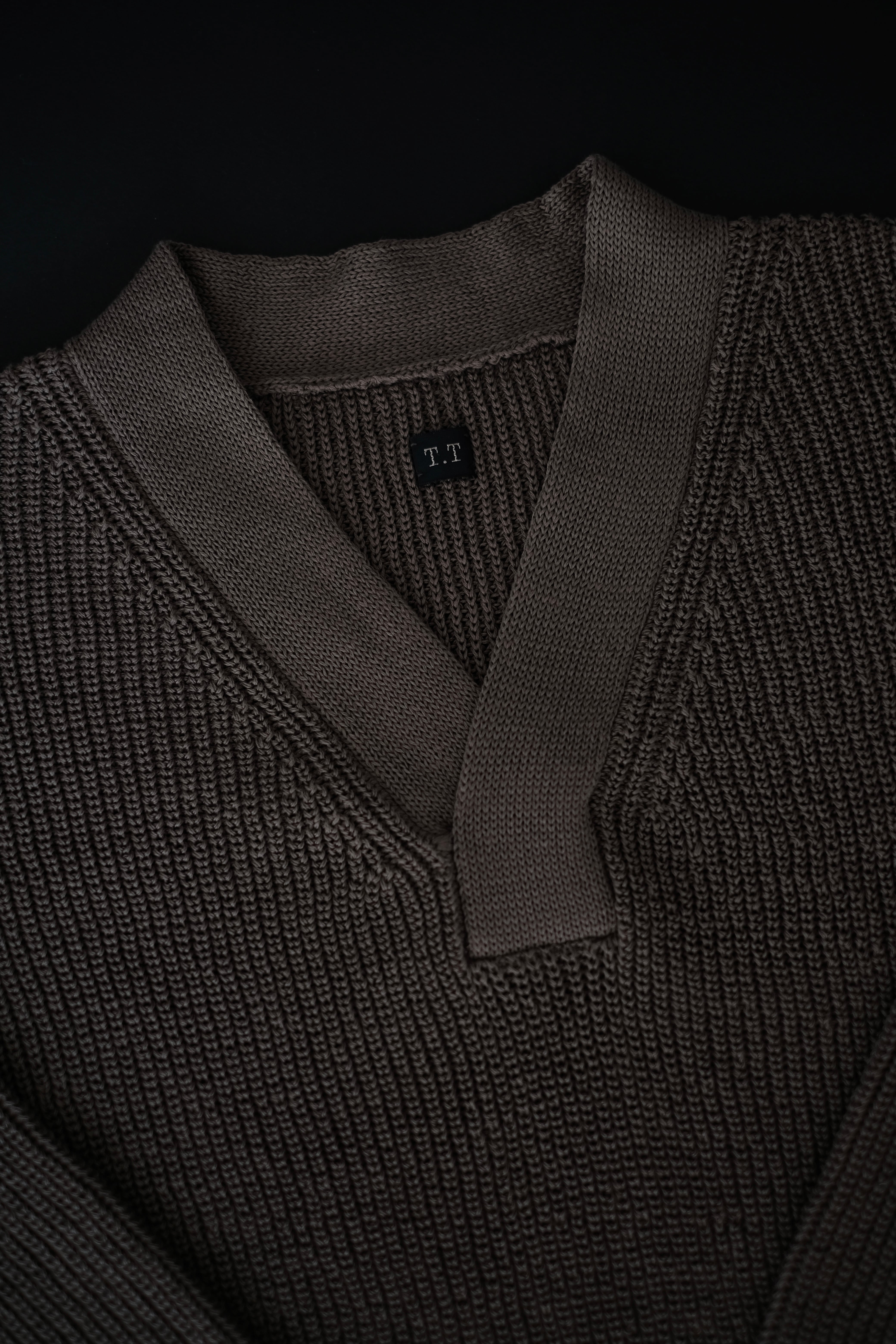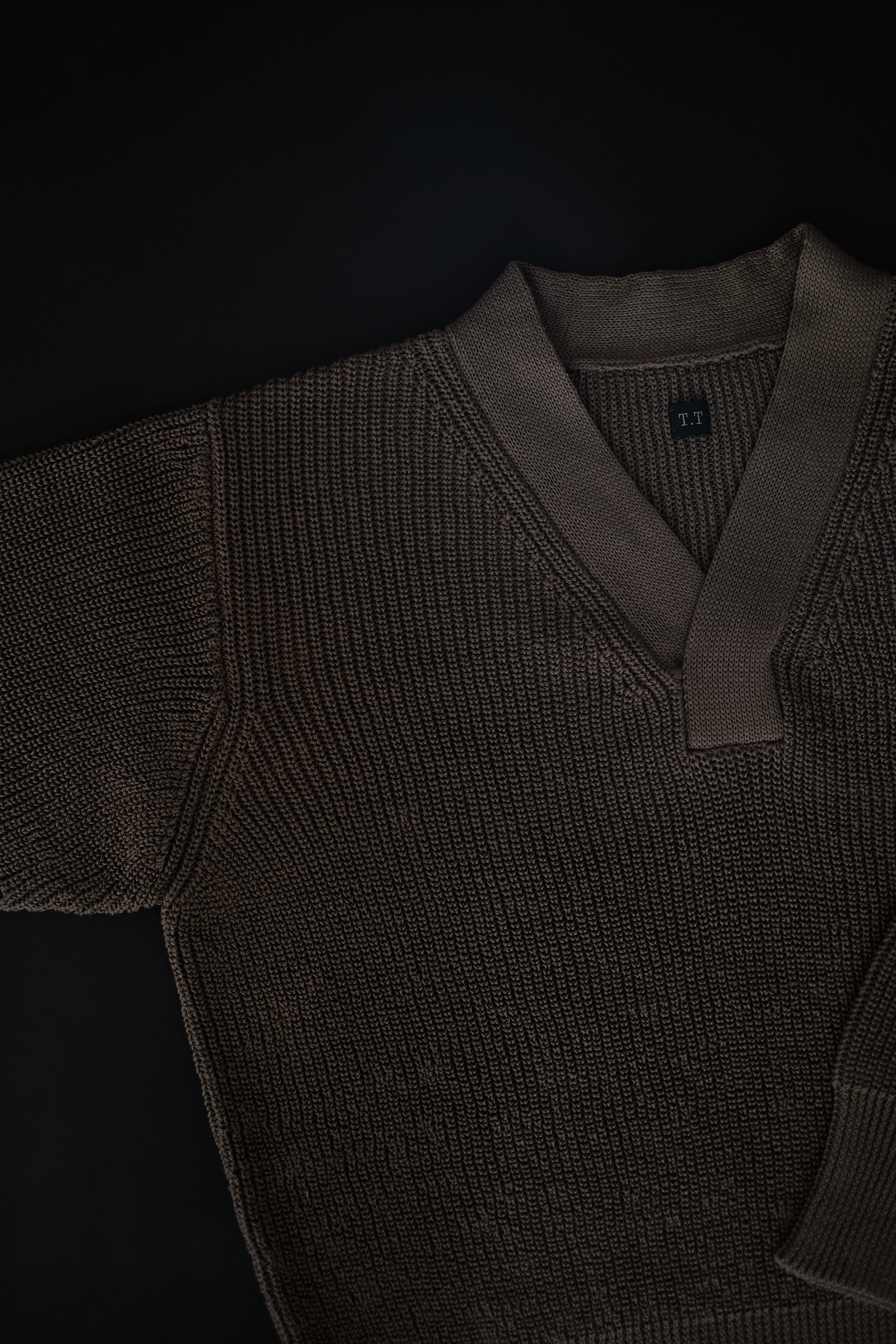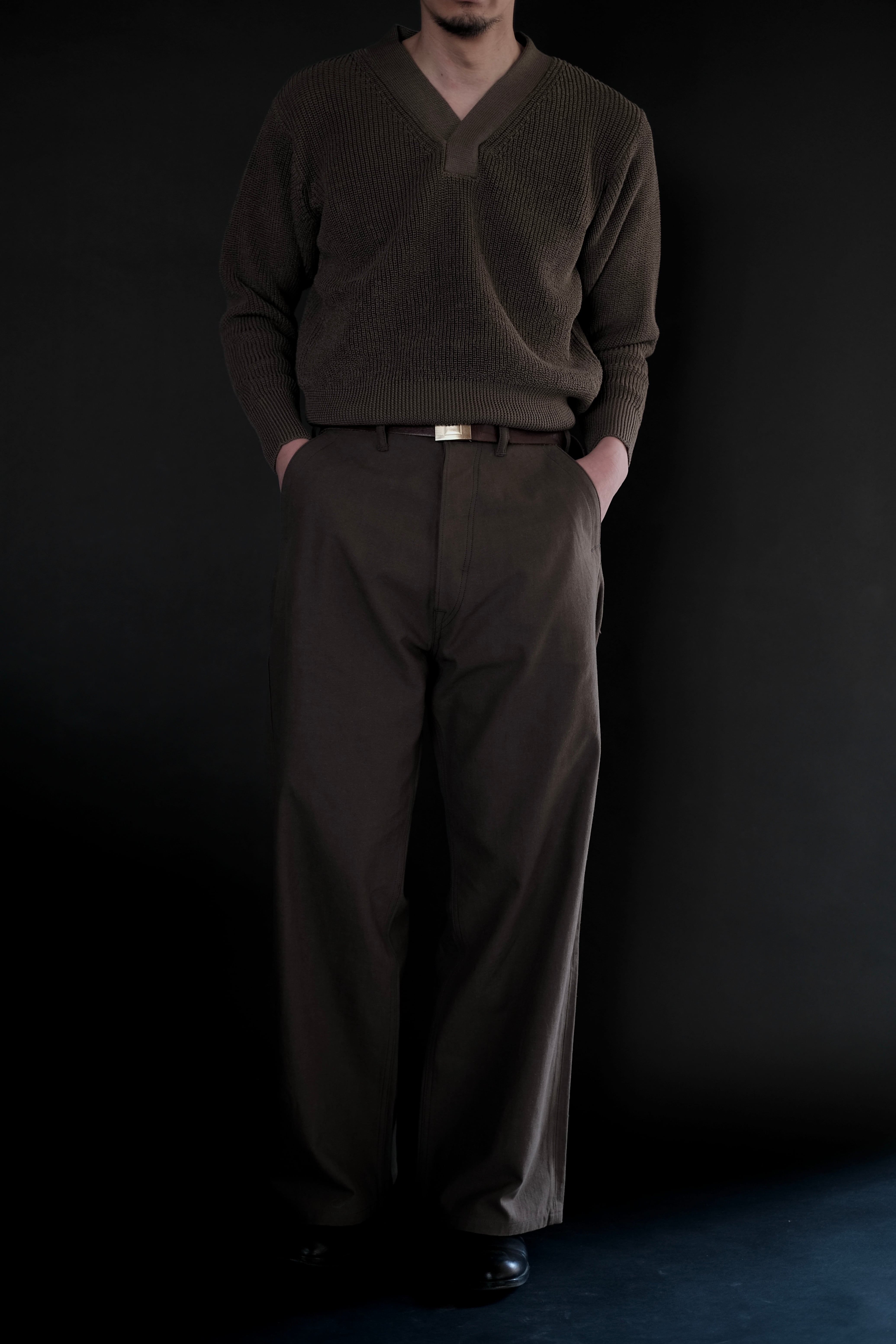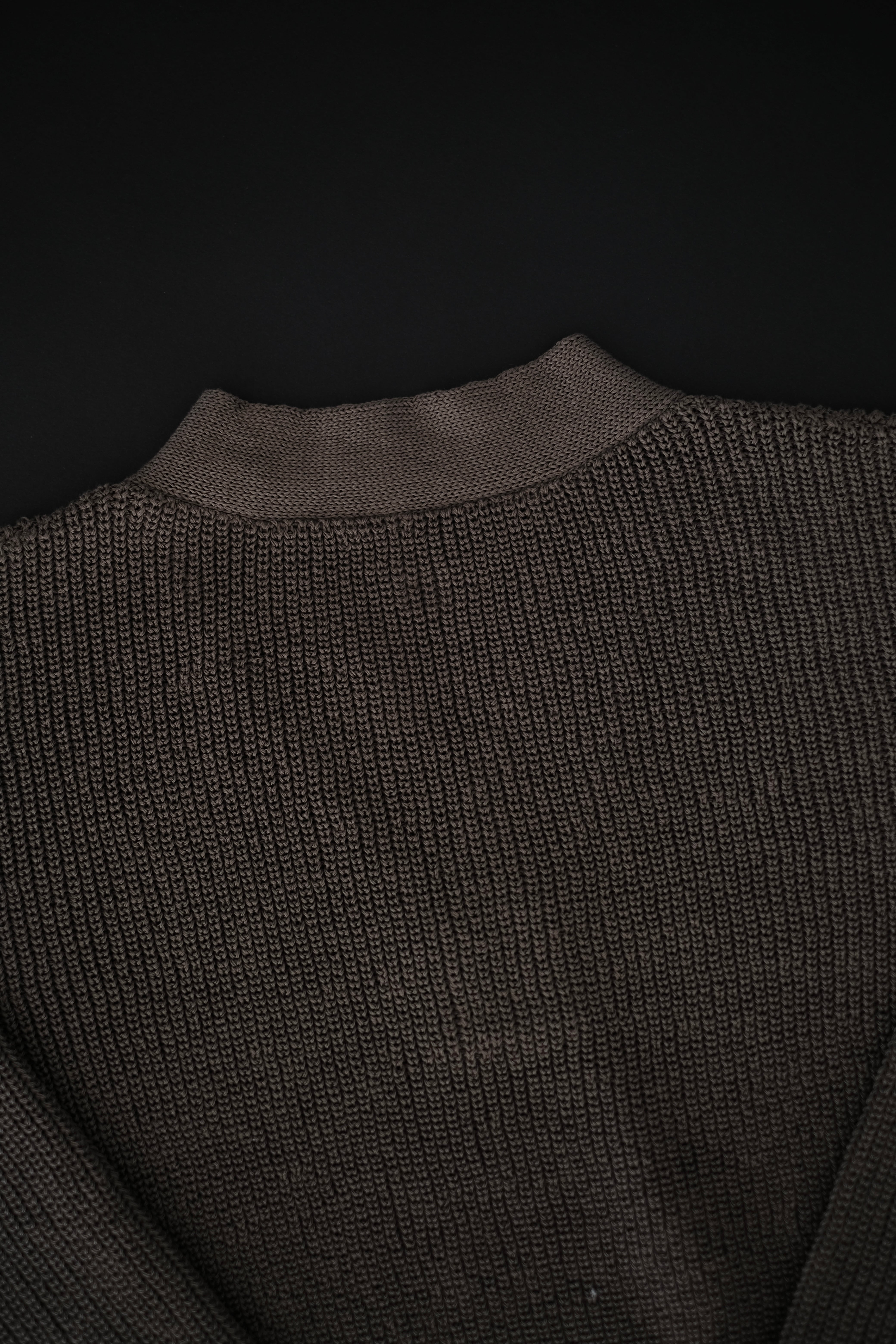 リファレンスはウールであるが、ローゲージながら綿糸に疑麻加工を施すことで、ドライタッチかつ軽量化を実現し、春夏でも着用可能な仕様とした。当時の写真を参考にしながら、丈は短めに設定し、リブの長さなどのシルエット調整もしている。