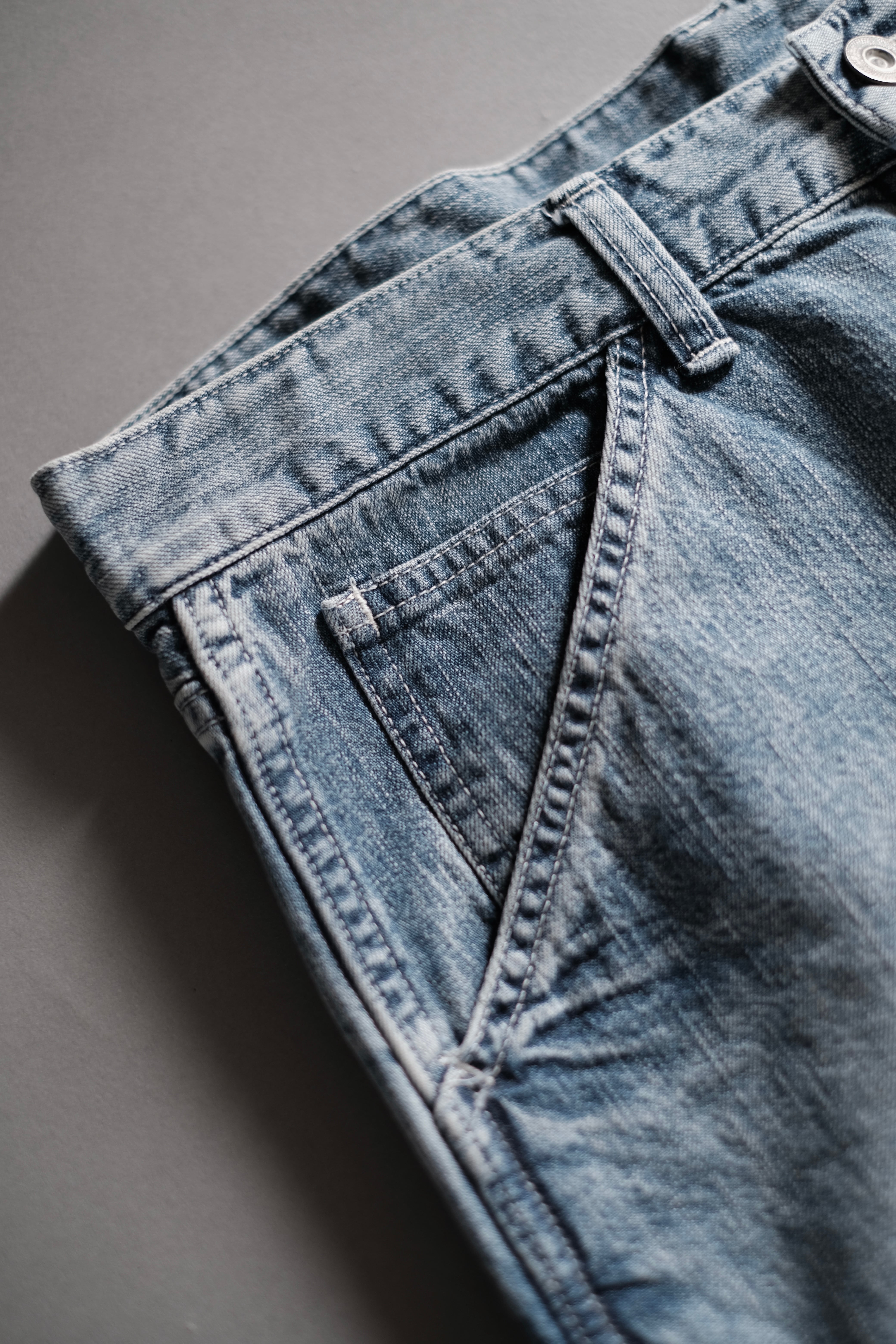 少し色の浅いピュアインディゴでローブ染色した米綿のナチュラルなムラ系を使用して織り上げた9.5ozデニム。
