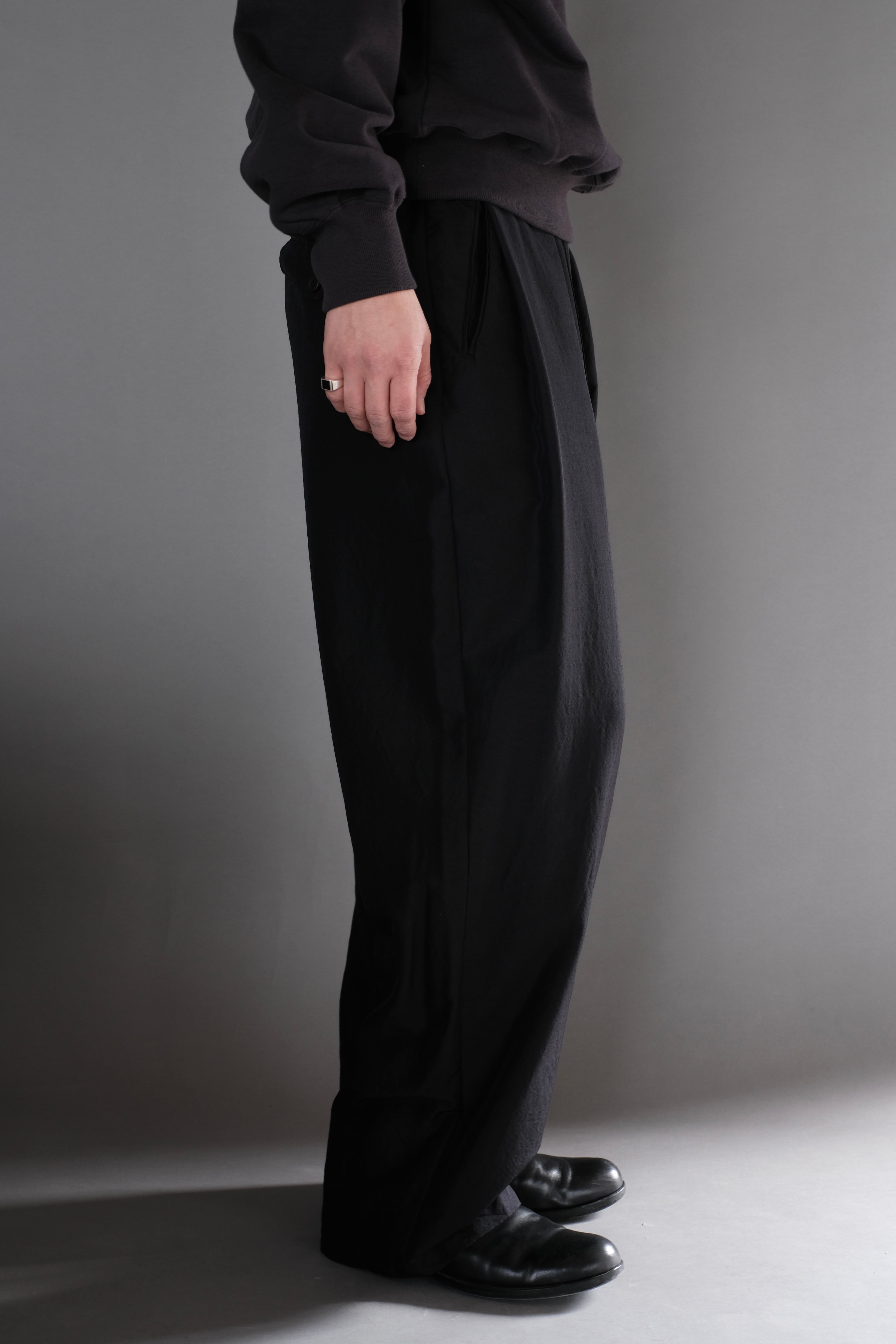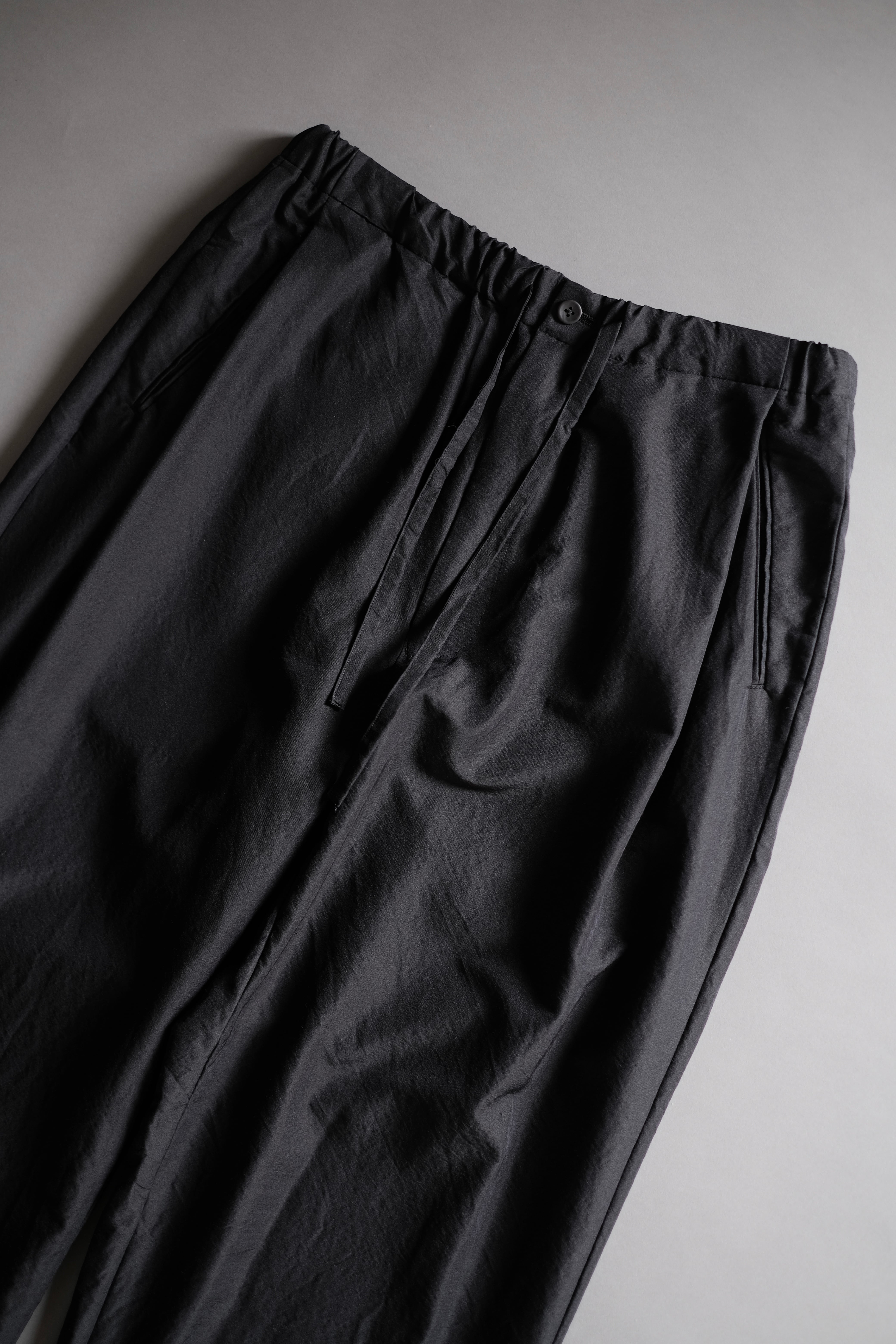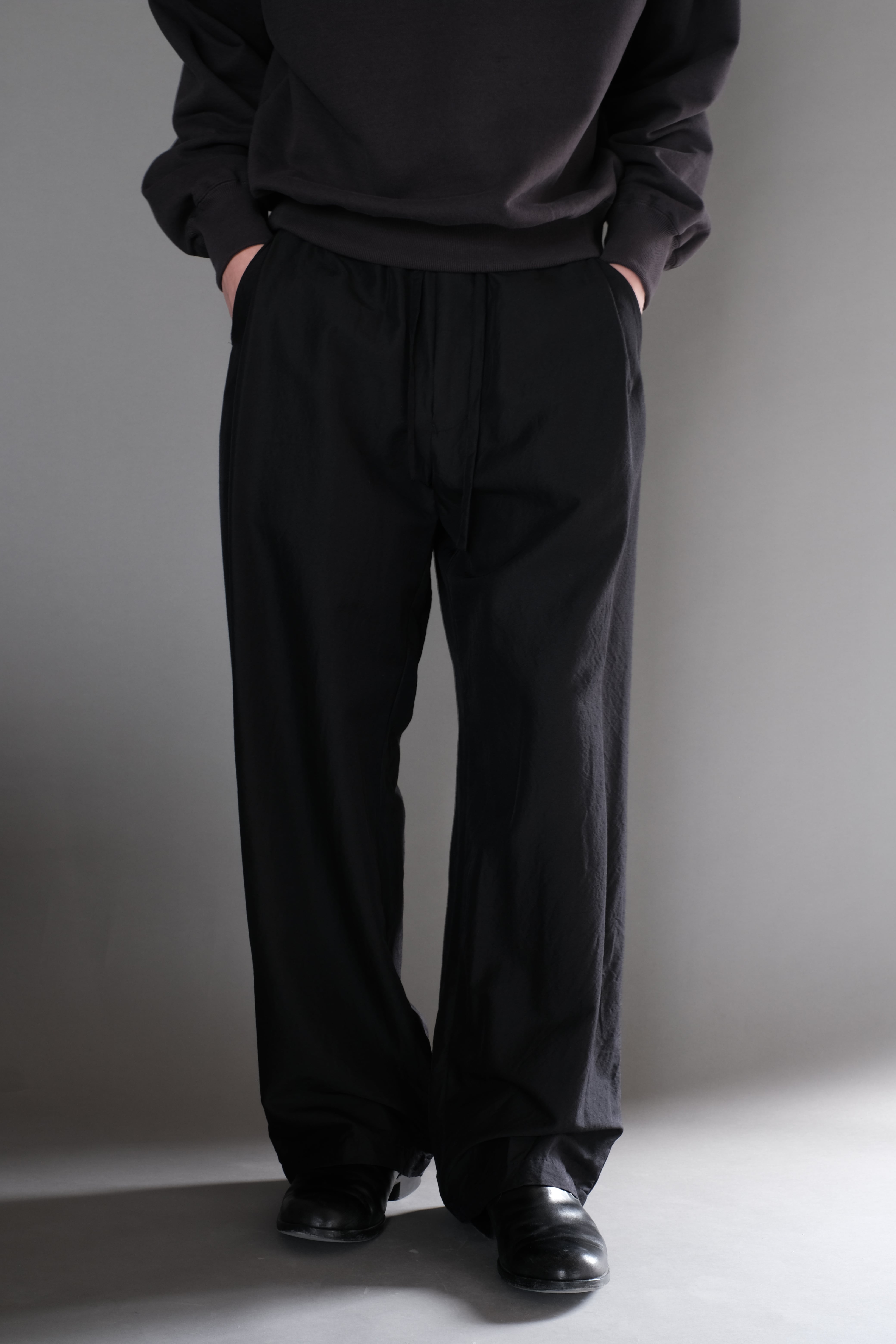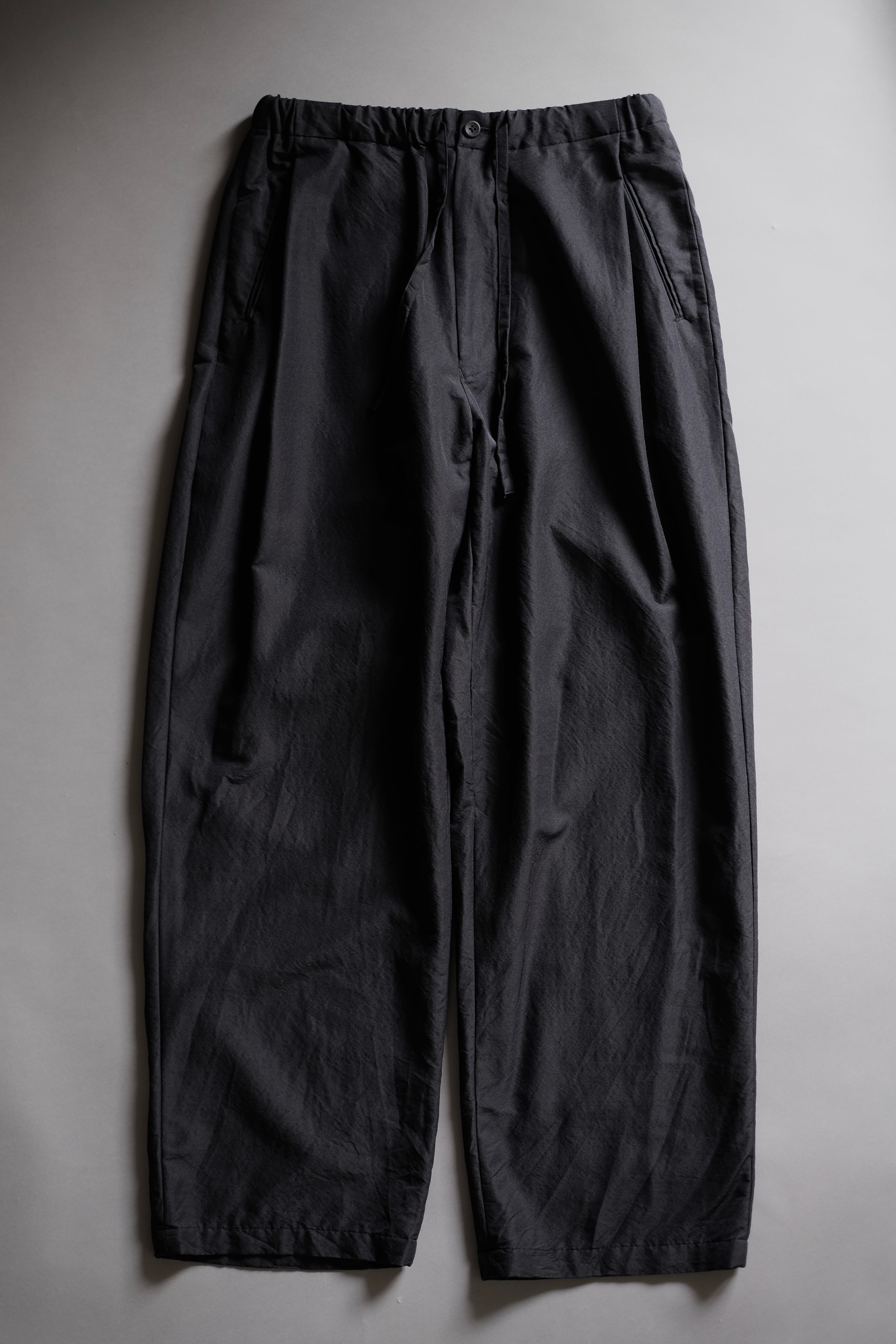 ゆとりのある股上と中太ストレートのシルエット、両サイドにさり気なく入った深めのアウトタックが特徴で、ゴムとドローコード仕様のウエストは心地良い着用感を感じられます。