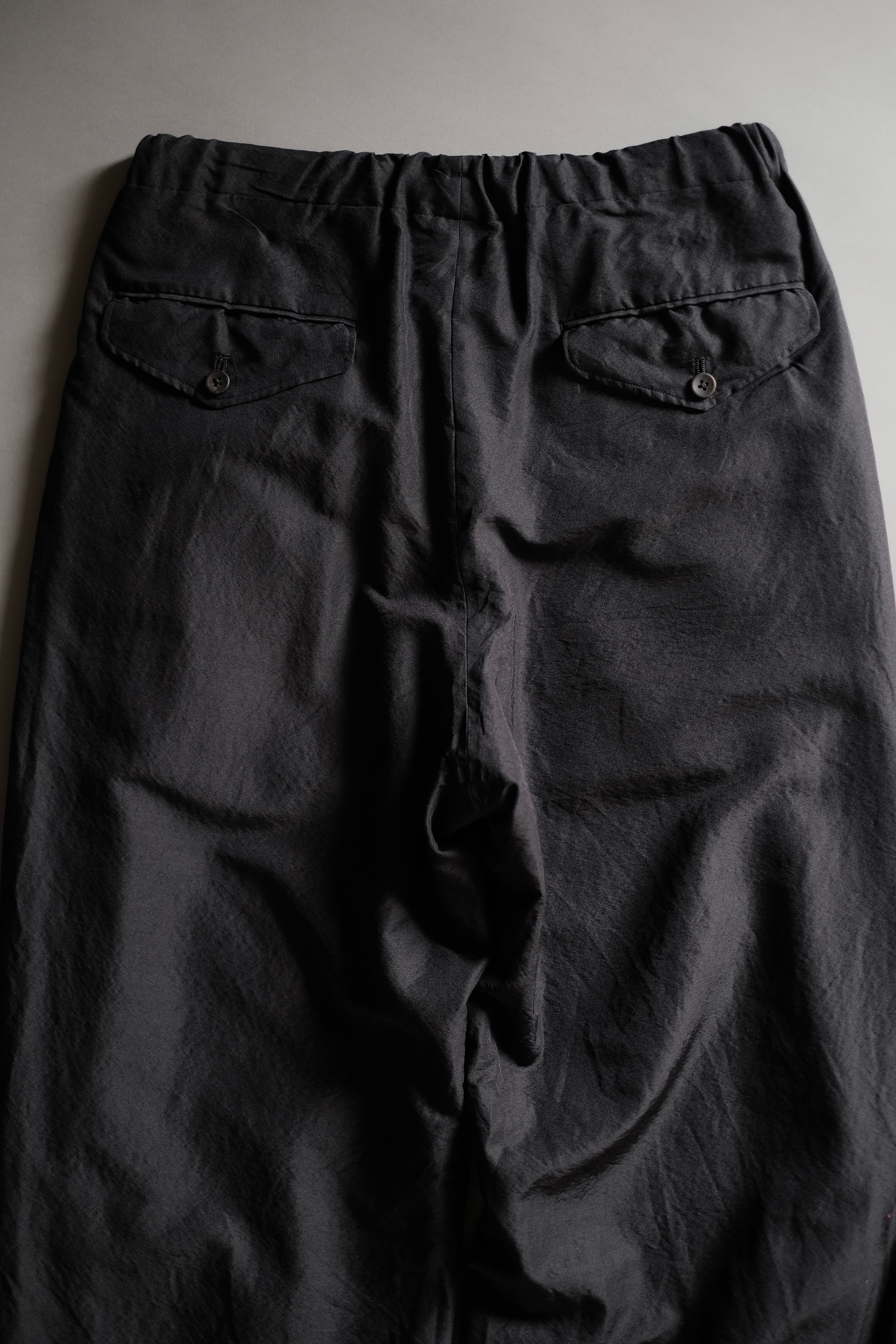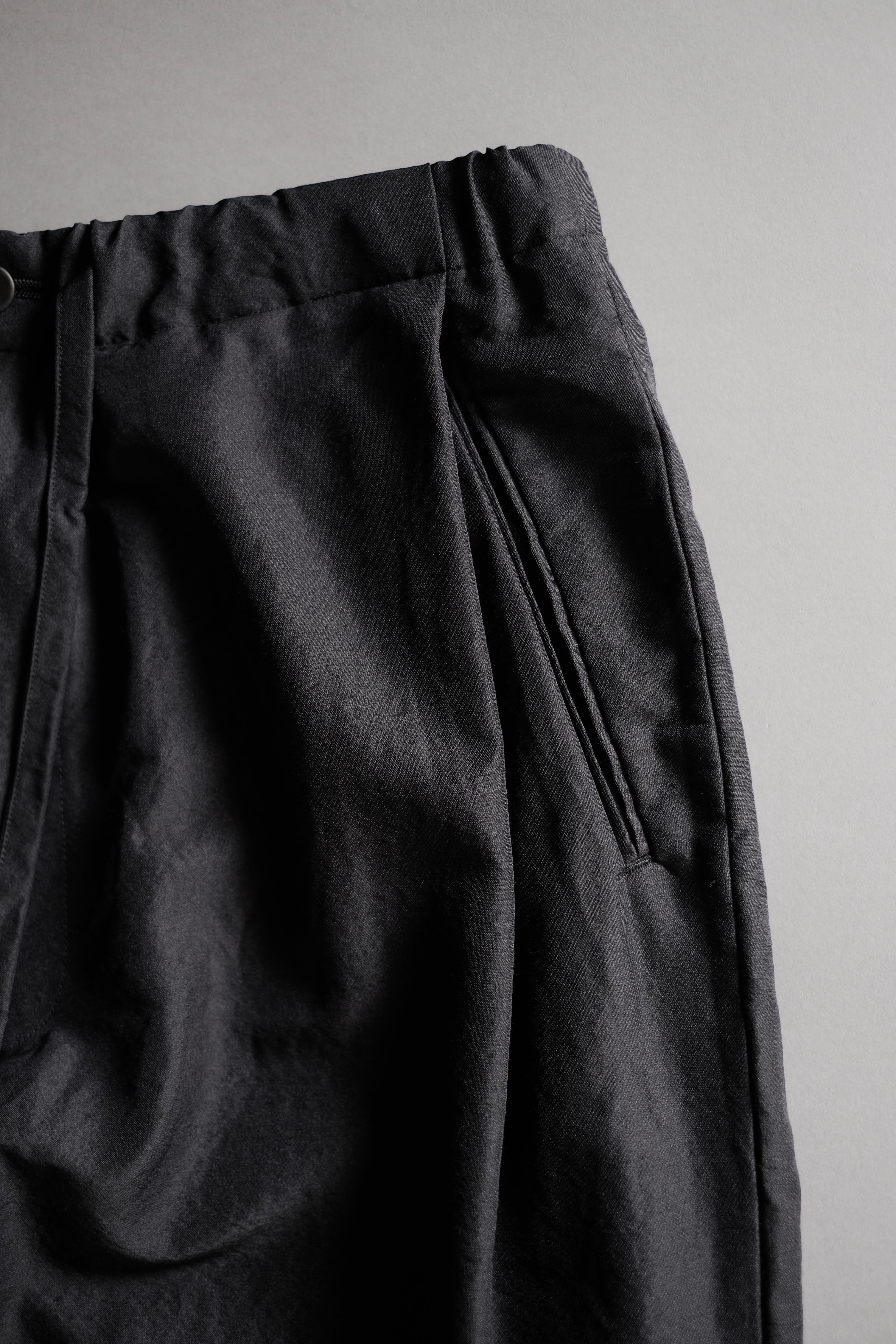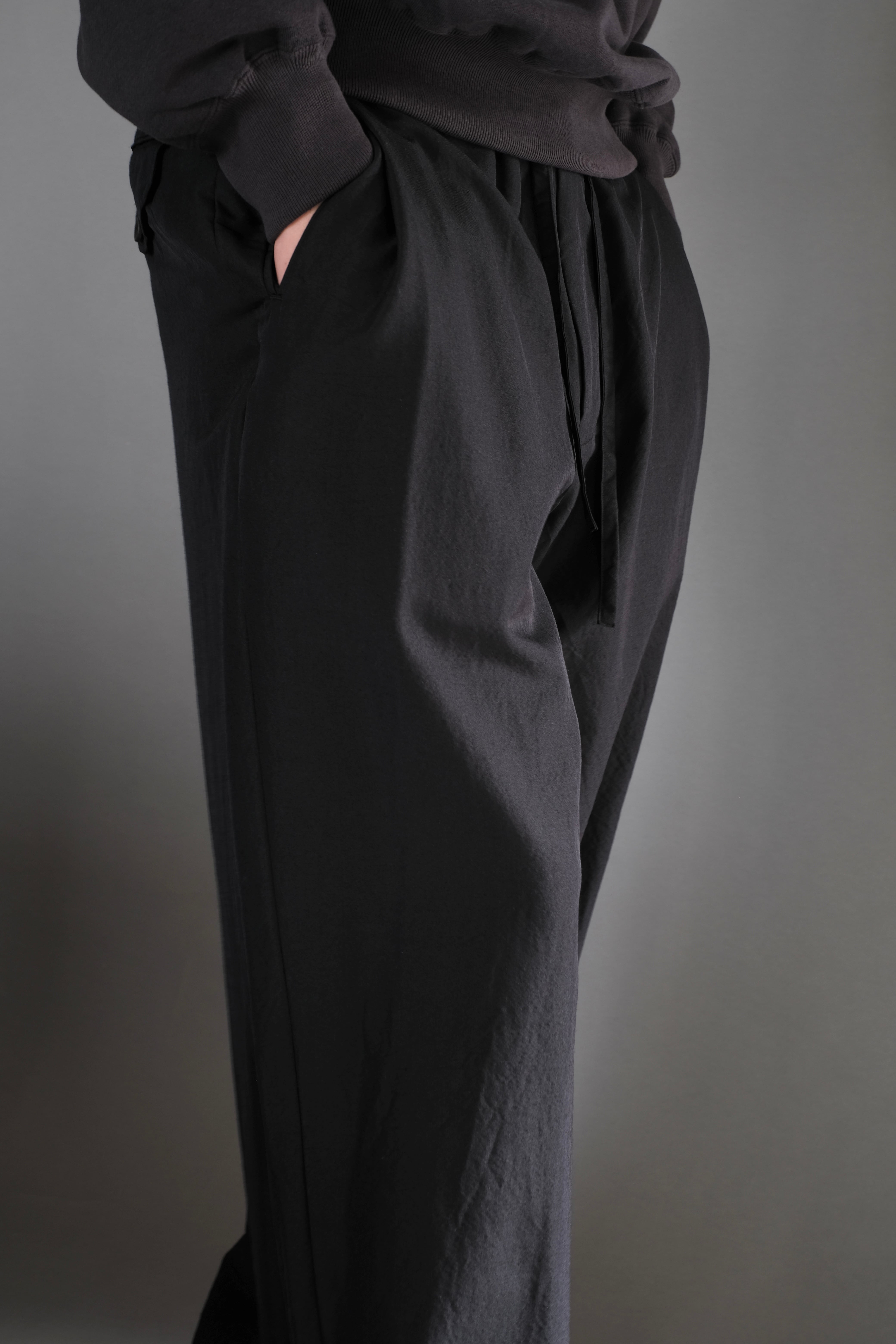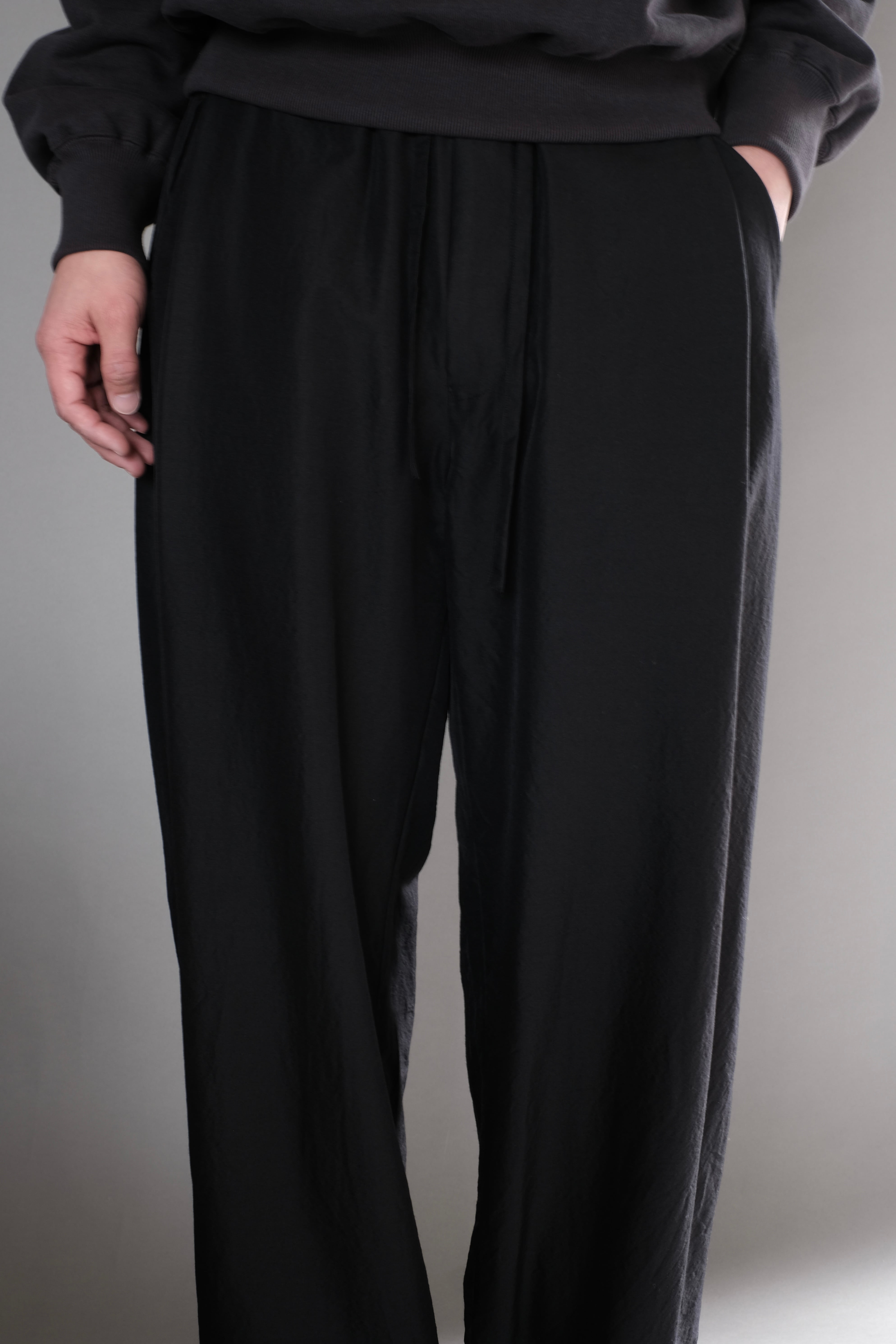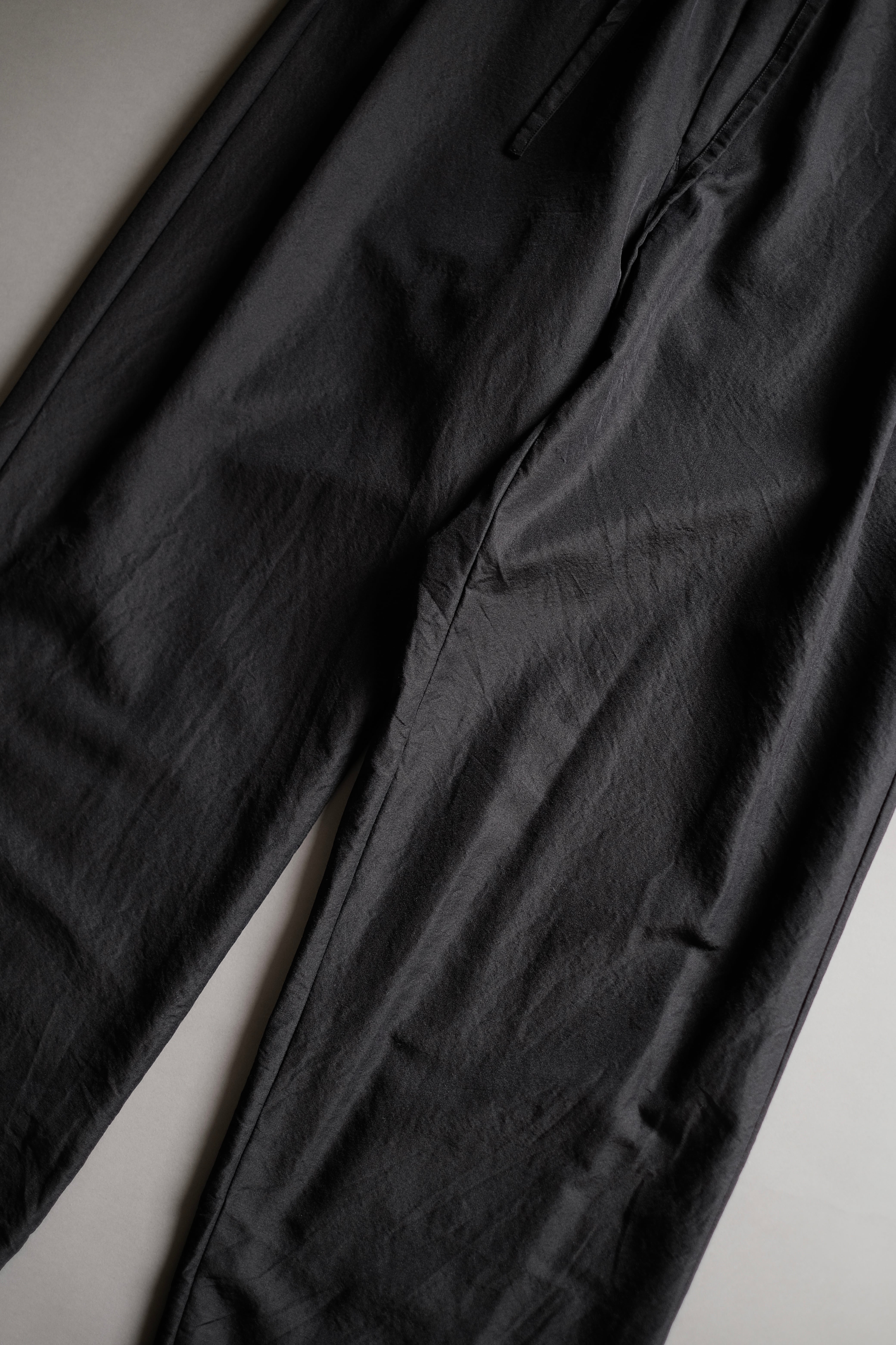 ゆとりのある股上と中太ストレートのシルエット、両サイドにさり気なく入った深めのアウトタックが特徴で、ゴムとドローコード仕様のウエストは心地良い着用感を感じられます。