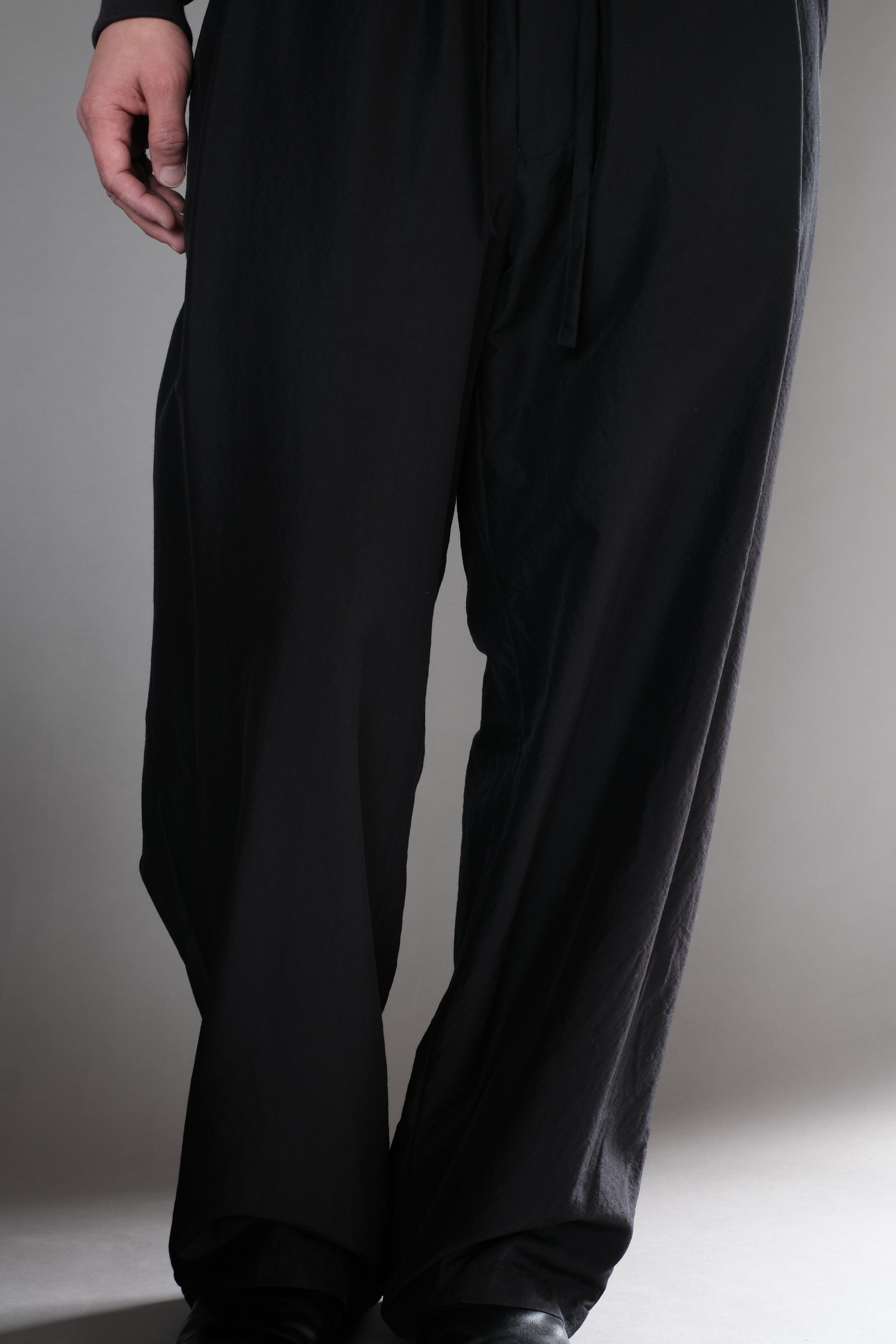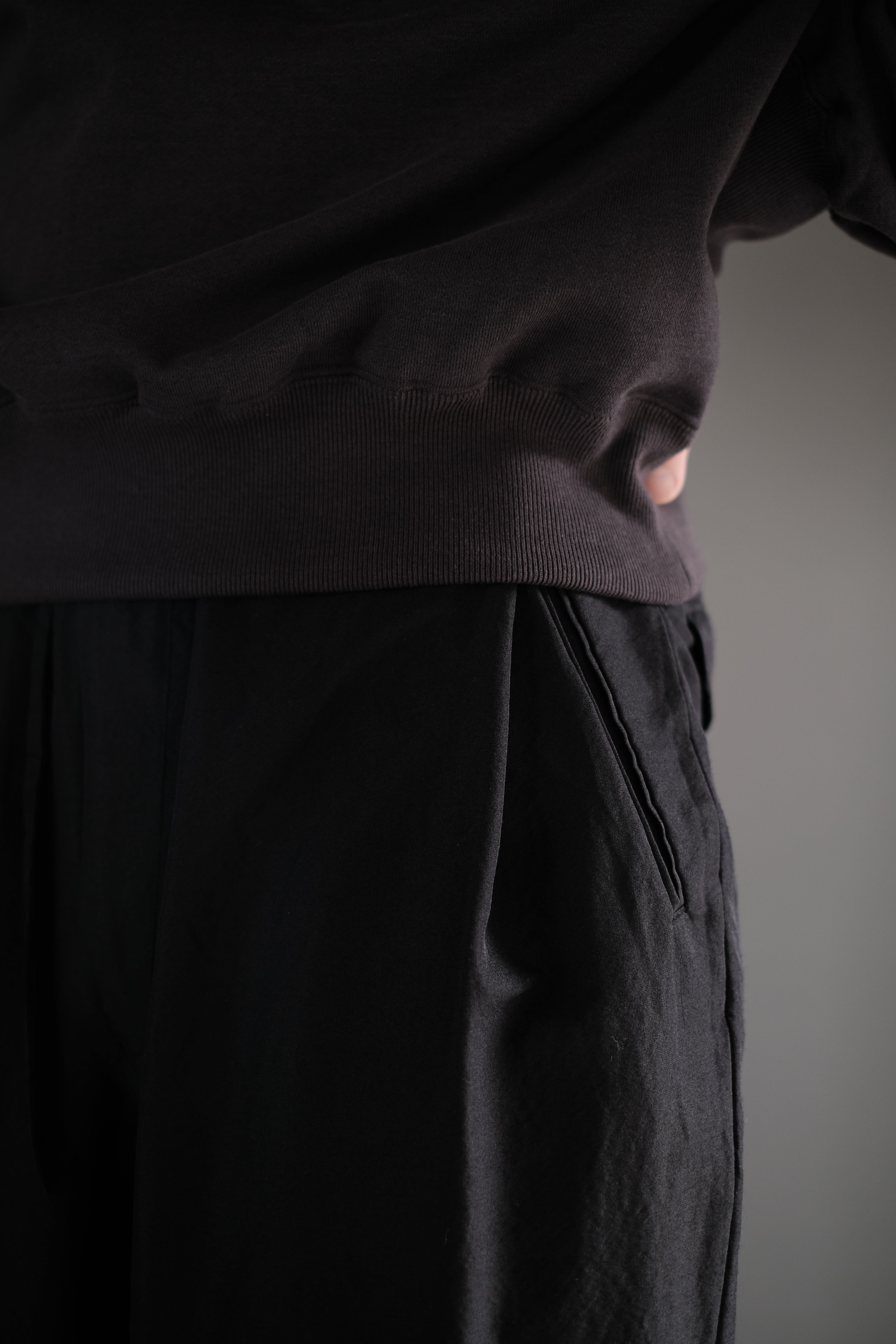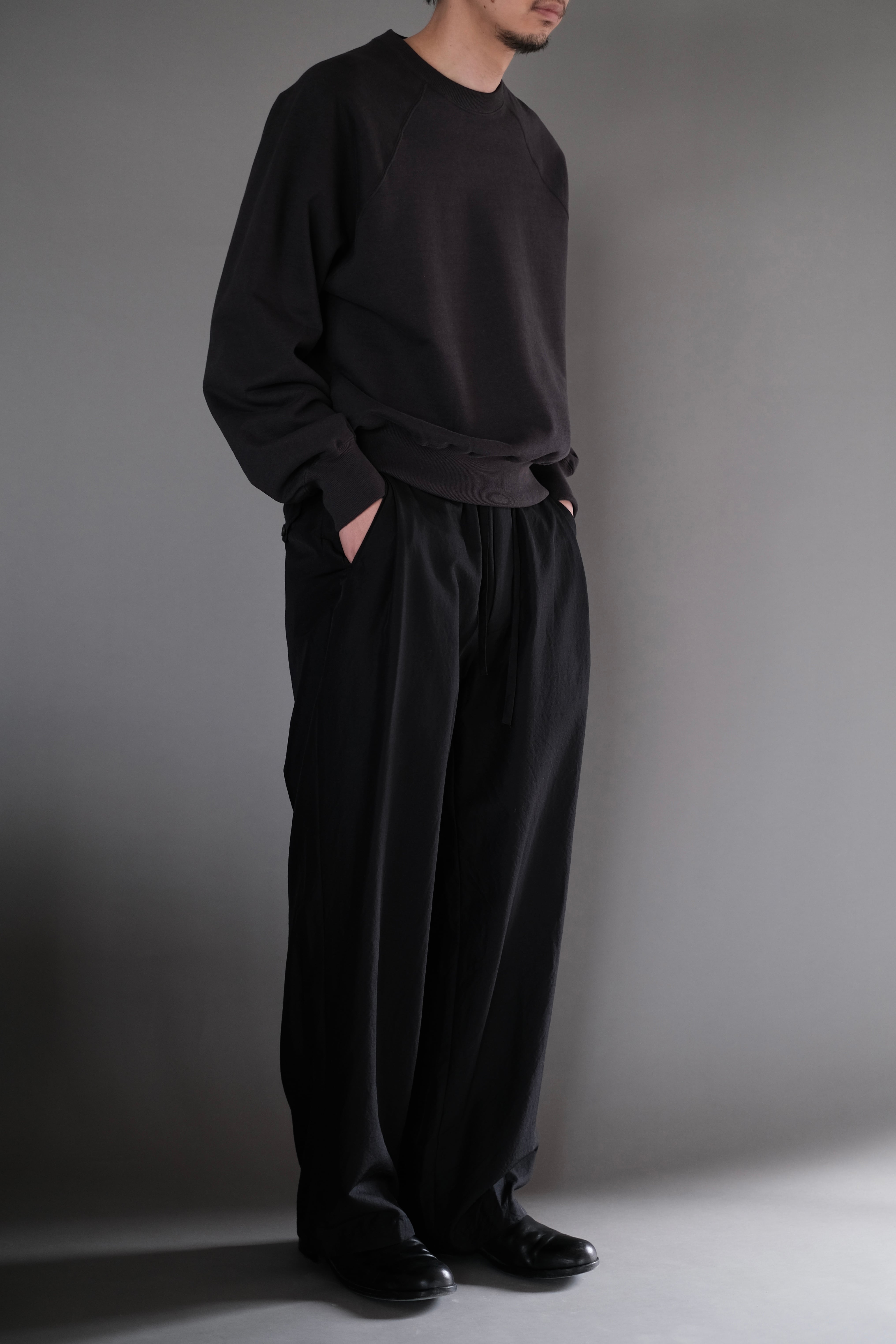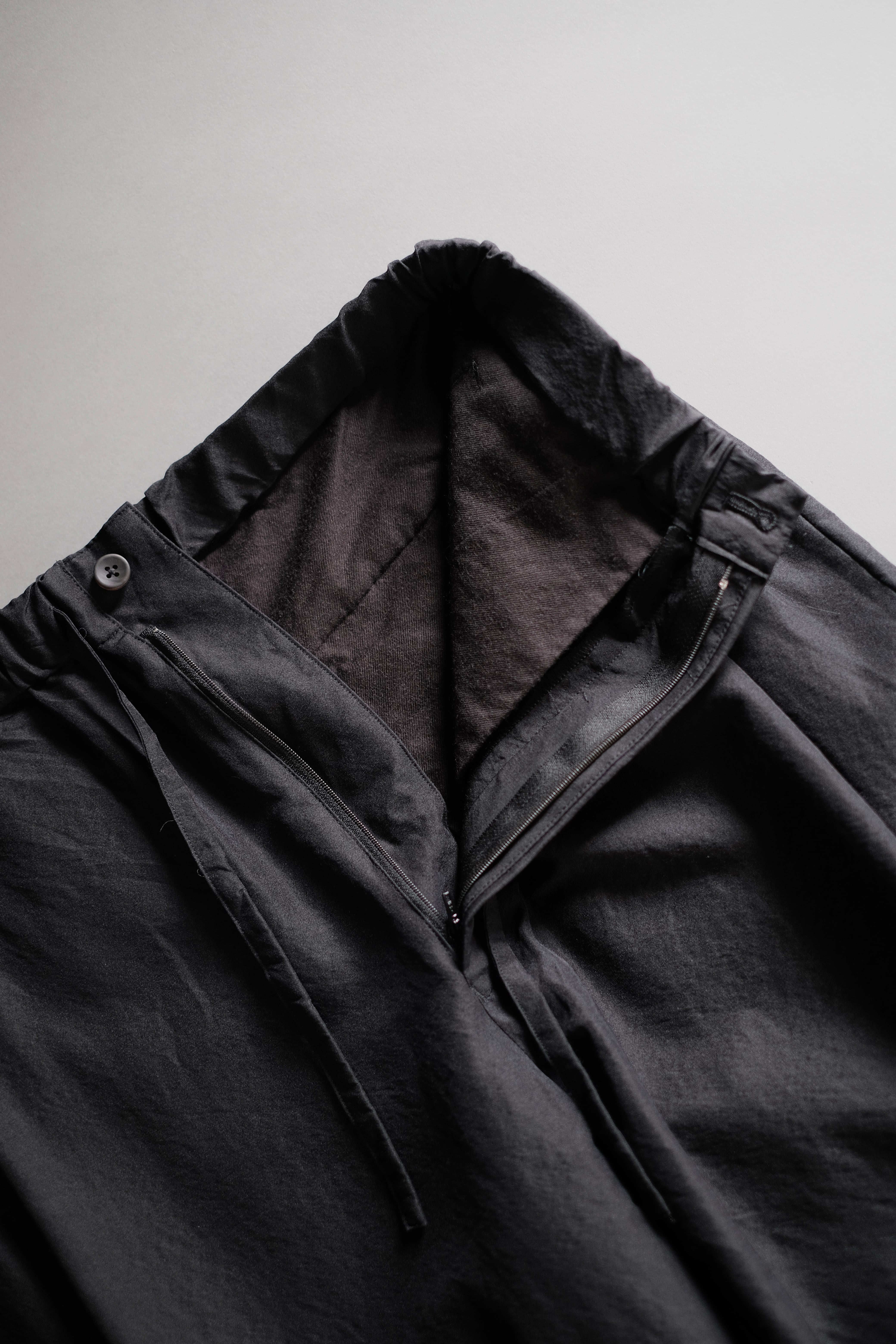 ゆとりのある股上と中太ストレートのシルエット、両サイドにさり気なく入った深めのアウトタックが特徴で、ゴムとドローコード仕様のウエストは心地良い着用感を感じられます。