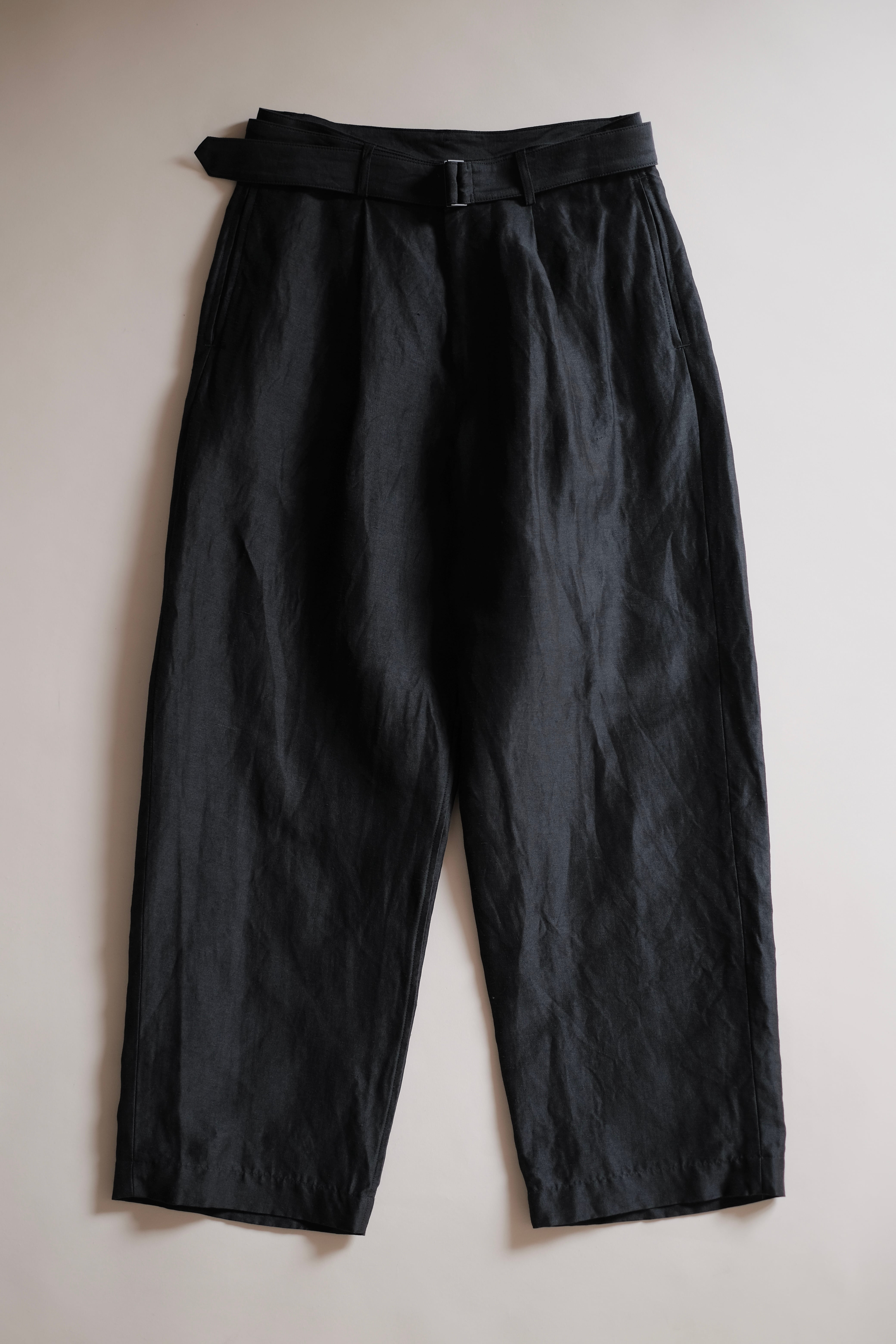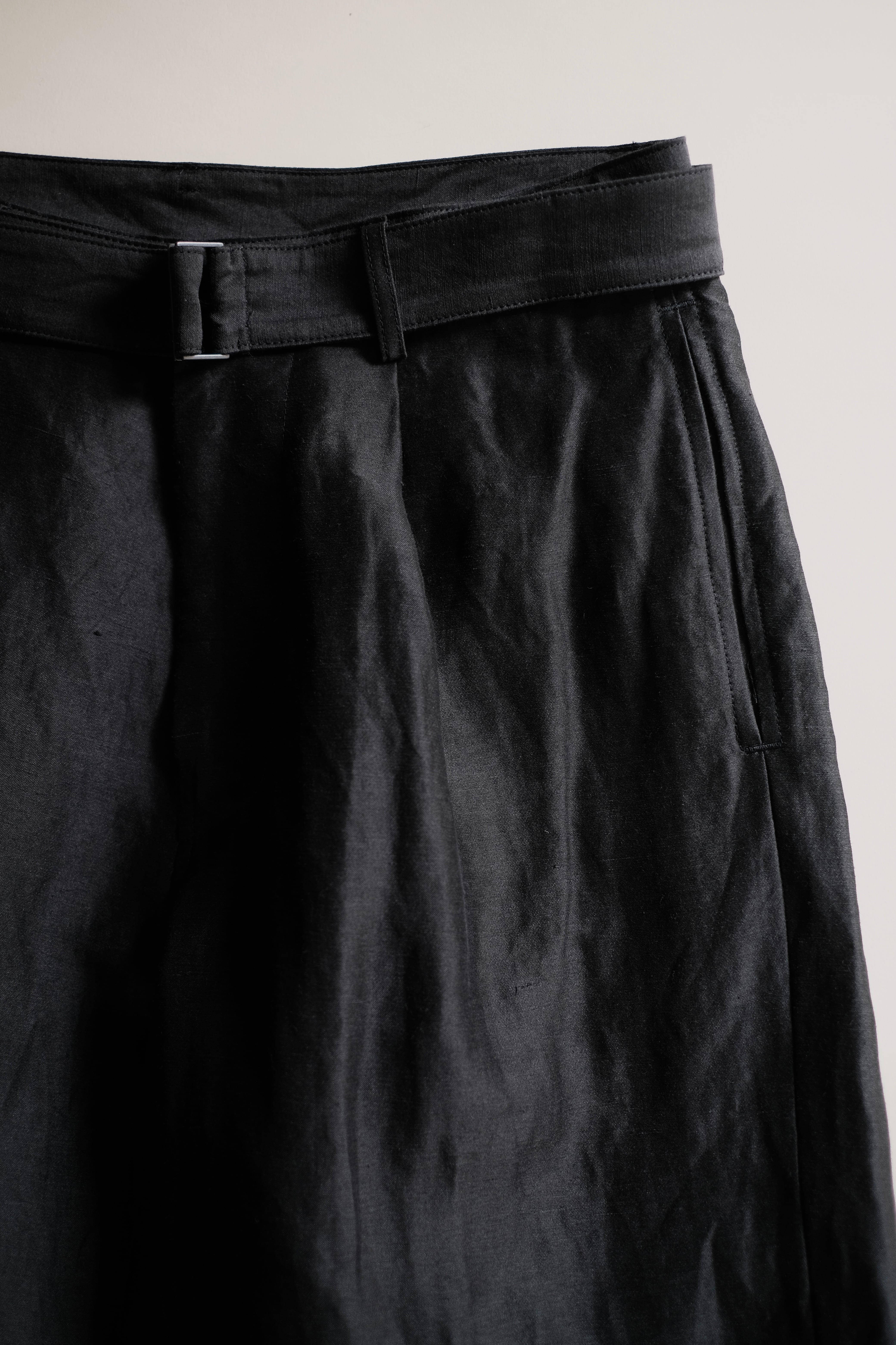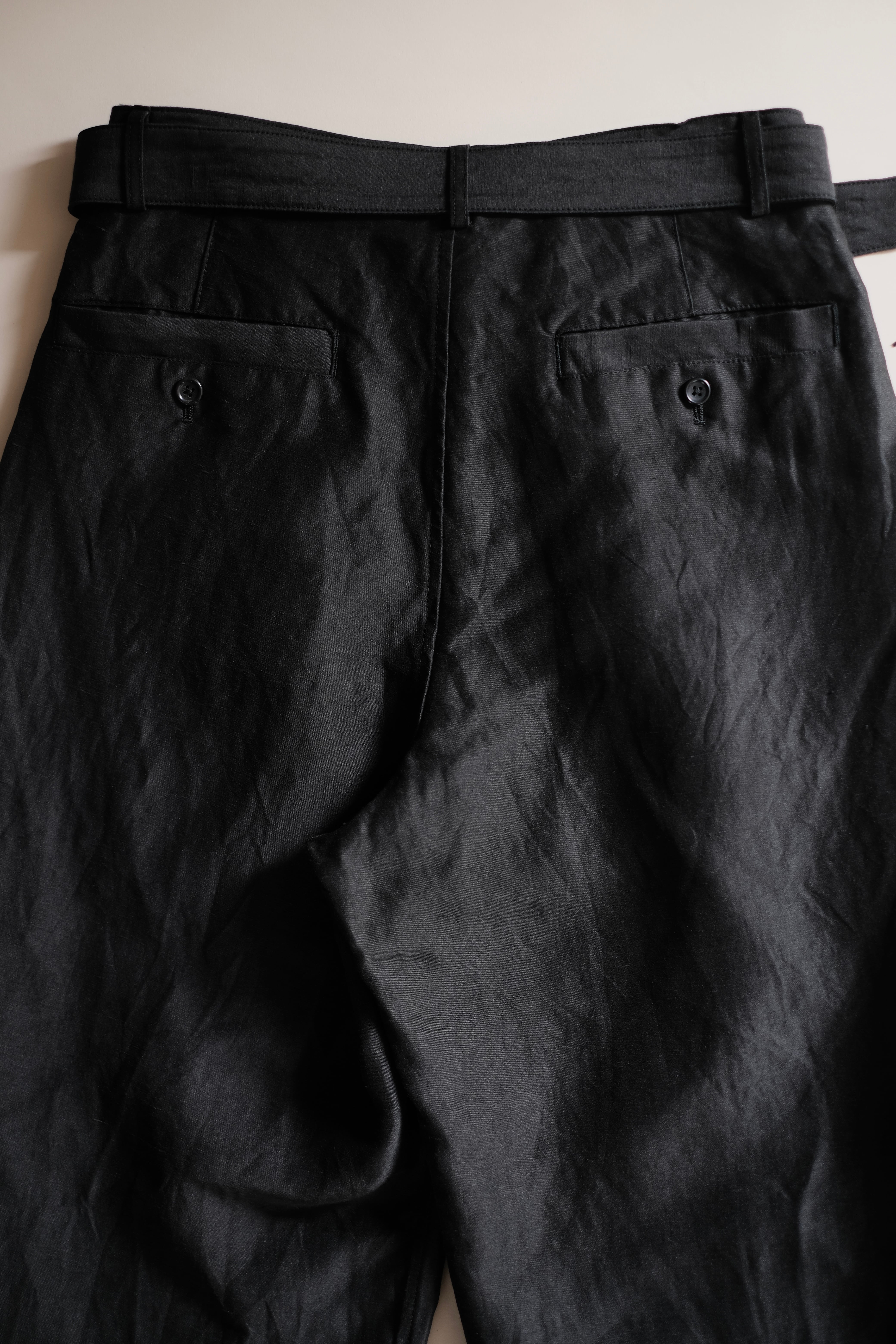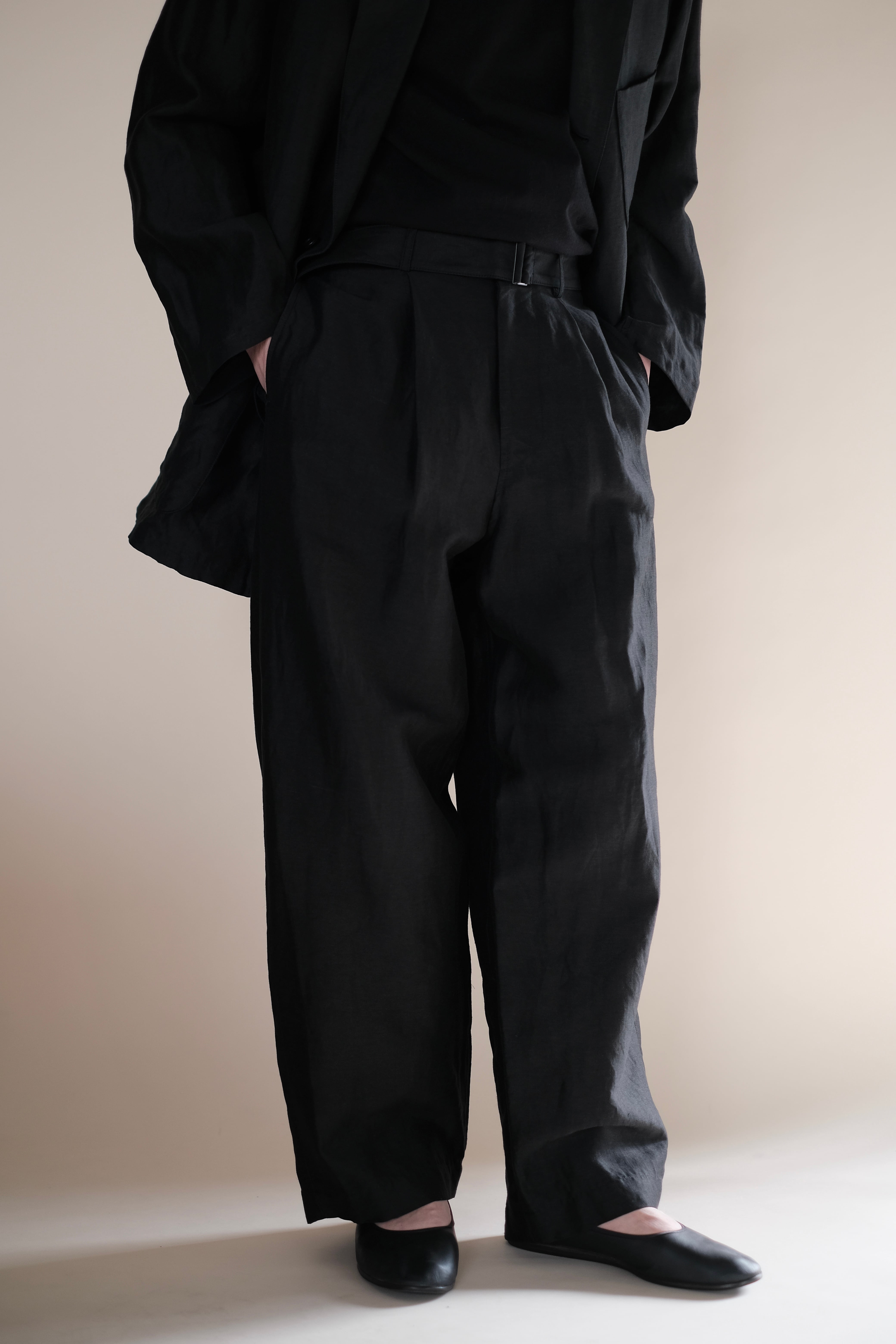 フロントは1タックで共生地のベルトをあしらったハイウエストのパンツ。
