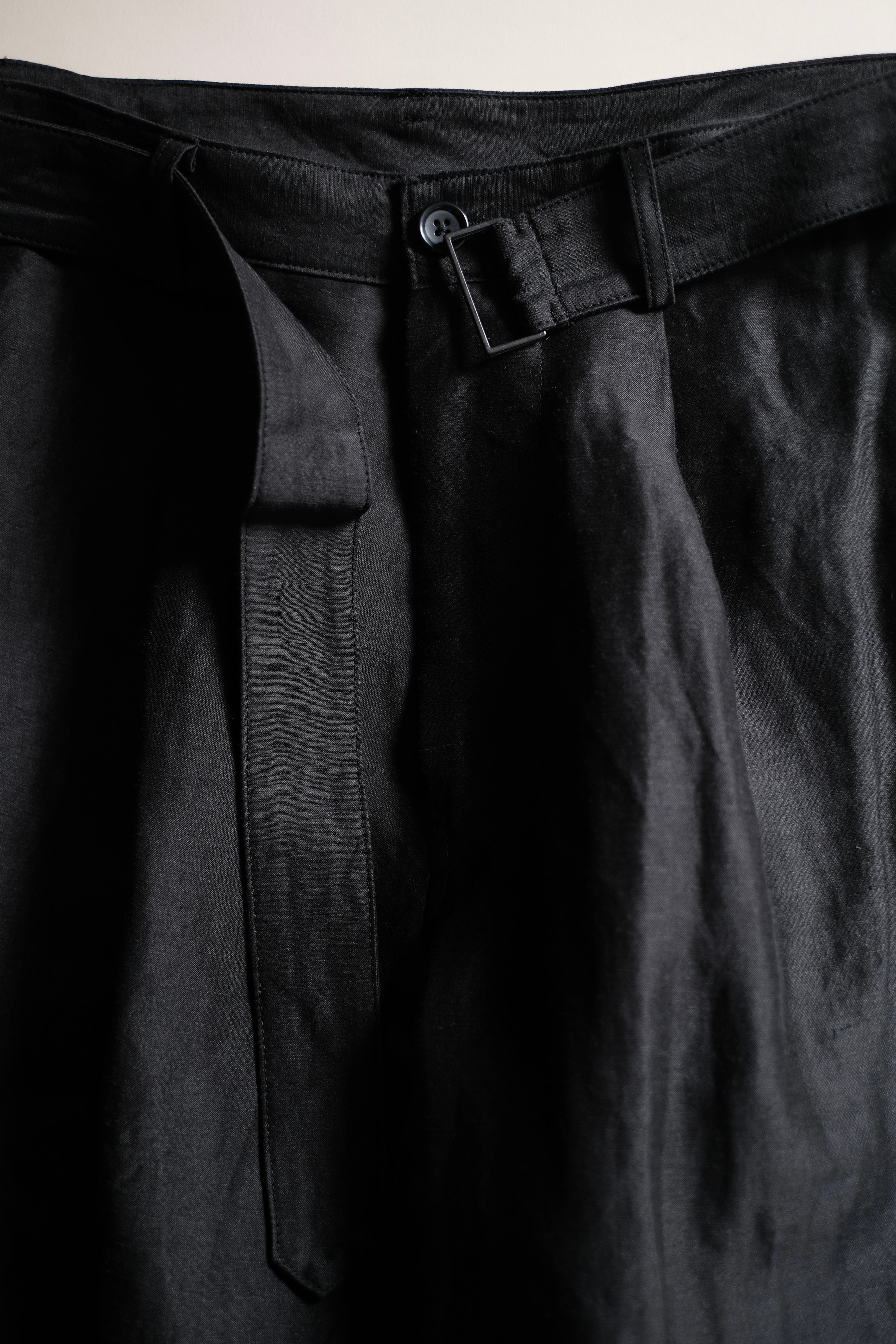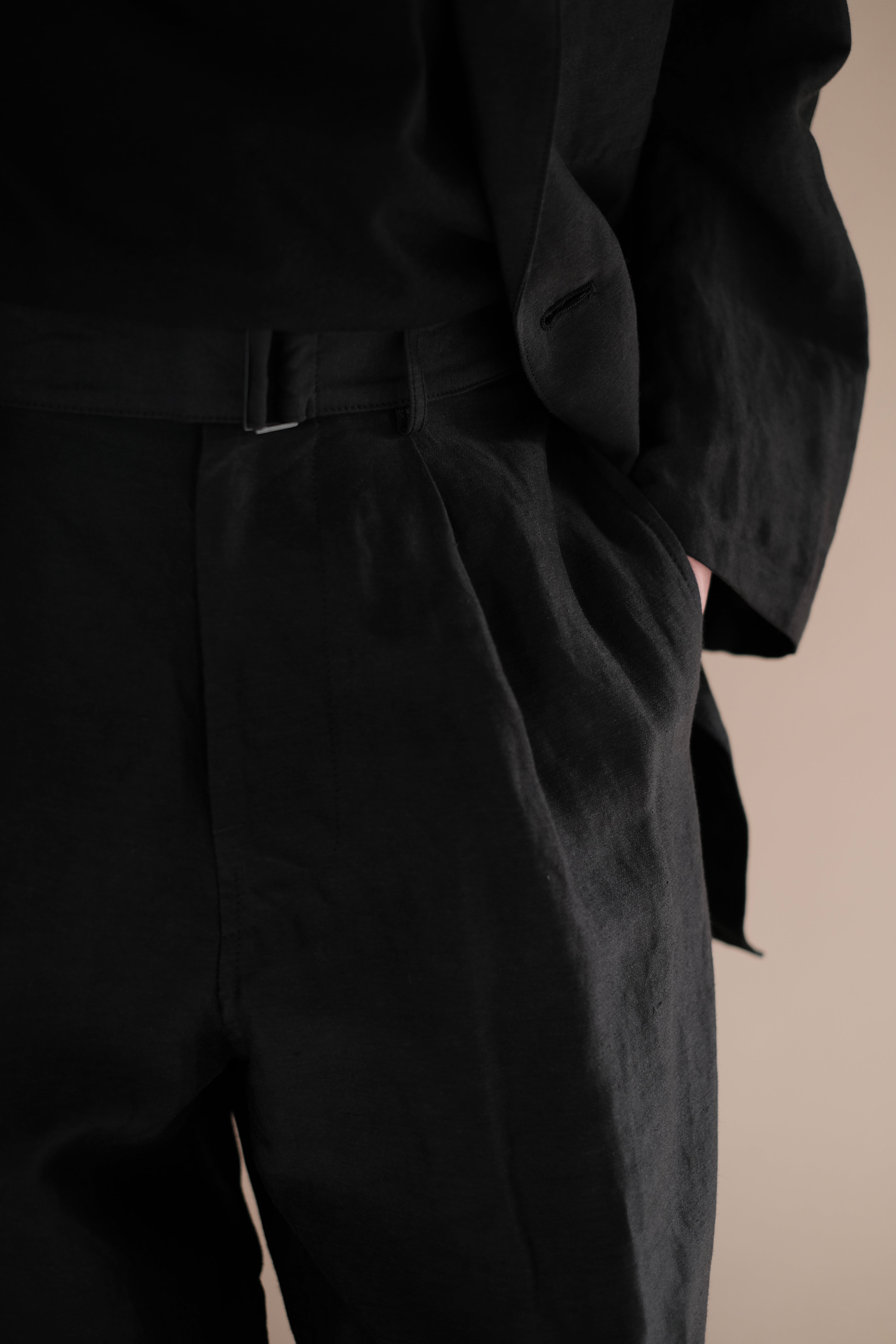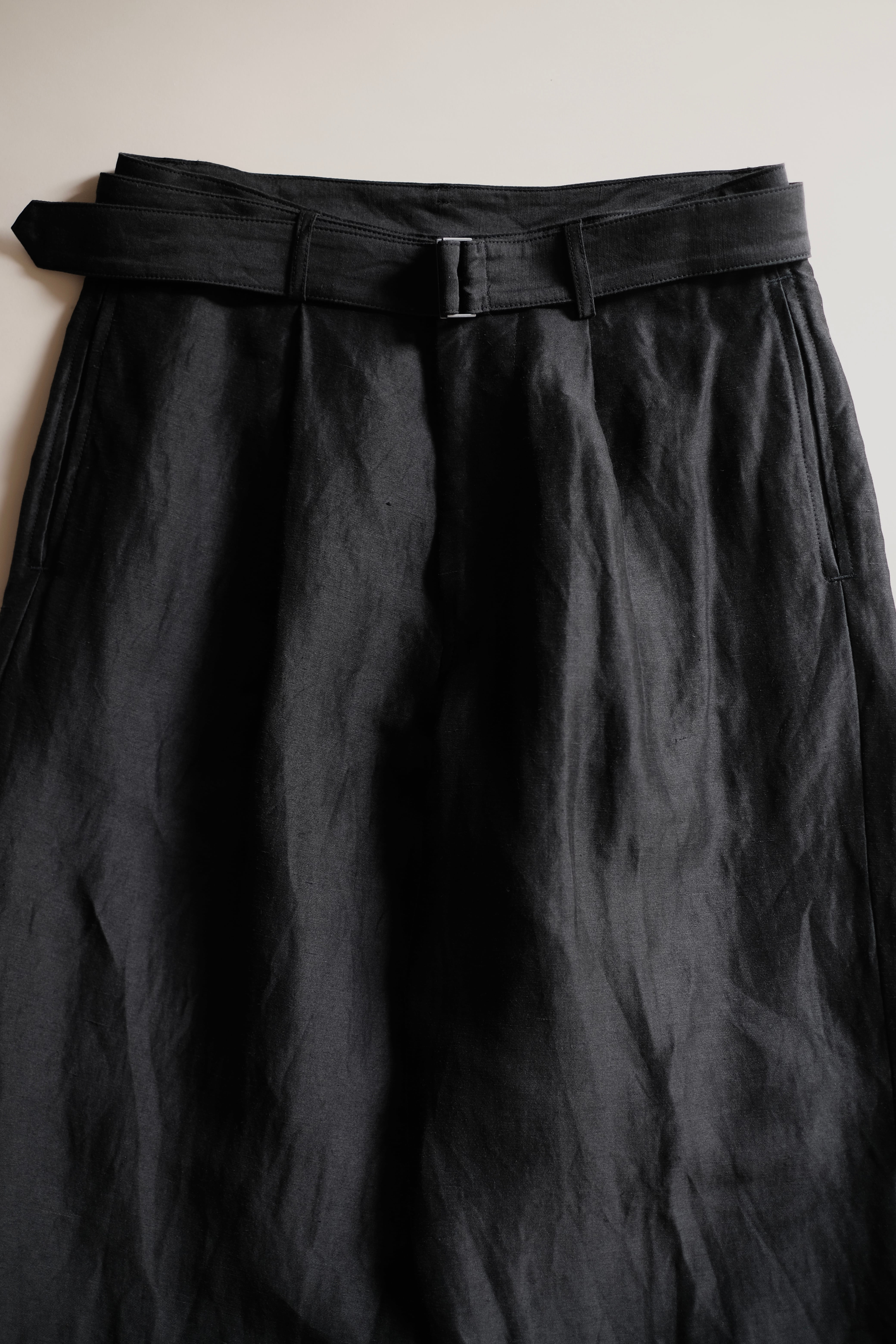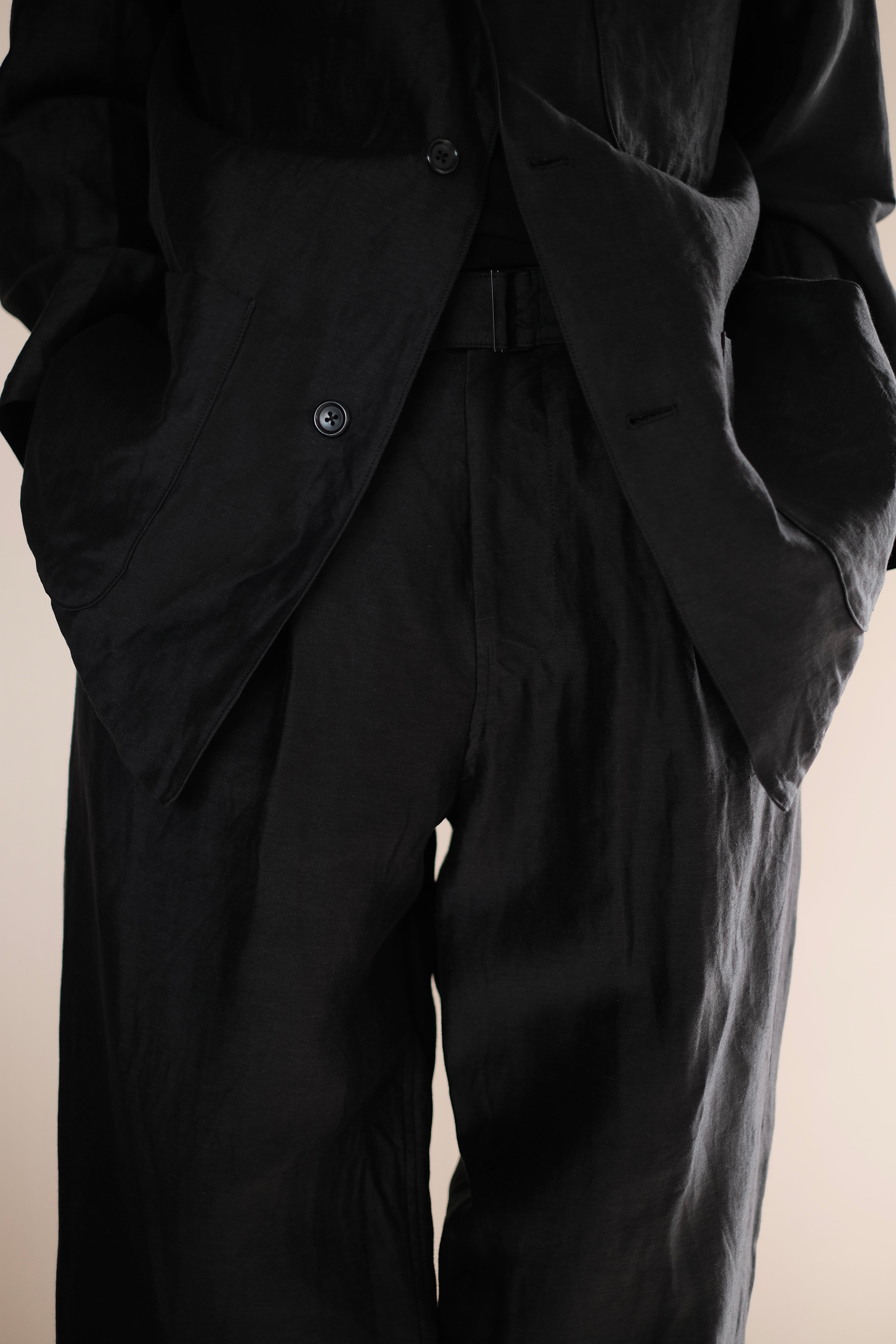 フロントは1タックで共生地のベルトをあしらったハイウエストのパンツ。