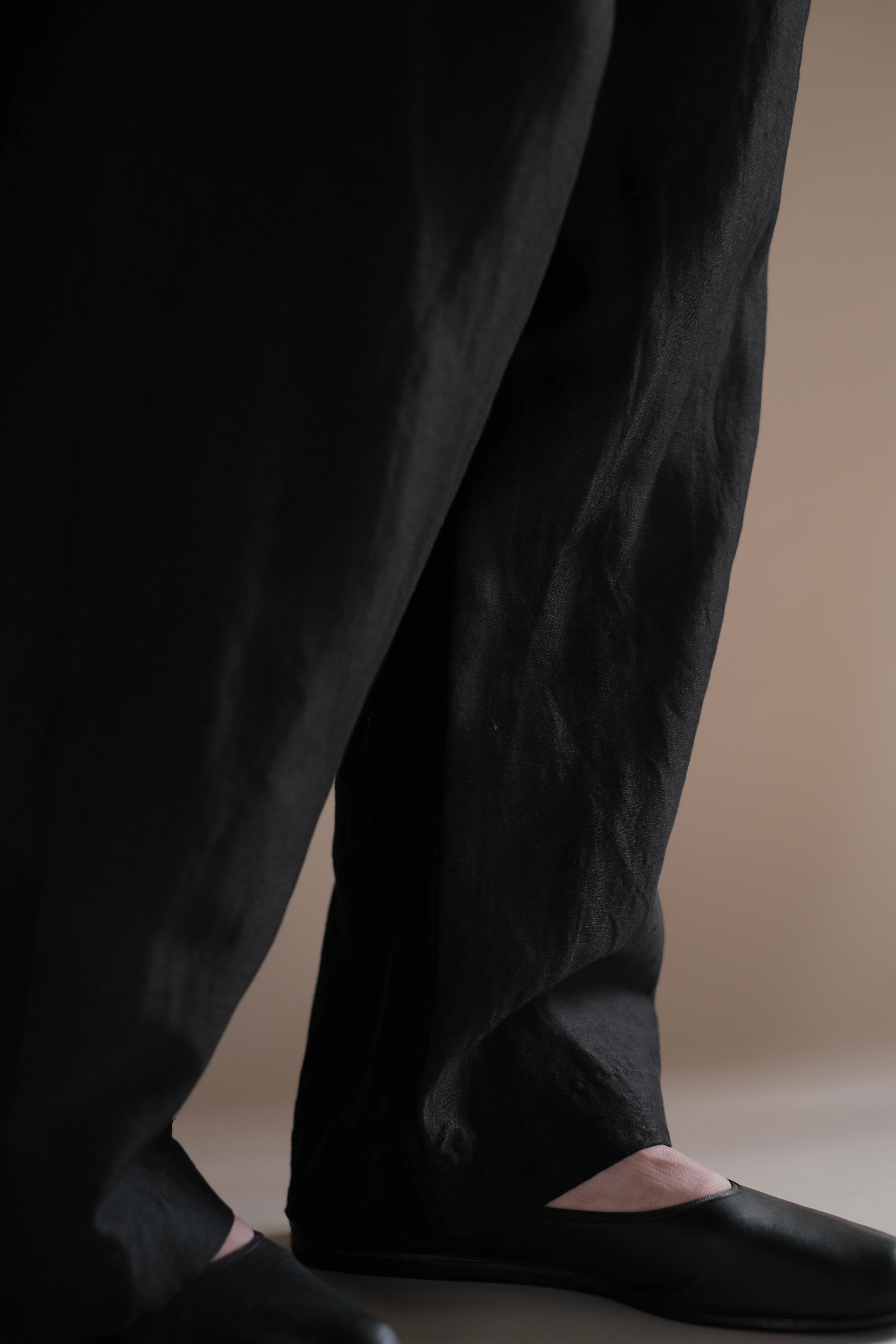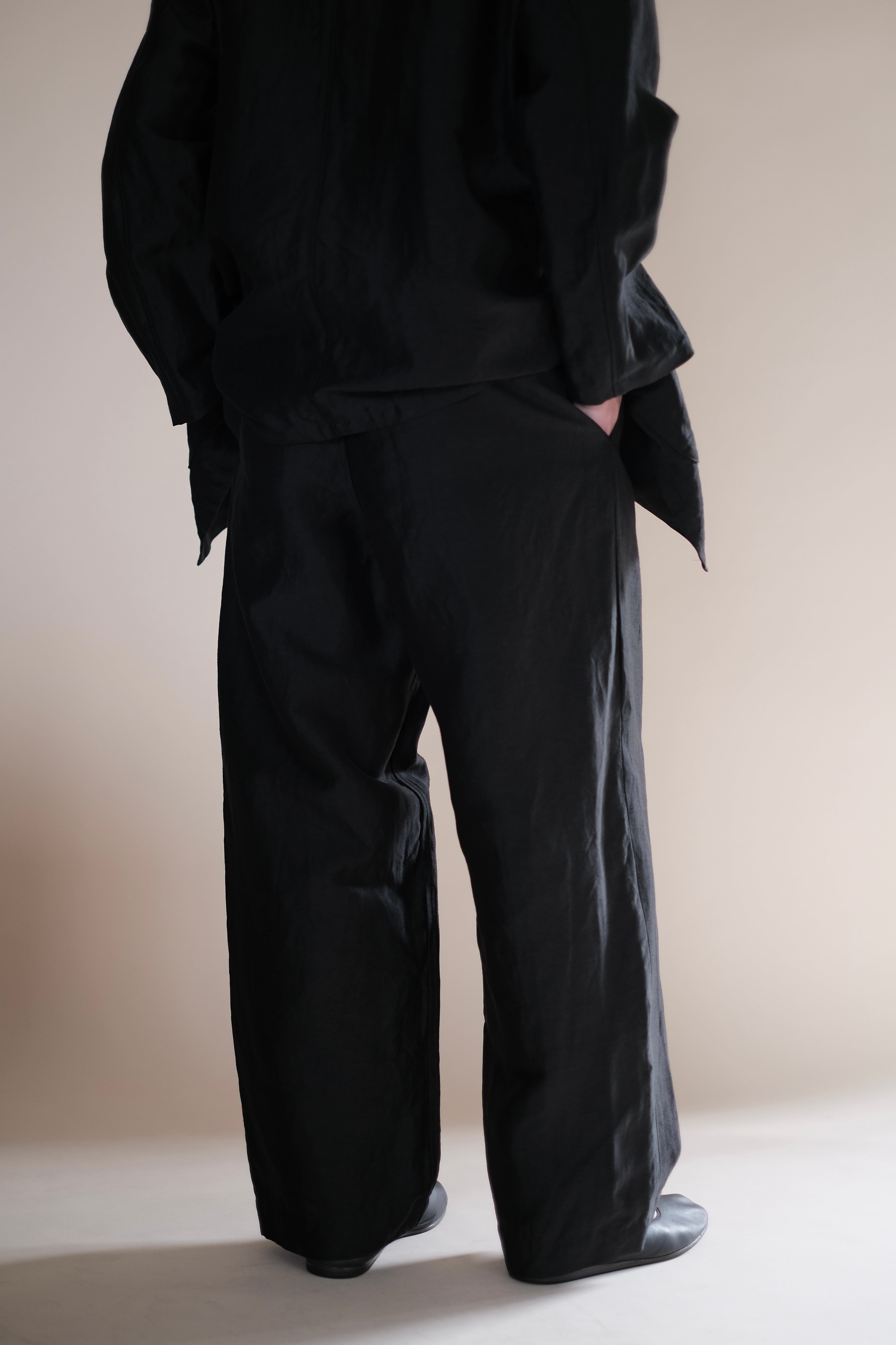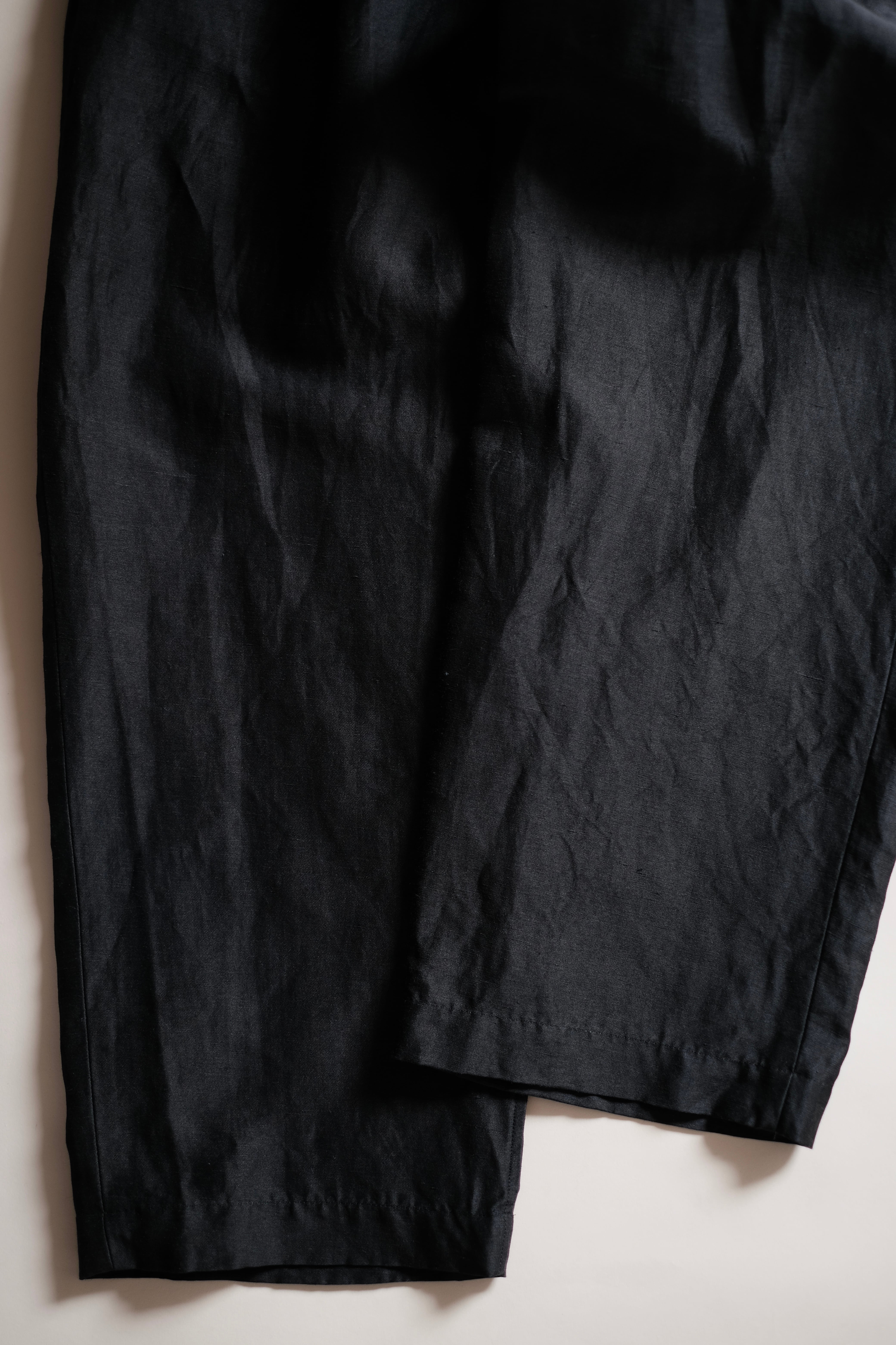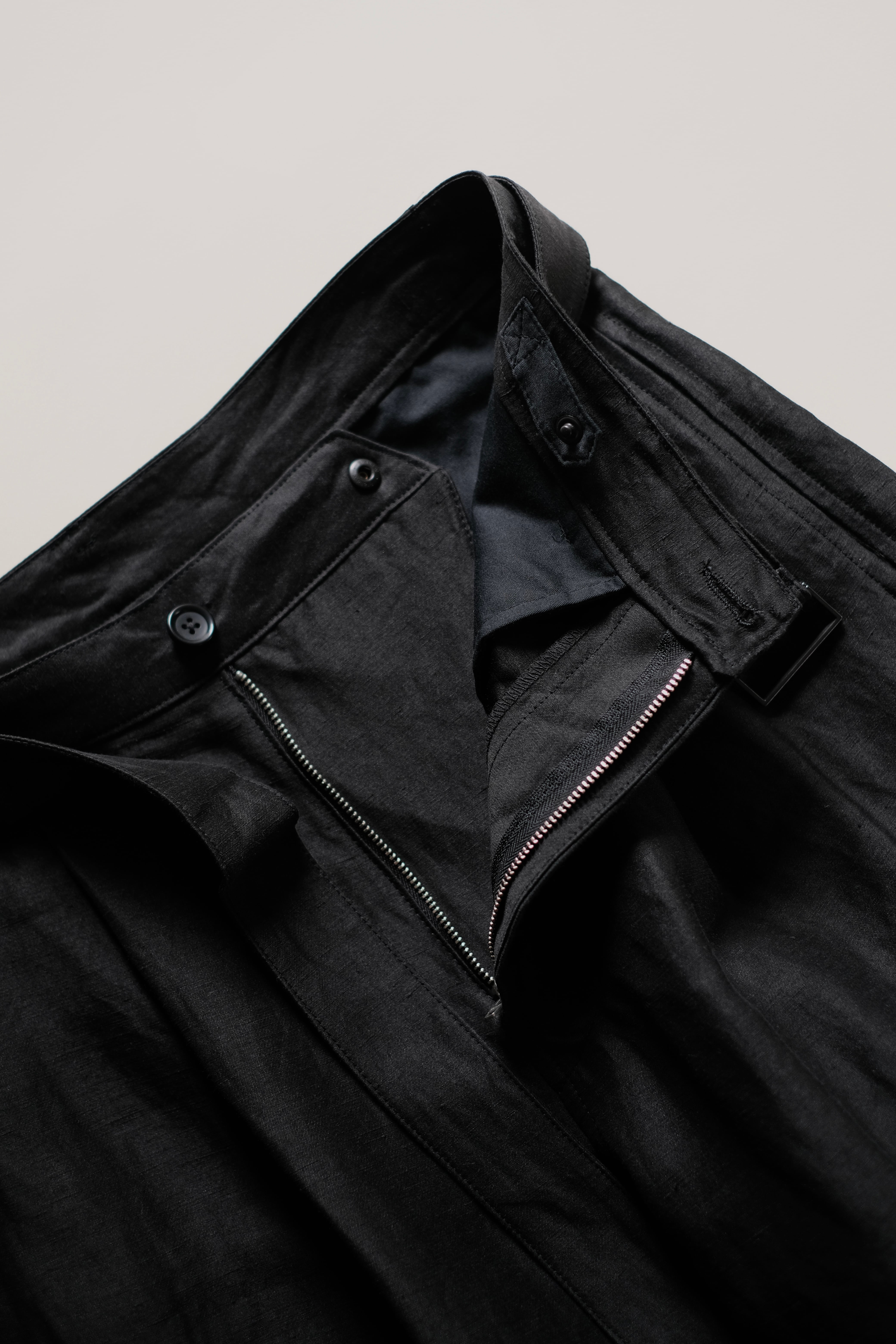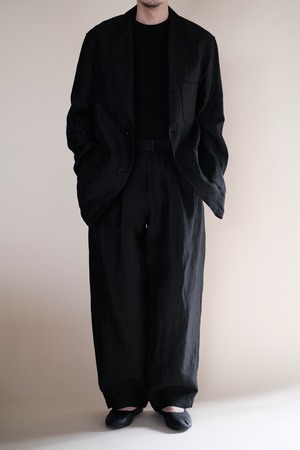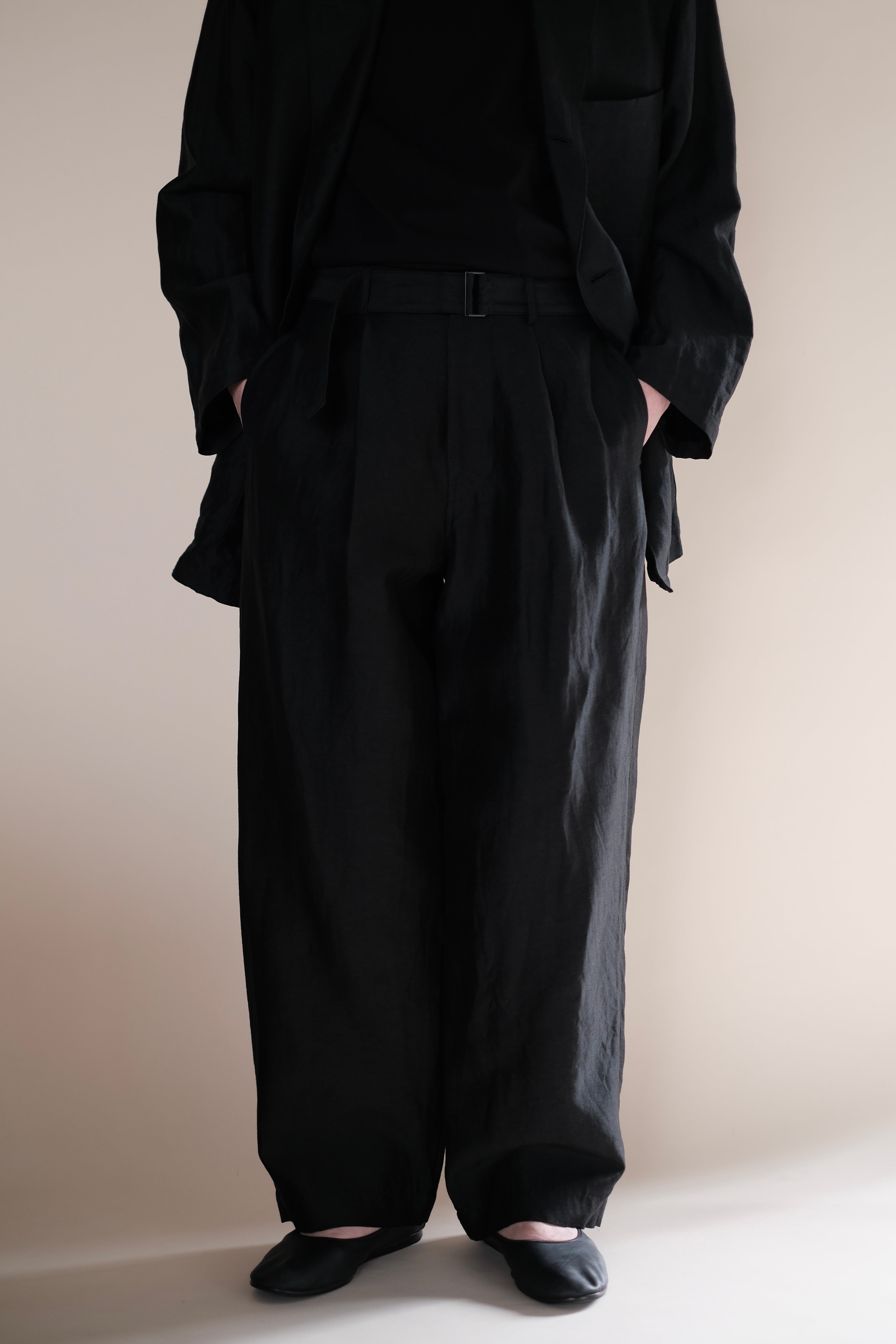腰まわりに適度な余裕を持たせ裾にかけて若干テーパードをかけたワイドシルエット。