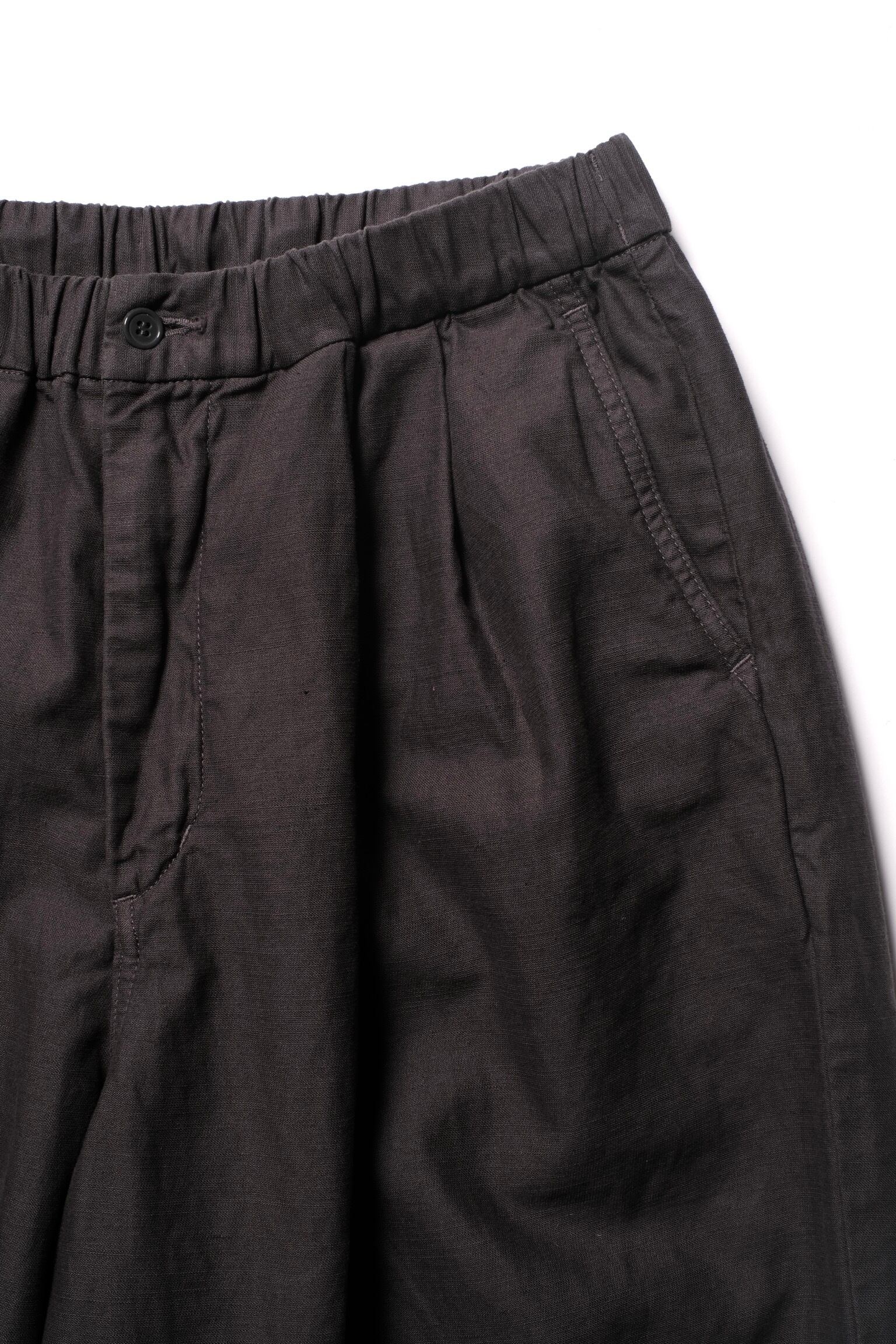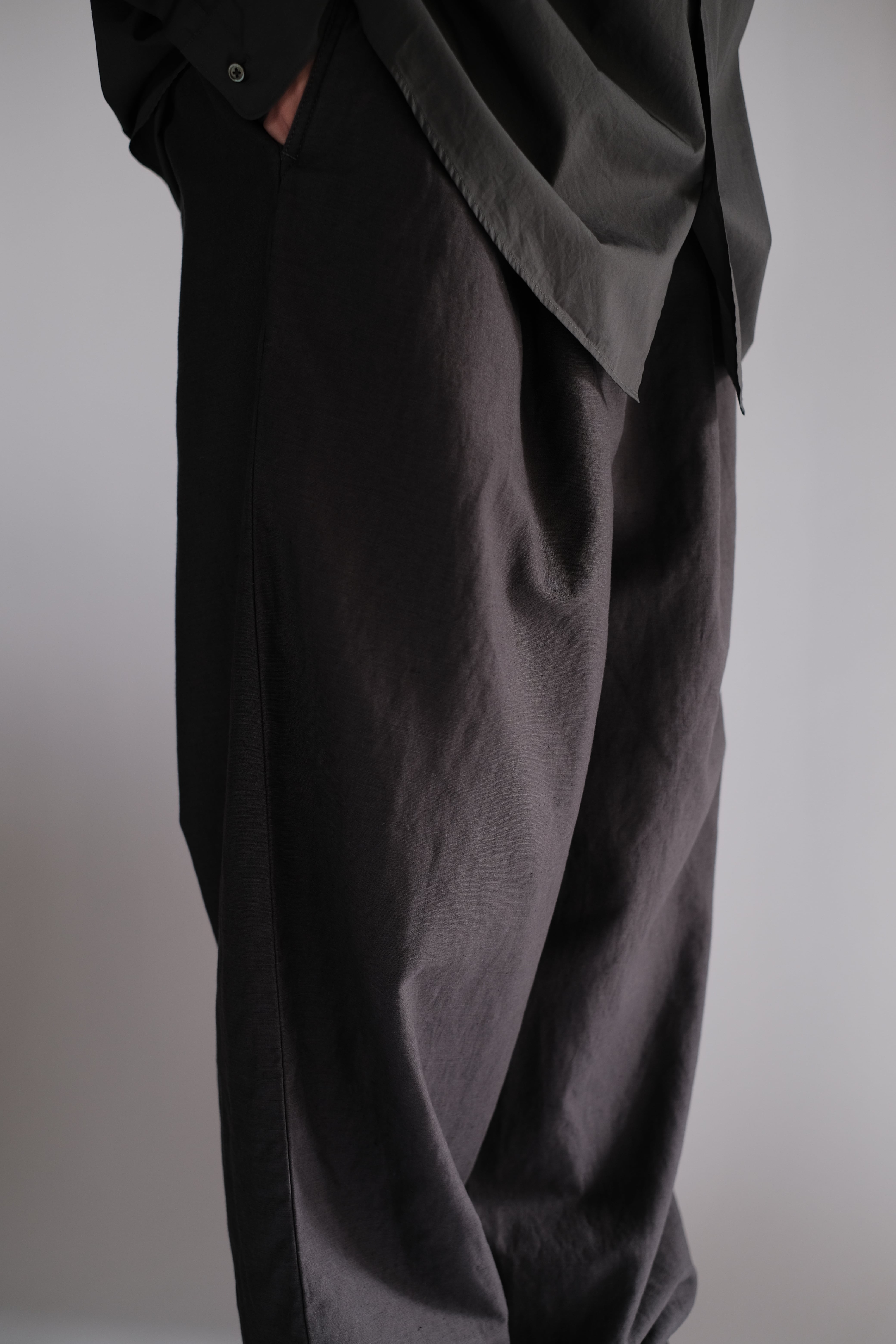 高密度に織り上げた空紡糸とリネンのシャリ感が相まってさらっとしたドライなタッチが特徴のライトモールスキン。ナチュラルなムラ感にリネンの光沢が映えるクリーンな素材。2本のタックを施したボリュームのある腰回りから、裾にかけて綺麗なテーパードを描くイージーパンツ。製品染めによるパッカリングやアタリを活かした風合いに仕上げた。