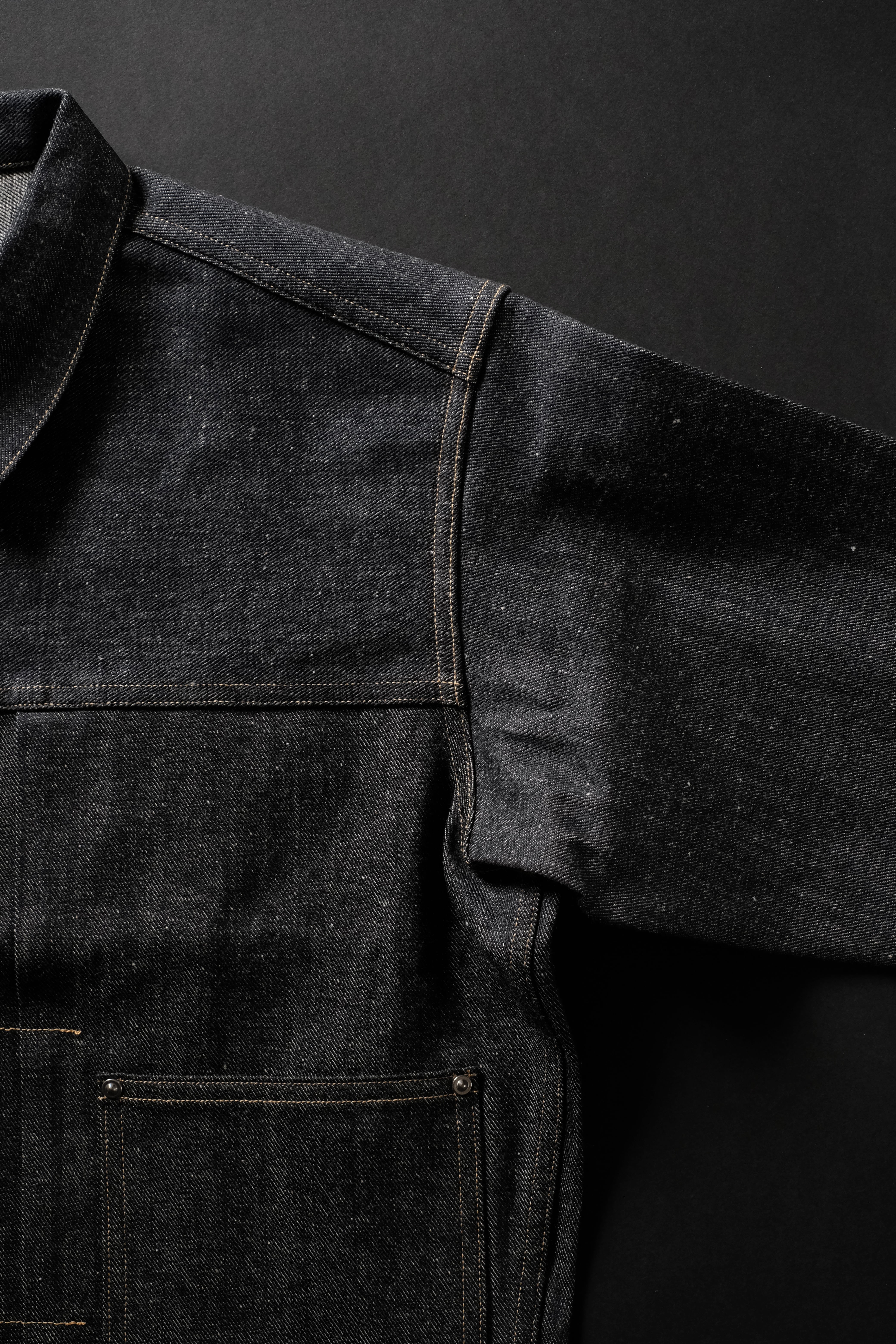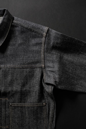 「白耳」のセルヴィッジデニム生地になっており、前身返しやカフス裏など各所に白耳を利用している。