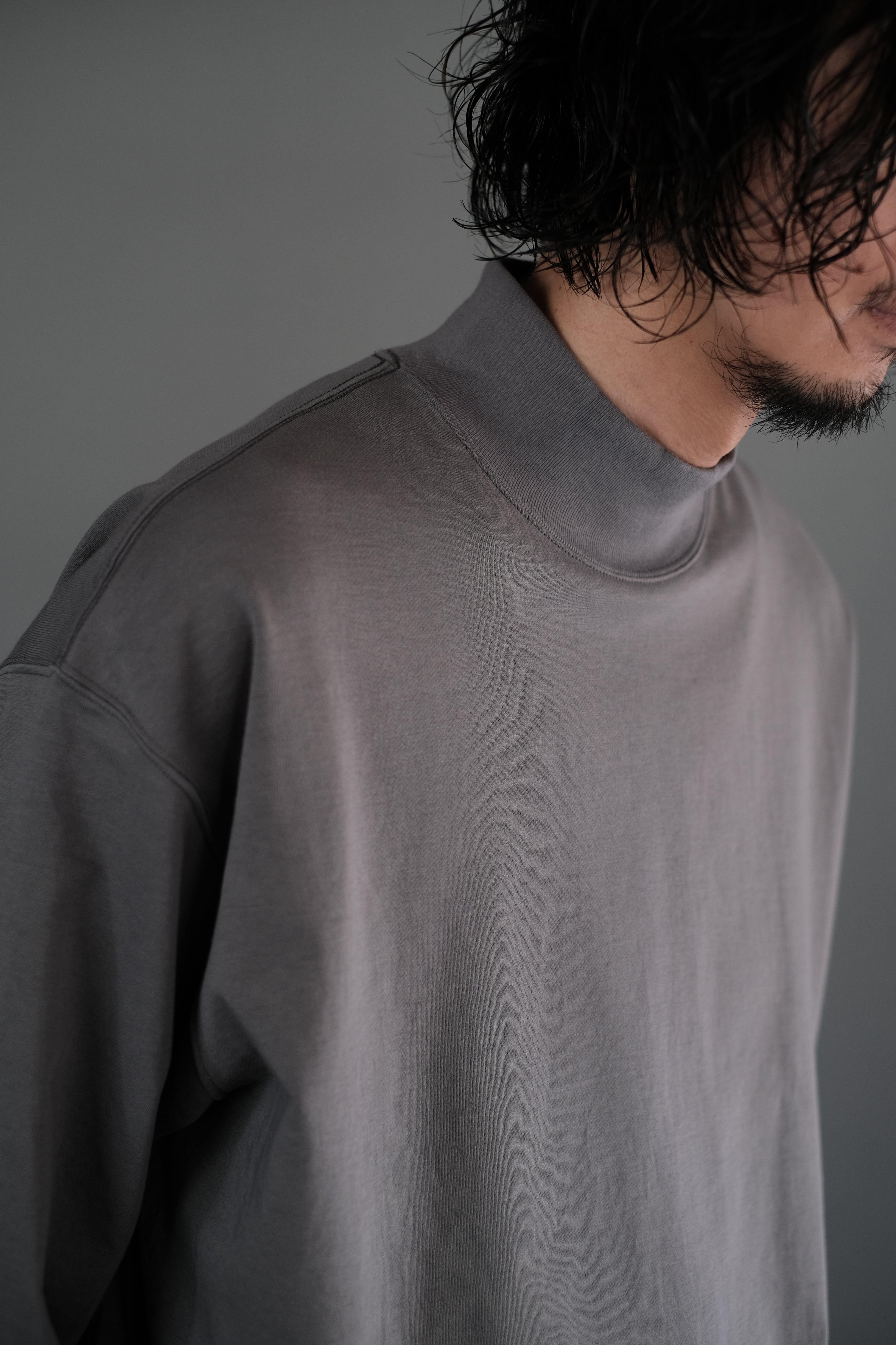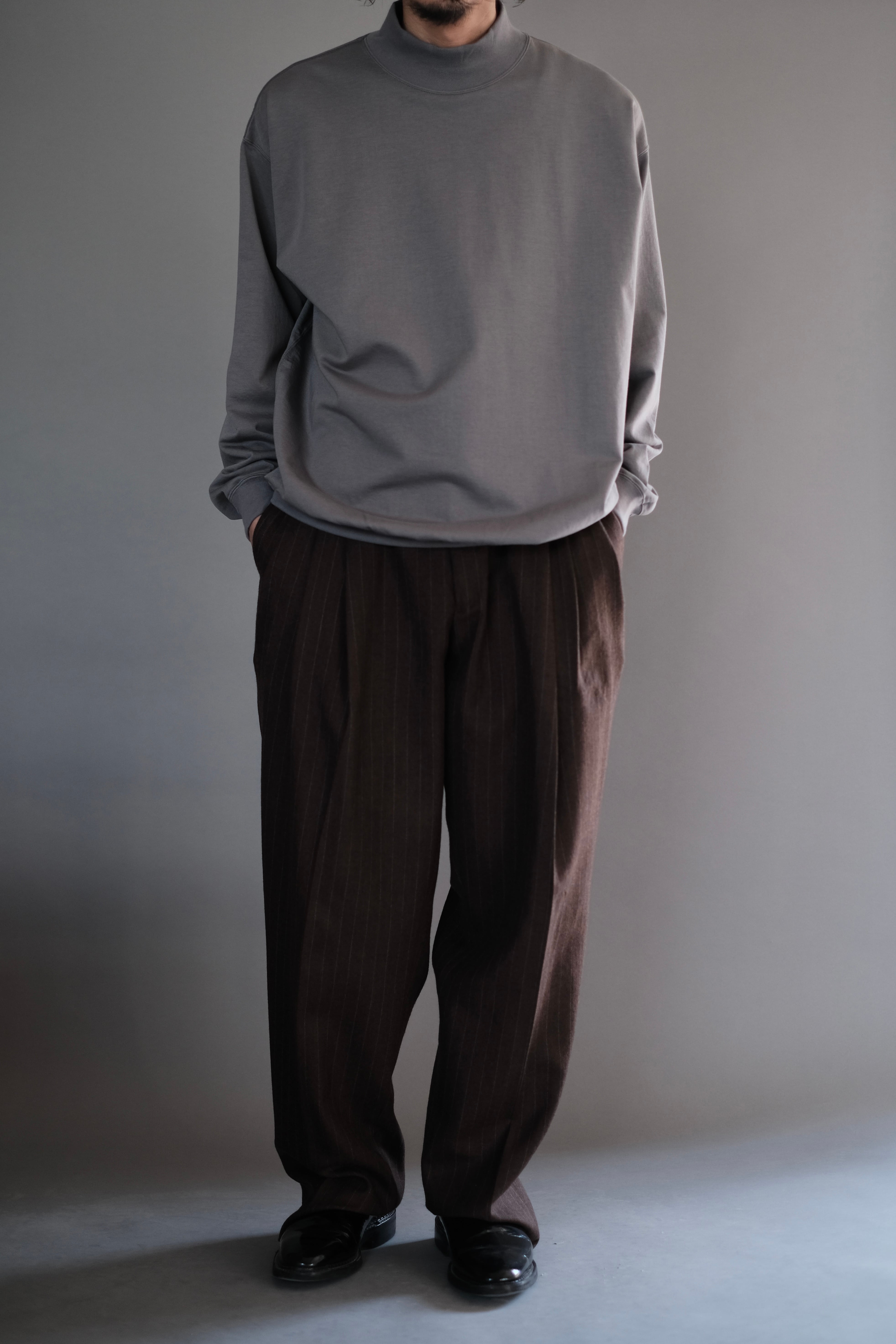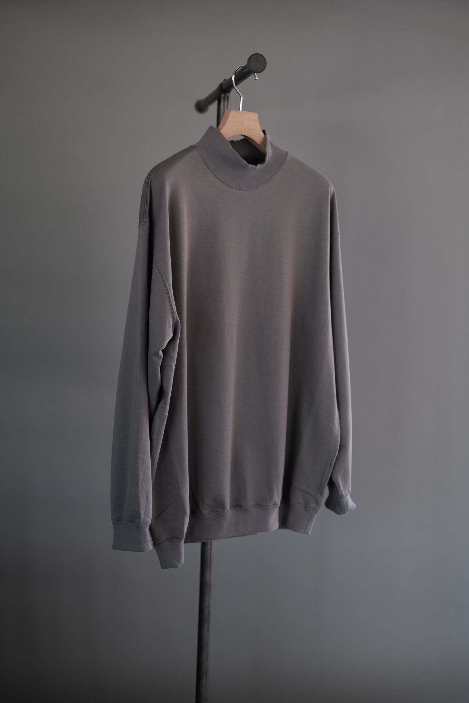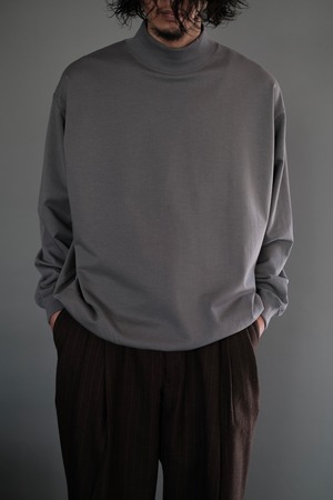 32Gというハイゲージで編まれたミニ裏毛のモックネックスウェット。目面が非常にきれいに詰まった薄く張りのある裏毛で裏面はとても細かいループが連なるため、少し厚手の天竺のように長いシーズンで着用が可能。程良く甘撚にすることでキックバックが生まれ型崩れのしにくさも嬉しい素材。