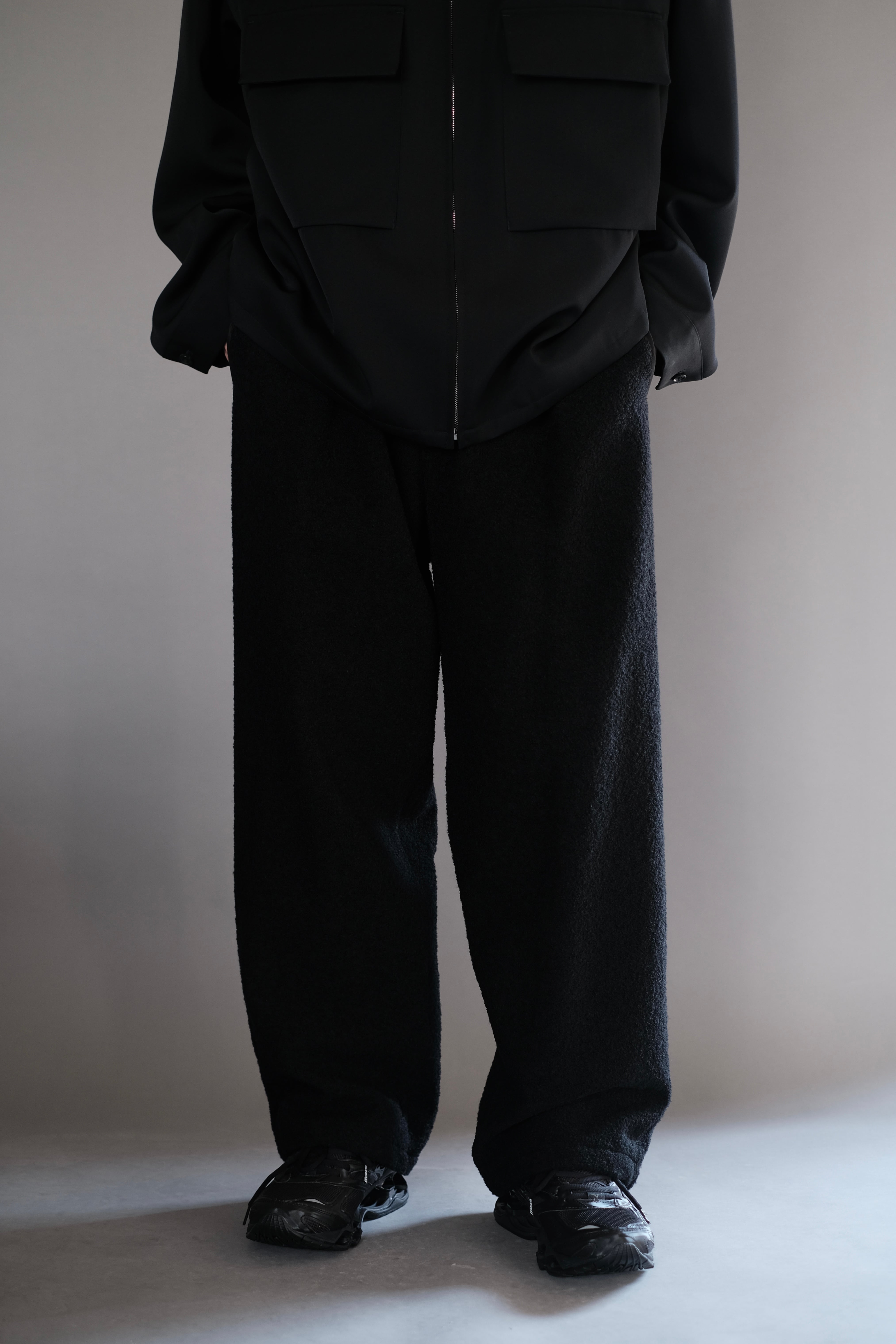 撚りのかかっていないウール無撚糸をそのままループに使用することで原料の持つ柔らかさと膨らみが特徴の素材。ウォーム感のあるテクスチャーでソフトな肌触り、経糸、緯糸ともに1本ずつ交互にループ糸とコットン糸を用いることで程よいハリコシを表現した。腰回りにゆとりを持たせたワイドテーパードのトラックパンツ。ウエストベルトのストレッチコードのイエローがアクセントに。裾にも配備したコードでシルエットの調整が可能。