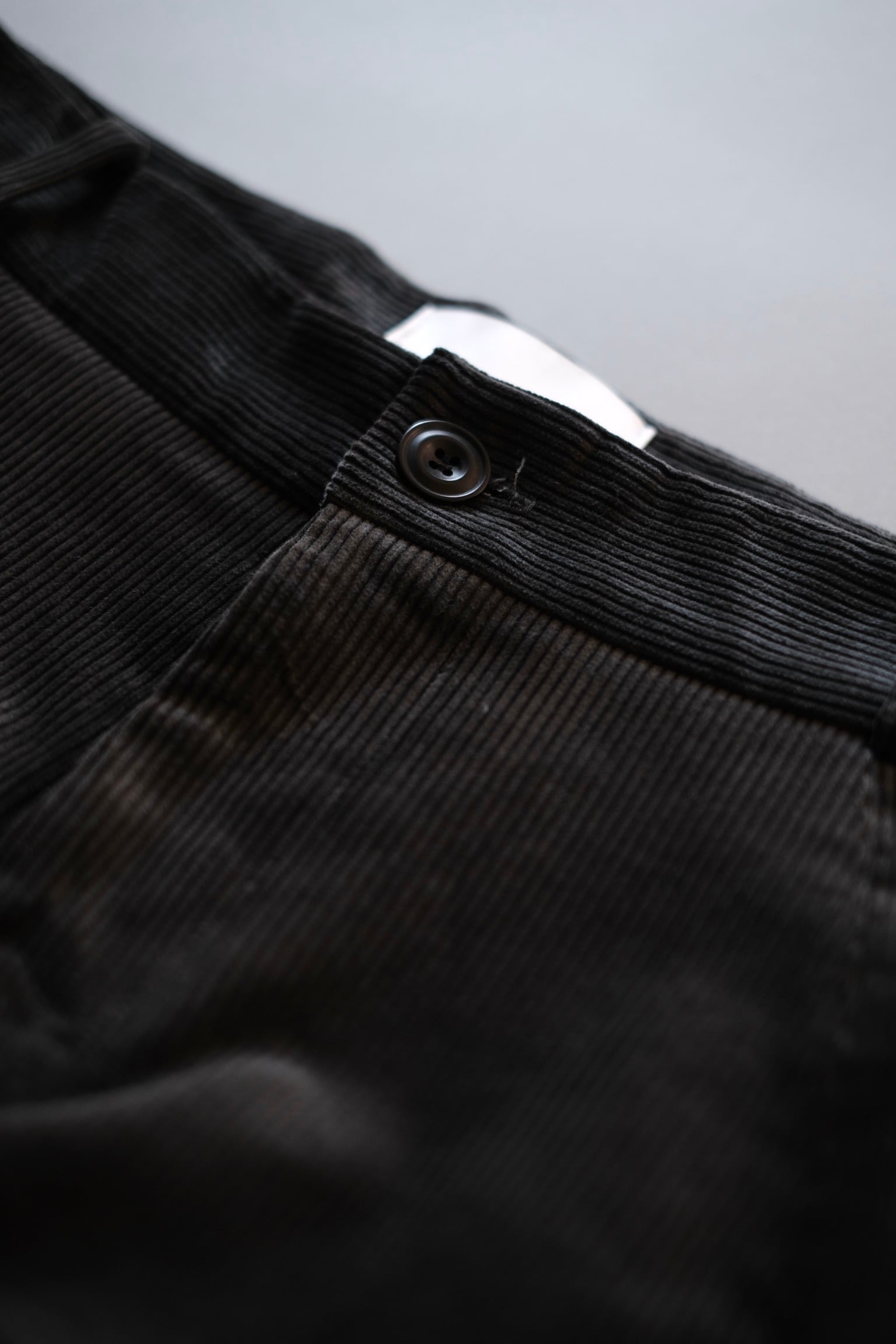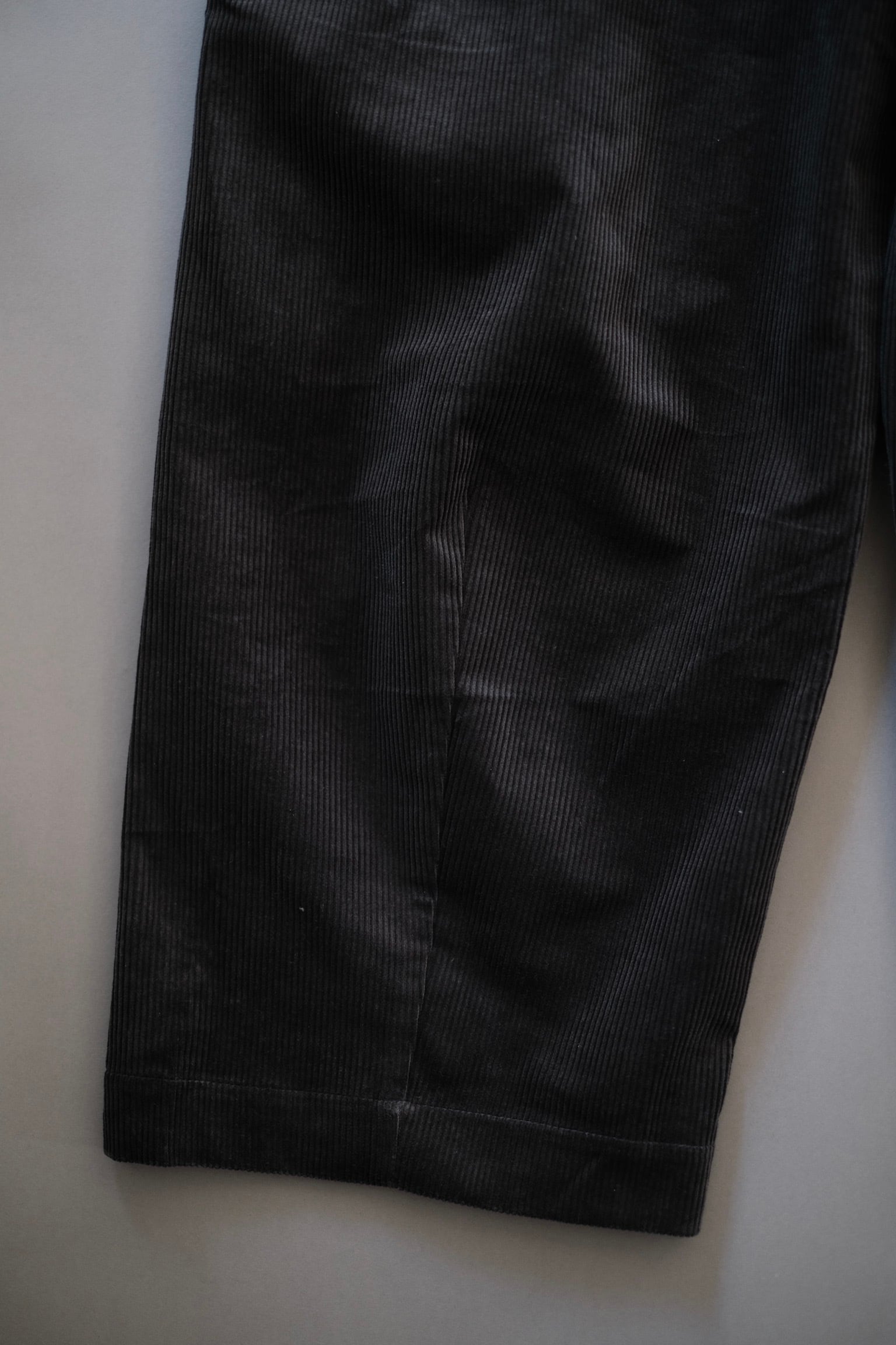 灰色に青みがかった奥深い色味と光沢感が交わった太畝のコーデュロイ素材。