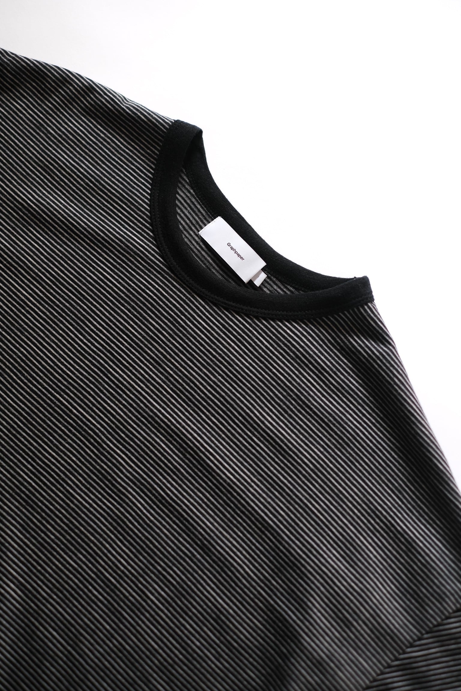 良質なメリノウールで編み立てた目面が均一できれいな細ボーダーの天竺。バインダーネックのロングスリーブはゆったりとしたラインのドロップショルダー。原料の持つ光沢感と保温性は勿論、一枚で着用してもソフトな肌触りの一枚。糸と生地で防縮加工を施すことでイージーケアを実現。