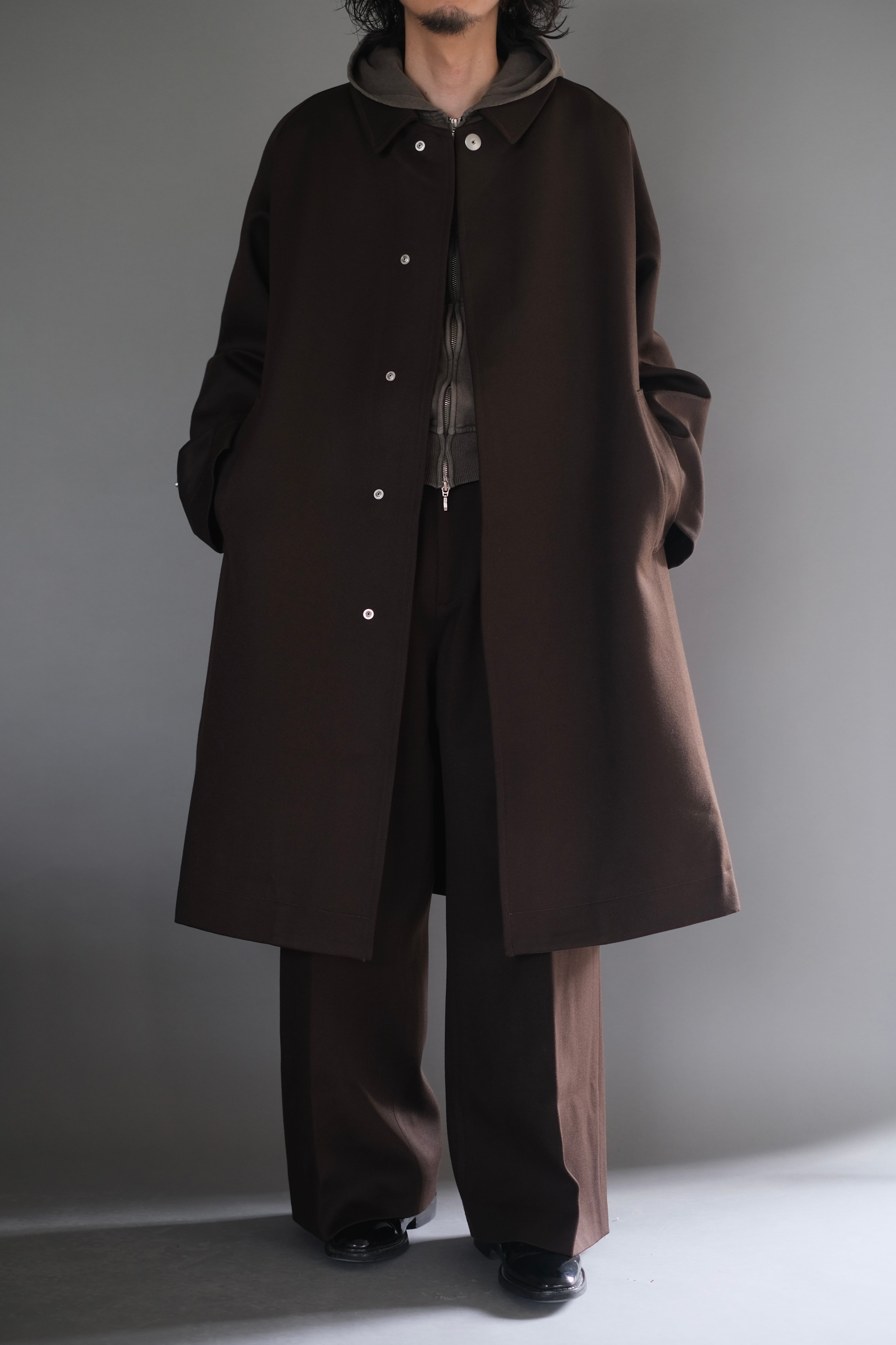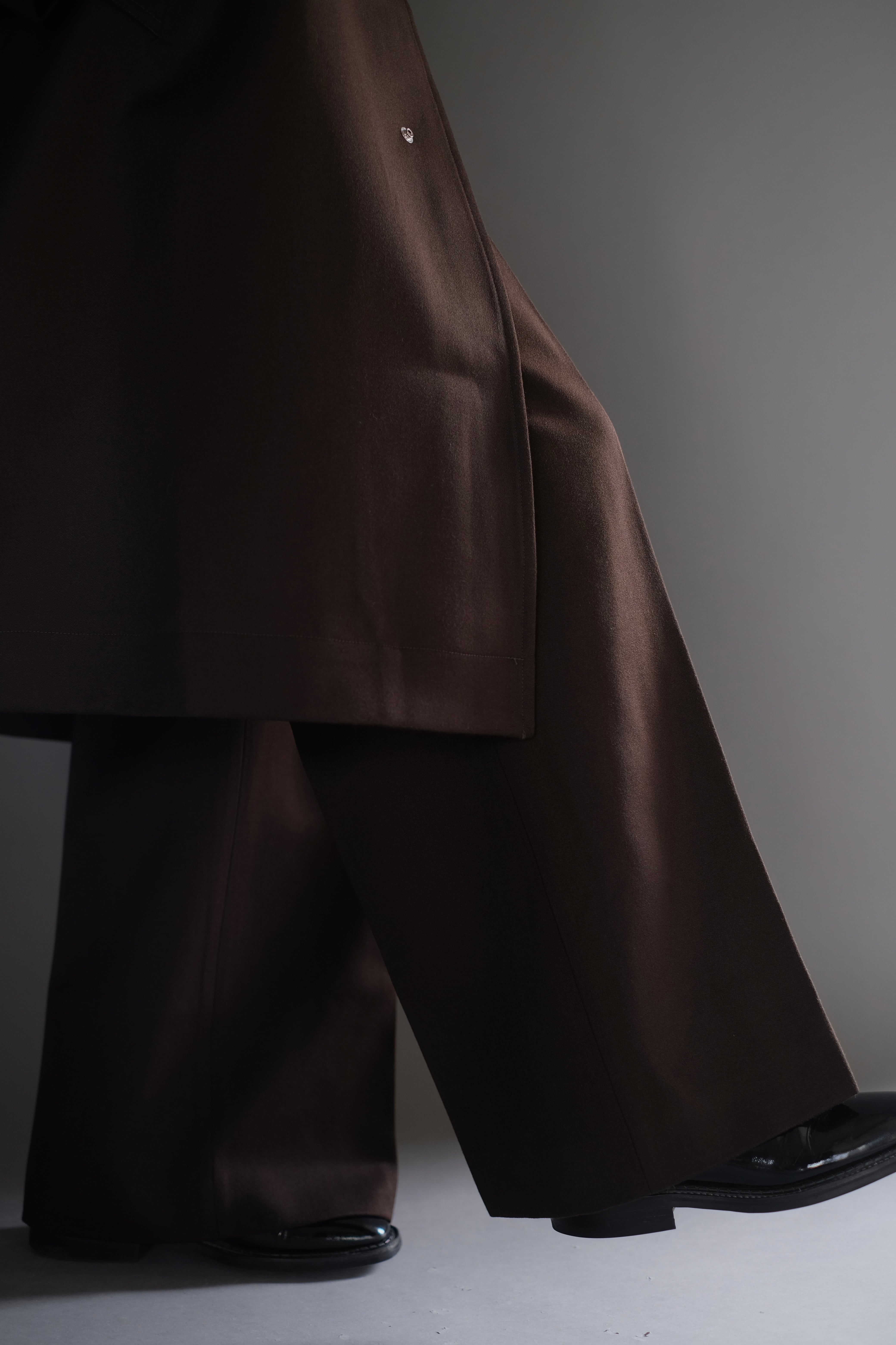 タキシードなどにも使用される重圧な高級ウールはしっかりと厚みがあるものの、とろみもきちんと表現されたラグジュアリーな佇まい。