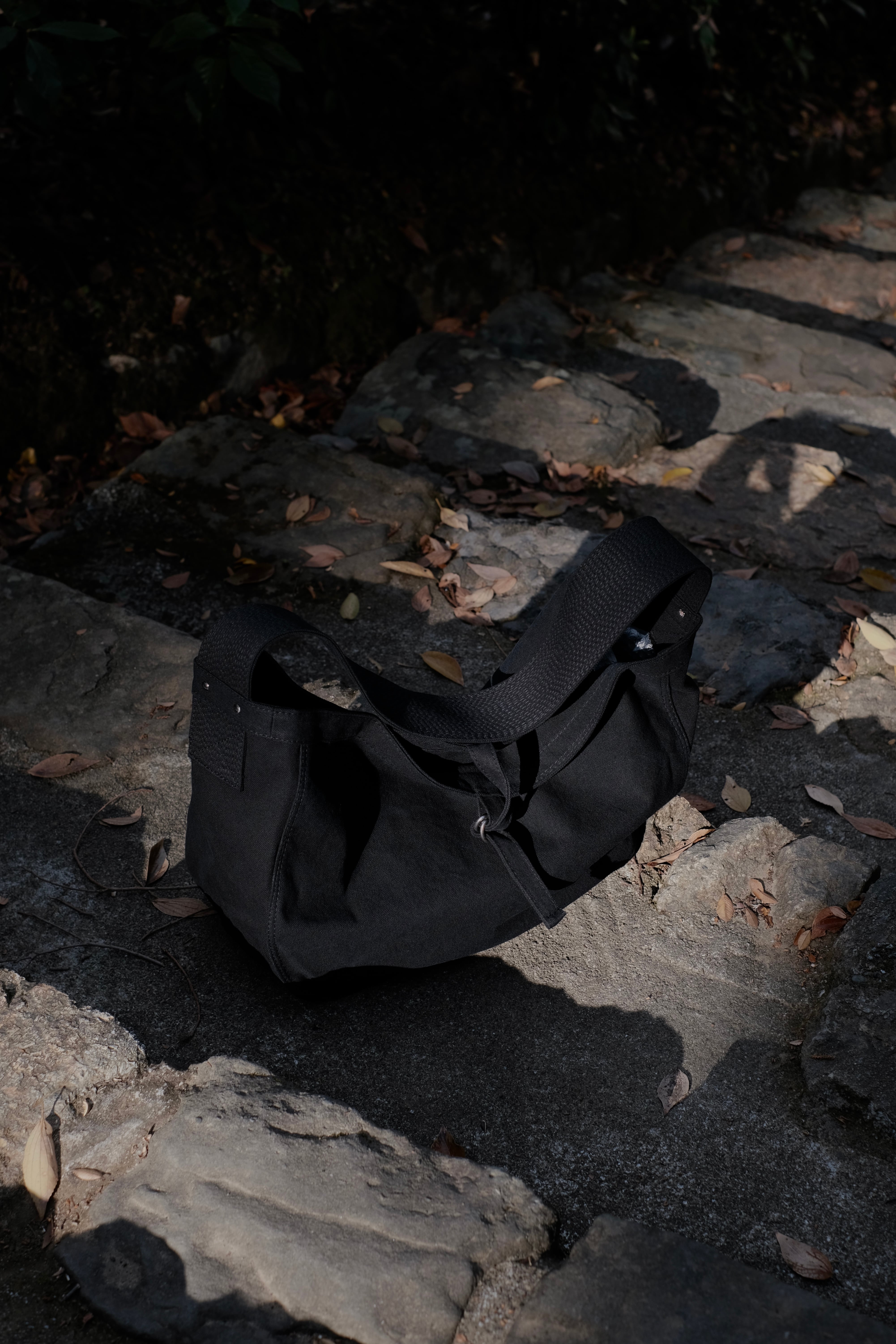 肩への負担を軽減する幅広のショルダーハンドルと、広いマチは当時の作りのまま、ショルダーハンドルの長さを短く調整し、ボディバックのように再構築した。