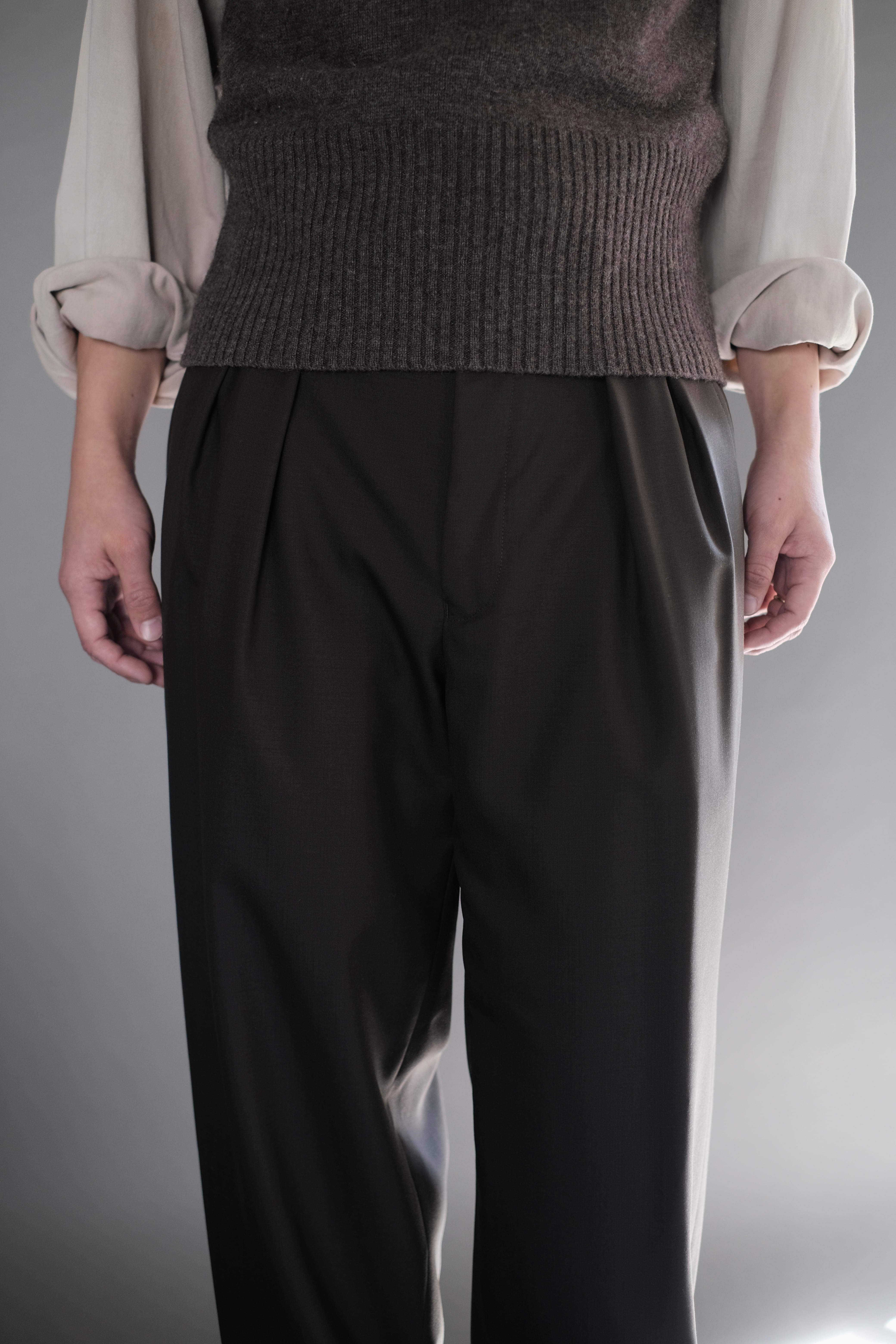 深く入ったフロントタック、サイドのアジャスターベルトは、50年代のビスポークトラウザーズを参照したクラシックな仕様を採用。